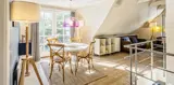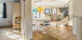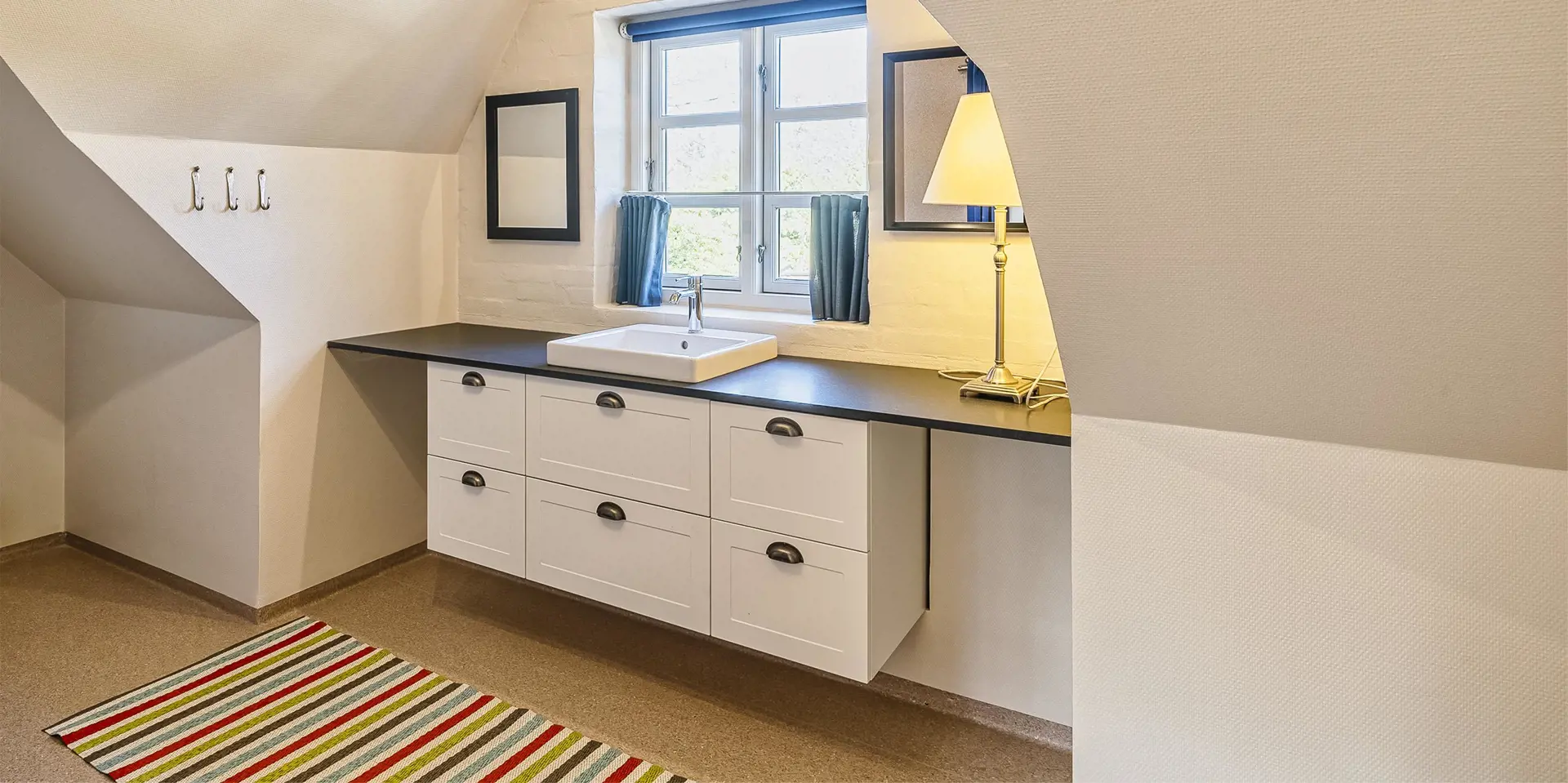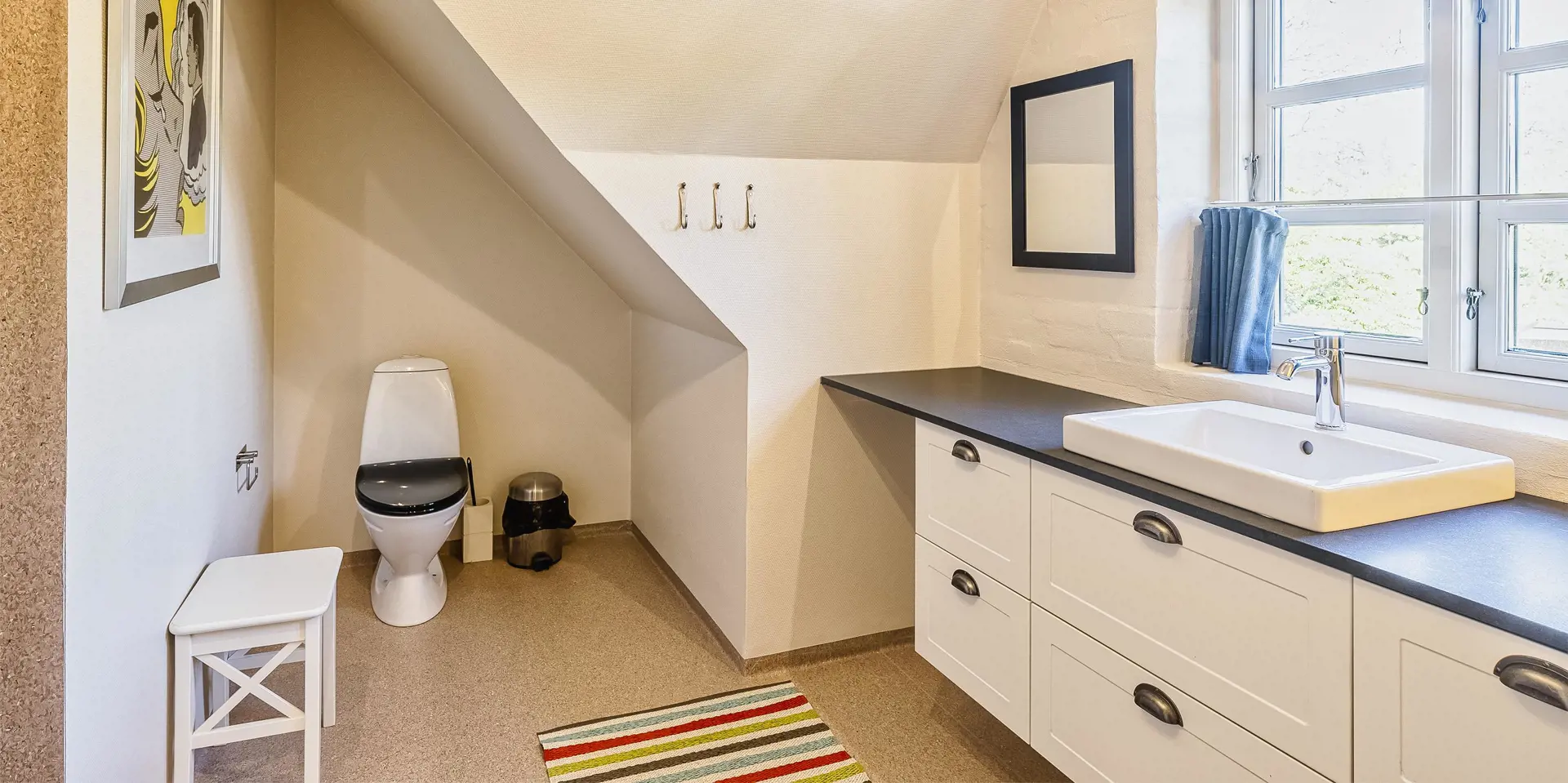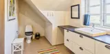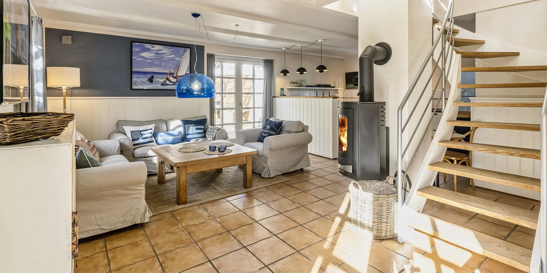 Über eine grosse breite Holztreppe gelangen Sie ins obere Geschoss und gleich in den mit Holzfussboden belegten Wohnbereich. Hier bietet das gemütliche Sofa Spannung pur. Das zweite Badezimmer verfügt über eine Duschkabine, ein WC und ein Handwaschbecken mit grosser Ablagefläche.