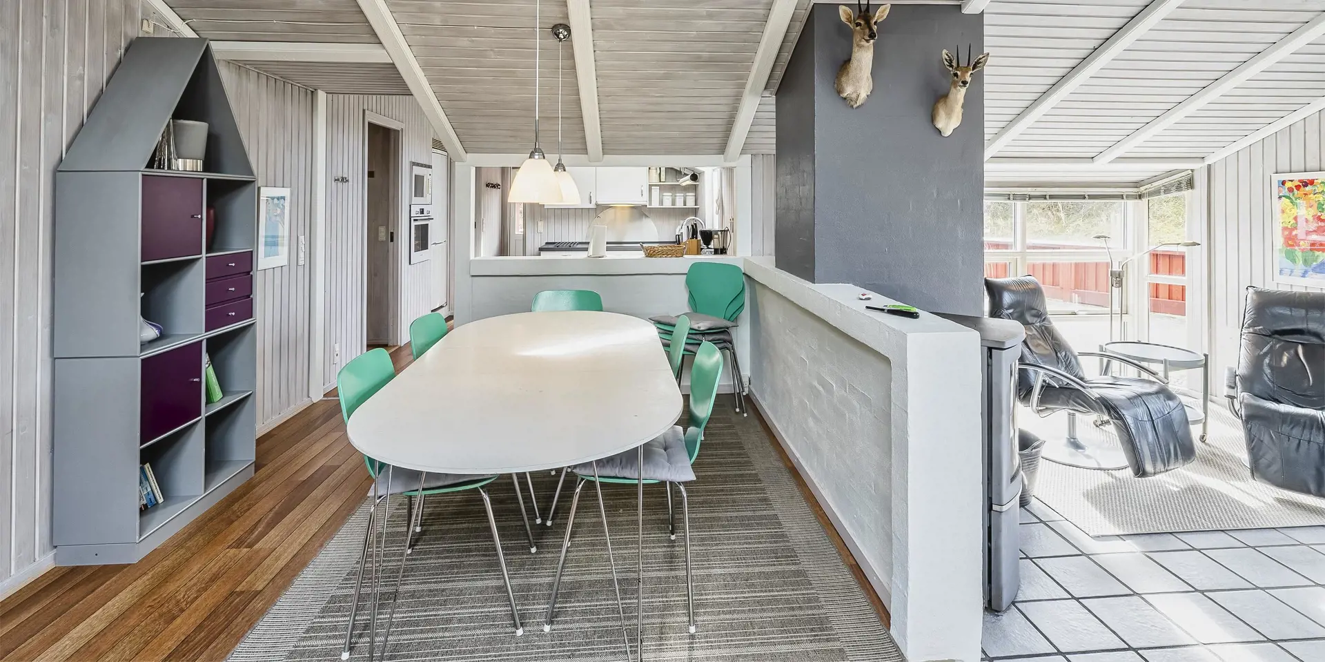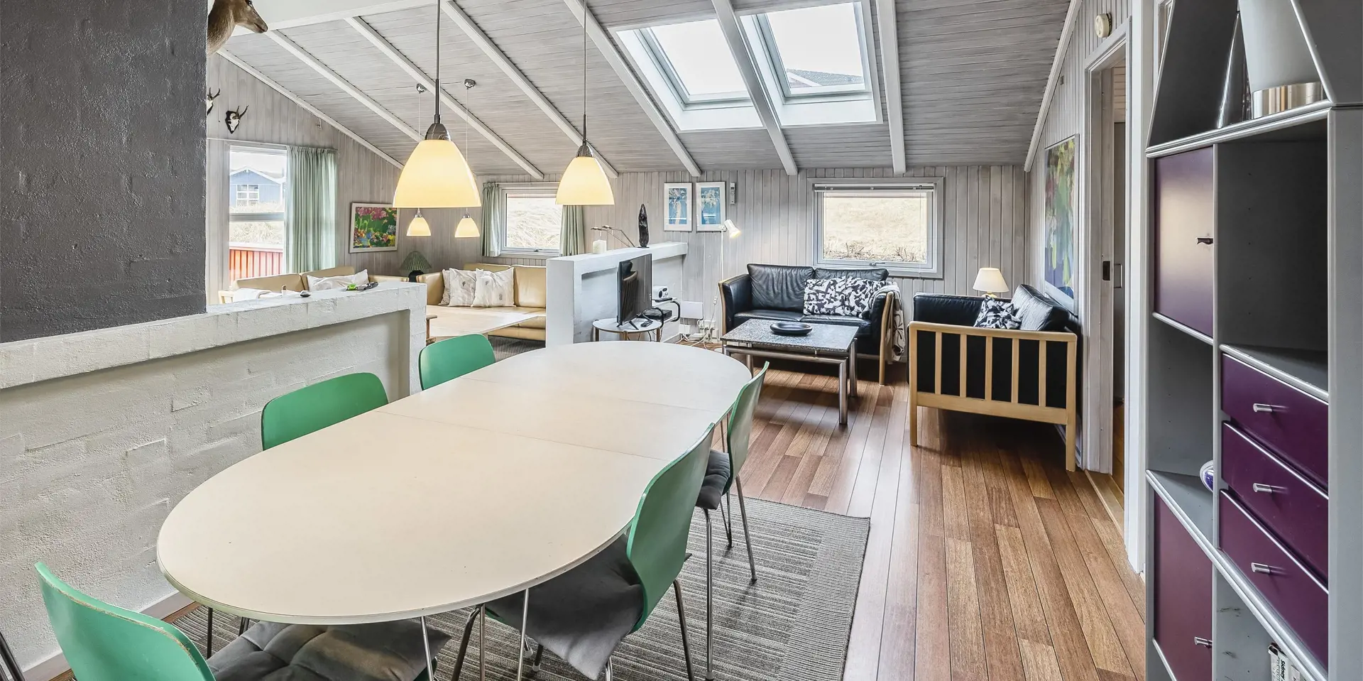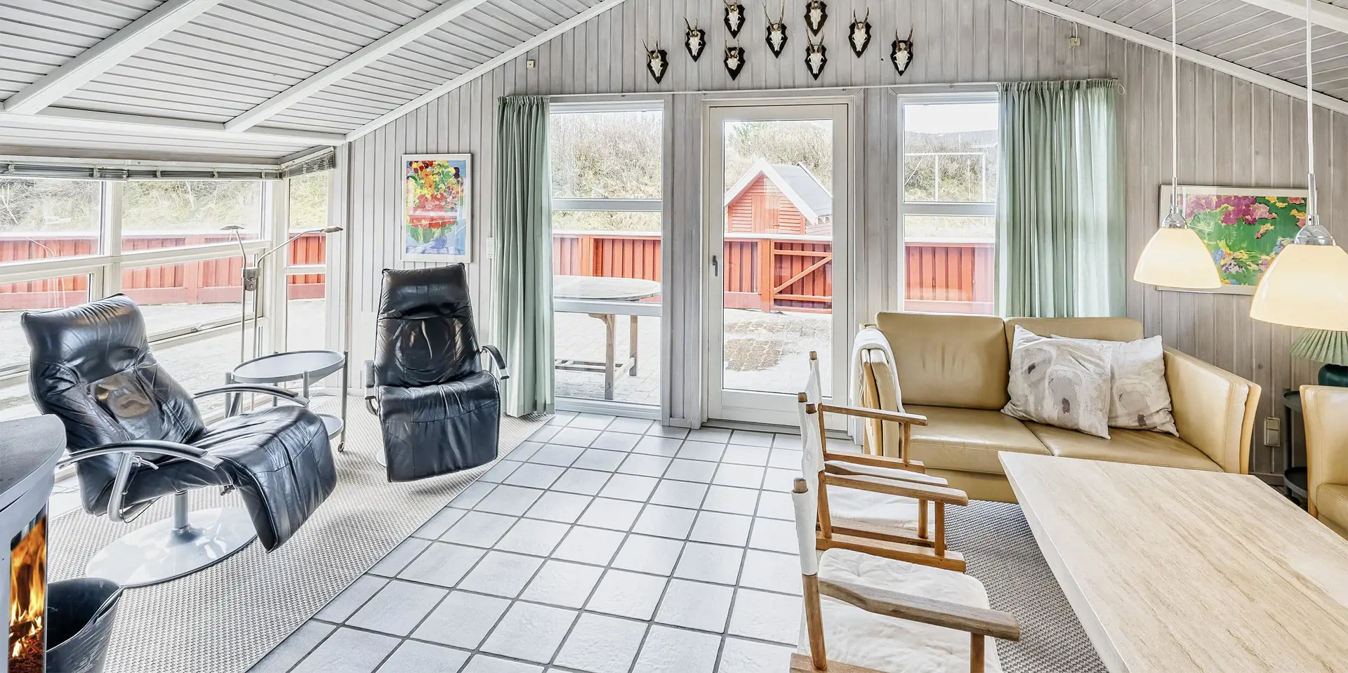 Ferienhaus für 7 Personen auf einem Naturgrundstück in den Dünen gelegen. Das Ferienhaus liegt ca. 200 Meter vom Strand entfernt. Es hat eine geschlossene Terrasse und ist daher sehr interessant für Hundebesitzer. Hier können Sie als Hundebesitzer auch mal die Terrassentür geöffnet lassen, damit Ihr Vierbeiner auch mal zwischendurch Luft schnappen kann. Der Wohnbereich des Hauses in in zwei abreitlungen aufgeteilt. Der eine Bereich ist durch eine kleine Stufe abgestrennt. Hier befindet sich eine gemütliche Sitzgruppe mit direktem Blick auf den Kamin. Der Kamin strahlt eine wohlige Wärme aus und spendet eine besondere Athmospähre. Durch die grosse Fensterfront hier in dieem Bereich erscheint dieser wohnbereich lichtdurchflutet. Der weitere Wohnbereich ist ebenfalls mit einwer gemütlichen Sitzgruppe und einem, TV gerät ausgestattet. Das deutsche Fernsehproramm empfangen Sie über eine Parabolantenne. Desweiteren gibt es auch Smart TV. Beide Wohnbereiche sind mit einer Fussbodenheizung ausgestattet. Der Küchenbereich befindet sich gegenüber dem einem Wohnbereich und ist mit einem Herd mit Cerankochfeld, einem Backofen in arbeitshöhe, einer eingebauten Mirkrowelle, eine Geschirrspülschmaschine und einer Kühl- und Gefrierkombination ausgestattet. Auch hier b efindet sich eine Fussbodenheizung. Das grosse Badezimmer verfügt über ein WC, ein Handwaschbecken, eine Dusche, eine Sauna und einen standwasser-Whirlpool. Dierser Festwasser-Whirlpool ist immer mit Wasser gefüllt. Sie haben also sofort die Möglichkeit bei Ihrer Anreise den Festwasser-Whirlpool gleich zu nutzten und müssen nicht erst warten bis dieser gefüllt und aufgeheitzt ist. Desweiteren gibt es ein Gäste WC mit einem Handwaschbecken. Das Bad und das Gäste WC-sind beide mit einer Fussbodenheizung ausgestattet. Es gibt drei Schlafzimmer im Ferienhaus: DB + DB + 3B, zwei davon sind mit je einem Doppelbetten ausgestattet und das dritte Schlafzimmer hat ein Etagenbett und zusätzlich ein einzelnes Bett. Im Hauswirtschaftsraum beim Eingangsbereich befindet sich die Waschmaschine und der Trockner und ein Handwaschbecken. Internetanschluss (W-Lan) im Ferienhaus vorhanden. Zwei Stück Warmepumpen befindet sich ebenfalls im Ferienhaus. Mit diesem Warmepumpen haben Sie die Möglichkeit die Stromkosten zu senken, da sie energiesparend ist.Auf dem Grundstück hinter dem Haus befindet sich noch ein Schaukelstativ und ein Spielhäuschen für die Kleinen Gäste. Von dem Terrassenbereich rund um das Ferienhaus ist ein kleiner Teil überdacht. Es sind max. 2 Haustiere erlaubt. Das Rauchen ist nicht gestattet. Das Ferienhaus ist 1991 erbaut worden.