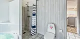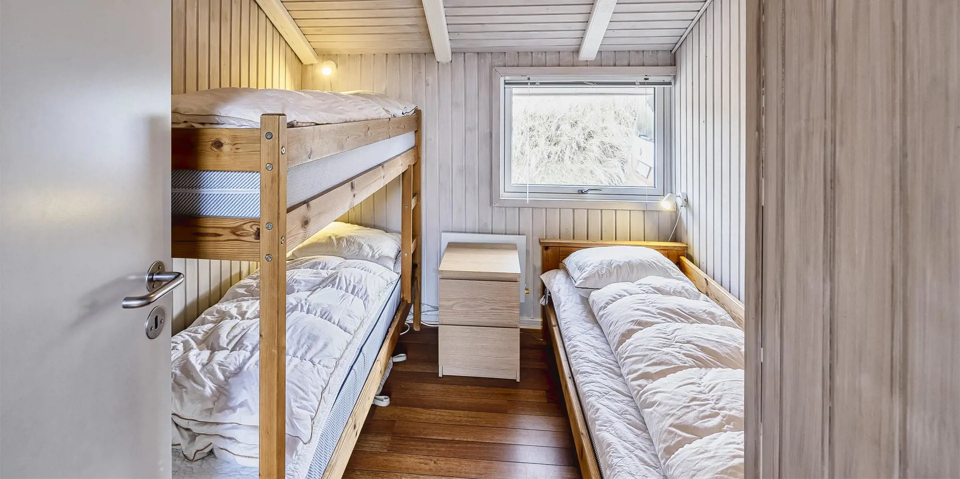 3 Schlafzimmer. 2 mit Doppelbett 180x200 cm. 1 mit 1 Einzelbetten (je 90x200 cm) und 1 Etagenbett.