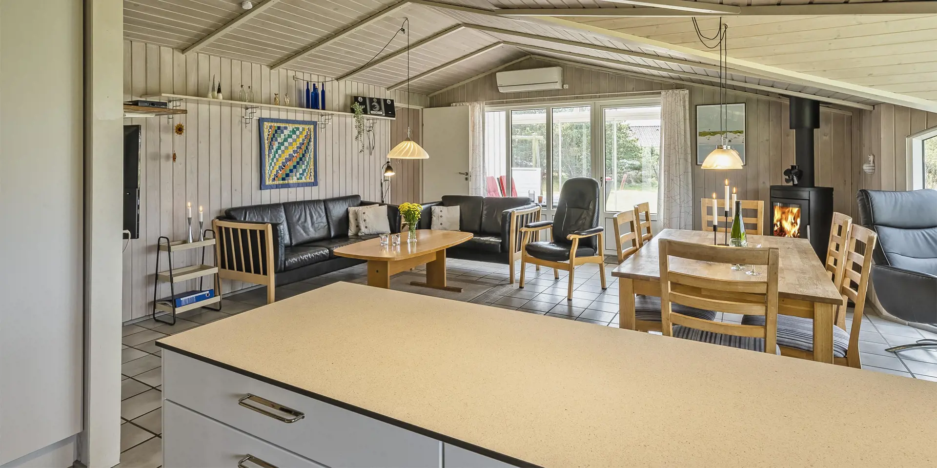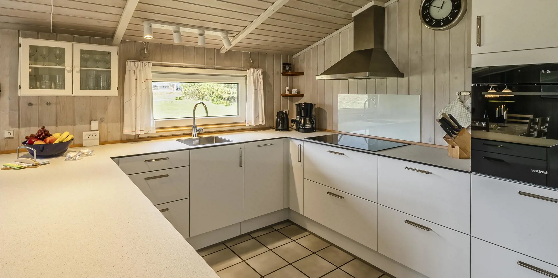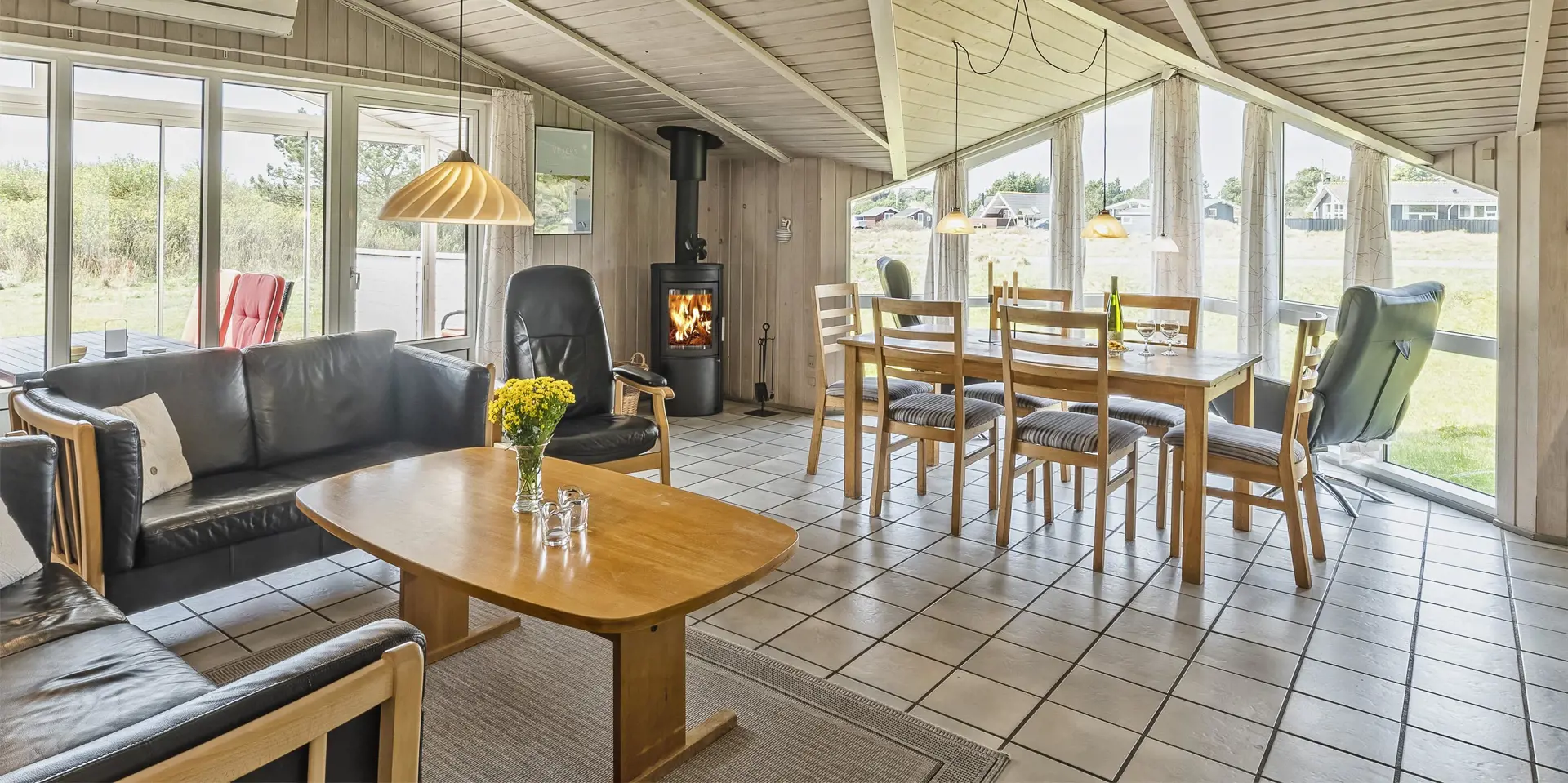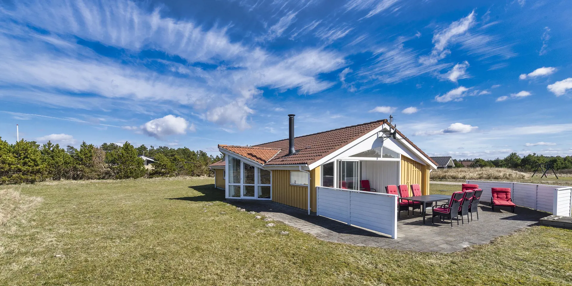 Helles und nett eingerichtetes Ferienhaus auf einem großen offenen Rasengrundstück gelegen. Das Ferienhaus ist ausgestattet für 8 Personen. Der Strand ist ca. 1 Km vom Ferienhaus entfernt. Der Wohn- und Essbereich ist mit der Küche hin offen gehalten. Dieser komplette Bereich ist gefliest. Der Wohnbereich hat gemütliche Sitzmöbel und einen Kamin. Der Speiseplatz ist hell und freundlich. Durch die große Fensterfront kommt viel Licht an den Essbereich. Es befindet sich eine Warmepumpe im Ferienhaus. Mit dieser Warmepumpe haben sie die Möglichkeit die Stromkosten zu senken, denn die Warmepumpe ist energiesparend. Das deutsche Fernsehprogramm empfangen Sie über eine Parabolantenne.Desweiteren befindet sich Chrome Cast und Smart TV im Haus. Auch die dänischen DR-kanäle können empfangen werden. Der offene Küchenbereich verfügt über einen Herd mit Cerankochfeld, einem Backofen, einer Geschirrspülmaschine, einer Mikrowelle und einer Kühl- und Gefrierkombination. Das Badezimmer hat ein WC, ein Handwaschbecken, eine Dusche, eine Sauna und einen Whirlpool. Ein weiteres kleines Bad mit WC und Handwaschbecken ist vorhanden. Eine Waschmaschine und ein Trockner stehen den Gästen ebenfalls zur Verfügung. Insgesamt befinden sich vier Schlafzimmer im Hause: DB + DB + 2B + 2B. Alles Schlafzimmer verfügen über Teppichboden. Zwei davon sind mit je einem Doppelbett ausgestattet und die beiden anderen mit je zwei Einzelbetten. Das Ferienhaus verfügt über einen Internetanschluss (W-Lan 200/20 Mbit). Das Rauchen im Ferienhaus ist nicht erlaubt. Es sind keine Haustiere erlaubt. Von dem gesamten Terrassenbereich ist ein kleiner Teil, direkt am Haus, überdacht, sozusagen als Wintergarten, wobei hier keine Aufwärmmöglichkeiten gegeben sind. Für die Kleinen Gäste steht auf dem Grundstück eine Schaukel und Sandkiste zum Spielen bereit. Gratis Eintritt für das Badeland in Oksbøl 2025. Das Ferienhaus ist 1992 erbaut worden.Bad und Küche wurden 2023 renoviert.