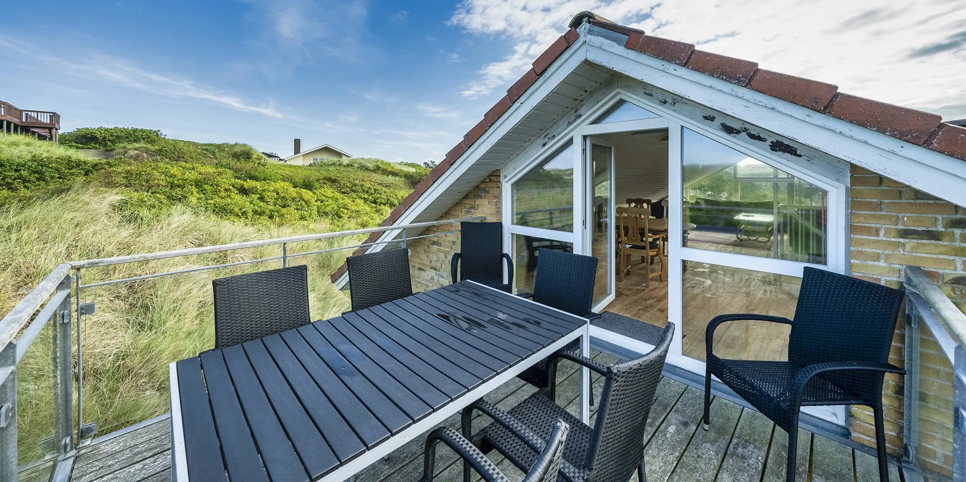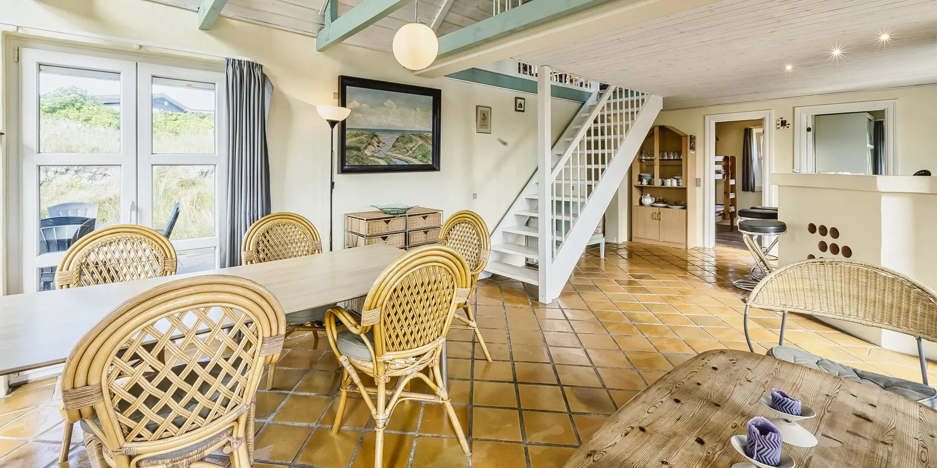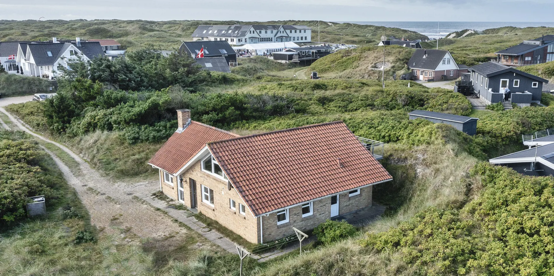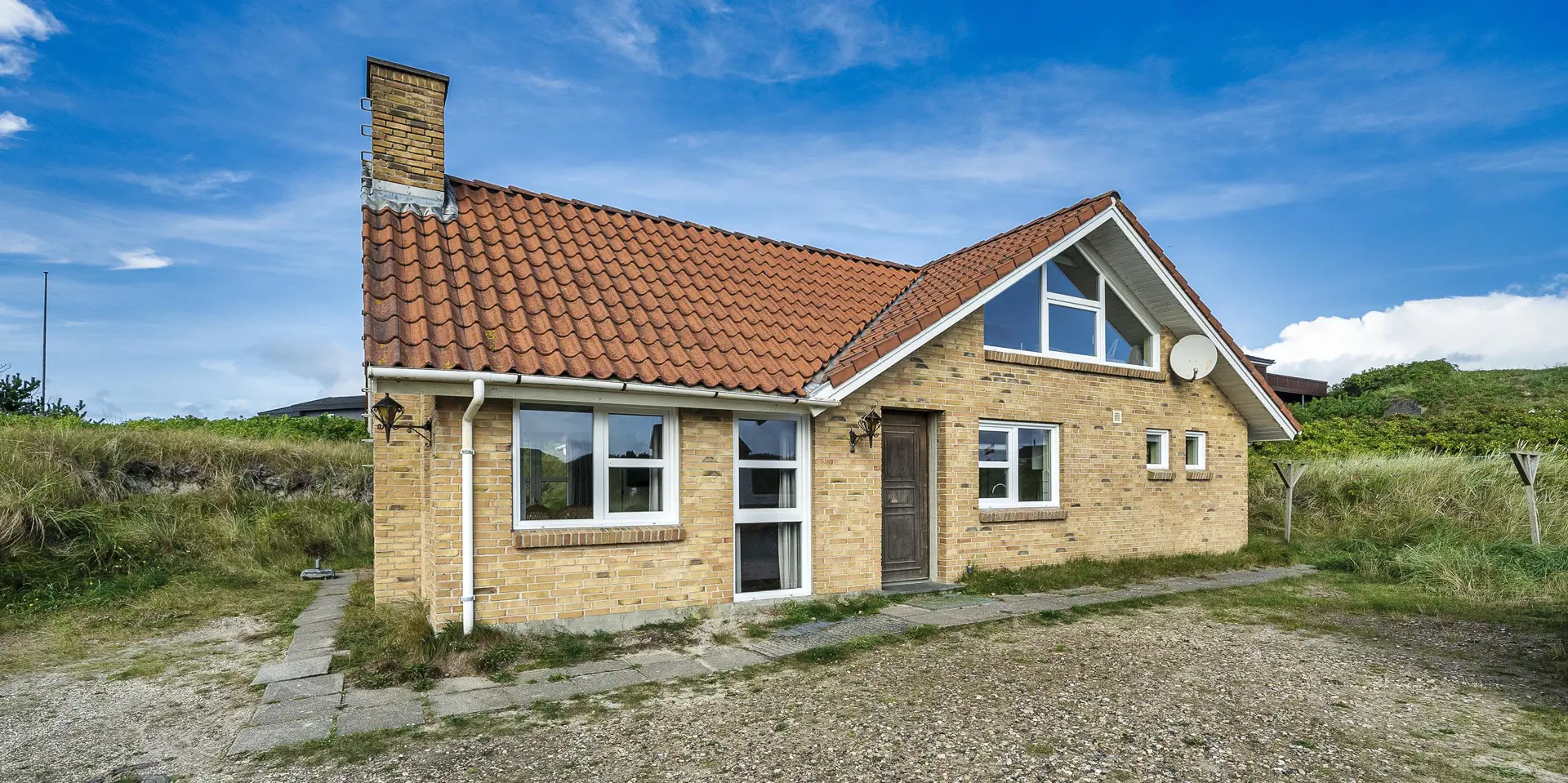 Grosses und einfaches Ferienhaus in Mitten der Dünenlandschaft gelegen. Der Strand ist nur ”Sage und Schreibe” 200 Meter vom Haus entfernt. Das Ferienhaus ist für 6-8 Personen ausgestattet. Die Räumlichkeiten sind auf 2 Ebenen verteilt. Im Erdgeschoss befindet sich ein Wohn- und Essbereich, die Küche, das Bad und die vier Schlafzimmer. Im Wohn- und Essbereich ist der Kamin aufgestellt. Das deutsche Fernsehprogramm empfangen Sie über eine Parabolantenne. Der Küchenbereich ist zum Wohn- und Essbereich offen gehalten und ein Tresenbereich mit Barhockern ist aufgestellt. Die Küche ist mit einfachen Küchenelementen ausgstattet und verfügt über einen Herd, einem Backofen, einer Geschirrspülmaschine, einer Mikrowelle und einer Kühl- und Gefrierrkombination. Das normale Badezimmer hat ein WC, ein Handwaschbecken, eine Dusche und einen Whirlpool. Das Gästebad verfügt über ein WC und Handwaschbecken. Eine Waschmaschine steht den Gästen auch zur Verfügung und steht im Technikraum/ hinteren Eingangsbereich. Vier Schlafzimmer: DB + DB + 2B + 2B. Zwei der Schlafzimmer verfügen über je einem Doppelbett und die beiden anderen Schlafzimmer sind mit je einem Etagenbett ausgestattet. Die Etagenbetten eignen sich nur für kleine Kinder, nicht für Erwachsene. Über eine Holztreppe im Wohn- und Essbereich gelangen Sie dann in das obere Geschoss. Hier befindet sich ein weiterer Wohnbereich mit gemütlichen Sitzmöbeln und einem zusätzlichen Esstisch und Stühlen. Hier ist auch ein Fernsehgerät aufgestellt, der aber keine dänischen Programme vorweist. Vom Obergeschoss haben Sie auch einen Zugang auf den Balkon mit einem schönen Blick über das Ferienhausgebiet. Der Terrassenbereich am Hause ist durch eine Reihe von Büschen geschützt. Es sind max. drei Haustiere erlaubt. Das Rauchen ist nicht gestattet. Das Ferienhaus wurde 1996 erbaut.