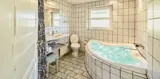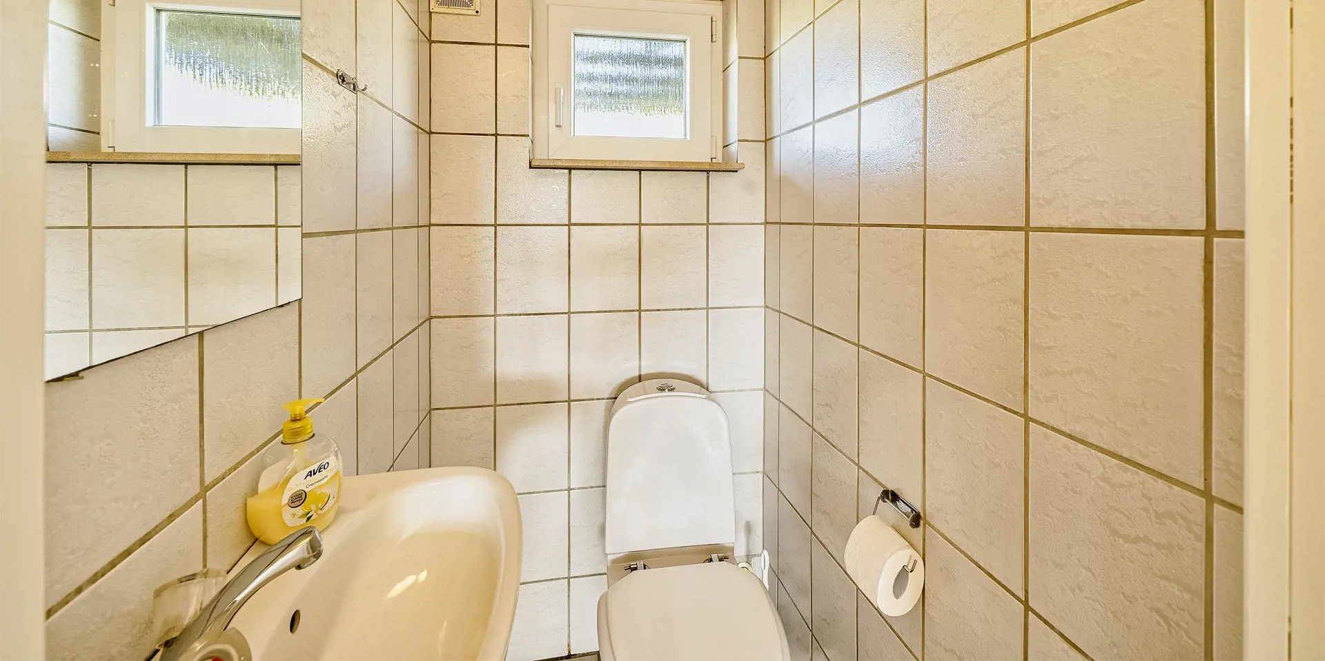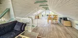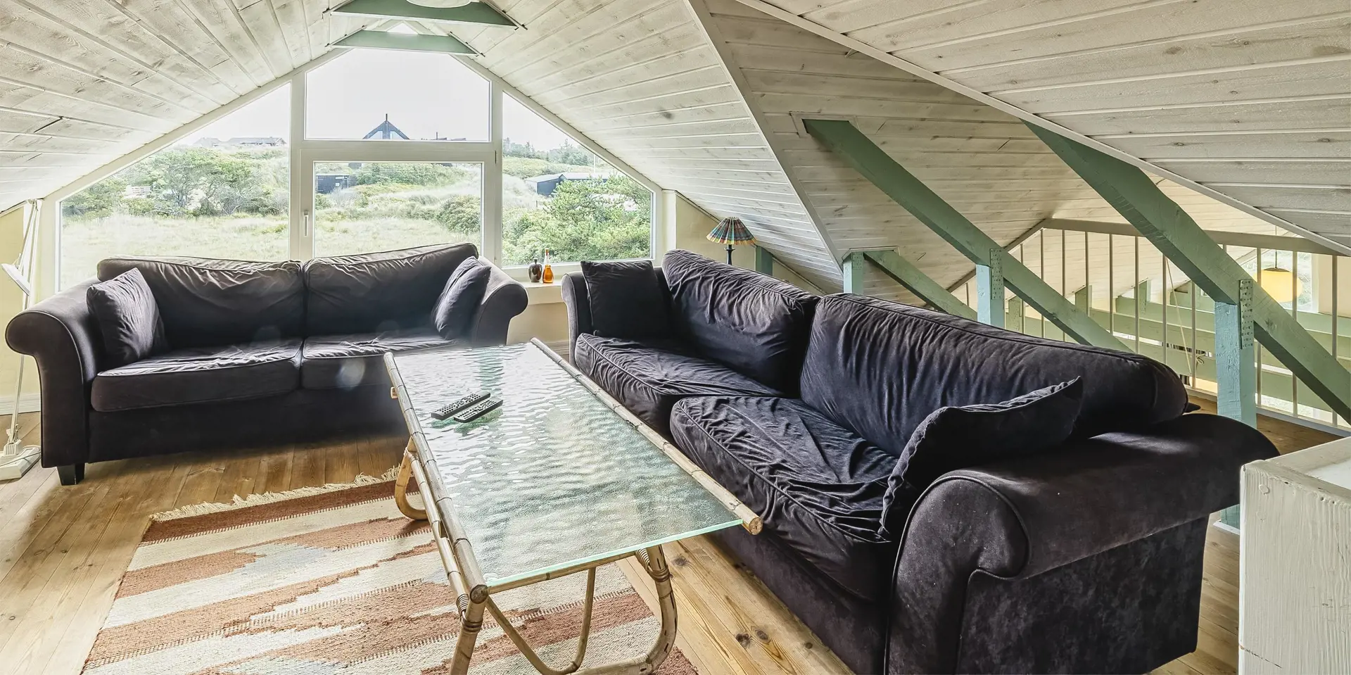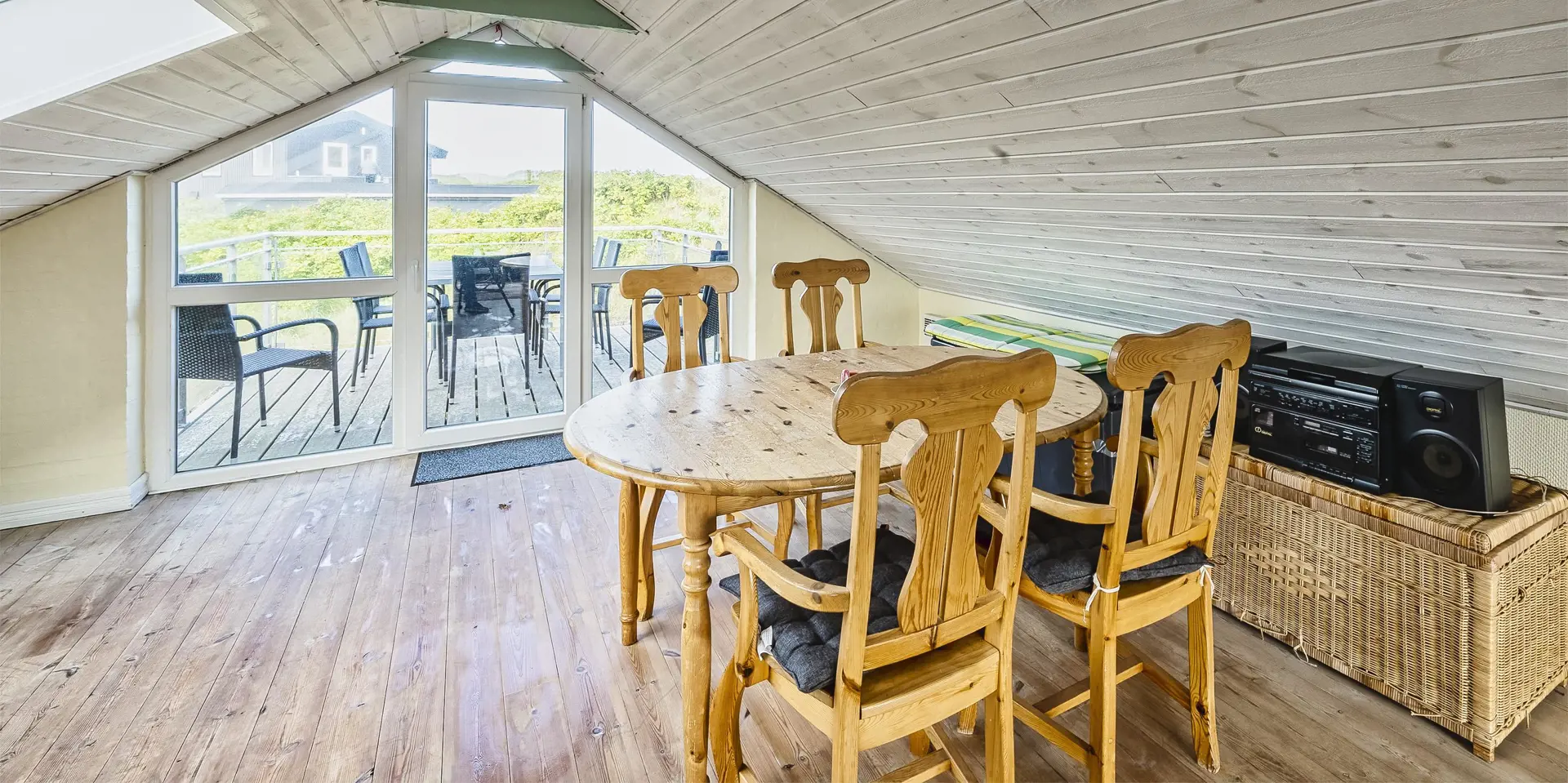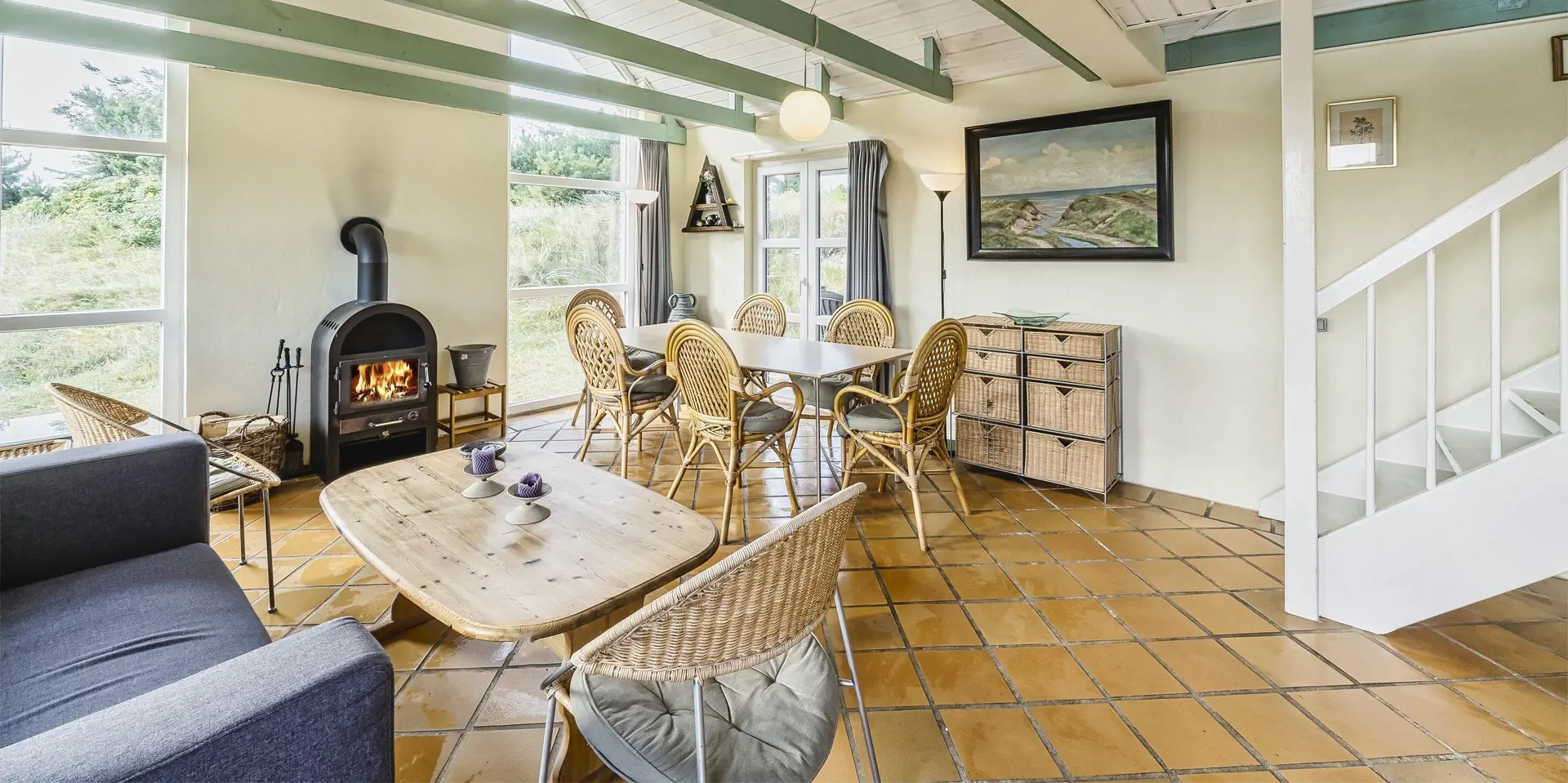Grosses und einfaches Ferienhaus in Mitten der Dünenlandschaft gelegen. Der Strand ist nur ”Sage und Schreibe” 200 Meter vom Haus entfernt. Das Ferienhaus ist für 6-8 Personen ausgestattet. Die Räumlichkeiten sind auf 2 Ebenen verteilt. Im Erdgeschoss befindet sich ein Wohn- und Essbereich, die Küche, das Bad und die vier Schlafzimmer. Im Wohn- und Essbereich ist der Kamin aufgestellt. Das deutsche Fernsehprogramm empfangen Sie über eine Parabolantenne. Der Küchenbereich ist zum Wohn- und Essbereich offen gehalten und ein Tresenbereich mit Barhockern ist aufgestellt. Die Küche ist mit einfachen Küchenelementen ausgstattet und verfügt über einen Herd, einem Backofen, einer Geschirrspülmaschine, einer Mikrowelle und einer Kühl- und Gefrierrkombination. Das normale Badezimmer hat ein WC, ein Handwaschbecken, eine Dusche und einen Whirlpool. Das Gästebad verfügt über ein WC und Handwaschbecken. Eine Waschmaschine steht den Gästen auch zur Verfügung und steht im Technikraum/ hinteren Eingangsbereich. Vier Schlafzimmer: DB + DB + 2B + 2B. Zwei der Schlafzimmer verfügen über je einem Doppelbett und die beiden anderen Schlafzimmer sind mit je einem Etagenbett ausgestattet. Die Etagenbetten eignen sich nur für kleine Kinder, nicht für Erwachsene. Über eine Holztreppe im Wohn- und Essbereich gelangen Sie dann in das obere Geschoss. Hier befindet sich ein weiterer Wohnbereich mit gemütlichen Sitzmöbeln und einem zusätzlichen Esstisch und Stühlen. Hier ist auch ein Fernsehgerät aufgestellt, der aber keine dänischen Programme vorweist. Vom Obergeschoss haben Sie auch einen Zugang auf den Balkon mit einem schönen Blick über das Ferienhausgebiet. Der Terrassenbereich am Hause ist durch eine Reihe von Büschen geschützt. Es sind max. drei Haustiere erlaubt. Das Rauchen ist nicht gestattet. Das Ferienhaus wurde 1996 erbaut.