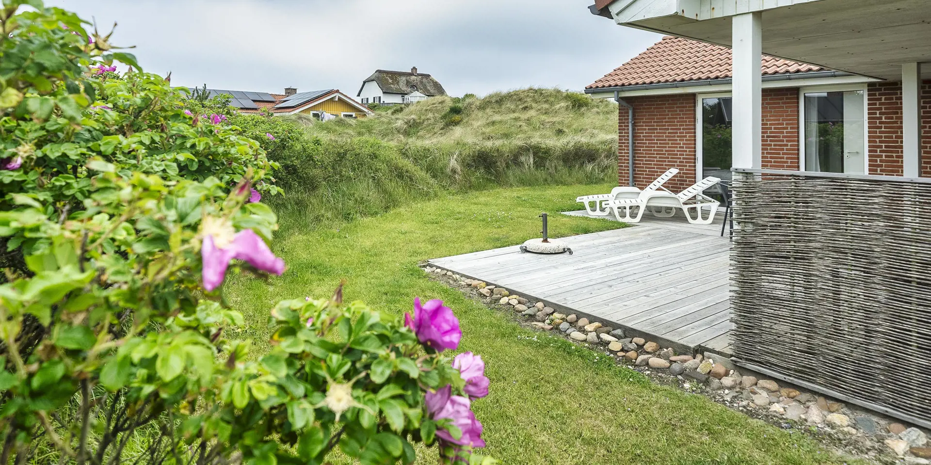 Dieses Steinferienhaus liegt in der Dünenkette im Nordvej und bietet genügend Platz für 4 Personen und ist nur 200 Meter vom Strand entfernt. Auch Ihr PKW findet hier einen geschützten Platz in dem am Haus befindlichem Carport. Trockenen Fußes gelangen Sie durch das Carport in das Ferienhaus. Der Eingangsbereich für Ablage von Jacken und Schuhe geeignet und auch mit der Waschmaschine und der Geschirrspülmaschine ausgestattet. Weiter gelangen Sie dann durch die Tür in den offenen Küchenbereich. Die Küche ist mit einem Herd und Backofen und einer Kühl/Gefrierkombination ausgestattet. Der gesamte Wohn- und Essbereich ist mit Steinfliesen verlegt. Das große Ledersofa im Wohnbereich lädt zum kuscheln und relaxen ein. Deutsches Fernsehprogramm ist über eine Parabol-Antenne zu empfangen. Die angenehme Wärme, die Sie dann zum relaxen brauchen, spendet der im Haus befindliche Morsø Brennofen. Es befindet sich eine Warmepumpe im Ferienhaus. Mit dieser Warmepumpe haben sie die Möglichkeit die Stromkosten zu senken, denn die Warmepumpe ist energiesparend. Durch die großen langen Fenster kommt viel Helligkeit ins Haus. Das Badezimmer is mit den gleichen Steinfliesen ausgelegt und hat ein WC, eine Dusche, ein Handwaschbecken und eine großzügige Ablagefläche für Ihre Utensilien. 3 Schlafzimmer: DB + DB + DB. 1 Schlafzimmer mit einem Doppelbett und großer Schrankfront, 1 Schlafzimmer mit einem Futonbett und das 3. Zimmer ist als Relax-zimmer vorgesehen und mit einem Schlafsofa ausgestattet. Klimaanlage. Internetanschluss (W-Lan). Vor dem Haus befindet sich eine geflieste Terrasse, ebenso hinter dem Haus. Es sind max. 2 Haustiere erlaubt. Gratis Eintritt für das Badeland und Bowling in Varde in 2026. Das Rauchen ist nicht gestattet. Das Ferienhaus ist 1988 erbaut.