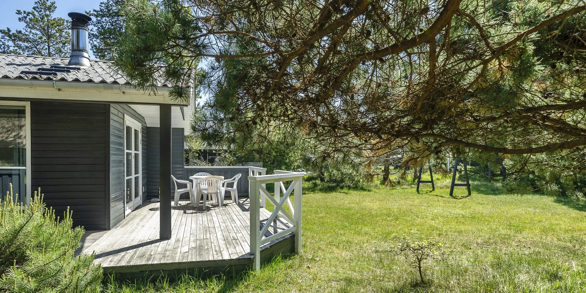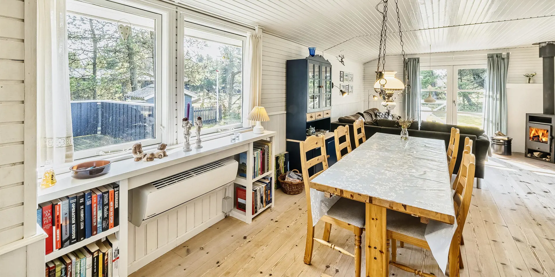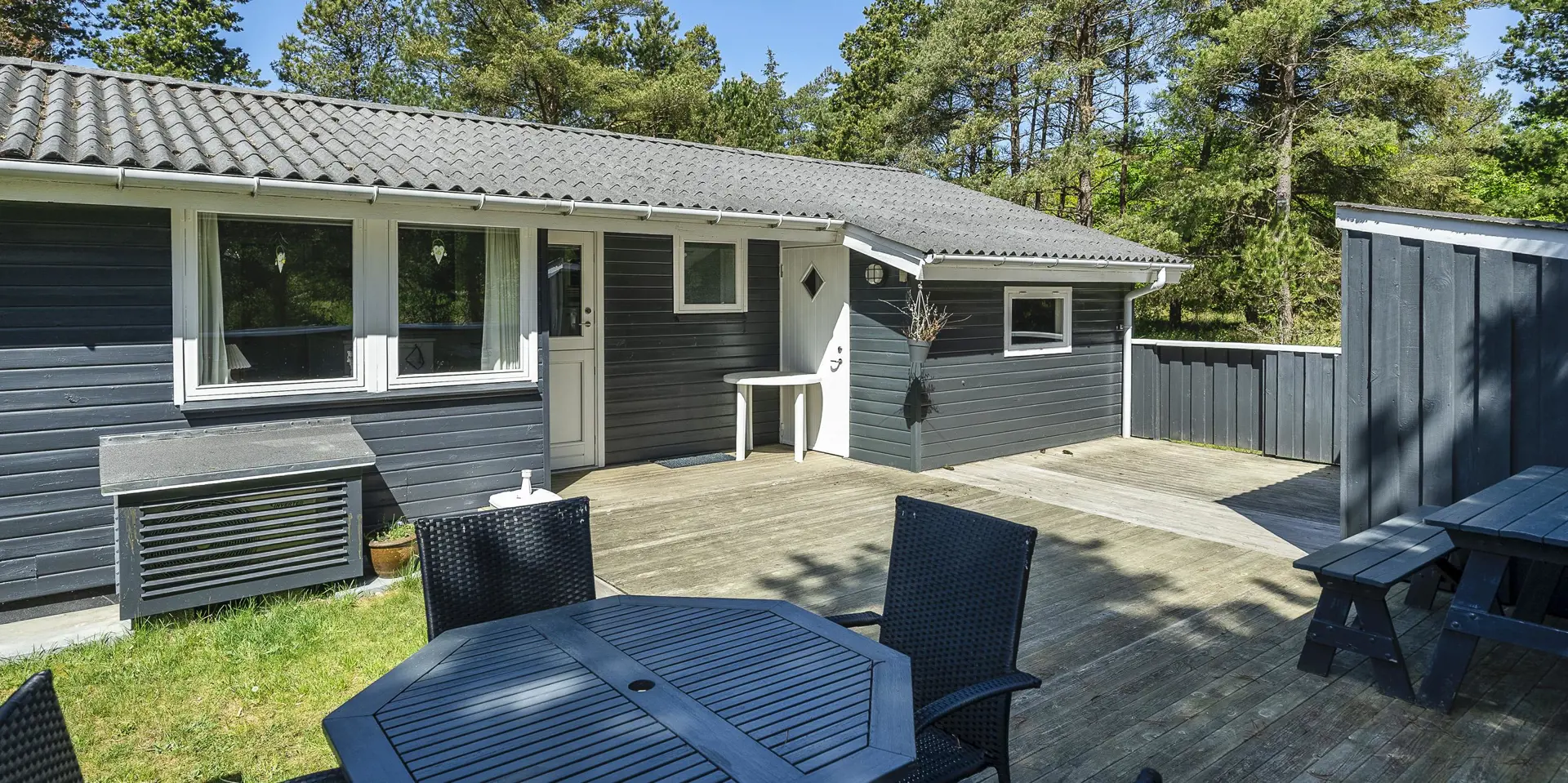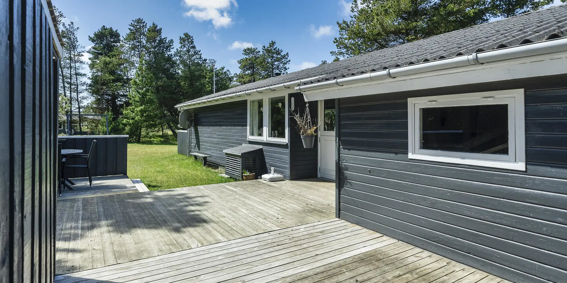 Gemütliches Ferienhaus am Ende einer Sackgasse und auf einem naturbelassenen Grundstück gelegen. Das Ferienhaus ist für 4-6 Personen ausgestattet. Der Strand ist ca. 2 Km vom Haus entfernt. In den Wohn- und Schlafzimmern ist ein schöner Holzfußboden verlegt. In dem Wohnzimmer ist ein Kamin aufgestellt und sorgt für eine wohlige Wärme und die dänische “hygge” Gemütlichkeit. Es befindet sich eine Warmepumpe im Ferienhaus. Mit dieser Warmepumpe haben sie die Möglichkeit die Stromkosten zu senken, denn die Warmepumpe ist energiesparend. Das deutsche Fernsehprogramm empfangen sie über eine Parabolantenne. Der Küchenbereich ist zum Wohn- und Essbereich offen gehalten und verfügt über einen Herd mit Cerankochfeld, einem Backofen, einer Geschirrspülmaschine, einer Mikrowelle und einem Kühlschrank. Das Badezimmer ist hell ausgestattet und hat ein WC, ein Handwaschbecken und eine Dusche. Insgesamt stehen den Gästen drei Schlafzimmer zur Verfügung. Alle drei Schlafzimmer verfügen über ein doppelbett.( 1x 140x200, 1x 160x200 und 1x 180x200). Eine Waschmaschine steht Ihnen auch zur Verfügung. Für die kleinen Gäste befindet sich auf dem Grundstück eine Sandkiste, ein Schaukelstativ und ein kleines Kinderspielhaus. Es sind zwei schöne Terrassenbereiche am Haus. Der eine Bereich ist sogar sehr geschützt. Das Ferienhaus verfügt über einen Internetzugang (W-Lan). Es sind 2 Haustiere erlaubt. Das Ferienhaus ist 1968 erbaut worden.
