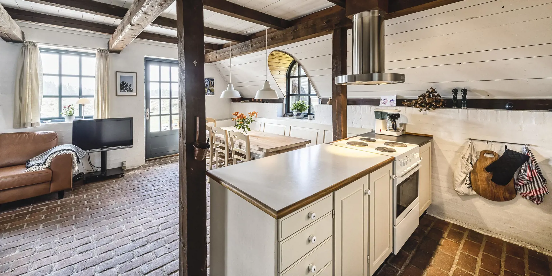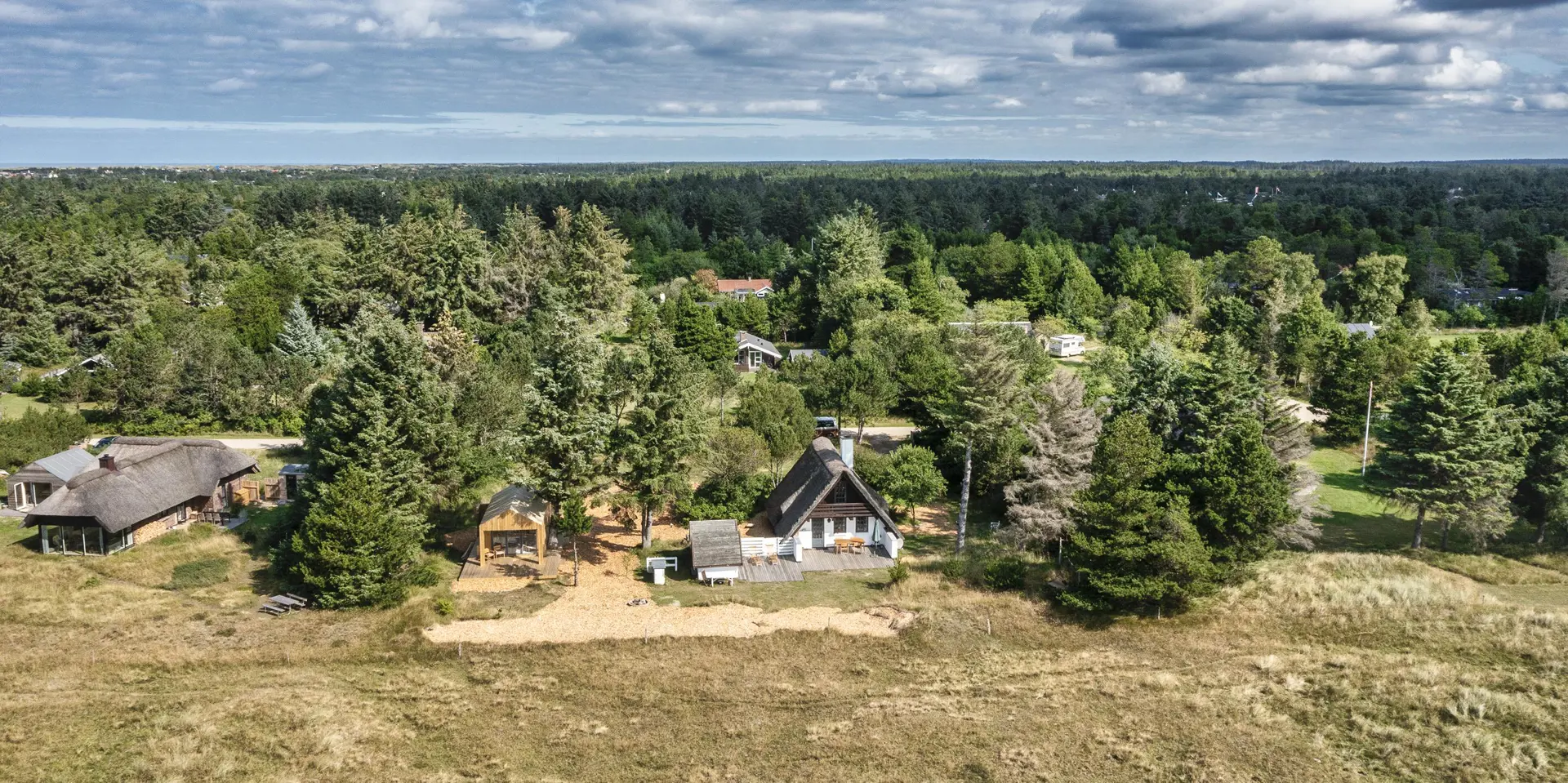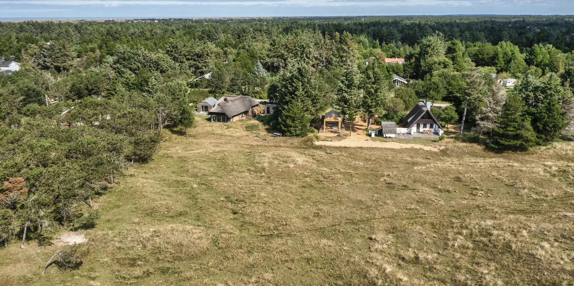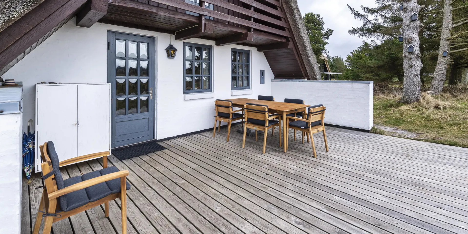 Urgemütlich und rustikal eingerichtetes Reetdachhaus auf einem grossem Naturgrundstück am Randes des Naturschutzgebietes gelegen mit wundervollem Blick auf Feld und Wiese. Das Ferienhaus ist für 4 bis 6 Personen ausgestattet und die Räumlichkeiten sind über zwei Ebenen verteilt. Der Strand ist ca. 1,2 Km vom Ferienhaus entfernt. Im kompletten Erdgeschoss ist der Fussboden mit Ziegelsteinen ausgelegt. Im Erdgeschoss befindet sich der Wohn- und Essbreich, die Küche, das Badezimmer und ein Schlafzimmer. Im kompletten Erdgeschoss sind die Deckenbalken sichtbar und bringen den gewissen Charme ins Haus. Der Wohnbereich hat eine gemütliche Leder-Rundsitzecke und verfügt über einen Kamin. Das Fernsehprogramm empfangen Sie mit Chromcast. Eine Holzbank bietet am Essplatz genügend Sitzmöglichkeiten, dazu stehen noch weitere Esszimmerstühle zur Verfügung. Die Offene Wohnküche ist in einem Landhausstil eingerichtet und verfügt über einen Herd mit Platten, einer Mikrowelle, einer Geschirrspülmaschine und einem Kühlschrank mit kleinem Gefrierfach von15 x 45 cm. Das Badezimmer hat ein WC, ein Handwaschbecken und eine Dusche. Eine Warmepumpe befindet sich ebenfalls im Ferienhaus. Mit dieser Warmepumpe haben Sie die Möglichkeit die Stromkosten zu senken, da sie energiesparnd ist. Hier im Erdgeschoss befindet sich ein von den drei Schlafzimmern, das verfügt über ein Doppelbett (160 x 200). über eine steile Trepp gelangen Sie dnn ins obere Geschoss. Im Obergeschoss befinden sich dann zwei weitere Schlafzimmer, das eine verfügt über ein Schlafsofa (140 x 200) und einen Schreibtisch und mit einem tollen Blick auf Feld und Wiese und den schönen kleinen Aarrildsø. Das zweite Schlafzimmer verfügt über zwei Einzelbetten und hat einen Zugang zu einem Balkon, wobei Sie hier vom Balkon den Blick auf Feld und Wiese in vollen Zügen geniessen können. Eine Waschmaschine steht den Gästen auch zur Verfügung. Das Ferienhaus verfügt über einen Internetanschluss (W-Lan). Das Rauchen im Ferienhaus ist nicht erlaubt. Es ist max. 1 Haustier erlaubt. Von der grosszügigen Terrasse haben Sie einen wundervollen Blick auf Feld und Wiese. Ein kleiner Teil der Terrasse ist sogar überdacht. Die Sauna ist in einem Nebengebäude. Desweiteren gibt es noch eine Aussendusche, allerdings nur mit kaltem Wasser. Schöne Holzterrasse mit tollem Blick. Das Ferienhaus ist in 1977 erbaut worden und kontinuierlich renoviert.