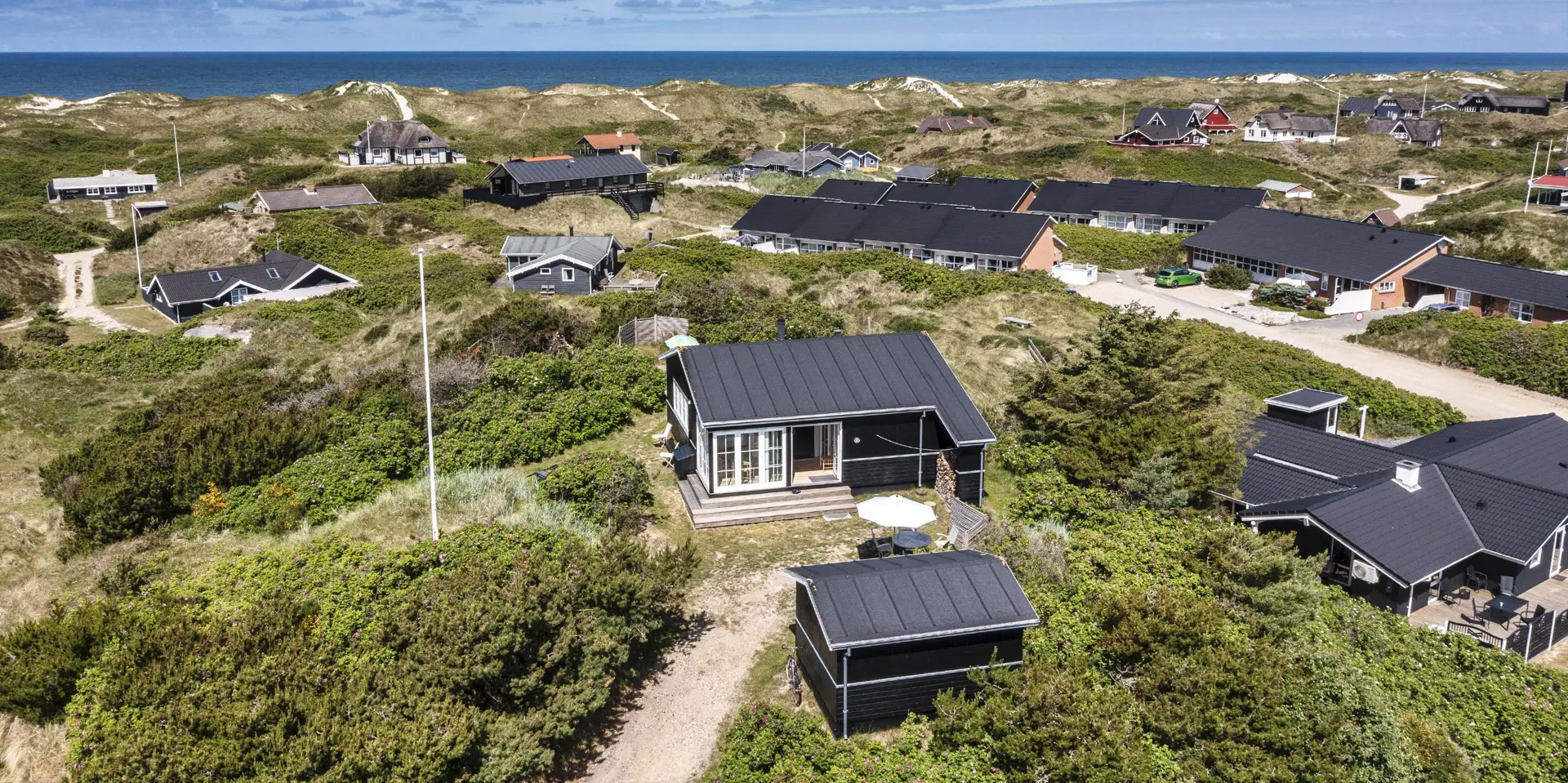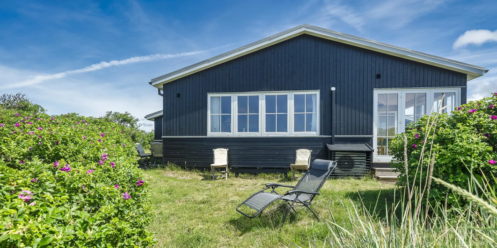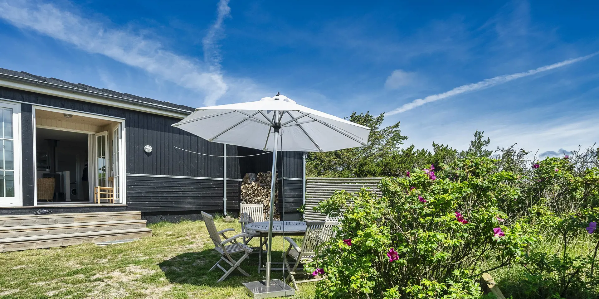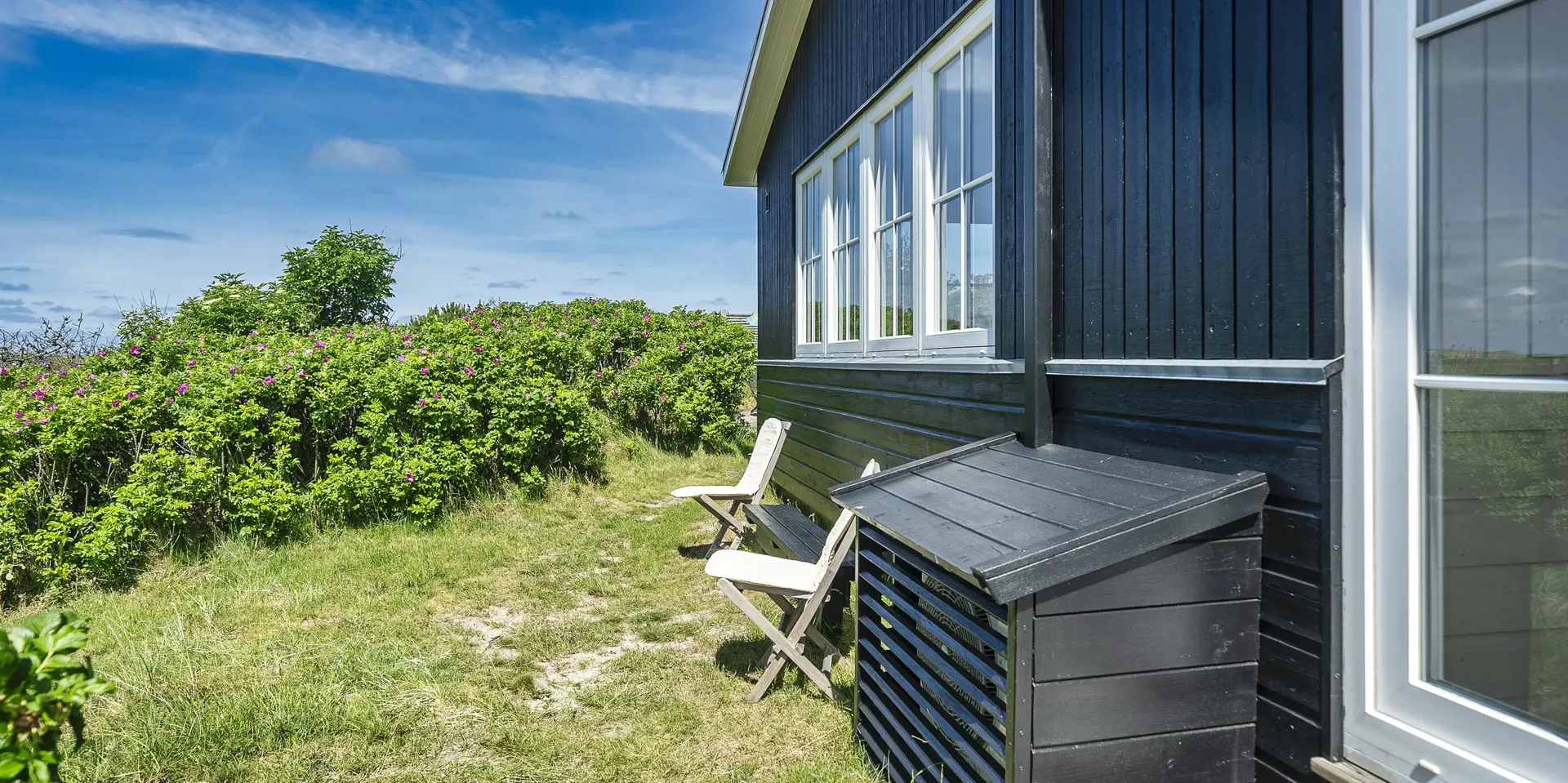 Auf einer Düne liegt dieses kleine dänisch eingerichtete Ferienhaus für 6 Personen und nur 150 Meter vom Strand entfernt. Das Ferienhaus liegt völlig ungestört und hier haben Sie vom Wohnzimmer aus einen wundervollen Meeresblick. Der Wintergarten, der noch mit schönen Holzdielen belegt ist, hat grosse Schiebetüren, wobei eine schöne warme Brise in lauer Sommernacht durch das Haus fluten kann. Die Wohnkücke ist mit dem grosszügige Wohn- und Esszimmer integriert. Vom Wohnbereich aus, kann man das Feuer im Kamin lodern sehen. Dies bringt eine wohlige Wärme ins Ferienhaus. Es befindet sich eine Warmepumpe im Ferienhaus. Mit dieser Warmepumpe haben sie die Möglichkeit die Stromkosten zu senken, denn die Warmepumpe ist energiesparend. Deutsche Fernsehprogramme werden über eine Parabol-Antenne empfangen sowie auch Chrome cash. Da ist ein Grammofon. Das Fernsehgerät hat einen HDMI-Empfang für einen Computer und Drucker. Die offene Wohnküche verfügt über einen Herd mit Cerankochfeld, einem Backofen, einen Geschirrspüler und einem Kühlschrank. Ein kleiner zusätzlicher Gefrierschrank befindet sich im Schuppen. 3 Schlafzimmer: DB + DB + 2B. Hinter dem Essbereich gelangen Sie durch eine Tür zum Hauswirtschaftsraum und dem Ausgang zur Terrasse. Die Waschmaschine befindet sich hier im Hauswirtschaftsraum. Von hier gelangen Sie dann auch in das Badezimmer, mit Dusche, WC, und einem Handwaschbecken. Hinter dem Haus befindet sich dann die Terrasse und eine gemütliche Sitzgruppe zwischen den Hagebutten-Sträuchern. Über einen weiteren Auskuck können Sie das Meer erblicken und auch über einen Teil des Ferienhausgebietes. Desweiteren befindet sich ein Gästehaus auf dem Grundstück das mit einer Sauna mit ca. 17 qm, dem Trockner und als Abstellraum gedacht ist. Zusätzliche befindet sich dort eine aussen gelegene Dusche (nur mit kaltes Wasser). Rauchen ist nicht erlaubt. Internetanschluss (W-Lan) auch verfügbar. Es sind max. 2 Haustiere erlaubt.Es stehen den Gästen 2 Fahrräder am Ferienhaus zur Verfügung, wobei wir keine Haftung übernehmen bezüglich der Benutzung und Brauchbarkeit. Ferienhaus ist 2007 erbaut worden.