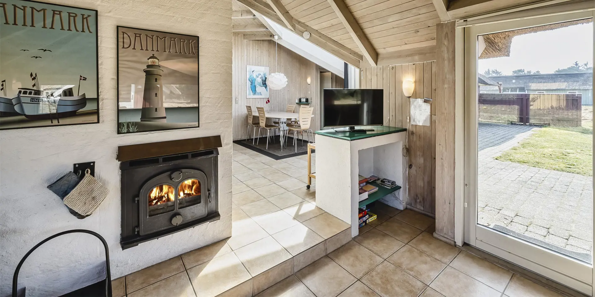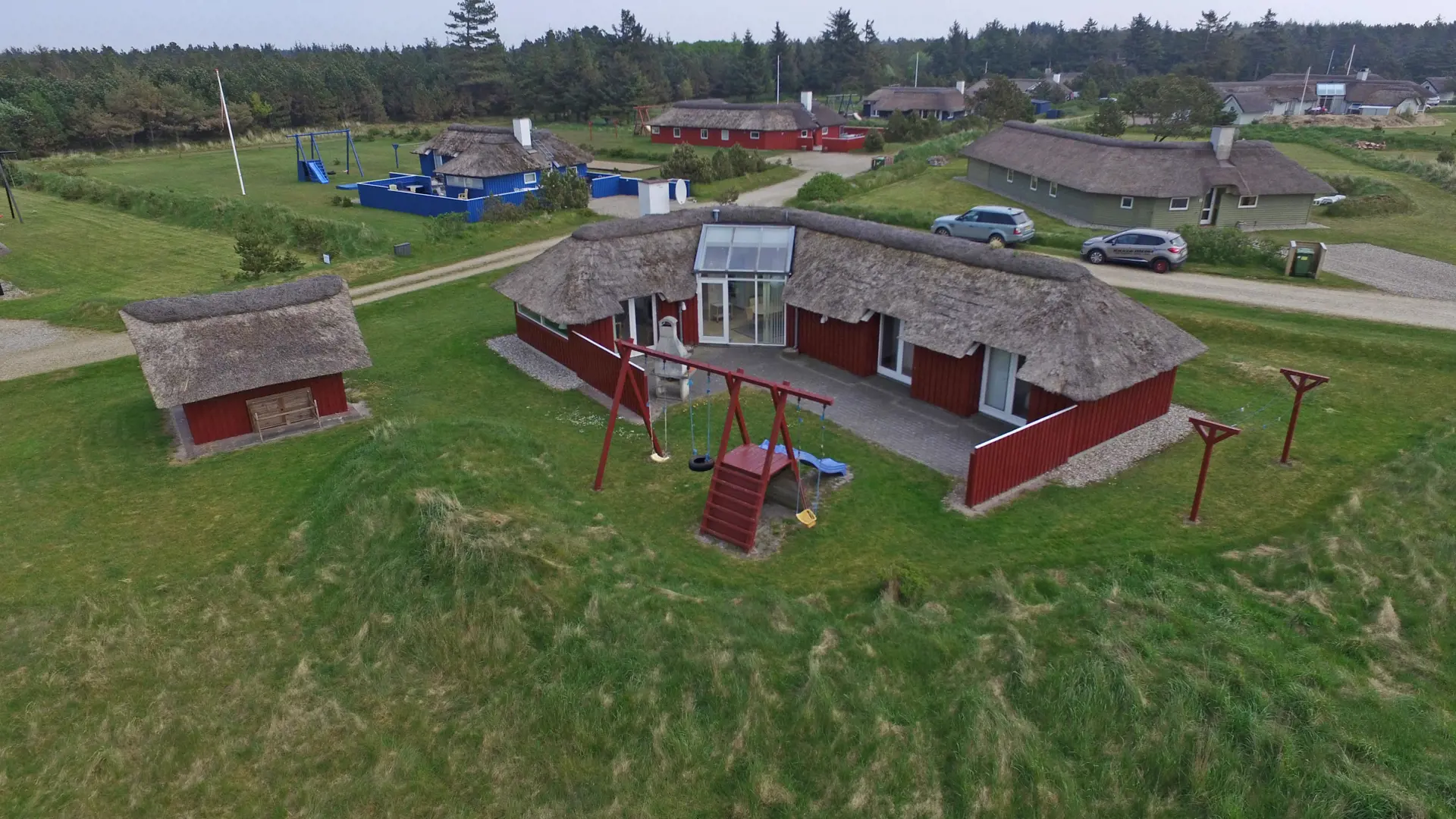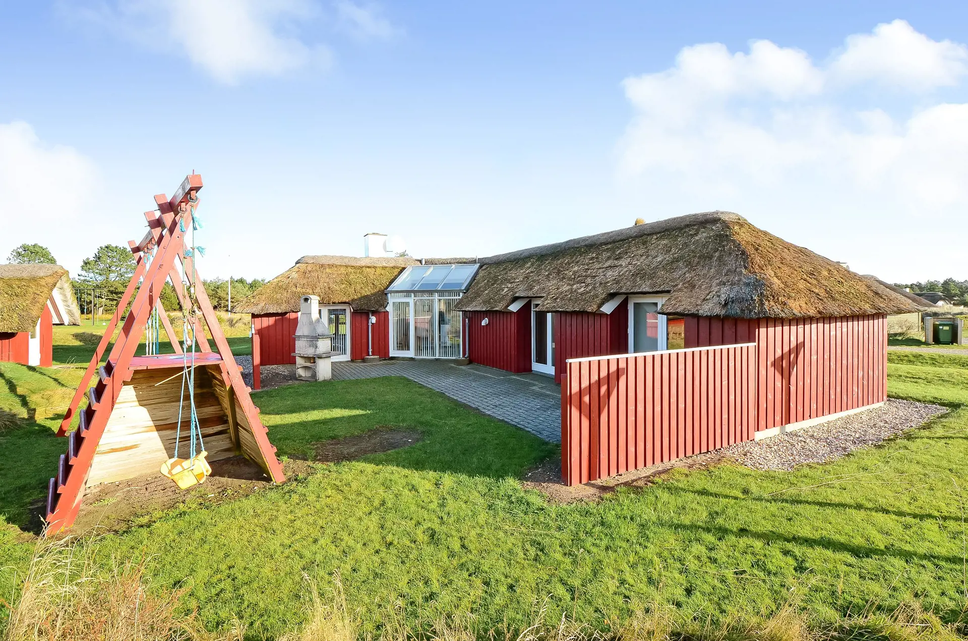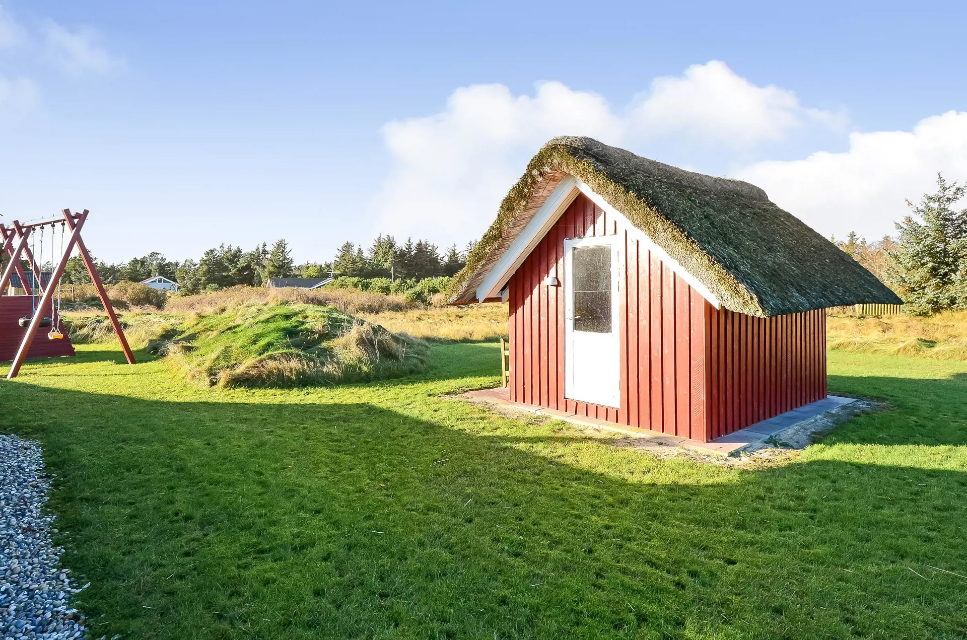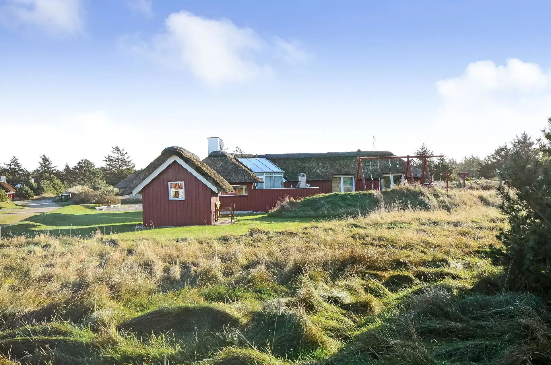 Geschmackvolles Ferienhaus für 8 Personen auf einem grossen mit gras- bewachsenen Grundstück an dem Wald und dem Fahrradweg zu Grærup Strand gelegen. Von dem Waldgebiet kommen die Hirsche und das Rotwild bis an die Ferienhäuser ran, um sich von den Gästen mit Obst und Gemüse verwöhnen zu lassen. Auf der grosszügigen Terrasse befindet sich ein Stein-Aussengrill, den Sie nicht nur zum Grillen, sondern auch als Lagerfeuerstelle für gemütliche Sommerabende nutzen können.Das Ferienhaus verfügt über ein gemütliches Wohnzimmer mit heller Holzvertäfelung, im Ferienhaus-Stil, und über einem eingebauten Kamin. Es befindet sich eine Warmepumpe im Ferienhaus. Mit dieser Warmepumpe haben sie die Möglichkeit die Stromkosten zu senken, denn die Warmepumpe ist energiesparend. Das Fernsehprogramm empfangen Sie über Stofa, daher sind nur 5-8 deutsche Kanäle zu empfangen. Über eine kleine Stufe vom Wohnzimmer gelangen Sie in den offenen Essbereich, der durch das Oberlicht sehr hell und freundlich erstrahlt. Die Küche ist mit einem Herd mit Cerankochfeld, einem Backofen, eine Mikrowelle, einer Geschirrspülmaschine und einer Kühl- und Gefrierkombination (2 Fächer) ausgestattet. Das Badezimmer verfügt über ein WC, ein Handwaschbecken einer Dusche und einem Whirlpool. Ebenso ist die Waschmaschine hier im Badezimmer aufgestellt. Es gibt 4 Schlafzimmer im Ferienhaus: DB + DB + 2B + 2B. Auch die kleinen Gäste fühlen sich auf dem Grundstück wohl, denn Sie haben ein Schaukelstativ mit Rutsche ind sogar ihr eigenes kleines Spielhäuschen. Das Ferienhaus verfügt über einen Internetanschluss. Das Rauchen ist nicht gestattet. Es sind max. 2 Haustiere erlaubt. Das Ferienhaus ist 1988 erbaut.