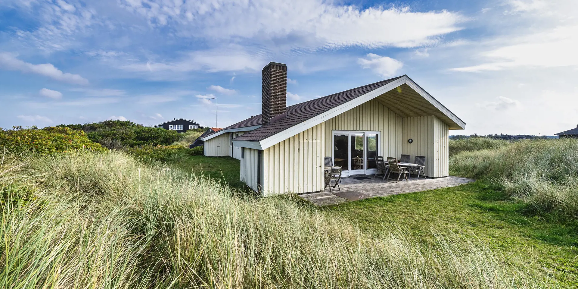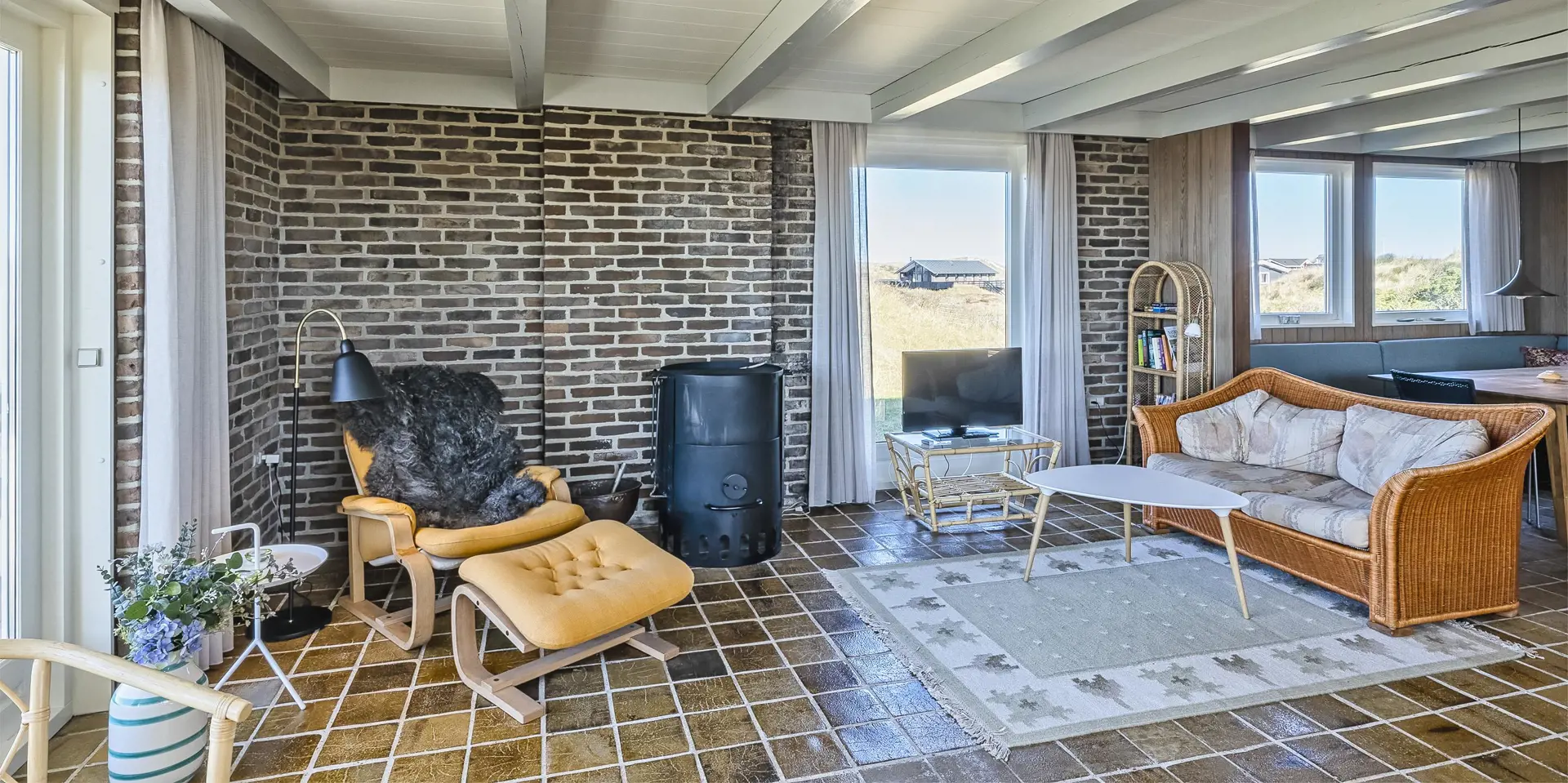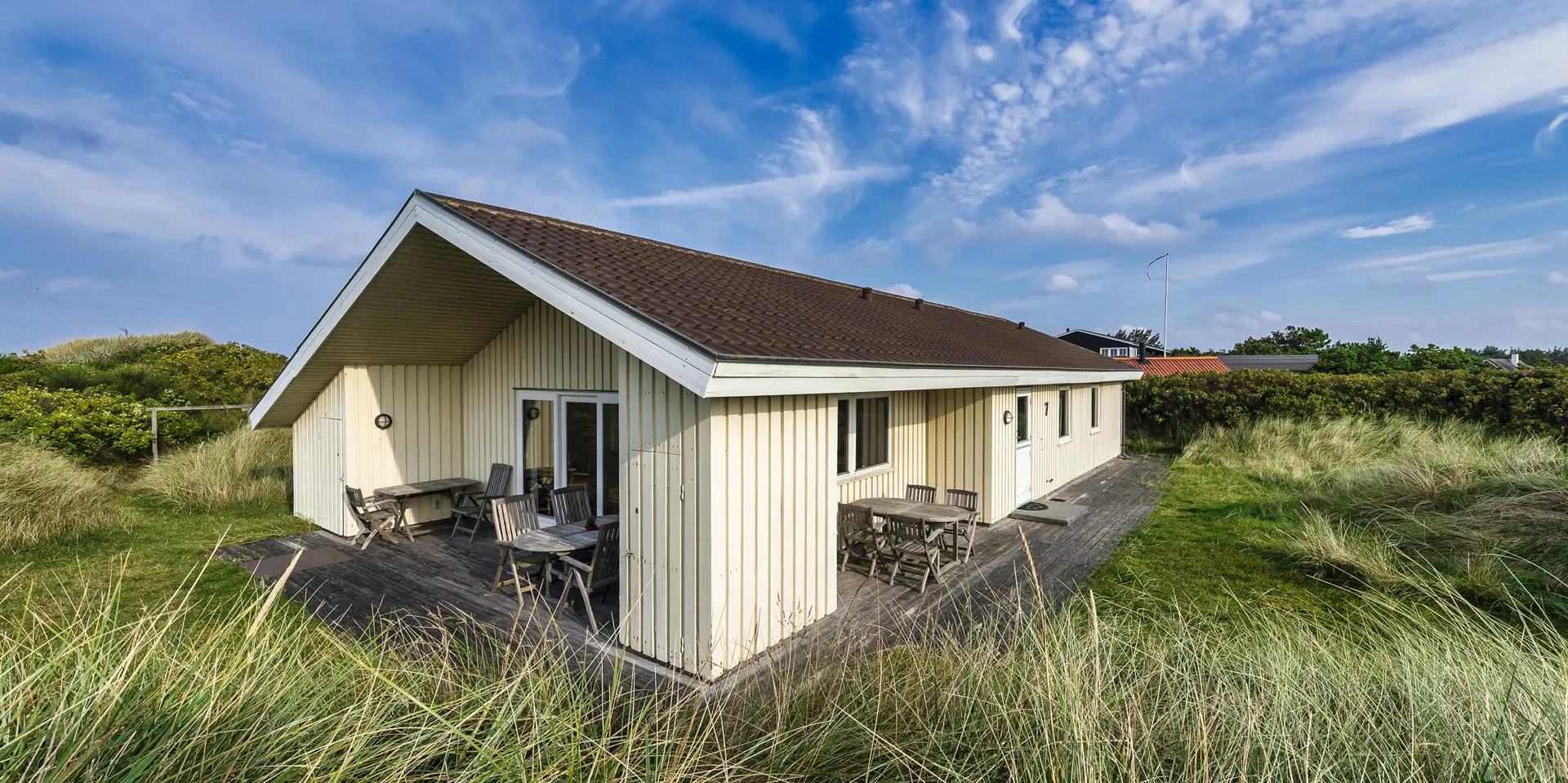 Rustikales gemütliches Ferienhaus auf einer Düne gelegen. Vom Ende des Grundstückes kann der Meeresblick richtig genossen werden. Der Aufstieg zum Ferienhaus ist nicht für Rollstuhlfahrer geeignet, da das Haus oben auf einer Düne sich befindet und kein befestigter Weg zum Haus führt. Die Zufahrt zum Ferienhaus ist nur von der nördlichen Seite des Nordvej´s möglich. Das Ferienhaus ist für 8 Personen ausgestattet. Der Strand ist nur Sage und Schreibe 150 Meter vom Haus entfernt. Der gemütliche Wohnbereich ist mit einem Kamin versehen, dieser spendet behagliche Wärme und die dänische ”hygge”. Das Fernsehprogramm empfangen Sie über Stofa, daher sind nur 5-8 deutsche Kanäle zu empfangen. Die neu renovierte Küche verfügt über einen Herd mit Cerankochfeld, einem Backofen, und einem Kühlschrank mit einem 3-Sterne-Gefrierfach. Der Küchenbereich ist offen zum Essbereich und bietet reichlich Platz für all seine Bewohner an. Der Essbereich ist mit einer tollen Sitzgruppe und Sitzbank ausgestattet. Von diesem Bereich haben Sie auch einen tollen Blick auf die Dünenkette. Desweiteren befindet sich eine Waschmaschine, kombiniert mit Trockner im Ferienhaus. Das Badezimmer ist mit einem WC, einem Handwaschbecken und einer Dusche ausgestattet. Desweiteren haben Sie ein Gäste WC mit Handwaschbecken im Ferienhaus. Insgesamt stehen den Bewohner vier Schlafzimmer zur Verfügung: DB + DB + 2B + 2B. Das Ferienhaus verfügt über einen Internetanschluss (W-Lan). Die Terrasse lädt zum verweilen ein und ein Teil davon ist sogar überdacht. Hier können Sie Ihre Abende ruhig und gemütlich geniessen, sollte es auch mal ein wenig tröpfeln. Von dem Grundstück aus haben Sie einen wunderschönen Blick zum Strand/Meer. Für die Kleinen Gäste steht ein Schaukelstativ auf dem Grundstück bereit. 2 Hunde sind erlaubt. Das Ferienhaus ist 1976 erbaut worden und in 2000 umgebaut.
