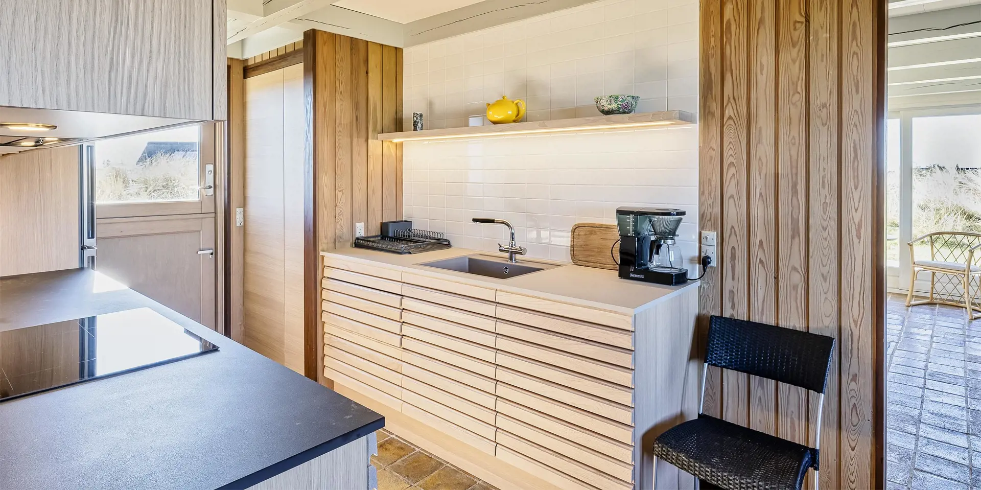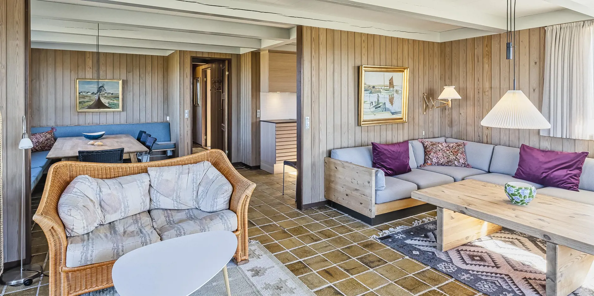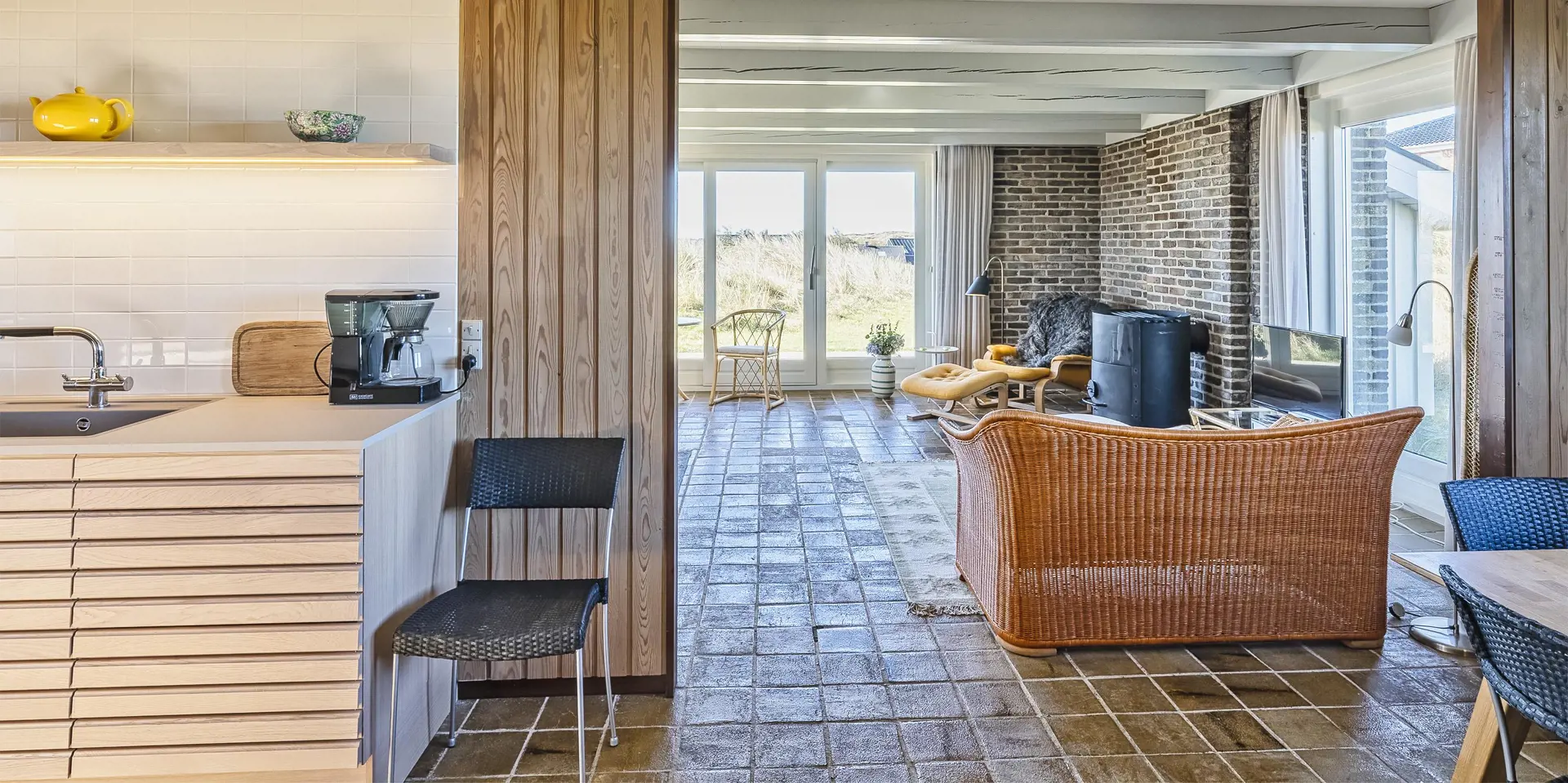 Rustikales gemütliches Ferienhaus auf einer Düne gelegen. Vom Ende des Grundstückes kann der Meeresblick richtig genossen werden. Der Aufstieg zum Ferienhaus ist nicht für Rollstuhlfahrer geeignet, da das Haus oben auf einer Düne sich befindet und kein befestigter Weg zum Haus führt. Die Zufahrt zum Ferienhaus ist nur von der nördlichen Seite des Nordvej´s möglich. Das Ferienhaus ist für 8 Personen ausgestattet. Der Strand ist nur Sage und Schreibe 150 Meter vom Haus entfernt. Der gemütliche Wohnbereich ist mit einem Kamin versehen, dieser spendet behagliche Wärme und die dänische ”hygge”. Das Fernsehprogramm empfangen Sie über Stofa, daher sind nur 5-8 deutsche Kanäle zu empfangen. Die neu renovierte Küche verfügt über einen Herd mit Cerankochfeld, einem Backofen, und einem Kühlschrank mit einem 3-Sterne-Gefrierfach. Der Küchenbereich ist offen zum Essbereich und bietet reichlich Platz für all seine Bewohner an. Der Essbereich ist mit einer tollen Sitzgruppe und Sitzbank ausgestattet. Von diesem Bereich haben Sie auch einen tollen Blick auf die Dünenkette. Desweiteren befindet sich eine Waschmaschine, kombiniert mit Trockner im Ferienhaus. Das Badezimmer ist mit einem WC, einem Handwaschbecken und einer Dusche ausgestattet. Desweiteren haben Sie ein Gäste WC mit Handwaschbecken im Ferienhaus. Insgesamt stehen den Bewohner vier Schlafzimmer zur Verfügung: DB + DB + 2B + 2B. Das Ferienhaus verfügt über einen Internetanschluss (W-Lan). Die Terrasse lädt zum verweilen ein und ein Teil davon ist sogar überdacht. Hier können Sie Ihre Abende ruhig und gemütlich geniessen, sollte es auch mal ein wenig tröpfeln. Von dem Grundstück aus haben Sie einen wunderschönen Blick zum Strand/Meer. Für die Kleinen Gäste steht ein Schaukelstativ auf dem Grundstück bereit. 2 Hunde sind erlaubt. Das Ferienhaus ist 1976 erbaut worden und in 2000 umgebaut.