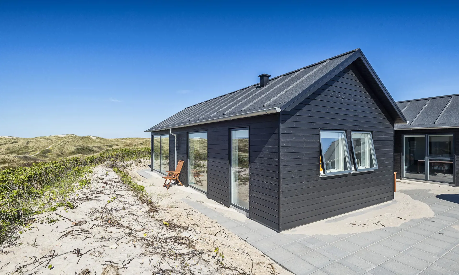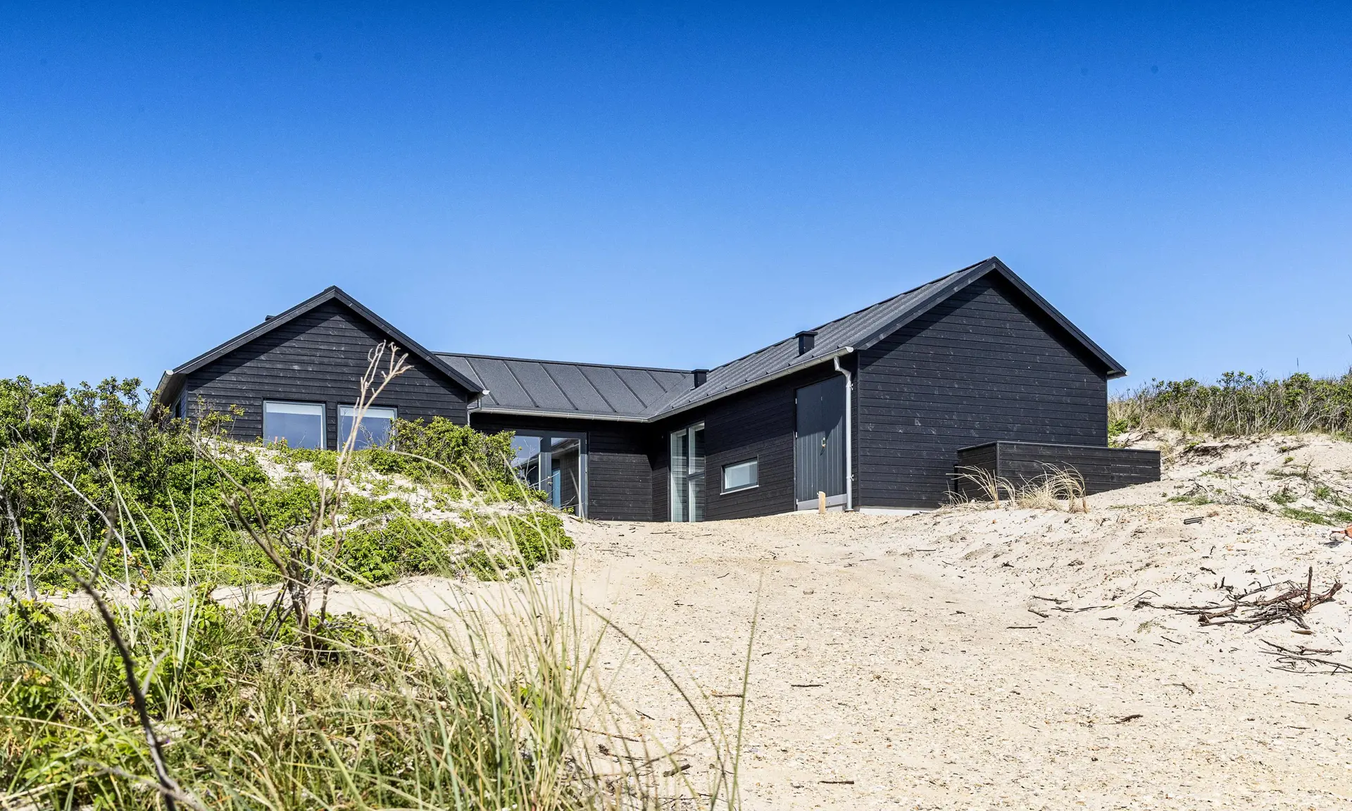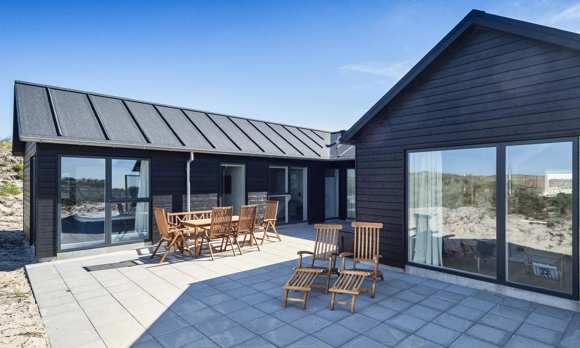 Von der grossen Eingangshalle gelangen Sie nun in den Wohn- und Essbereich, wobei der Küchenbereich zur linken Hand liegt und offen gehalten ist. Dieser ist nur mit einer halbhohen Mauer zum Essbereich abgegrenzt. Der Küchenbereich ist mit schwarzen grifffreien Elementen ausgestattet und verfügt über einen Herd mit Cerankochfeld, einem Backofen in Arbeitshöhe, einer Geschirrspülmaschine und einer Kühl- und Gefrierkombination. An dem grossen Esstisch finden alle Gäste Ihren Platz und haben durch das grosse Fensterelement einen wundervollen Blick auf die Dünenkette. Der lichtdurchflutete Wohnbereich bietet ebenso einen tollen Blick und das grosse gemütliche Sofa lädt zum Verweilen ein. Es befinden sich auch noch einige Retro Rattan-Stühle in der Wohnecke, die sehr gemütlich sind. Auch von hier können Sie Ihren Fernsehabend mit dem aufgestellten Fernsehgerät richtig geniessen. Im Haus befindet sich ein Bio-Kamin. Dieser Bio-Kamin darf nur mit "Bio-Ethanol" befeuert werden. Eine solche Flasche befindet sich im Ferienhaus. Sollte diese leer sein, kann diese bei uns im Büro getauscht werden. In dem zweiten Flügel befindet sich der lange Flurbereich, von dem die Schlafzimmer und die Bäder verteilt sind. Insgesamt stehen Ihnen vier Schlafzimmer zur Verfügung: DB + DB + DB + 2B. Zwei der Schlafzimmer sind mit je einem Doppelbett mit dem Maas von 90 x 200 cm ausgestattet. Ein weiteres Schlafzimmer hat ein Doppelbett mit dem Maass 80 x 200 cm. Das Vierte und letzte Schlafzimmer verfügt über Etagenbetten. Das eine grosse Master-Schlafzimmer ist mit einem Fernsehgerät ausgestattet. Hier können Sie auch deutsche Fernsehprogramme empfangen. Es liegt am Ende des Ganges und ist zur westlichen Seite ausgerichtet (Richtung Meer). Alle Schlafzimmer haben einen Zugang zum Terrassenbereich. Beide Bäder sind gefliesst, hell und freundlich. Das eine Bad verfügt über ein WC, ein Handwaschbecken und eine Dusche. Das grosse Master-Badezimmer verfügt ebenfalls über ein WC, ein Handwaschbecken und eine Dusche. Desweiteren ist hier auch eine Sauna und ein Eck-Whirlpool aufgestellt. Ein Ausgang zu einer Aussendusche befindet sich auch hier im Bad. Am Ferienhaus befindet sich ein ekstra Schuppen. Ein Hauswirtschafts-Technikraum geht von der grossen Eingangshalle ab. Hier befindet sich die Waschmaschine, ein Trockner und ein grosszügiger Garderobenplatz. Das Fernsehprogramm empfangen Sie über Stofa, es können auch einige dänische Kanäle empfangen werden. Das Ferienhaus verfügt über einen Internetanschluss (W-Lan). Deweiteren hat das Ferienhaus einen Anschluss für El-Fahrzeuge. Es ist nur ein Haustier erlaubt, dieser darf nicht auf die Möbel und in die Betten. Katzen sind absolut nicht erlaubt. Das Rauchen ist im Ferienhaus nicht erlaubt. Es stehen Ihnen nach Fertigstellung mehrere grosse gefliesste Terrassenbereiche zur Verfügung. Hier können Sie Ihr Sonnenbad oder zum Beispiel auch den Grillabend richtig geniessen. Das ist Erholung pur. Das Ferienhaus ist ein Neubau, also Baujahr 2018. Es fallen bei diesem Ferienhaus Zusatzkosten für Wasser an. Jugendgruppen sind absolut nicht erlaubt in diesem Ferienhaus. Gratis Eintritt für Oksbøl Badeland, Fitness in Vejers und Blåvand und Golf i Ho 2025.