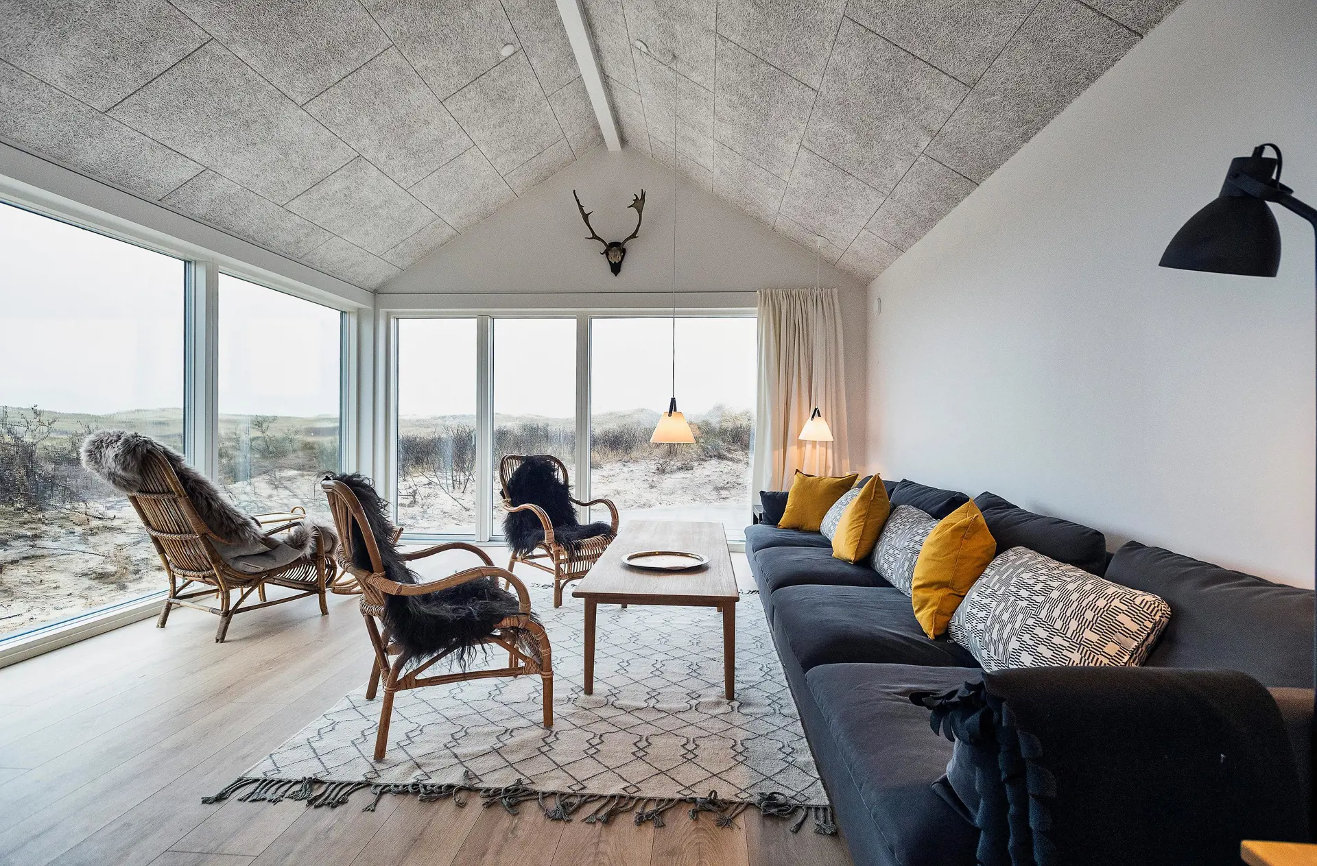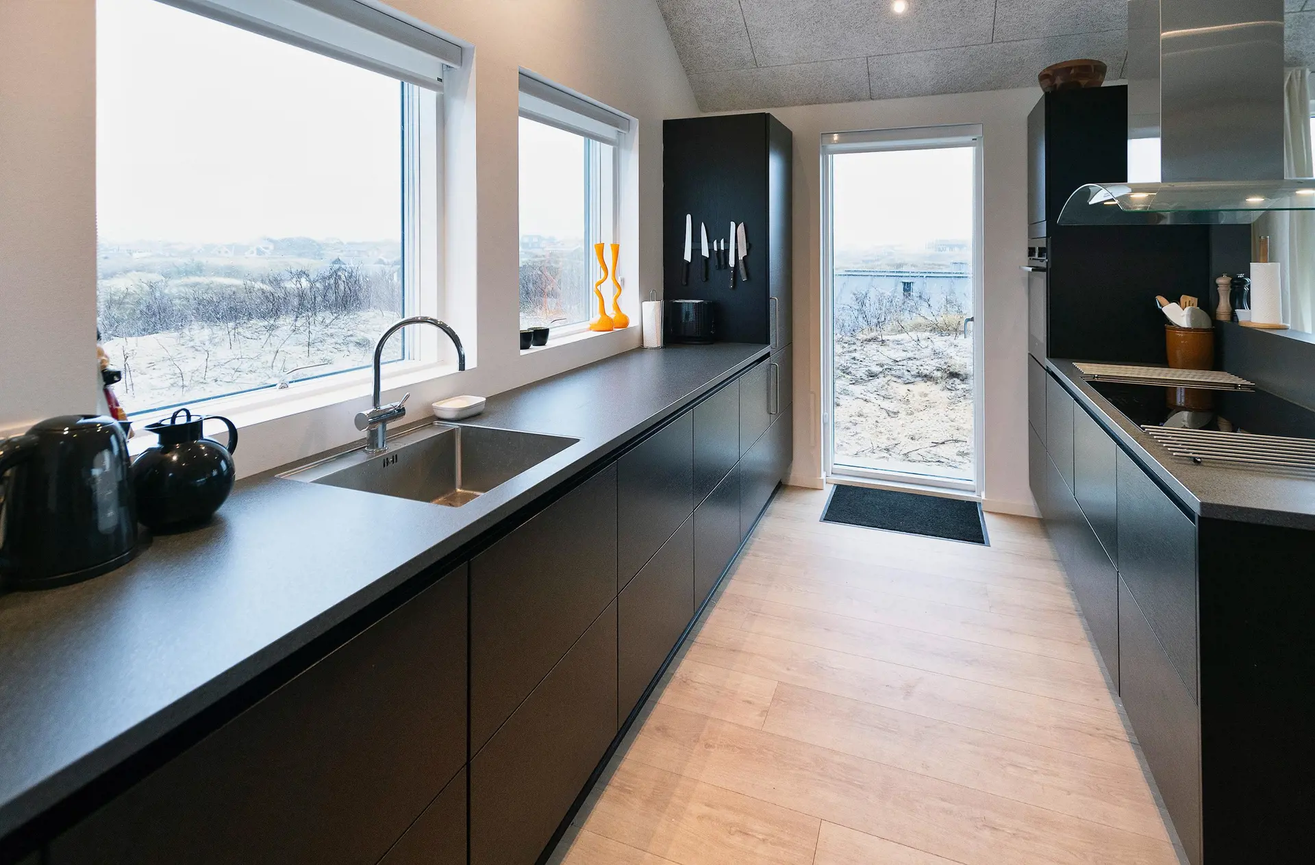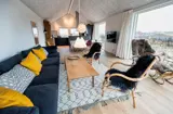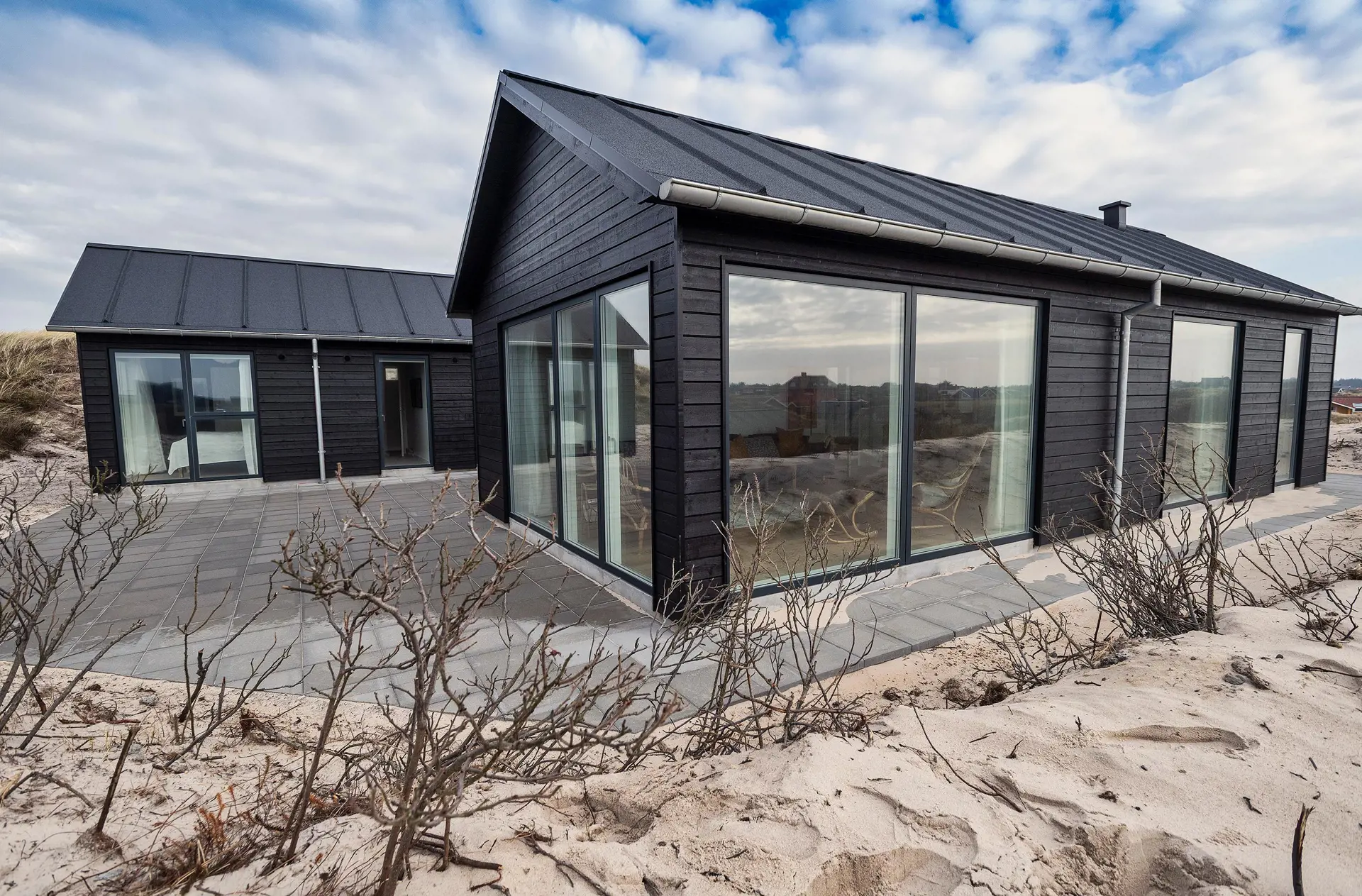Von der grossen Eingangshalle gelangen Sie nun in den Wohn- und Essbereich, wobei der Küchenbereich zur linken Hand liegt und offen gehalten ist. Dieser ist nur mit einer halbhohen Mauer zum Essbereich abgegrenzt. Der Küchenbereich ist mit schwarzen grifffreien Elementen ausgestattet und verfügt über einen Herd mit Cerankochfeld, einem Backofen in Arbeitshöhe, einer Geschirrspülmaschine und einer Kühl- und Gefrierkombination. An dem grossen Esstisch finden alle Gäste Ihren Platz und haben durch das grosse Fensterelement einen wundervollen Blick auf die Dünenkette. Der lichtdurchflutete Wohnbereich bietet ebenso einen tollen Blick und das grosse gemütliche Sofa lädt zum Verweilen ein. Es befinden sich auch noch einige Retro Rattan-Stühle in der Wohnecke, die sehr gemütlich sind. Auch von hier können Sie Ihren Fernsehabend mit dem aufgestellten Fernsehgerät richtig geniessen. Im Haus befindet sich ein Bio-Kamin. Dieser Bio-Kamin darf nur mit "Bio-Ethanol" befeuert werden. Eine solche Flasche befindet sich im Ferienhaus. Sollte diese leer sein, kann diese bei uns im Büro getauscht werden. In dem zweiten Flügel befindet sich der lange Flurbereich, von dem die Schlafzimmer und die Bäder verteilt sind. Insgesamt stehen Ihnen vier Schlafzimmer zur Verfügung: DB + DB + DB + 2B. Zwei der Schlafzimmer sind mit je einem Doppelbett mit dem Maas von 90 x 200 cm ausgestattet. Ein weiteres Schlafzimmer hat ein Doppelbett mit dem Maass 80 x 200 cm. Das Vierte und letzte Schlafzimmer verfügt über Etagenbetten. Das eine grosse Master-Schlafzimmer ist mit einem Fernsehgerät ausgestattet. Hier können Sie auch deutsche Fernsehprogramme empfangen. Es liegt am Ende des Ganges und ist zur westlichen Seite ausgerichtet (Richtung Meer). Alle Schlafzimmer haben einen Zugang zum Terrassenbereich. Beide Bäder sind gefliesst, hell und freundlich. Das eine Bad verfügt über ein WC, ein Handwaschbecken und eine Dusche. Das grosse Master-Badezimmer verfügt ebenfalls über ein WC, ein Handwaschbecken und eine Dusche. Desweiteren ist hier auch eine Sauna und ein Eck-Whirlpool aufgestellt. Ein Ausgang zu einer Aussendusche befindet sich auch hier im Bad. Am Ferienhaus befindet sich ein ekstra Schuppen. Ein Hauswirtschafts-Technikraum geht von der grossen Eingangshalle ab. Hier befindet sich die Waschmaschine, ein Trockner und ein grosszügiger Garderobenplatz. Das Fernsehprogramm empfangen Sie über Stofa, es können auch einige dänische Kanäle empfangen werden. Das Ferienhaus verfügt über einen Internetanschluss (W-Lan). Deweiteren hat das Ferienhaus einen Anschluss für El-Fahrzeuge. Es ist nur ein Haustier erlaubt, dieser darf nicht auf die Möbel und in die Betten. Katzen sind absolut nicht erlaubt. Das Rauchen ist im Ferienhaus nicht erlaubt. Es stehen Ihnen nach Fertigstellung mehrere grosse gefliesste Terrassenbereiche zur Verfügung. Hier können Sie Ihr Sonnenbad oder zum Beispiel auch den Grillabend richtig geniessen. Das ist Erholung pur. Das Ferienhaus ist ein Neubau, also Baujahr 2018. Es fallen bei diesem Ferienhaus Zusatzkosten für Wasser an. Jugendgruppen sind absolut nicht erlaubt in diesem Ferienhaus. Gratis Eintritt für Oksbøl Badeland, Fitness in Vejers und Blåvand und Golf i Ho 2025.