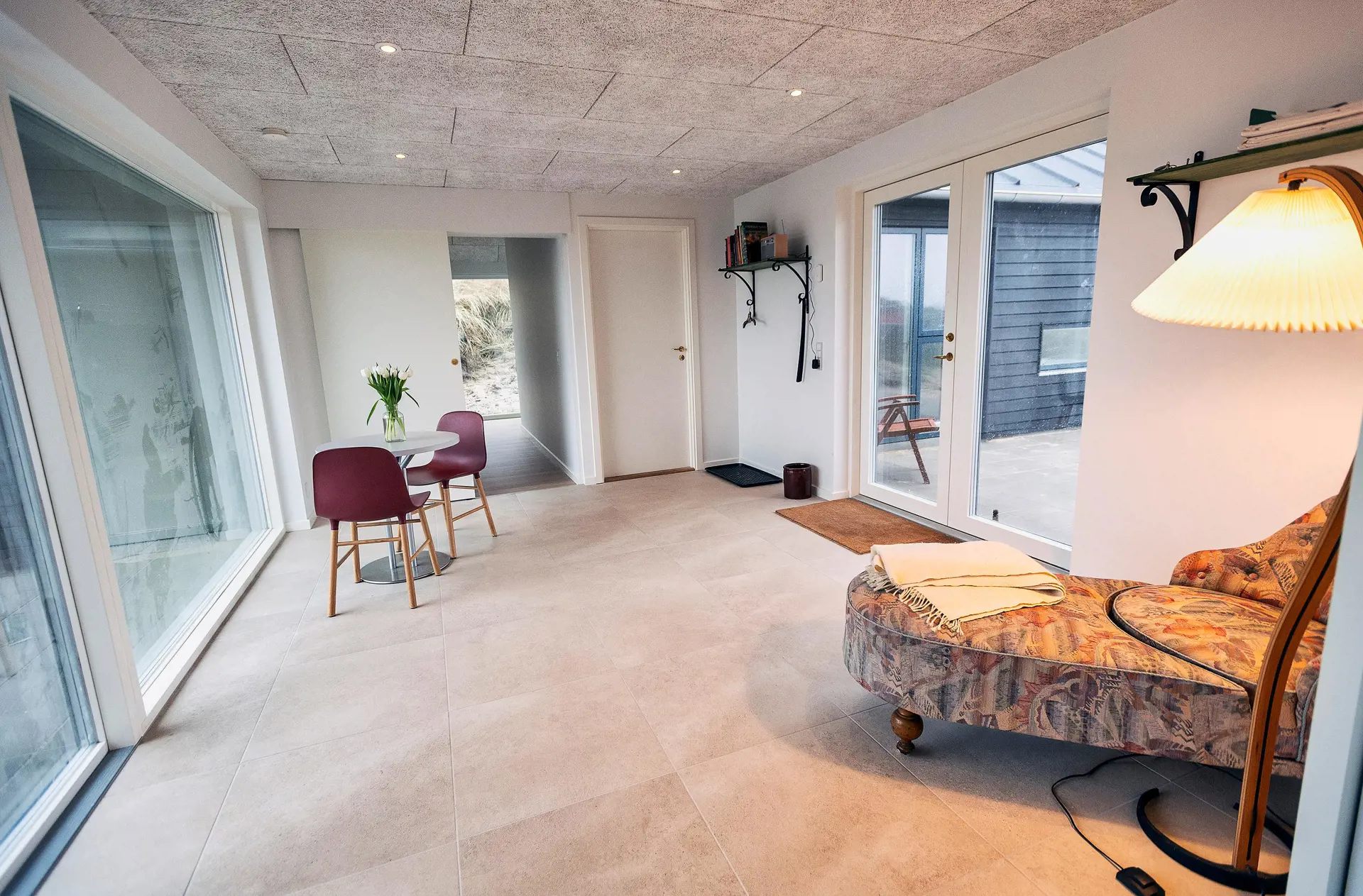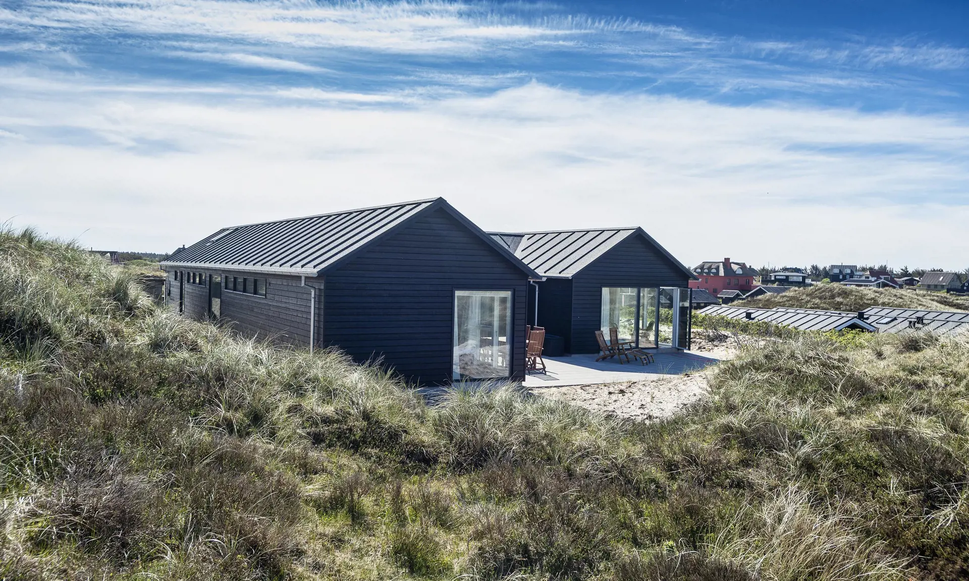 Neugebautes Niedrig-Energiesparhaus in bevorzugter Dünenlandschaft gelegen. Dieses Ferienhaus befindet sich auf der letzten Dünenkette Richtung Strand. Von diesem Ferienhaus haben Sie einen wundervollen Panoramablick über das gesamte Ferienhausgebiet und die Dünenkette. Das Haus bietet Platz für insgesamt 8 Personen. Das Ferienhaus ist um eine grosse Eingangshalle gebaut und die Eingangshalle zeichnet sich als Herzstück des Hauses. Von einem Flügel der Eingangshalle befindet sich der Wohn- und Essbereich, samt Küchenbereich und der andere Flügel ist mit den Schlafbereichen, samt den Bädern ausgestattet. Desweiteren kommen Sie von der Einganghalle auf einen wundervollen Terrassenbereich, der westlich ausgerichtet ist. Dieser Eingangbereich bietet auch die Möglichkeit zum Relaxen. Die Eingangshalle ist ähnlich einem gemütlicher Wintergarten, durch seine grosse Fensterfront, aufgebaut. Das komplette Ferienhaus ist mit einer Fussbodenheizung ausgestattet, dadurch mit einem geringen Energieverbrauch.