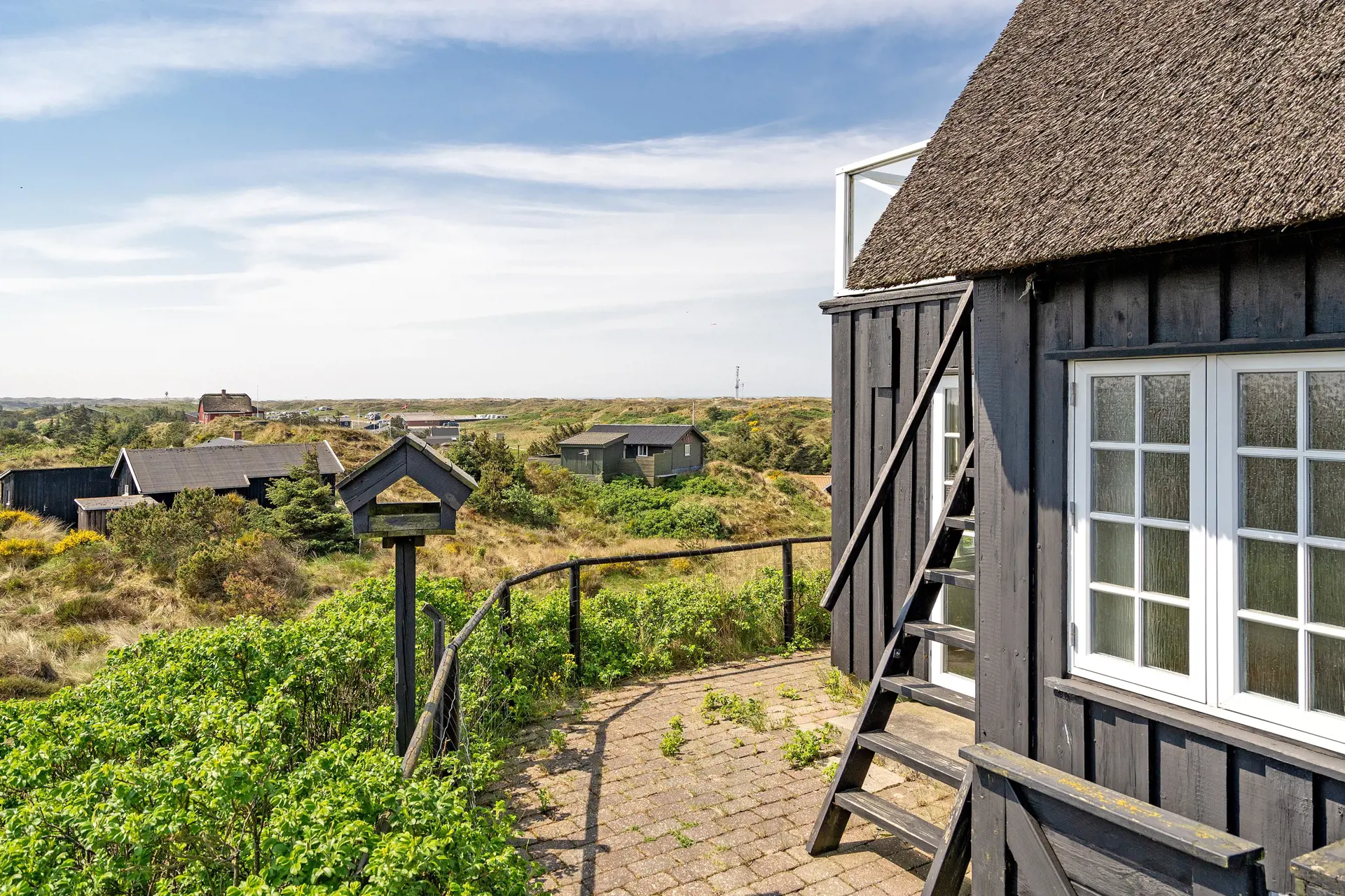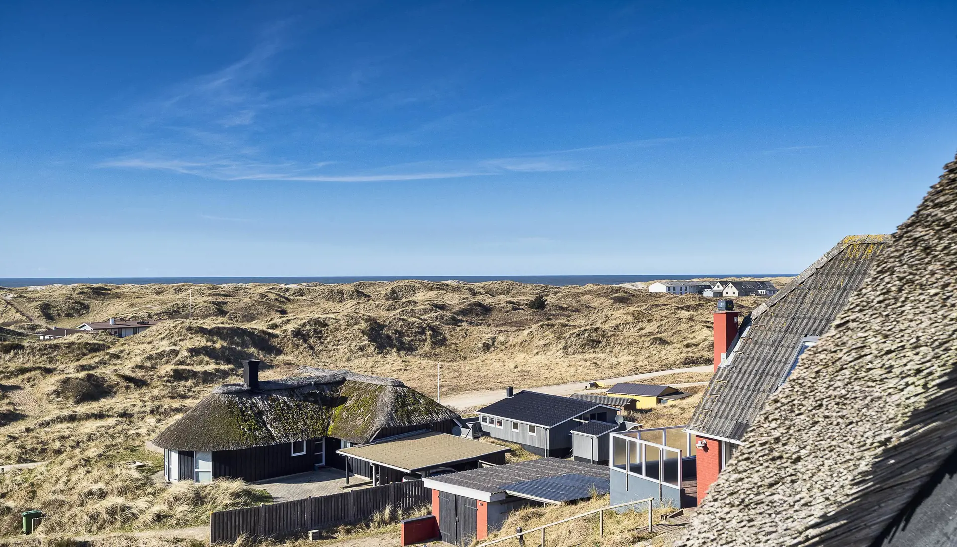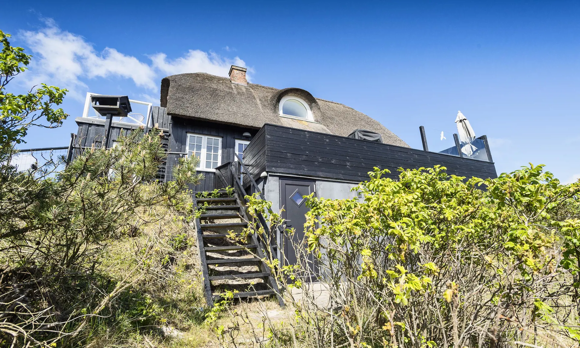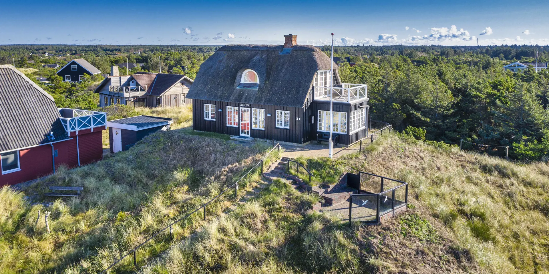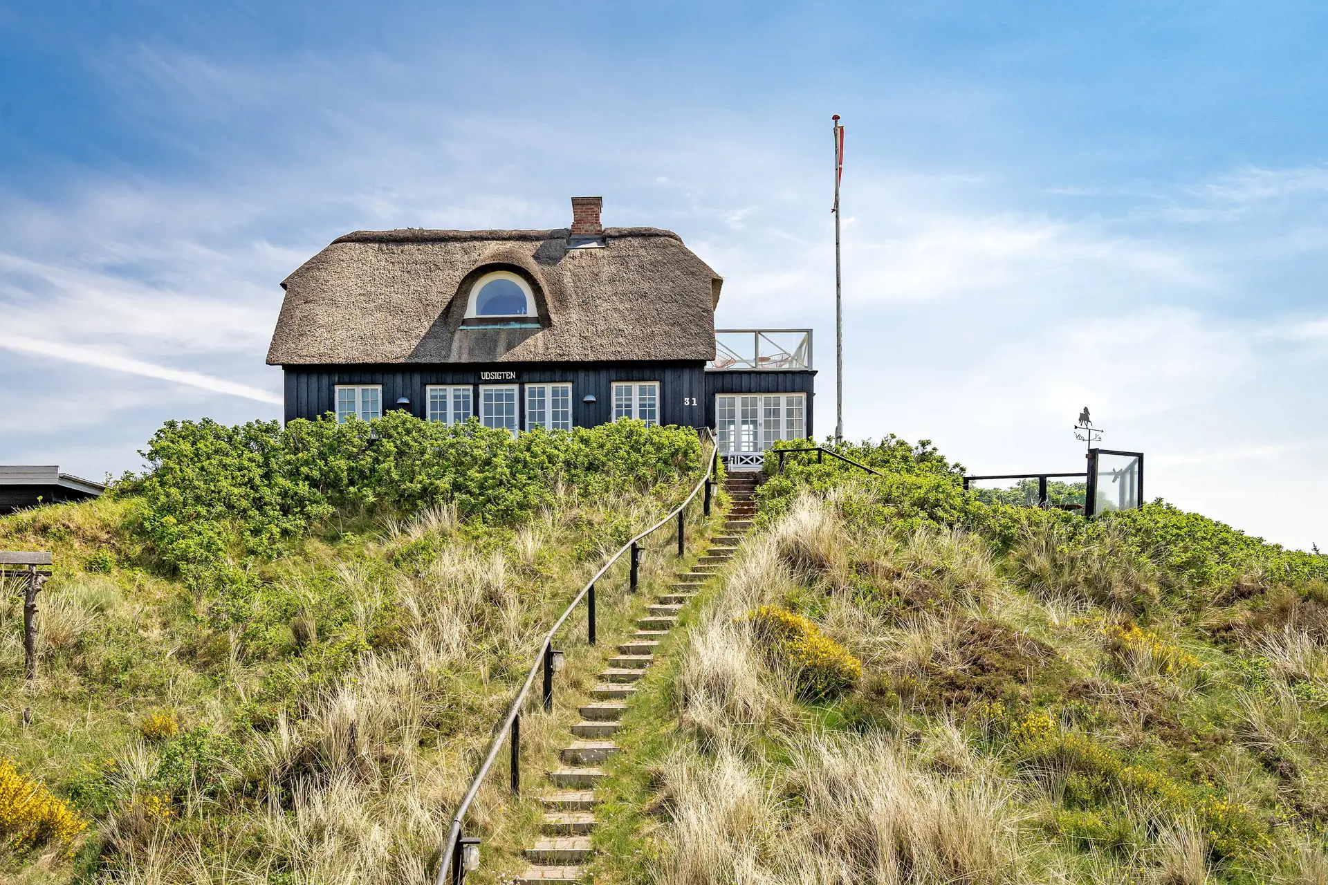 Reetgedecktes Ferienhaus mit Namen ”Udsigten” hoch oben auf einer Düne gelegen mit wundervollem Panoramablick über das Ferienhausgebiet und sogar mit Meerblick vom Obergeschoss. Ein langer steiler Weg mit kleinen Stufen führt hoch zum Ferienhaus. Die Räumlichkeiten verteilen sich über 2 Etagen. Es ist hell und freundlich in der Ausstattung und recht modern eingerichtet. Das Ferienhaus bietet Platz für 6 Personen. Es strahlt einen besondern Chame aus. Der Strand ist nur 100 Meter vom Ferienhaus entfernt. Im Bereich des Erdgeschosses befinden sich der Eingangsbereich, ein Wohnbereich, der Essplatz, die Küche, das Badezimmer und zwei Schlafbereiche. Das Herzstück des Hauses befindet sich in der Mitte und ist der gemütliche Wohnbereich. Hier befindet sich auch der schöne dänische Morsø-Kamin, der Ihnen eine angenehme Wärme bietet und die typische dänische Hygge vermittelt. Das deutsche Fernsehprogramm empfangen Sie über Stofa, daher sind nur 5-8 deutsche Kanäle zu empfangen. Vom Wohnbereich gelangen Sie dann in die offen gehaltene Küche. Diese verfügt über einen Herd mit Cerankochfeld, einem Backofen, einer Geschirrspülmaschine und einer Kühl- und Gefrierkombination. Gehen Sie dann weiter gelangen Sie in den lichtdurchfluteten Essbereich. Durch seine schönen Panoramafenster haben Sie einen tollen Ausblick über das gesamte Ferienhausgebiet. Der gesamte Bodenbereich im Haus ist mit einem hellen Laminat verlegt worden. Alles passt farblich sehr gut zusammen und ist aufeinander abgestimmt. Das Badezimmer ist mit einem Handwaschbecken, einem WC und einer Dusche ausgestattet. Desweiteren befindet sich hier eine Waschmaschine. Insgesamt befinden sich drei Schlafzimmer im Hause: DB + DB + 2B. Über die offene Holztreppe im Wohnbereich gelangen sie dann in das Obergeschoss. Der zweite Wohnbereich im Obergeschoss bietet gemütliche Sitzmöglichkeiten. Von diesem Wohnbereich gelangen Sie auf den schönen Balkon, wo Sie den Meerblick und den Sonnenuntergang in vollen Zügen geniessen können. Die Fenster in diesem Wohnbereich sind halb rund und man hat das Gefühl wie in einer Puppenstube zu wohnen. Der Balkon ist ebenfalls vom Erdgeschoss von aussen zu erreichen. Ein weiteres Schlafzimmer mit einem Doppelbett steht den Gästen hier im Obergeschoss bereit. In diesen Ferienhaus können Sie sich einfach entspannen und Ihren Urlaub voll geniessen. Hinter dem Ferienhaus befindet sich der kleine Eingangsbereich und eine grössere geschlossene Terrasse, die auch durch verschiedene Sichtschutz-Elemente geschützt ist. Ein klein wenig der Düne nach unten gehend, haben sie dann einen weiteren geschützten Terrassenbereich. In einem separaten Kellerbereich befindet sich ein weiteres Badezimmer, ausgestattet mit WC, Handwaschbecken und Dusche, und eine Sauna. Es gibt keinen direkten Zugang vom Haus zum Kellerbereich, wo sich das Badezimmer befindet. Das Ferienhaus verfügt über einen Internetanschluss (W-Lan - 100/100). Es ist max. ein Haustier erlaubt, allerdings sind keine Katzen erlaubt. Das Rauchen im Ferienhaus ist nicht erlaubt. Es fallen bei diesem Ferienhaus Zusatzkosten für Wasser an. Es ist im Jahre 1936 erbaut worden und in 2019 neurenoviert. Das Grundstück beträgt insgesamt 1765 qm.