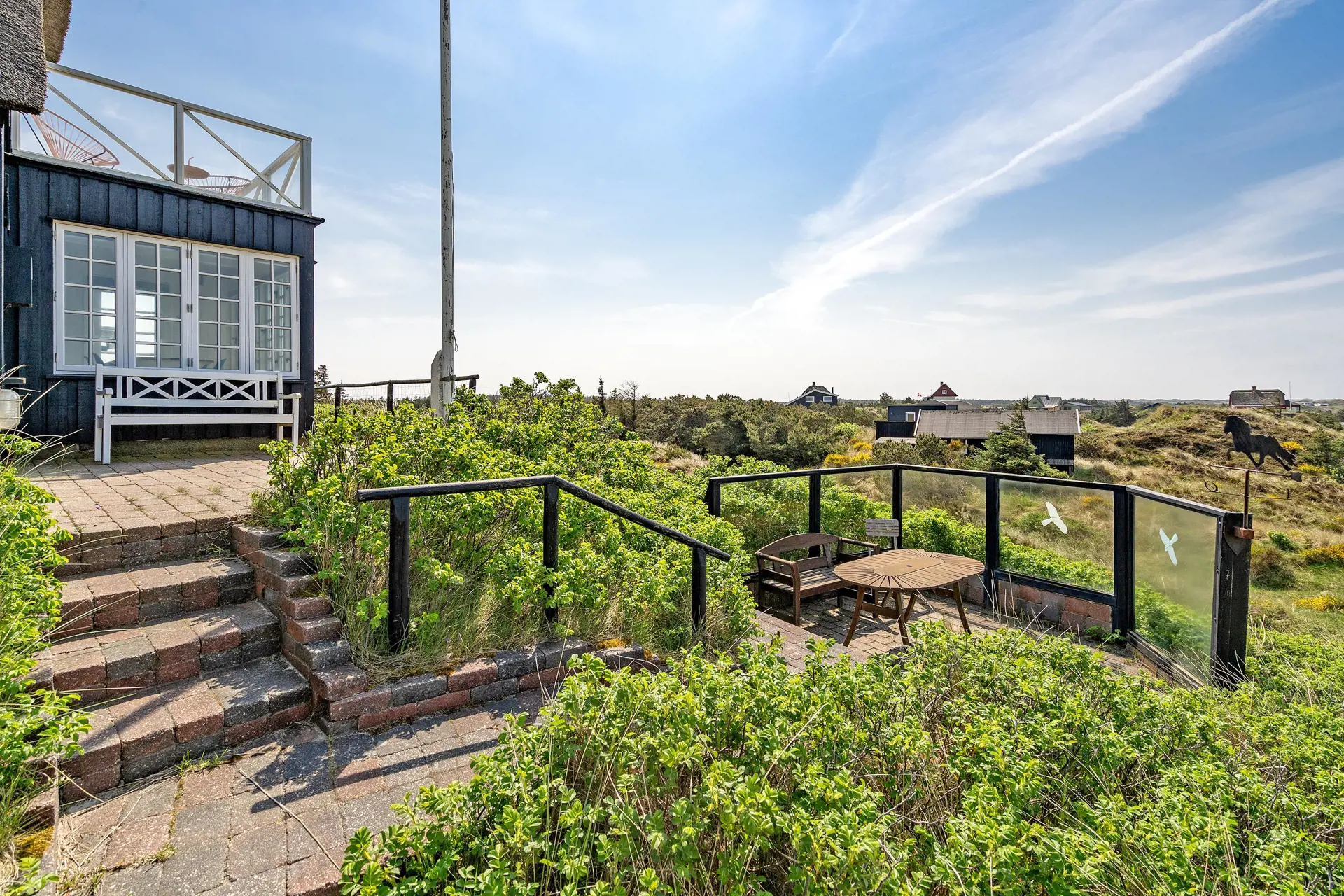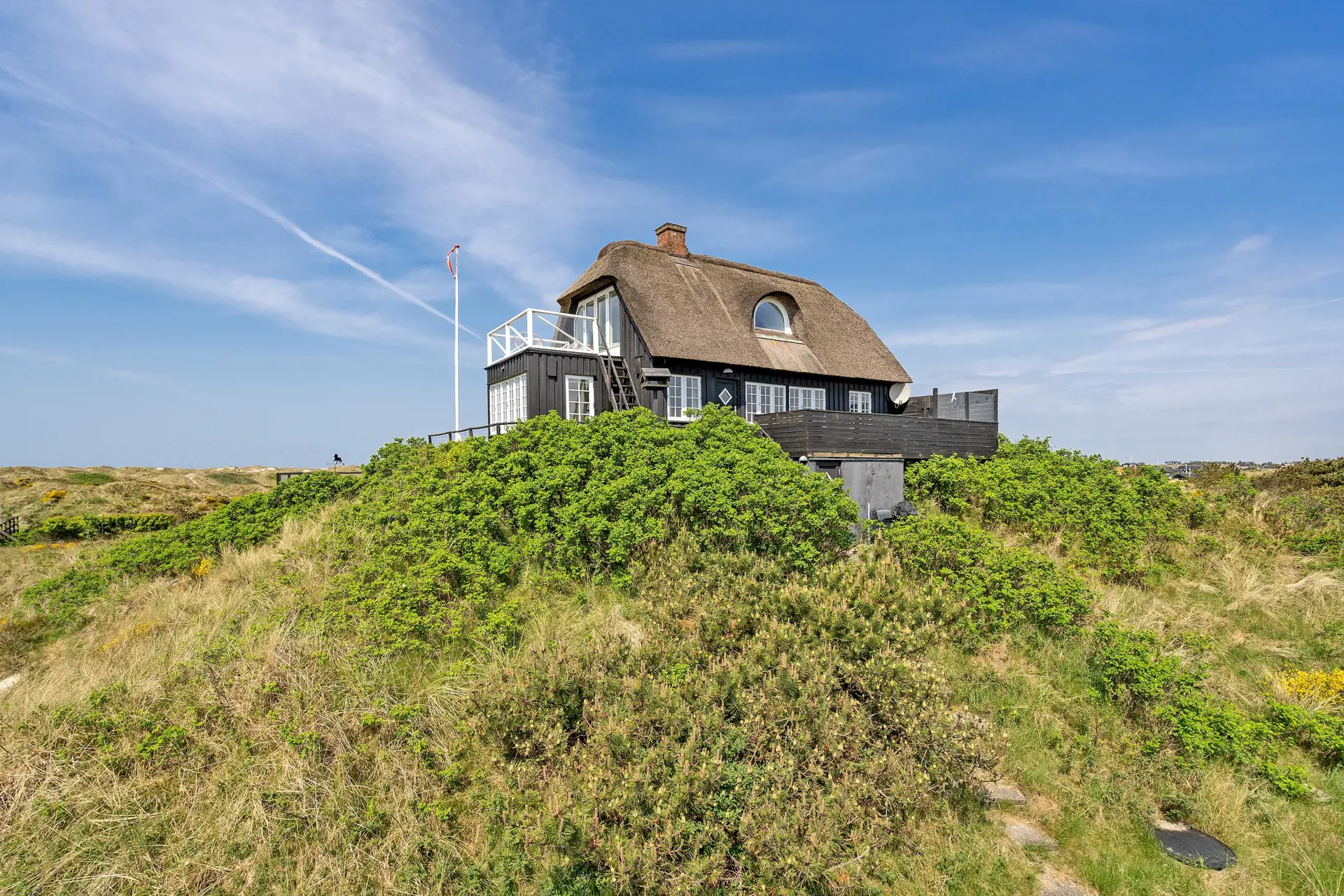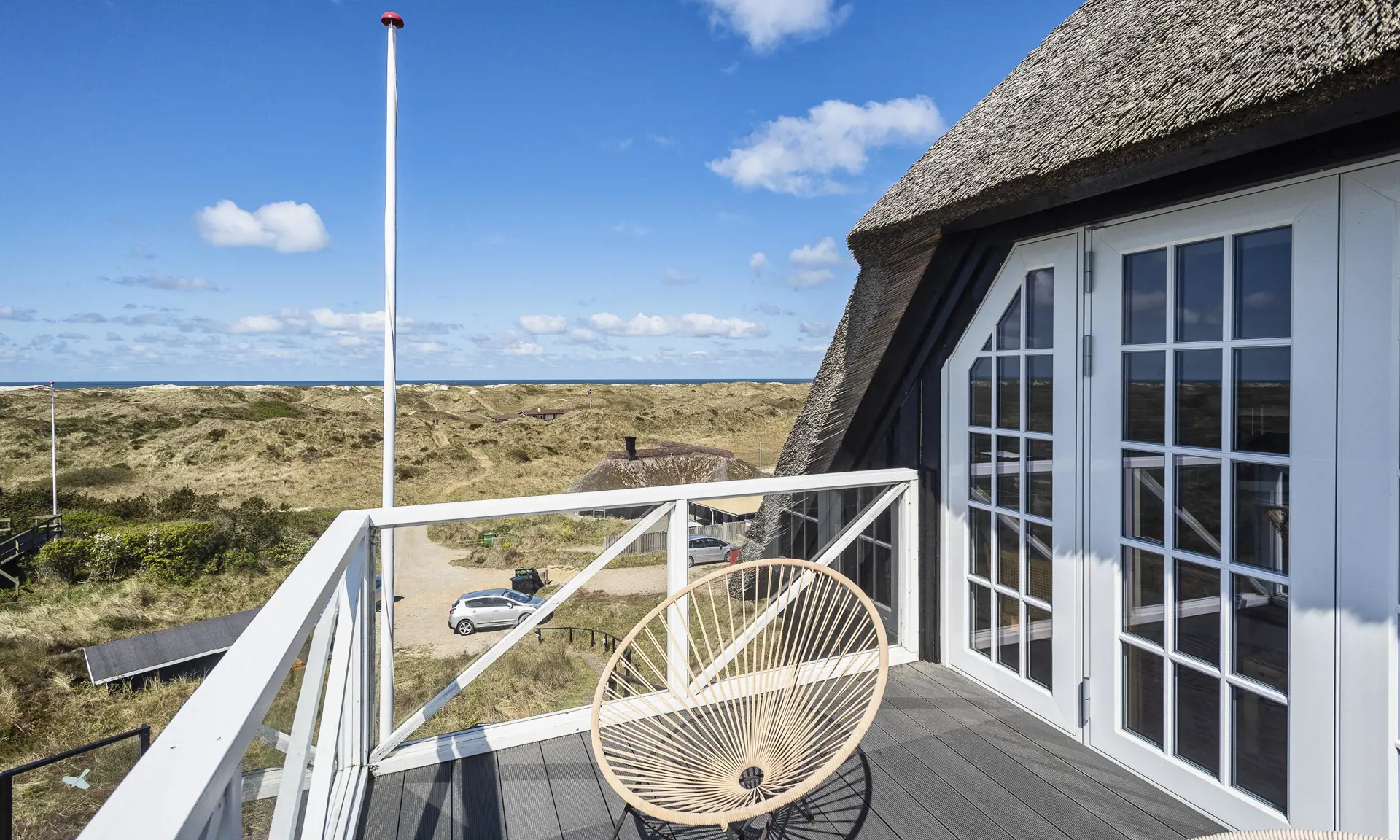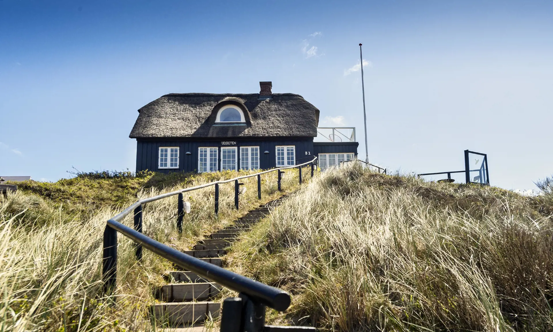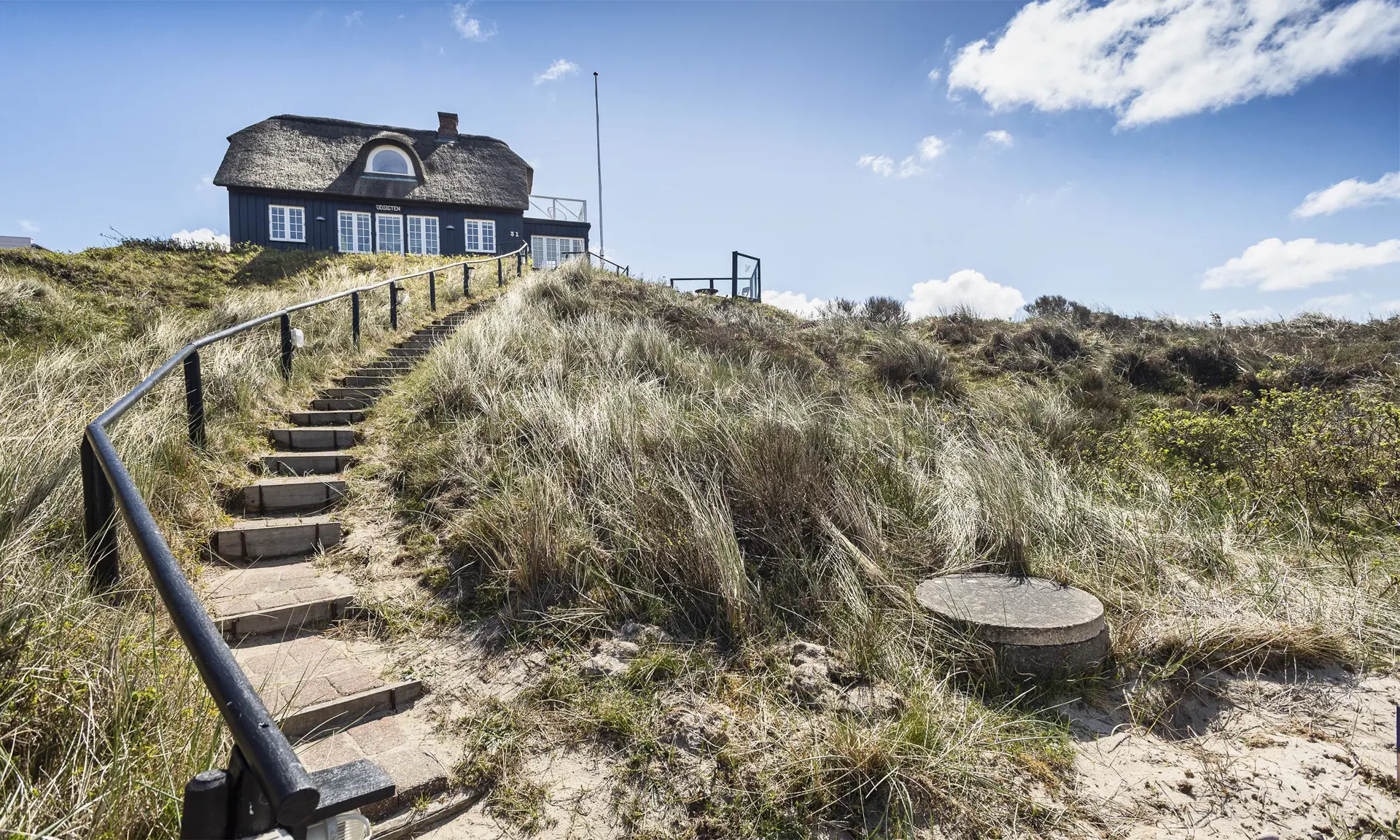 Reetgedecktes Ferienhaus mit Namen ”Udsigten” hoch oben auf einer Düne gelegen mit wundervollem Panoramablick über das Ferienhausgebiet und sogar mit Meerblick vom Obergeschoss. Ein langer steiler Weg mit kleinen Stufen führt hoch zum Ferienhaus. Die Räumlichkeiten verteilen sich über 2 Etagen. Es ist hell und freundlich in der Ausstattung und recht modern eingerichtet. Das Ferienhaus bietet Platz für 6 Personen. Es strahlt einen besondern Chame aus. Der Strand ist nur 100 Meter vom Ferienhaus entfernt. Im Bereich des Erdgeschosses befinden sich der Eingangsbereich, ein Wohnbereich, der Essplatz, die Küche, das Badezimmer und zwei Schlafbereiche. Das Herzstück des Hauses befindet sich in der Mitte und ist der gemütliche Wohnbereich. Hier befindet sich auch der schöne dänische Morsø-Kamin, der Ihnen eine angenehme Wärme bietet und die typische dänische Hygge vermittelt. Das deutsche Fernsehprogramm empfangen Sie über Stofa, daher sind nur 5-8 deutsche Kanäle zu empfangen. Vom Wohnbereich gelangen Sie dann in die offen gehaltene Küche. Diese verfügt über einen Herd mit Cerankochfeld, einem Backofen, einer Geschirrspülmaschine und einer Kühl- und Gefrierkombination. Gehen Sie dann weiter gelangen Sie in den lichtdurchfluteten Essbereich. Durch seine schönen Panoramafenster haben Sie einen tollen Ausblick über das gesamte Ferienhausgebiet. Der gesamte Bodenbereich im Haus ist mit einem hellen Laminat verlegt worden. Alles passt farblich sehr gut zusammen und ist aufeinander abgestimmt. Das Badezimmer ist mit einem Handwaschbecken, einem WC und einer Dusche ausgestattet. Desweiteren befindet sich hier eine Waschmaschine. Insgesamt befinden sich drei Schlafzimmer im Hause: DB + DB + 2B. Über die offene Holztreppe im Wohnbereich gelangen sie dann in das Obergeschoss. Der zweite Wohnbereich im Obergeschoss bietet gemütliche Sitzmöglichkeiten. Von diesem Wohnbereich gelangen Sie auf den schönen Balkon, wo Sie den Meerblick und den Sonnenuntergang in vollen Zügen geniessen können. Die Fenster in diesem Wohnbereich sind halb rund und man hat das Gefühl wie in einer Puppenstube zu wohnen. Der Balkon ist ebenfalls vom Erdgeschoss von aussen zu erreichen. Ein weiteres Schlafzimmer mit einem Doppelbett steht den Gästen hier im Obergeschoss bereit. In diesen Ferienhaus können Sie sich einfach entspannen und Ihren Urlaub voll geniessen. Hinter dem Ferienhaus befindet sich der kleine Eingangsbereich und eine grössere geschlossene Terrasse, die auch durch verschiedene Sichtschutz-Elemente geschützt ist. Ein klein wenig der Düne nach unten gehend, haben sie dann einen weiteren geschützten Terrassenbereich. In einem separaten Kellerbereich befindet sich ein weiteres Badezimmer, ausgestattet mit WC, Handwaschbecken und Dusche, und eine Sauna. Es gibt keinen direkten Zugang vom Haus zum Kellerbereich, wo sich das Badezimmer befindet. Das Ferienhaus verfügt über einen Internetanschluss (W-Lan - 100/100). Es ist max. ein Haustier erlaubt, allerdings sind keine Katzen erlaubt. Das Rauchen im Ferienhaus ist nicht erlaubt. Es fallen bei diesem Ferienhaus Zusatzkosten für Wasser an. Es ist im Jahre 1936 erbaut worden und in 2019 neurenoviert. Das Grundstück beträgt insgesamt 1765 qm.