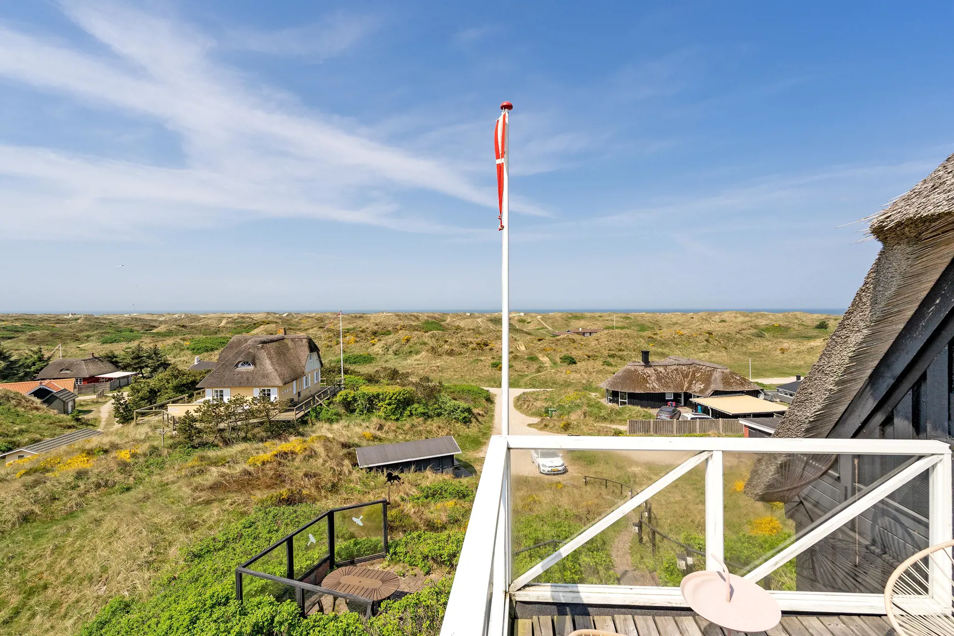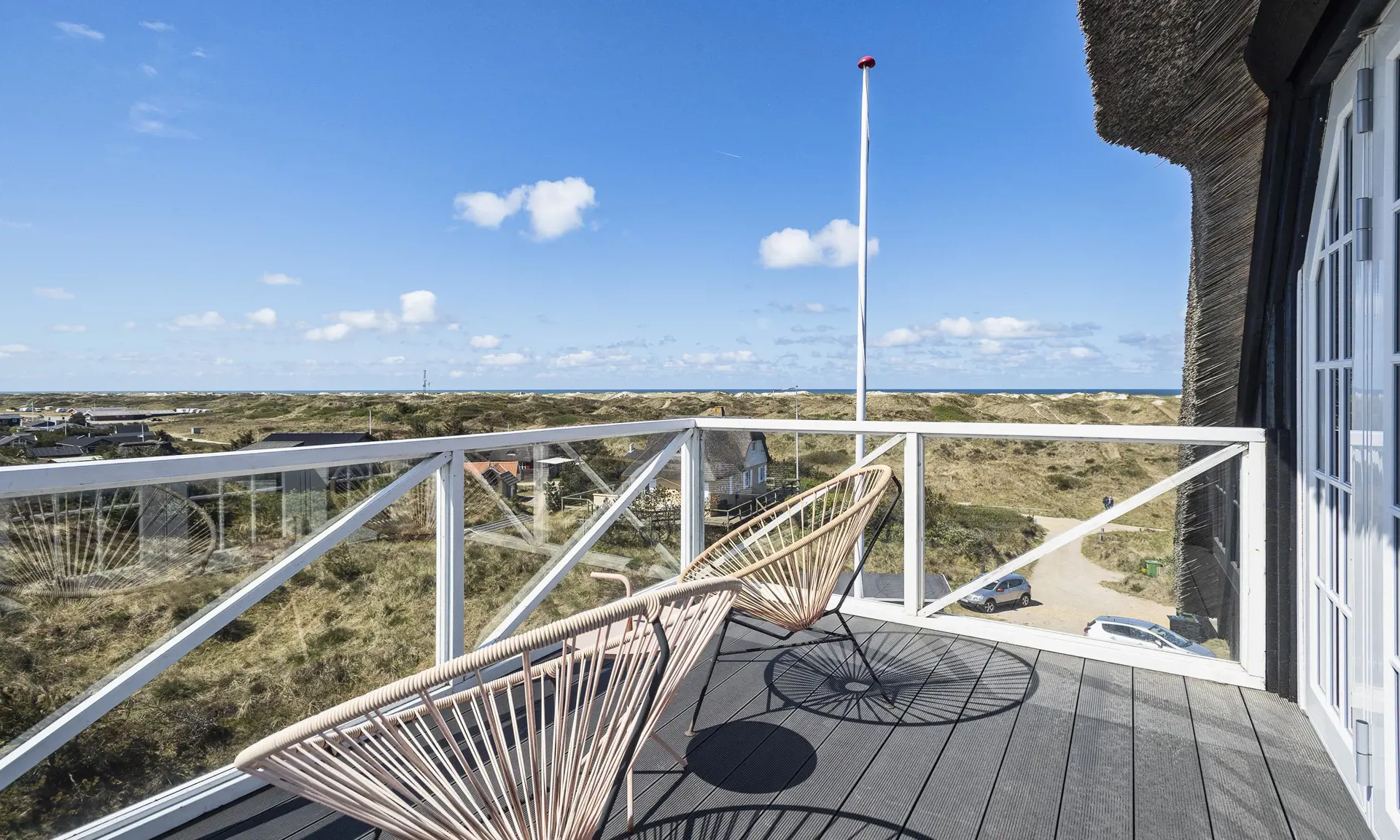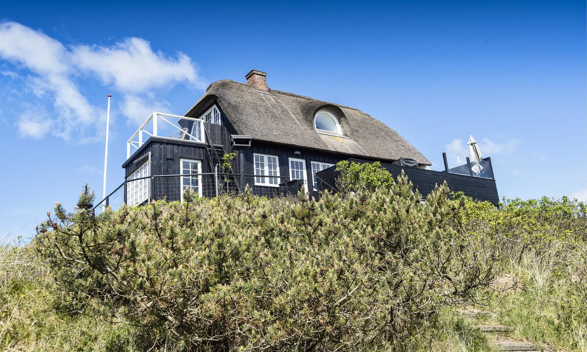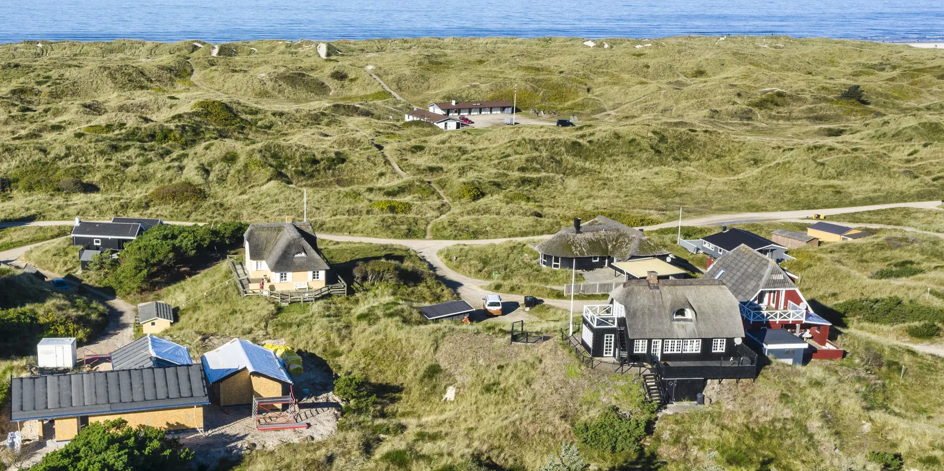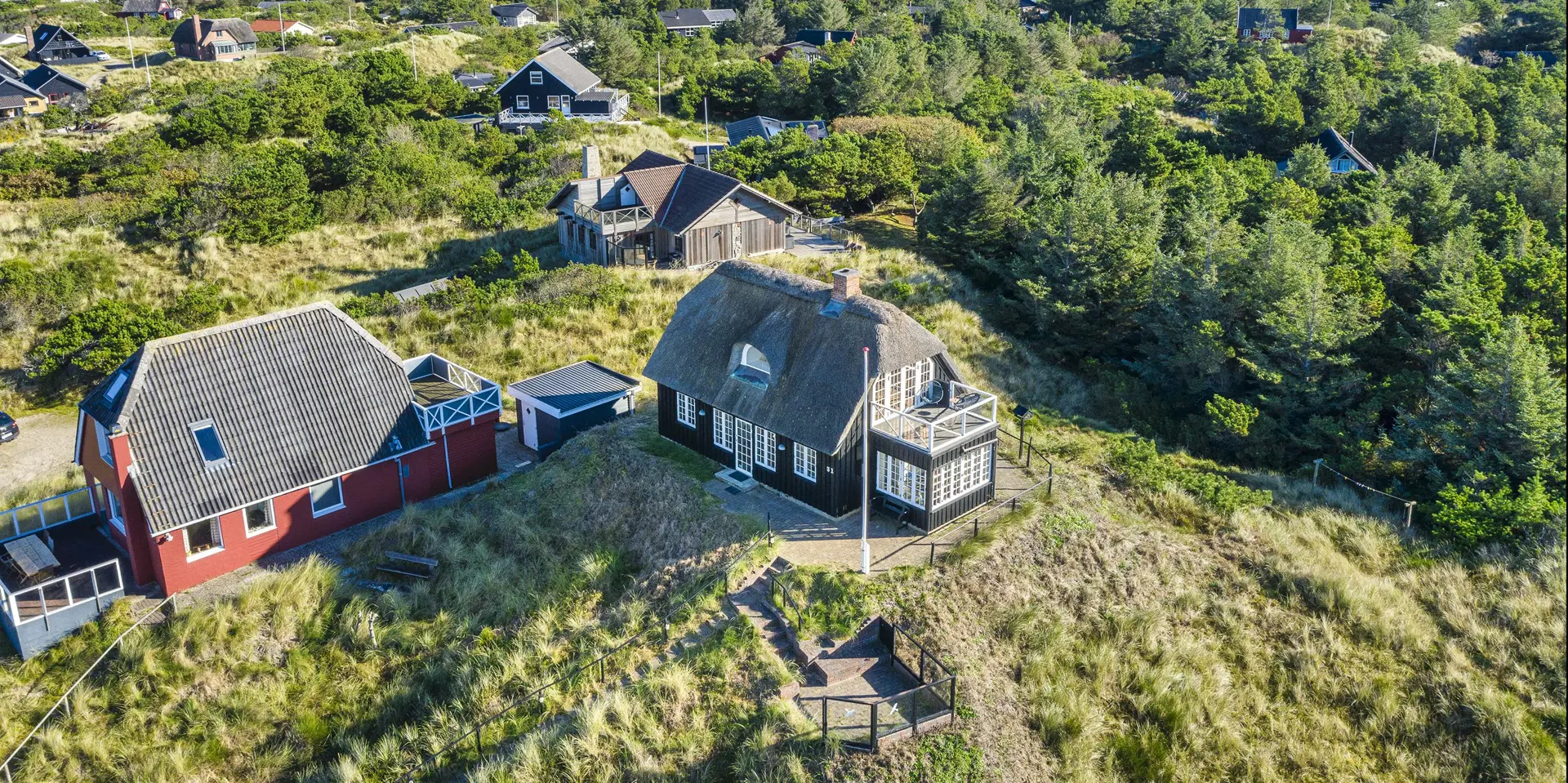 Reetgedecktes Ferienhaus mit Namen ”Udsigten” hoch oben auf einer Düne gelegen mit wundervollem Panoramablick über das Ferienhausgebiet und sogar mit Meerblick vom Obergeschoss. Ein langer steiler Weg mit kleinen Stufen führt hoch zum Ferienhaus. Die Räumlichkeiten verteilen sich über 2 Etagen. Es ist hell und freundlich in der Ausstattung und recht modern eingerichtet. Das Ferienhaus bietet Platz für 6 Personen. Es strahlt einen besondern Chame aus. Der Strand ist nur 100 Meter vom Ferienhaus entfernt. Im Bereich des Erdgeschosses befinden sich der Eingangsbereich, ein Wohnbereich, der Essplatz, die Küche, das Badezimmer und zwei Schlafbereiche. Das Herzstück des Hauses befindet sich in der Mitte und ist der gemütliche Wohnbereich. Hier befindet sich auch der schöne dänische Morsø-Kamin, der Ihnen eine angenehme Wärme bietet und die typische dänische Hygge vermittelt. Das deutsche Fernsehprogramm empfangen Sie über Stofa, daher sind nur 5-8 deutsche Kanäle zu empfangen. Vom Wohnbereich gelangen Sie dann in die offen gehaltene Küche. Diese verfügt über einen Herd mit Cerankochfeld, einem Backofen, einer Geschirrspülmaschine und einer Kühl- und Gefrierkombination. Gehen Sie dann weiter gelangen Sie in den lichtdurchfluteten Essbereich. Durch seine schönen Panoramafenster haben Sie einen tollen Ausblick über das gesamte Ferienhausgebiet. Der gesamte Bodenbereich im Haus ist mit einem hellen Laminat verlegt worden. Alles passt farblich sehr gut zusammen und ist aufeinander abgestimmt. Das Badezimmer ist mit einem Handwaschbecken, einem WC und einer Dusche ausgestattet. Desweiteren befindet sich hier eine Waschmaschine. Insgesamt befinden sich drei Schlafzimmer im Hause: DB + DB + 2B. Über die offene Holztreppe im Wohnbereich gelangen sie dann in das Obergeschoss. Der zweite Wohnbereich im Obergeschoss bietet gemütliche Sitzmöglichkeiten. Von diesem Wohnbereich gelangen Sie auf den schönen Balkon, wo Sie den Meerblick und den Sonnenuntergang in vollen Zügen geniessen können. Die Fenster in diesem Wohnbereich sind halb rund und man hat das Gefühl wie in einer Puppenstube zu wohnen. Der Balkon ist ebenfalls vom Erdgeschoss von aussen zu erreichen. Ein weiteres Schlafzimmer mit einem Doppelbett steht den Gästen hier im Obergeschoss bereit. In diesen Ferienhaus können Sie sich einfach entspannen und Ihren Urlaub voll geniessen. Hinter dem Ferienhaus befindet sich der kleine Eingangsbereich und eine grössere geschlossene Terrasse, die auch durch verschiedene Sichtschutz-Elemente geschützt ist. Ein klein wenig der Düne nach unten gehend, haben sie dann einen weiteren geschützten Terrassenbereich. In einem separaten Kellerbereich befindet sich ein weiteres Badezimmer, ausgestattet mit WC, Handwaschbecken und Dusche, und eine Sauna. Es gibt keinen direkten Zugang vom Haus zum Kellerbereich, wo sich das Badezimmer befindet. Das Ferienhaus verfügt über einen Internetanschluss (W-Lan - 100/100). Es ist max. ein Haustier erlaubt, allerdings sind keine Katzen erlaubt. Das Rauchen im Ferienhaus ist nicht erlaubt. Es fallen bei diesem Ferienhaus Zusatzkosten für Wasser an. Es ist im Jahre 1936 erbaut worden und in 2019 neurenoviert. Das Grundstück beträgt insgesamt 1765 qm.