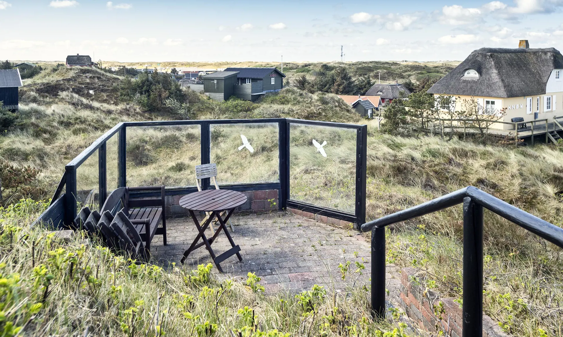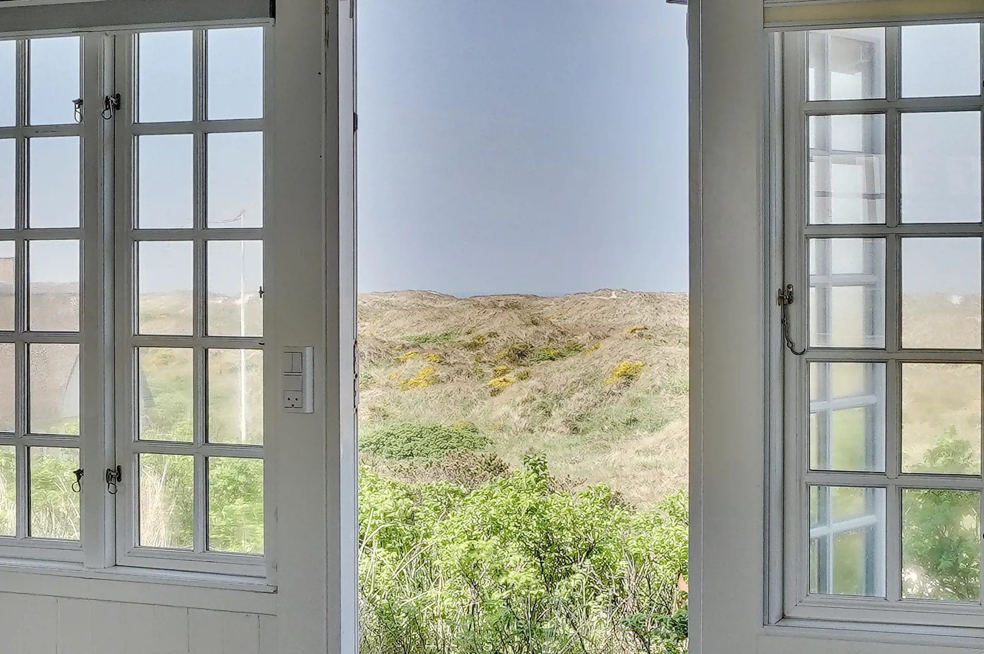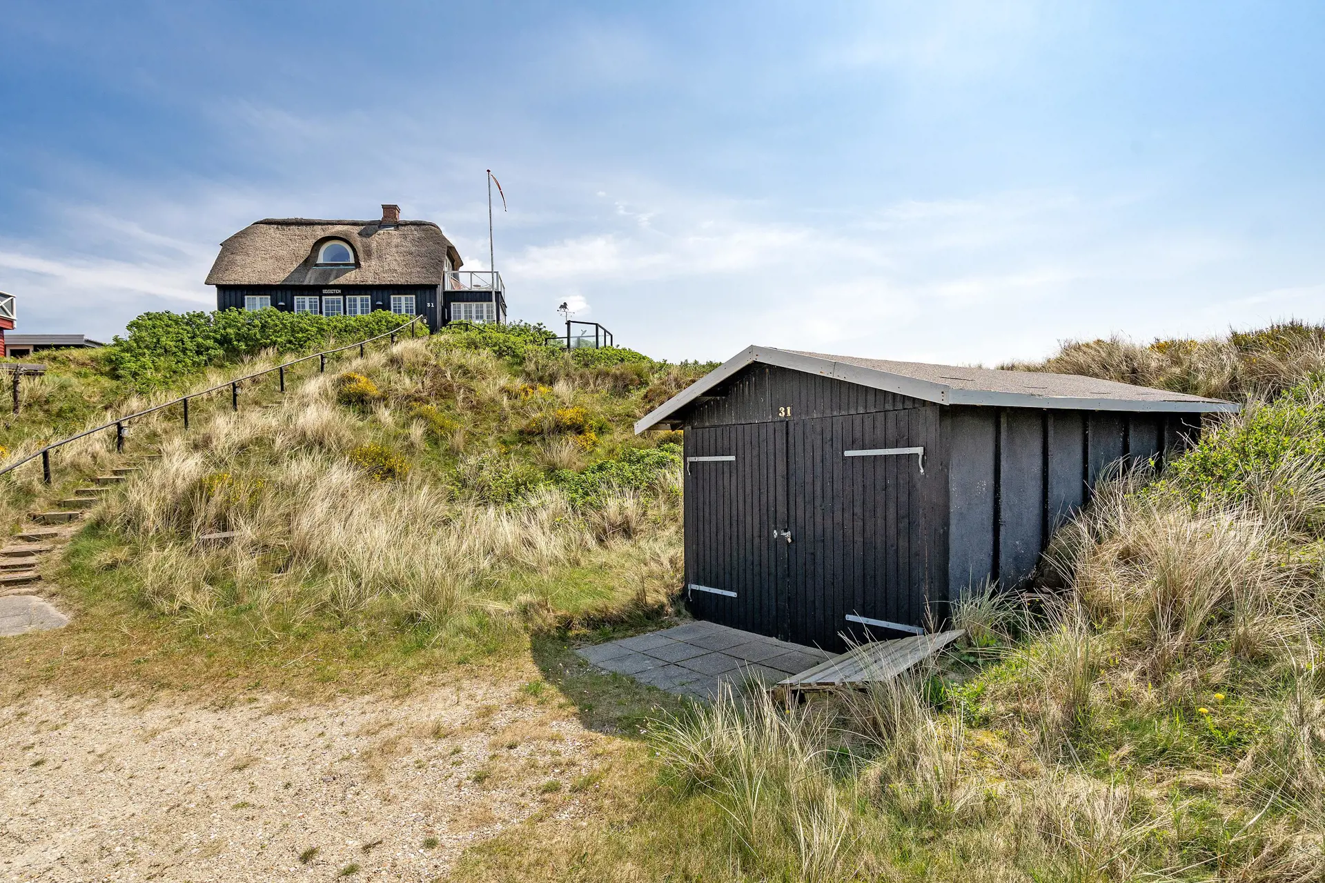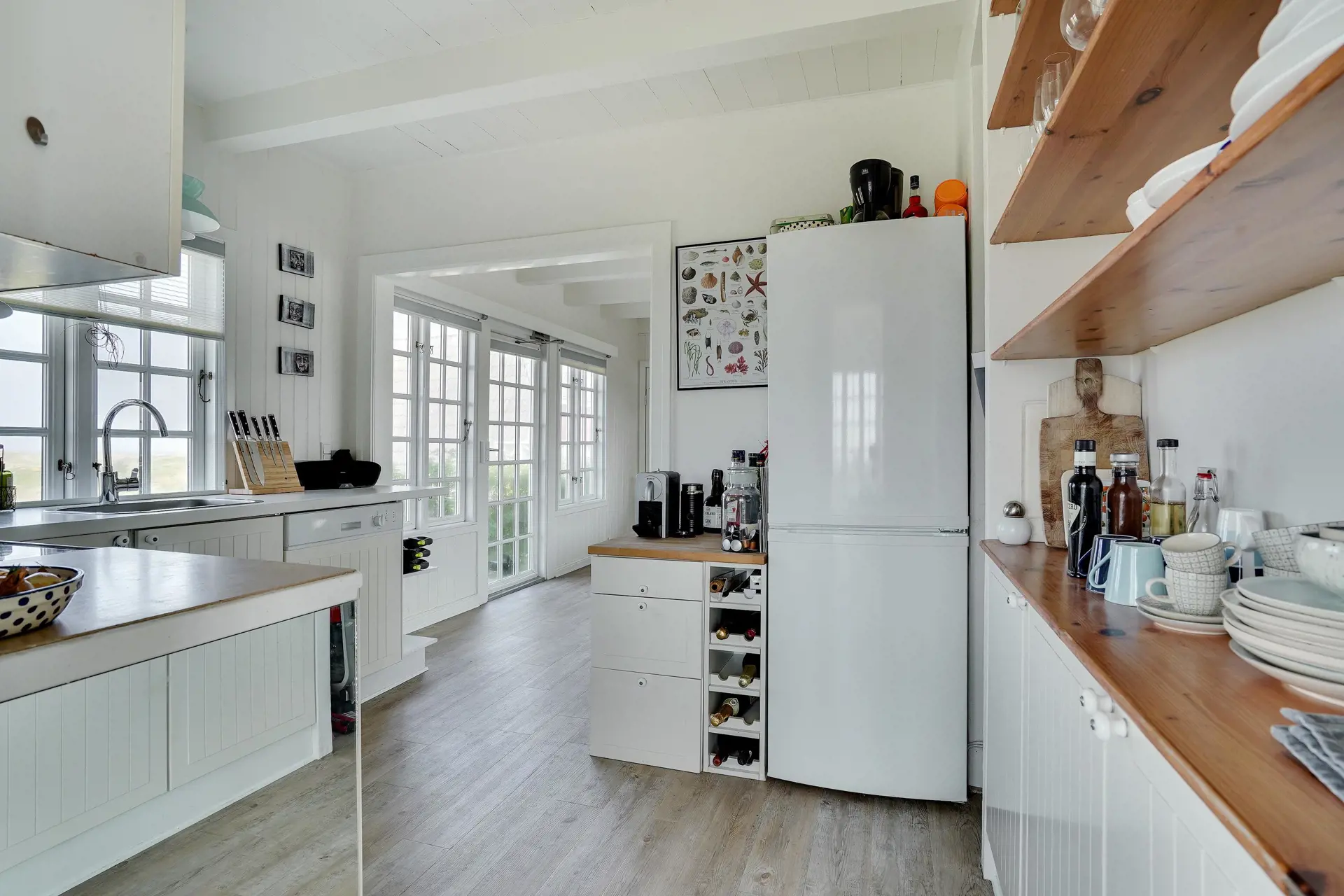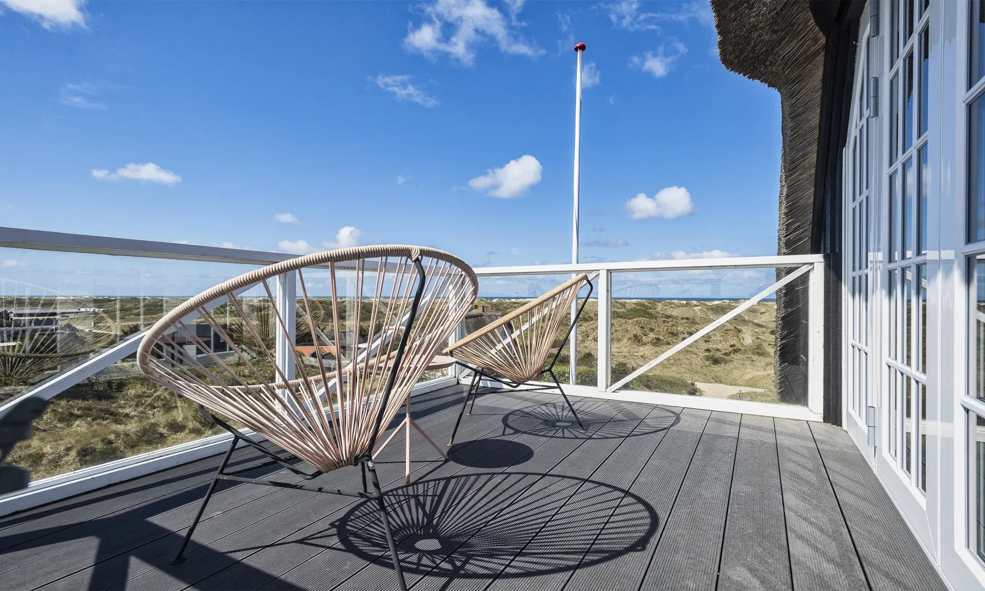 Reetgedecktes Ferienhaus mit Namen ”Udsigten” hoch oben auf einer Düne gelegen mit wundervollem Panoramablick über das Ferienhausgebiet und sogar mit Meerblick vom Obergeschoss. Ein langer steiler Weg mit kleinen Stufen führt hoch zum Ferienhaus. Die Räumlichkeiten verteilen sich über 2 Etagen. Es ist hell und freundlich in der Ausstattung und recht modern eingerichtet. Das Ferienhaus bietet Platz für 6 Personen. Es strahlt einen besondern Chame aus. Der Strand ist nur 100 Meter vom Ferienhaus entfernt. Im Bereich des Erdgeschosses befinden sich der Eingangsbereich, ein Wohnbereich, der Essplatz, die Küche, das Badezimmer und zwei Schlafbereiche. Das Herzstück des Hauses befindet sich in der Mitte und ist der gemütliche Wohnbereich. Hier befindet sich auch der schöne dänische Morsø-Kamin, der Ihnen eine angenehme Wärme bietet und die typische dänische Hygge vermittelt. Das deutsche Fernsehprogramm empfangen Sie über Stofa, daher sind nur 5-8 deutsche Kanäle zu empfangen. Vom Wohnbereich gelangen Sie dann in die offen gehaltene Küche. Diese verfügt über einen Herd mit Cerankochfeld, einem Backofen, einer Geschirrspülmaschine und einer Kühl- und Gefrierkombination. Gehen Sie dann weiter gelangen Sie in den lichtdurchfluteten Essbereich. Durch seine schönen Panoramafenster haben Sie einen tollen Ausblick über das gesamte Ferienhausgebiet. Der gesamte Bodenbereich im Haus ist mit einem hellen Laminat verlegt worden. Alles passt farblich sehr gut zusammen und ist aufeinander abgestimmt. Das Badezimmer ist mit einem Handwaschbecken, einem WC und einer Dusche ausgestattet. Desweiteren befindet sich hier eine Waschmaschine. Insgesamt befinden sich drei Schlafzimmer im Hause: DB + DB + 2B. Über die offene Holztreppe im Wohnbereich gelangen sie dann in das Obergeschoss. Der zweite Wohnbereich im Obergeschoss bietet gemütliche Sitzmöglichkeiten. Von diesem Wohnbereich gelangen Sie auf den schönen Balkon, wo Sie den Meerblick und den Sonnenuntergang in vollen Zügen geniessen können. Die Fenster in diesem Wohnbereich sind halb rund und man hat das Gefühl wie in einer Puppenstube zu wohnen. Der Balkon ist ebenfalls vom Erdgeschoss von aussen zu erreichen. Ein weiteres Schlafzimmer mit einem Doppelbett steht den Gästen hier im Obergeschoss bereit. In diesen Ferienhaus können Sie sich einfach entspannen und Ihren Urlaub voll geniessen. Hinter dem Ferienhaus befindet sich der kleine Eingangsbereich und eine grössere geschlossene Terrasse, die auch durch verschiedene Sichtschutz-Elemente geschützt ist. Ein klein wenig der Düne nach unten gehend, haben sie dann einen weiteren geschützten Terrassenbereich. In einem separaten Kellerbereich befindet sich ein weiteres Badezimmer, ausgestattet mit WC, Handwaschbecken und Dusche, und eine Sauna. Es gibt keinen direkten Zugang vom Haus zum Kellerbereich, wo sich das Badezimmer befindet. Das Ferienhaus verfügt über einen Internetanschluss (W-Lan - 100/100). Es ist max. ein Haustier erlaubt, allerdings sind keine Katzen erlaubt. Das Rauchen im Ferienhaus ist nicht erlaubt. Es fallen bei diesem Ferienhaus Zusatzkosten für Wasser an. Es ist im Jahre 1936 erbaut worden und in 2019 neurenoviert. Das Grundstück beträgt insgesamt 1765 qm.