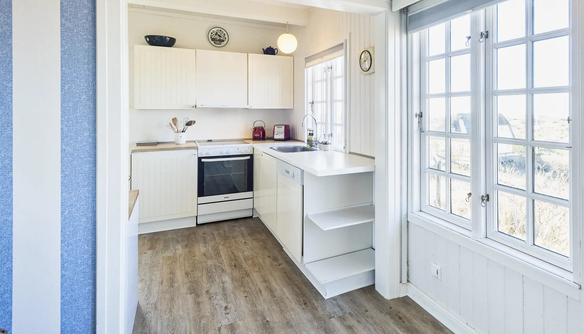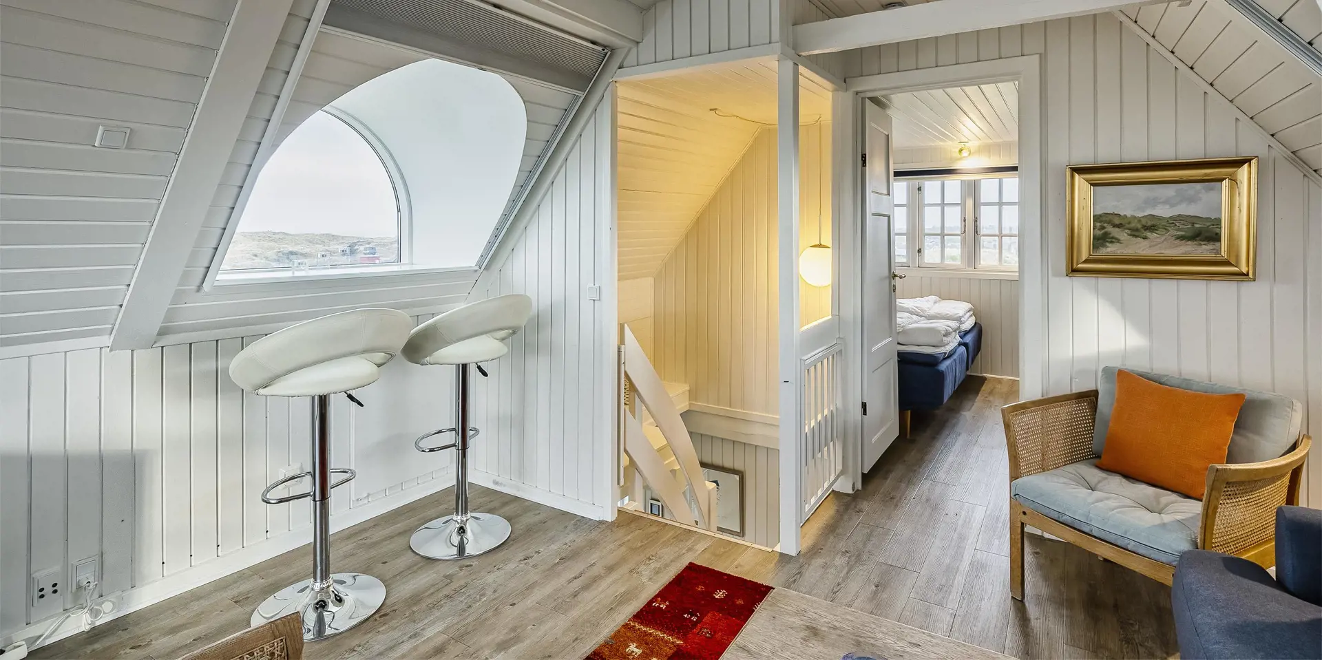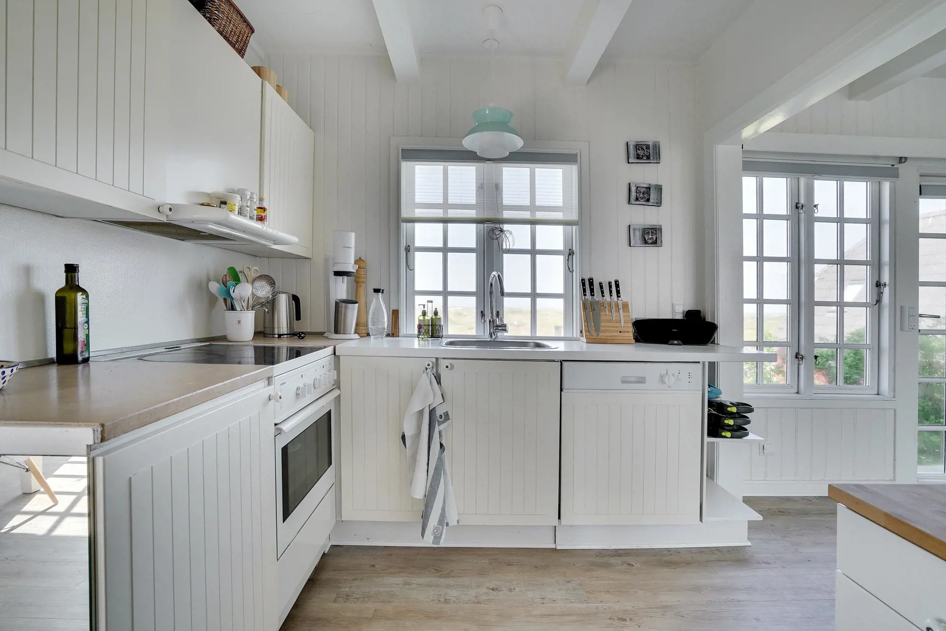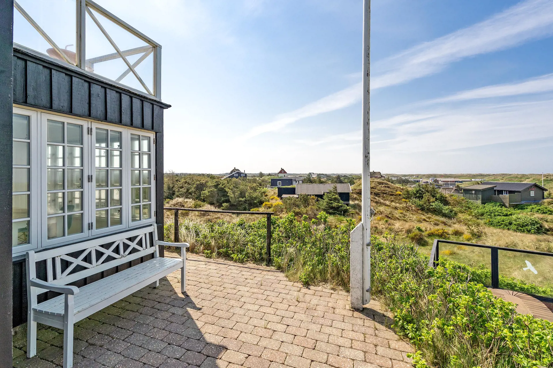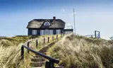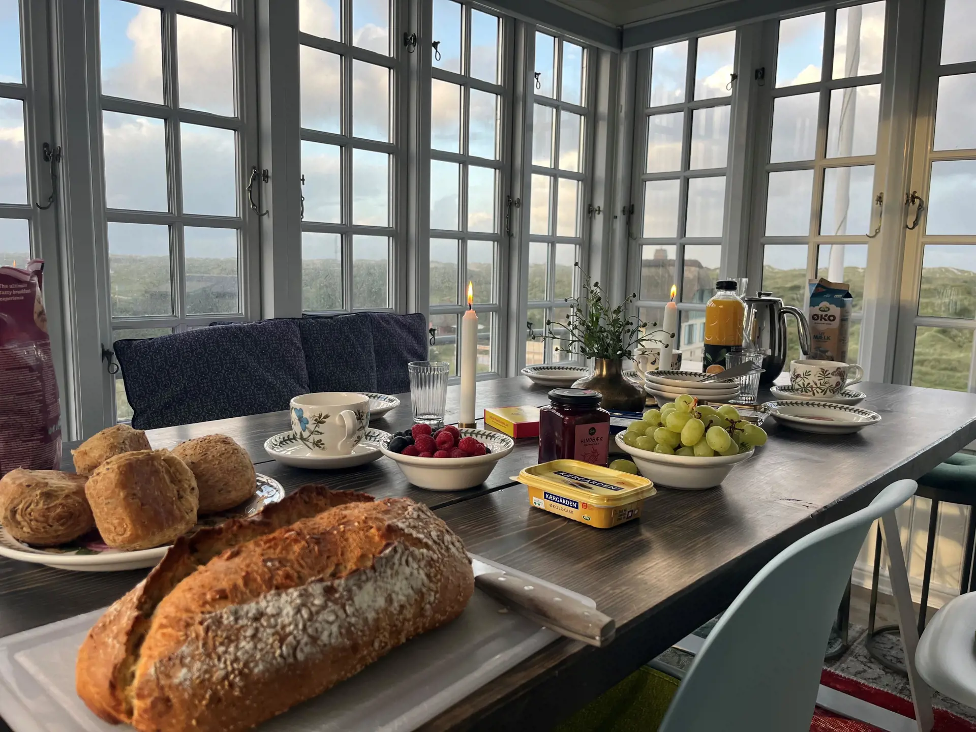 Reetgedecktes Ferienhaus mit Namen ”Udsigten” hoch oben auf einer Düne gelegen mit wundervollem Panoramablick über das Ferienhausgebiet und sogar mit Meerblick vom Obergeschoss. Ein langer steiler Weg mit kleinen Stufen führt hoch zum Ferienhaus. Die Räumlichkeiten verteilen sich über 2 Etagen. Es ist hell und freundlich in der Ausstattung und recht modern eingerichtet. Das Ferienhaus bietet Platz für 6 Personen. Es strahlt einen besondern Chame aus. Der Strand ist nur 100 Meter vom Ferienhaus entfernt. Im Bereich des Erdgeschosses befinden sich der Eingangsbereich, ein Wohnbereich, der Essplatz, die Küche, das Badezimmer und zwei Schlafbereiche. Das Herzstück des Hauses befindet sich in der Mitte und ist der gemütliche Wohnbereich. Hier befindet sich auch der schöne dänische Morsø-Kamin, der Ihnen eine angenehme Wärme bietet und die typische dänische Hygge vermittelt. Das deutsche Fernsehprogramm empfangen Sie über Stofa, daher sind nur 5-8 deutsche Kanäle zu empfangen. Vom Wohnbereich gelangen Sie dann in die offen gehaltene Küche. Diese verfügt über einen Herd mit Cerankochfeld, einem Backofen, einer Geschirrspülmaschine und einer Kühl- und Gefrierkombination. Gehen Sie dann weiter gelangen Sie in den lichtdurchfluteten Essbereich. Durch seine schönen Panoramafenster haben Sie einen tollen Ausblick über das gesamte Ferienhausgebiet. Der gesamte Bodenbereich im Haus ist mit einem hellen Laminat verlegt worden. Alles passt farblich sehr gut zusammen und ist aufeinander abgestimmt. Das Badezimmer ist mit einem Handwaschbecken, einem WC und einer Dusche ausgestattet. Desweiteren befindet sich hier eine Waschmaschine. Insgesamt befinden sich drei Schlafzimmer im Hause: DB + DB + 2B. Über die offene Holztreppe im Wohnbereich gelangen sie dann in das Obergeschoss. Der zweite Wohnbereich im Obergeschoss bietet gemütliche Sitzmöglichkeiten. Von diesem Wohnbereich gelangen Sie auf den schönen Balkon, wo Sie den Meerblick und den Sonnenuntergang in vollen Zügen geniessen können. Die Fenster in diesem Wohnbereich sind halb rund und man hat das Gefühl wie in einer Puppenstube zu wohnen. Der Balkon ist ebenfalls vom Erdgeschoss von aussen zu erreichen. Ein weiteres Schlafzimmer mit einem Doppelbett steht den Gästen hier im Obergeschoss bereit. In diesen Ferienhaus können Sie sich einfach entspannen und Ihren Urlaub voll geniessen. Hinter dem Ferienhaus befindet sich der kleine Eingangsbereich und eine grössere geschlossene Terrasse, die auch durch verschiedene Sichtschutz-Elemente geschützt ist. Ein klein wenig der Düne nach unten gehend, haben sie dann einen weiteren geschützten Terrassenbereich. In einem separaten Kellerbereich befindet sich ein weiteres Badezimmer, ausgestattet mit WC, Handwaschbecken und Dusche, und eine Sauna. Es gibt keinen direkten Zugang vom Haus zum Kellerbereich, wo sich das Badezimmer befindet. Das Ferienhaus verfügt über einen Internetanschluss (W-Lan - 100/100). Es ist max. ein Haustier erlaubt, allerdings sind keine Katzen erlaubt. Das Rauchen im Ferienhaus ist nicht erlaubt. Es fallen bei diesem Ferienhaus Zusatzkosten für Wasser an. Es ist im Jahre 1936 erbaut worden und in 2019 neurenoviert. Das Grundstück beträgt insgesamt 1765 qm.