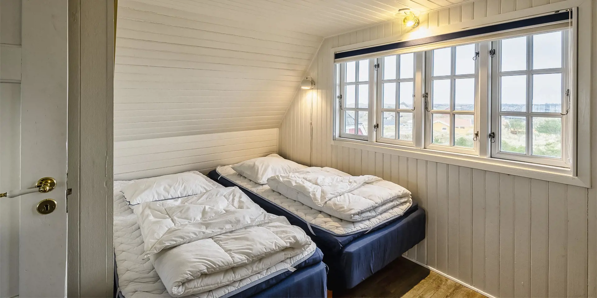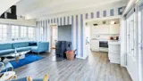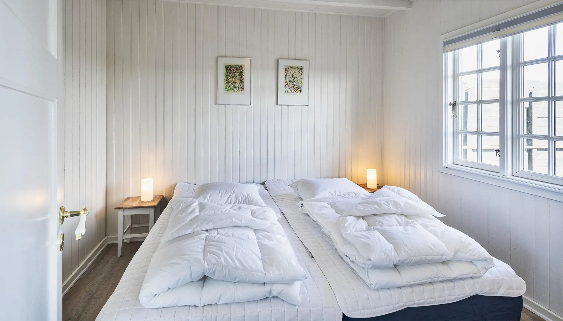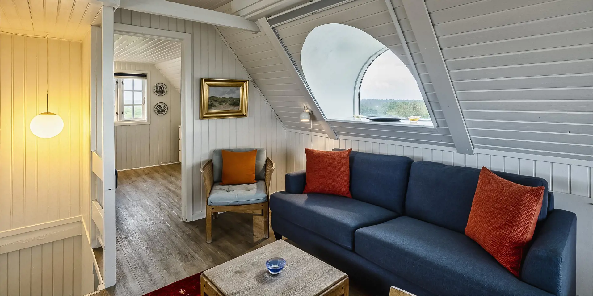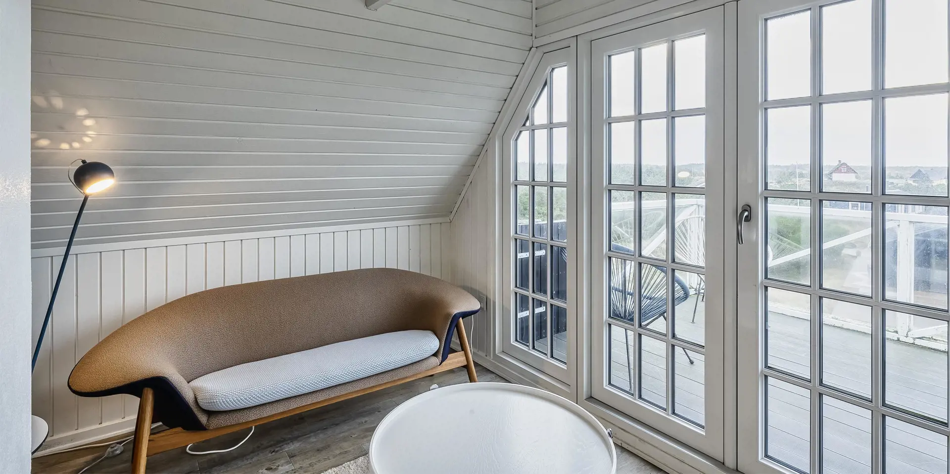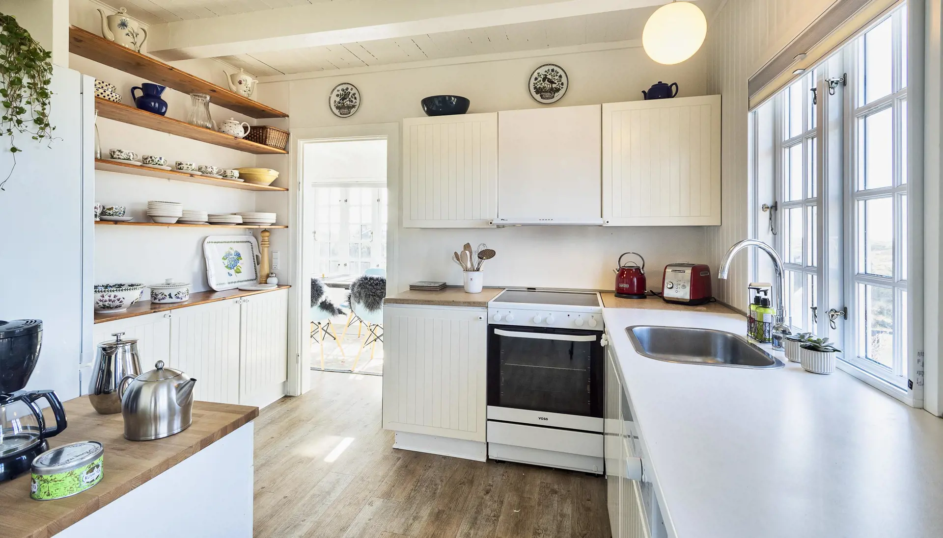 Reetgedecktes Ferienhaus mit Namen ”Udsigten” hoch oben auf einer Düne gelegen mit wundervollem Panoramablick über das Ferienhausgebiet und sogar mit Meerblick vom Obergeschoss. Ein langer steiler Weg mit kleinen Stufen führt hoch zum Ferienhaus. Die Räumlichkeiten verteilen sich über 2 Etagen. Es ist hell und freundlich in der Ausstattung und recht modern eingerichtet. Das Ferienhaus bietet Platz für 6 Personen. Es strahlt einen besondern Chame aus. Der Strand ist nur 100 Meter vom Ferienhaus entfernt. Im Bereich des Erdgeschosses befinden sich der Eingangsbereich, ein Wohnbereich, der Essplatz, die Küche, das Badezimmer und zwei Schlafbereiche. Das Herzstück des Hauses befindet sich in der Mitte und ist der gemütliche Wohnbereich. Hier befindet sich auch der schöne dänische Morsø-Kamin, der Ihnen eine angenehme Wärme bietet und die typische dänische Hygge vermittelt. Das deutsche Fernsehprogramm empfangen Sie über Stofa, daher sind nur 5-8 deutsche Kanäle zu empfangen. Vom Wohnbereich gelangen Sie dann in die offen gehaltene Küche. Diese verfügt über einen Herd mit Cerankochfeld, einem Backofen, einer Geschirrspülmaschine und einer Kühl- und Gefrierkombination. Gehen Sie dann weiter gelangen Sie in den lichtdurchfluteten Essbereich. Durch seine schönen Panoramafenster haben Sie einen tollen Ausblick über das gesamte Ferienhausgebiet. Der gesamte Bodenbereich im Haus ist mit einem hellen Laminat verlegt worden. Alles passt farblich sehr gut zusammen und ist aufeinander abgestimmt. Das Badezimmer ist mit einem Handwaschbecken, einem WC und einer Dusche ausgestattet. Desweiteren befindet sich hier eine Waschmaschine. Insgesamt befinden sich drei Schlafzimmer im Hause: DB + DB + 2B. Über die offene Holztreppe im Wohnbereich gelangen sie dann in das Obergeschoss. Der zweite Wohnbereich im Obergeschoss bietet gemütliche Sitzmöglichkeiten. Von diesem Wohnbereich gelangen Sie auf den schönen Balkon, wo Sie den Meerblick und den Sonnenuntergang in vollen Zügen geniessen können. Die Fenster in diesem Wohnbereich sind halb rund und man hat das Gefühl wie in einer Puppenstube zu wohnen. Der Balkon ist ebenfalls vom Erdgeschoss von aussen zu erreichen. Ein weiteres Schlafzimmer mit einem Doppelbett steht den Gästen hier im Obergeschoss bereit. In diesen Ferienhaus können Sie sich einfach entspannen und Ihren Urlaub voll geniessen. Hinter dem Ferienhaus befindet sich der kleine Eingangsbereich und eine grössere geschlossene Terrasse, die auch durch verschiedene Sichtschutz-Elemente geschützt ist. Ein klein wenig der Düne nach unten gehend, haben sie dann einen weiteren geschützten Terrassenbereich. In einem separaten Kellerbereich befindet sich ein weiteres Badezimmer, ausgestattet mit WC, Handwaschbecken und Dusche, und eine Sauna. Es gibt keinen direkten Zugang vom Haus zum Kellerbereich, wo sich das Badezimmer befindet. Das Ferienhaus verfügt über einen Internetanschluss (W-Lan - 100/100). Es ist max. ein Haustier erlaubt, allerdings sind keine Katzen erlaubt. Das Rauchen im Ferienhaus ist nicht erlaubt. Es fallen bei diesem Ferienhaus Zusatzkosten für Wasser an. Es ist im Jahre 1936 erbaut worden und in 2019 neurenoviert. Das Grundstück beträgt insgesamt 1765 qm.