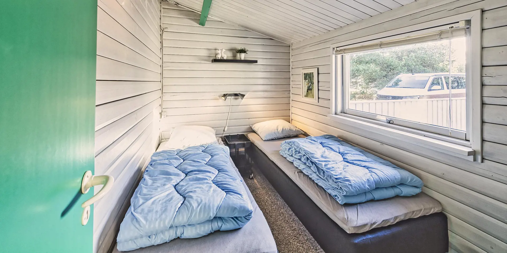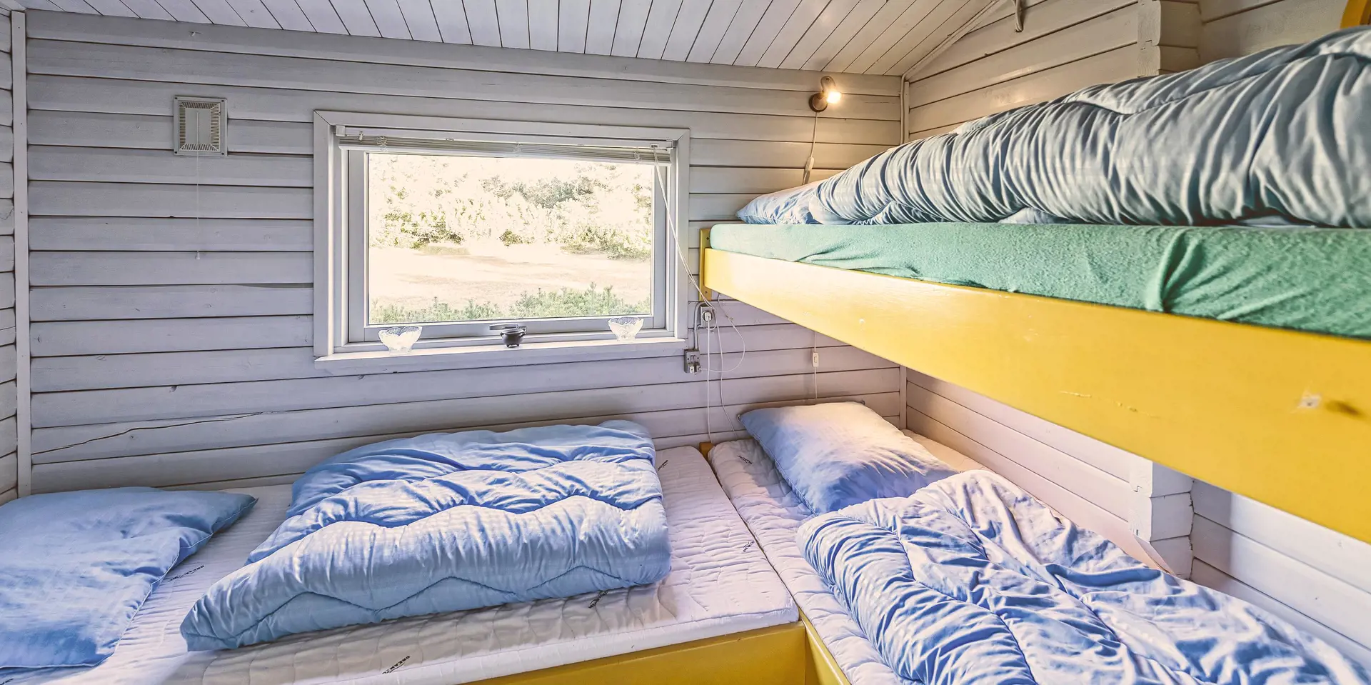 3 Schlafzimmer. 1 mit Doppelbett 180x200 cm. 1 mit 2 Einzelbetten (je 80x200 cm). 1 mit 1 Etagenbett und 1 Einzelbett.