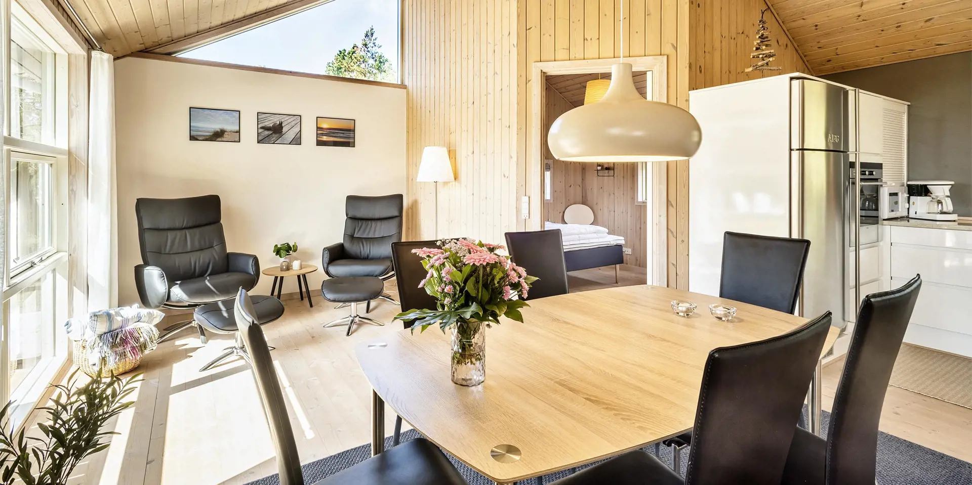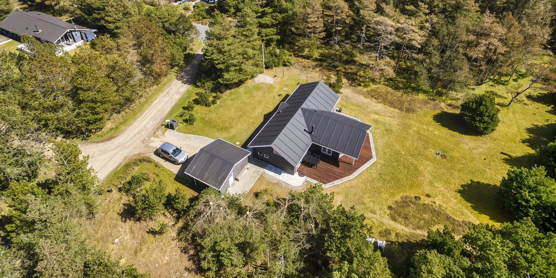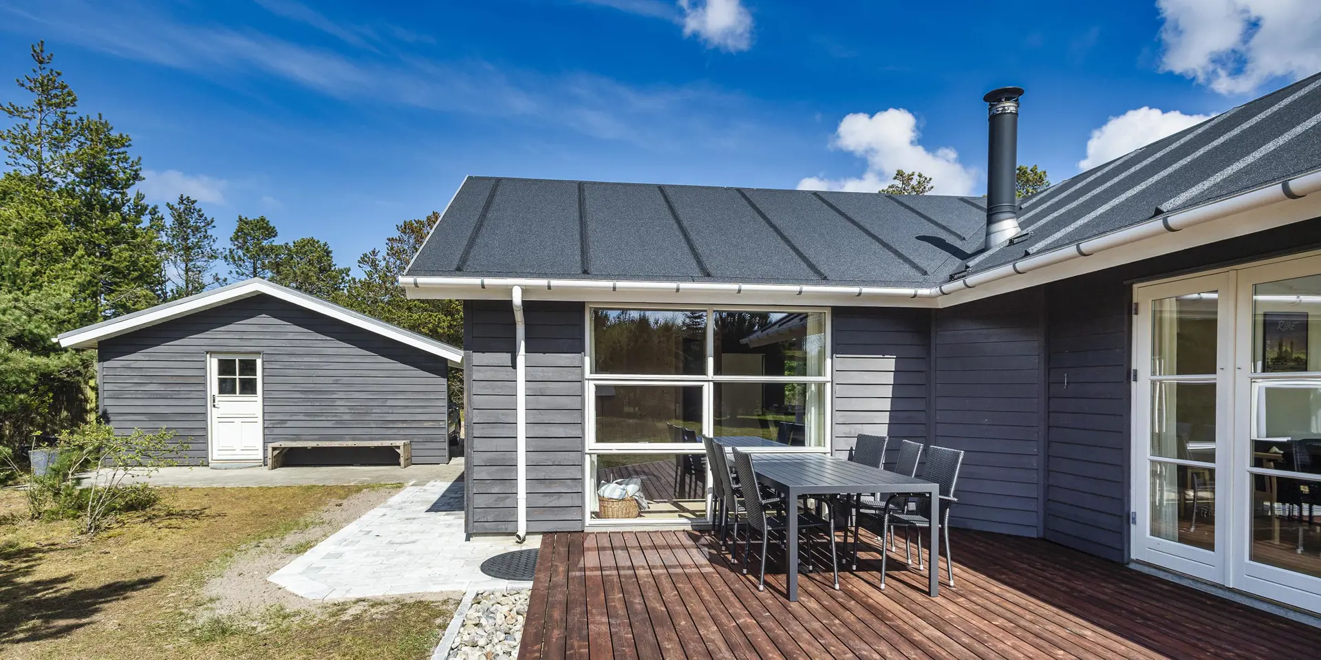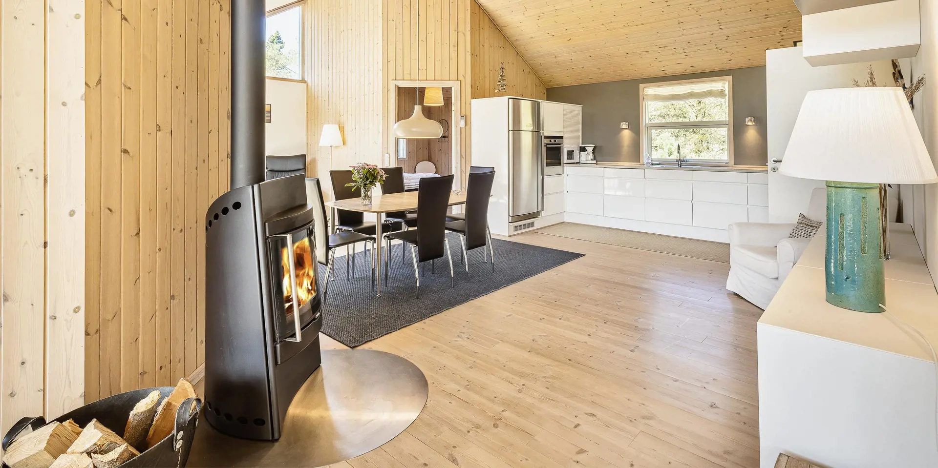 Helles und lichtdurchflutetes Ferienhaus auf einem schönen Rasengrundstück gelegen. Das Ferienhaus ist für 6 Personen ausgestattet. Der Strand ist ca. 1,5 km vom Haus entfernt. Das Ferienhaus ist komplet mit einem Holzfussboden verlegt, ausser dem Bereich des Bades und dem Eingangsbereich. In das Wohnzimmer kommt viel Licht durch die grossen hohen Fensterfronten und bietet direkten Blick auf das von Bäumen umgebene Grundstück. Ein Kamin spendet eine angenehme Wärme und Gemütlichkeit. Das Fernsehprogramm empfangen Sie über Stofa, derher können nur 5-8 deutsche Kanäle empfangen werden. Die offene Küche lädt zum Kochen ein und bietet alles was das Herz begehrt. Die Küche verfügt üben einen Herd mit Cerankochfeld, einem Backofen in arbeitshöhe, einer Geschirspülmaschine, einer Mikrowelle und einer Kühl- und Gefrierkombination. An dem Essplatz zwischen Küche und Wohnbereich sind Sie mitten im Geschehen. Das mit hellen Fliesen ausgestattete Badezimmer verfügt über ein Handwaschbecken, einem WC und einer Dusche. Fussbodenheizung befindet sich im Badezimmer. Es stehen den Gästen drei Schlafzimmer zur Verfügung: DB + 2B + 2B. Im Ferienhaus befindet sich eine Waschmaschine und ein Trockner zur freien Benutzung. Auf der grosszügigen Holzterrasse finden alle Bewohner das Hauses genügend Platz. Ein kleiner Teil Teil der Terrasse ist sogar überdacht. Ein Carport steht für Ihr Fahrzeug auf dem Grundstück bereit. Im Schuppen steht zwei Fahrräder, die verwendet werden dürfen. Die Fahrräder sollen in gleichem Zustand hinterlassen werden, in dem sie vorgefunden werden. - aber für den Zustand übernehmen wir keine Haftung. Es sind keine Haustiere erlaubt. Bei diesem Ferienhaus sind mit Zusatzkosten für den Wasserverbrauch zu rechnen. Das Ferienhaus ist 2003 erbaut worden.