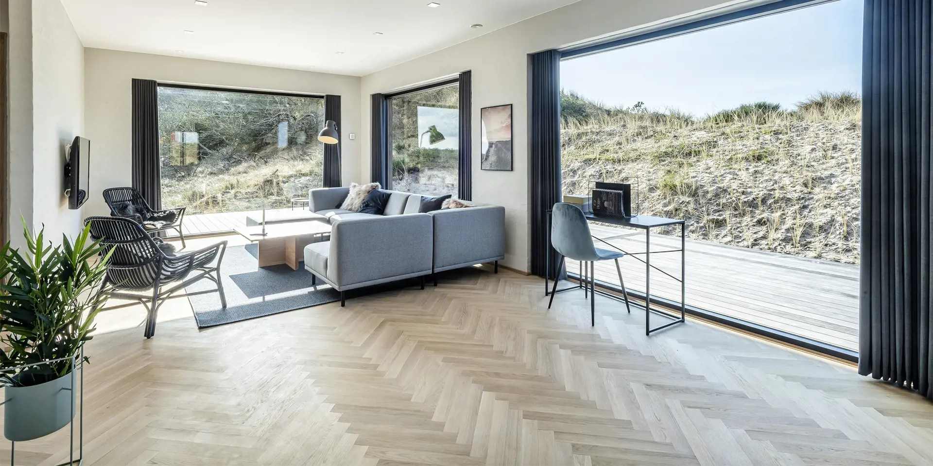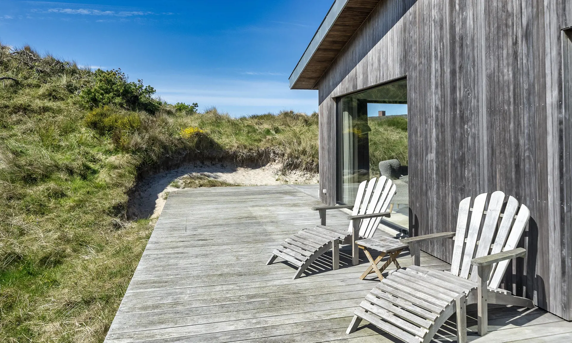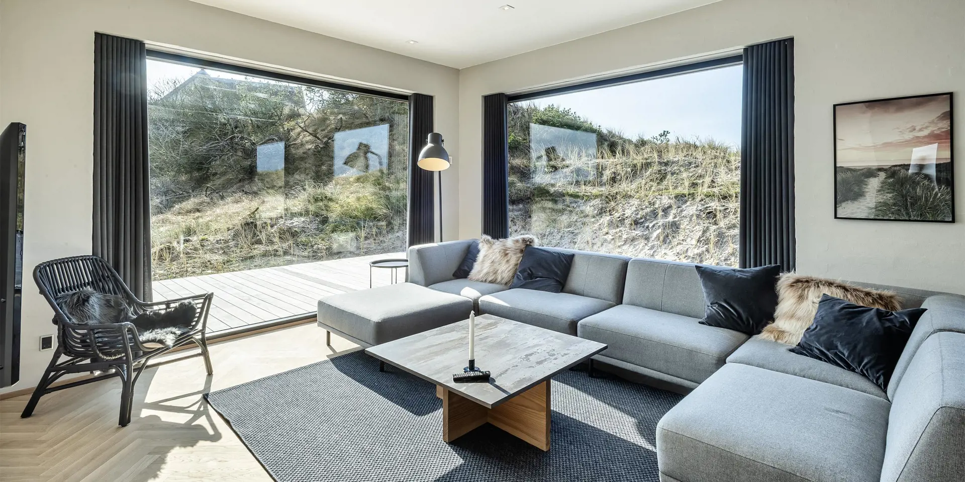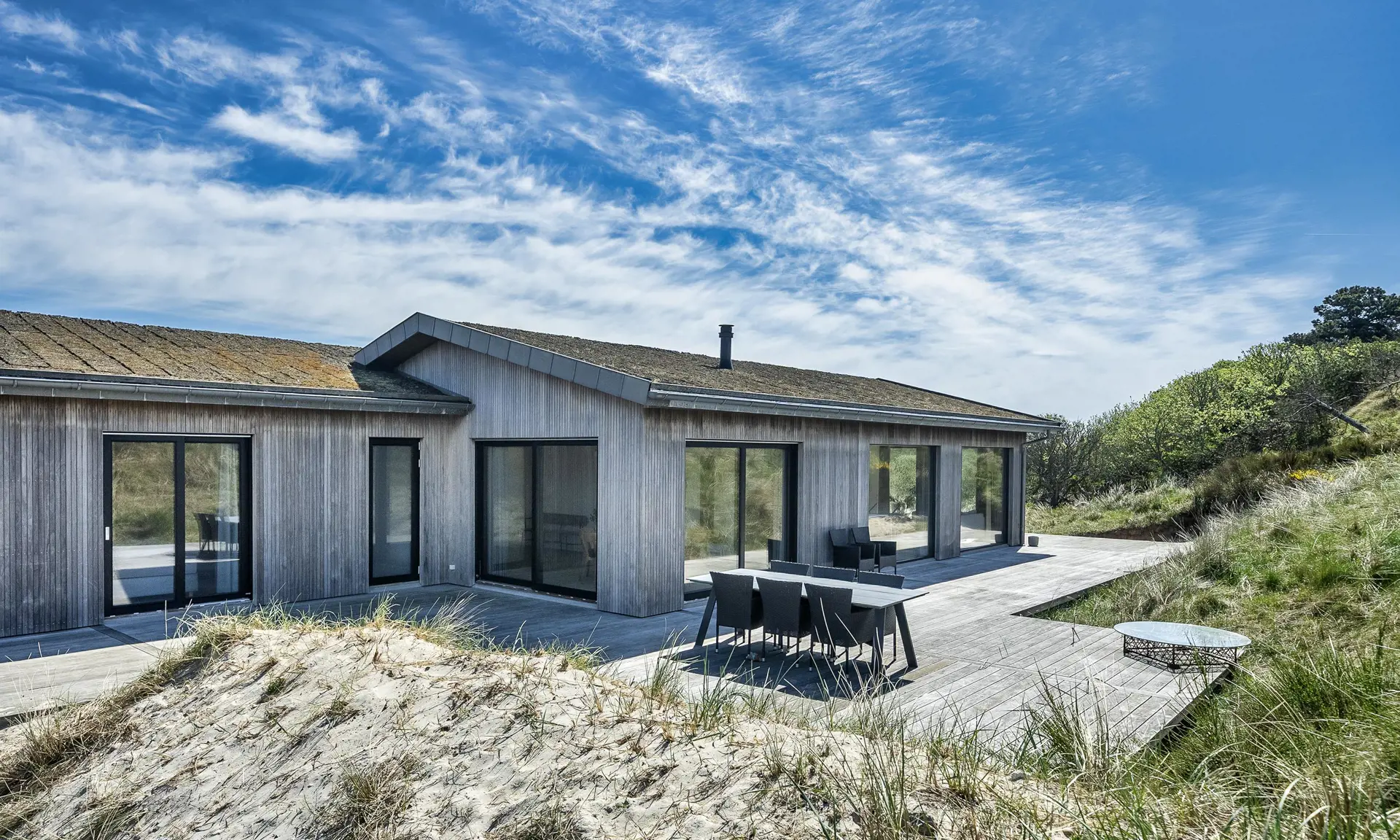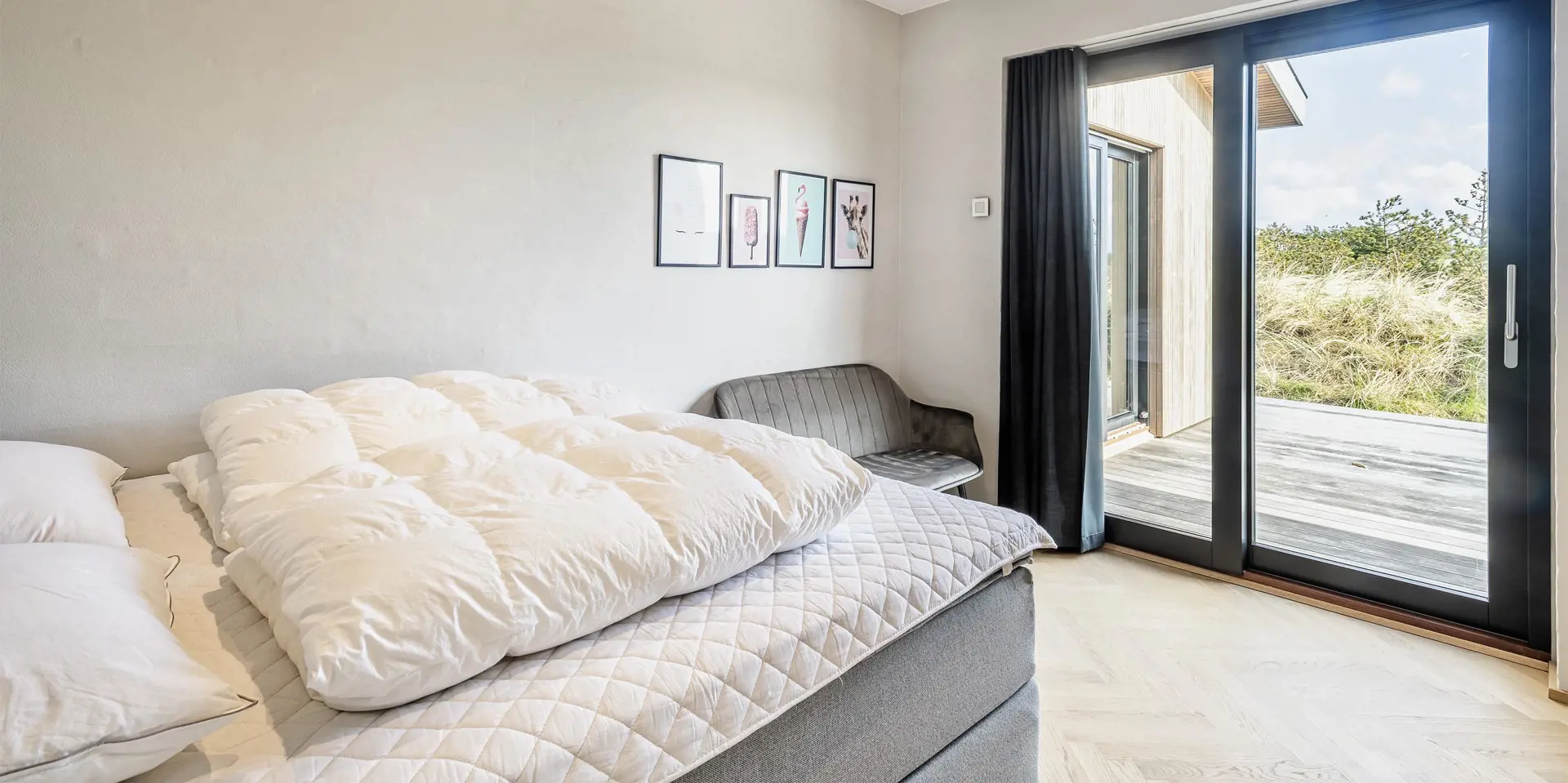 Der Eingangsbereich ist überdacht und bietet genügend Platz, sowie aussen und auch auch innen der Flurbereich. Alle Zimmer sind mit einer Schiebetür in modernen Design ausgestattet. Vom Flurbereich aus zur linken Seite befindet sich der Hauswirtschaftsraum mit der Waschmaschine, dem Trockner und grossem Garderobenplatz. Ausserdem ist hier auch genügend Platz als zusätzliche Aufbewahrungsmöglichkeit. Desweiteren auf der linken Seite befindet sich dann das Erste Schlafzimmer, ausgestattet mit Kleiderschrank und einem Doppelbett. Gegenüber befindet sich dann ein weiteres Schlafzimmer mit der gleichen Ausstattung. Neben diesem Schlafzimmer befindet sich dann ein schönes modernes Badezimmer, ausgestattet mit WC, Handwaschbecken und einer Dusche. Alles in modernem Design, Mamorfliesen und grosszügides Handwaschbecken. Nun gelangen Sie weiter in den offenen Küchenbereich mit Essplatz. Auch hier sind wieder zwei Ausgänge zur Terrasse. Die Küche ist sehr modern eingerichtet und verfügt über einen Herd mit der Dunstabzugshaube in der Mitte der Kochplatte (Induktion), einem Backofen in arbeitshöhe, einer Geschirrspülmaschine und einer Kühl- und Gefirierkombination. Gegenüber der Küche ist der Essplatz, auch hier sind wieder grosse Fensterfronten und ein wundervoller Panoramablick zu den Dünen. Abgrenzend zum Wohnbereich befindet sich dann ein Gas-Kamin, dieser ist eingemauert und wird mit Ethanol befeuert. Gas kann nicht austreten, da dieser Kamin mit Glasscheiben versehen ist. Dieser spendet eine wohlige Wärme und sehr viel Gemütlichkeit. Es liegen Holzscheite im Innenbereich, die sich verfärben und dadurch wird die Wärme abgeben. Für das Gas haben die Gäste selber die Kosten zu tragen. Neben dem Gas-Kamin zum Wohnbereich befindet sich eine kleine Bank mit Kissen und Lammfell, eine Kuschelecke, wo Sie gemütlich Ihr Buch lesen können oder dem Geschehen im Wohnbereich folgen können. Das deutsche Fernsehprogramm empfangen Sie über Stofa und daher können Sie nur 5-8 deutsche Kanäle empfangen. Ein wundervoller Blick durch die grossen Panoramafenster spendet Erholung und Entspannung pur mit weitere Ausgängen zur schöne Holzterrasse. Vom Wohnbereich gehen dann weitere zwei Schlafzimmer, mit je einem Doppelbett ab. Auch ein zweites grozzügiges Badezimmer, modernem Design und ausgestattet mit WC, Handwaschbecken und Dusche. Ebenfalls im gleiche Stil wie das Badezimmer am Eingangsbereich. Zwei der Schafzimmer verfügen jeweils über ein Fernsehgerät mit Smart TV und sind in der Ausstattung und farbe identisch. Das Ferienhaus verfügt über einen Internetanschluss. Es sind keine Haustiere erlaubt. Das Rauchen im Ferienhaus ist auch nicht erlaubt. Eine Vorichtung für das Aufladen von Elektroautos ist vorhanden. 4 schlafzimmer: DB + DB + DB + DB. Das Ferienhaus ist Baujahr 2020.