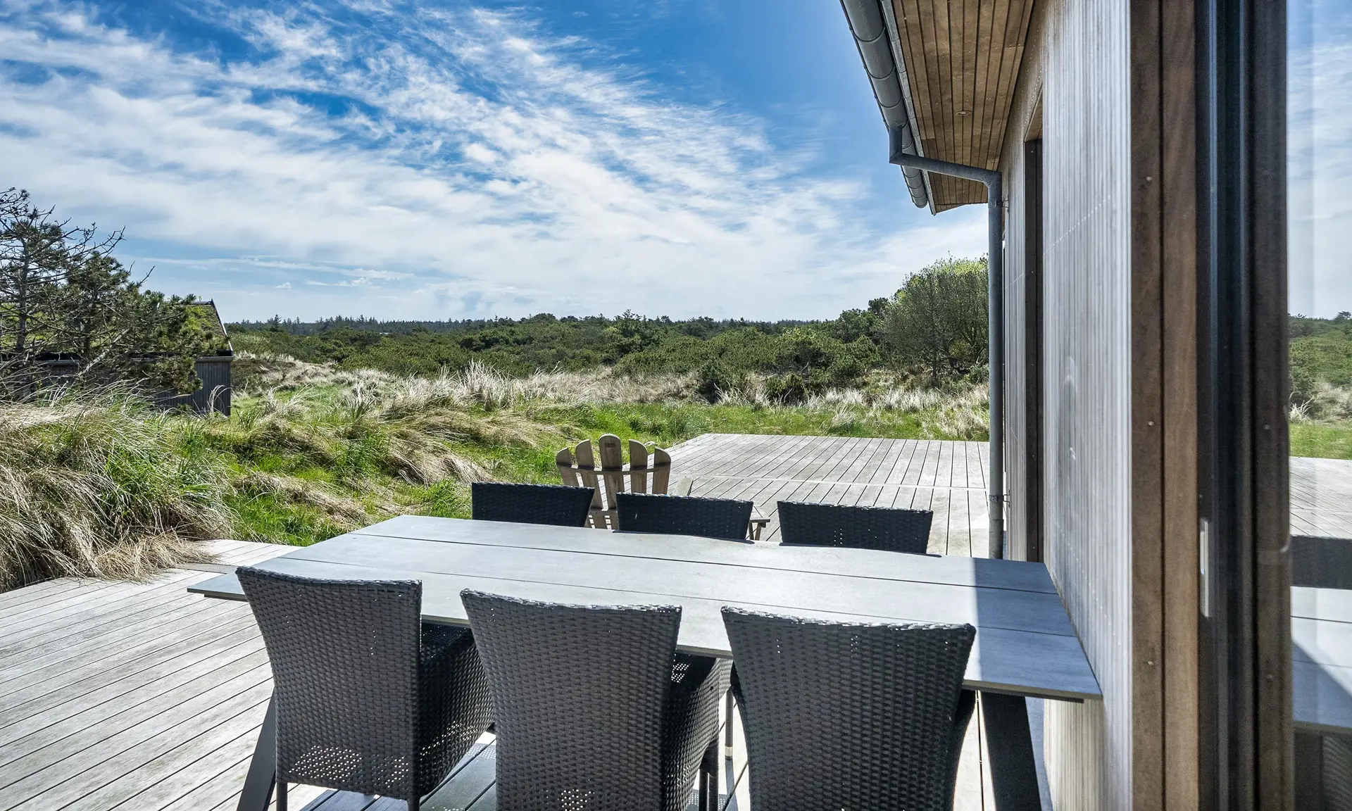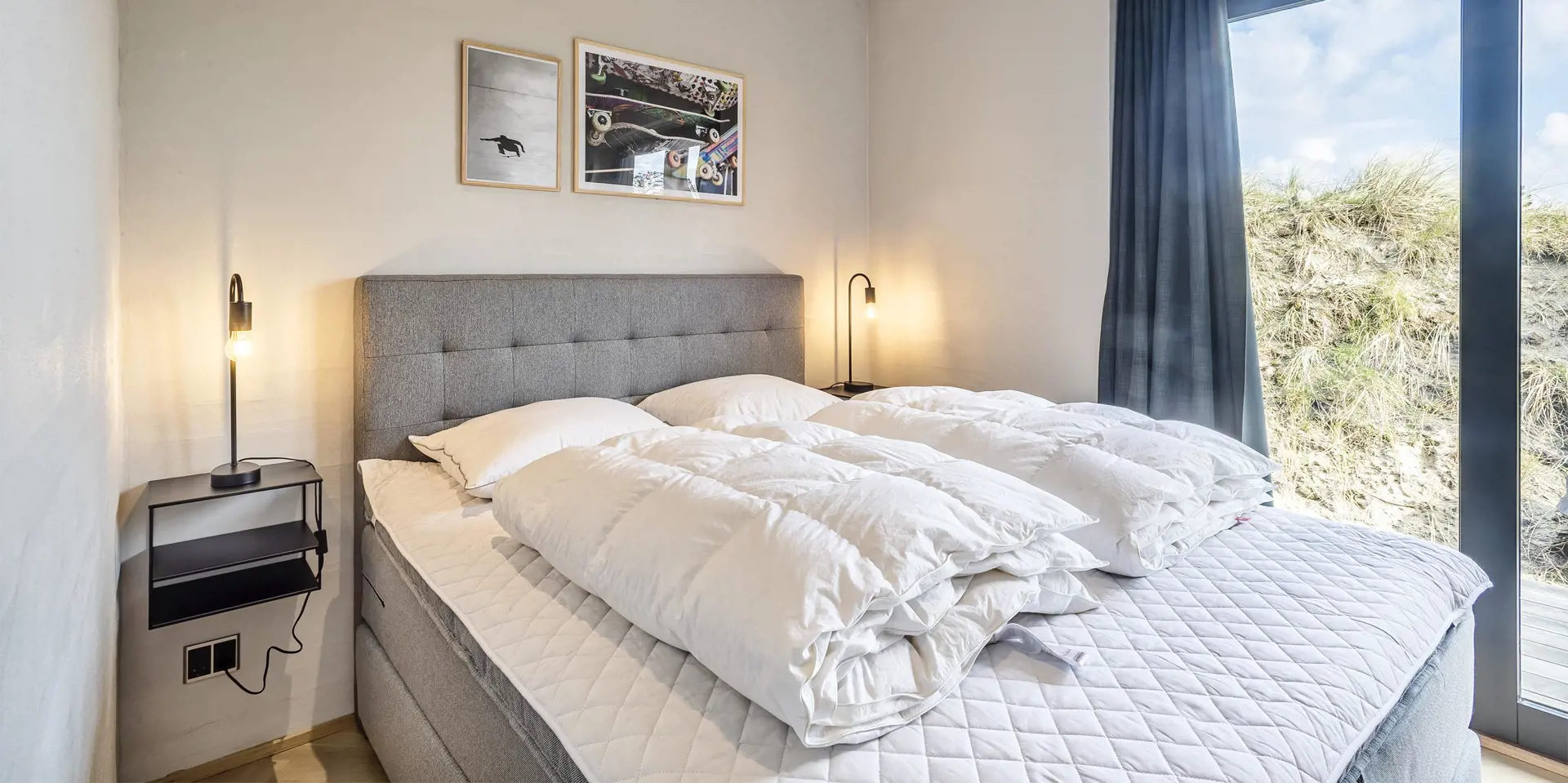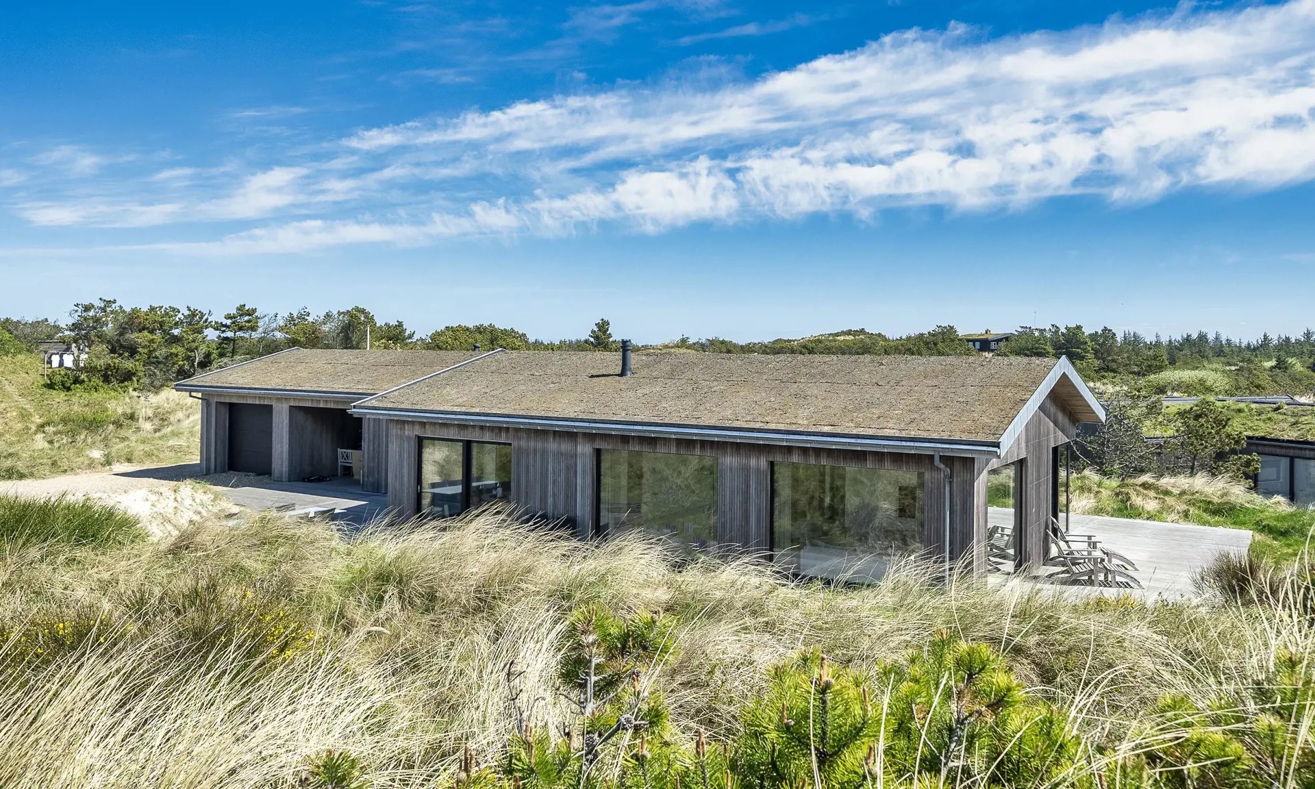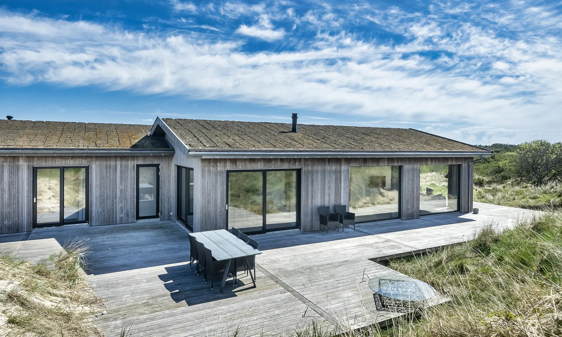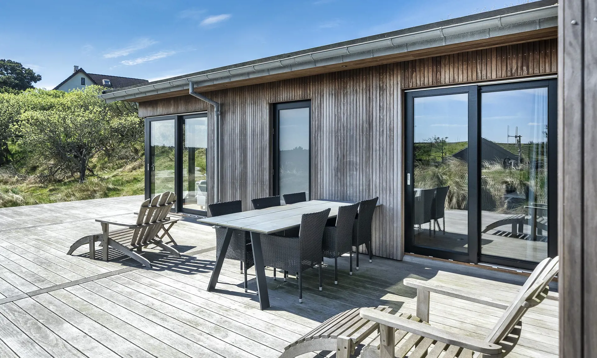 Der Eingangsbereich ist überdacht und bietet genügend Platz, sowie aussen und auch auch innen der Flurbereich. Alle Zimmer sind mit einer Schiebetür in modernen Design ausgestattet. Vom Flurbereich aus zur linken Seite befindet sich der Hauswirtschaftsraum mit der Waschmaschine, dem Trockner und grossem Garderobenplatz. Ausserdem ist hier auch genügend Platz als zusätzliche Aufbewahrungsmöglichkeit. Desweiteren auf der linken Seite befindet sich dann das Erste Schlafzimmer, ausgestattet mit Kleiderschrank und einem Doppelbett. Gegenüber befindet sich dann ein weiteres Schlafzimmer mit der gleichen Ausstattung. Neben diesem Schlafzimmer befindet sich dann ein schönes modernes Badezimmer, ausgestattet mit WC, Handwaschbecken und einer Dusche. Alles in modernem Design, Mamorfliesen und grosszügides Handwaschbecken. Nun gelangen Sie weiter in den offenen Küchenbereich mit Essplatz. Auch hier sind wieder zwei Ausgänge zur Terrasse. Die Küche ist sehr modern eingerichtet und verfügt über einen Herd mit der Dunstabzugshaube in der Mitte der Kochplatte (Induktion), einem Backofen in arbeitshöhe, einer Geschirrspülmaschine und einer Kühl- und Gefirierkombination. Gegenüber der Küche ist der Essplatz, auch hier sind wieder grosse Fensterfronten und ein wundervoller Panoramablick zu den Dünen. Abgrenzend zum Wohnbereich befindet sich dann ein Gas-Kamin, dieser ist eingemauert und wird mit Ethanol befeuert. Gas kann nicht austreten, da dieser Kamin mit Glasscheiben versehen ist. Dieser spendet eine wohlige Wärme und sehr viel Gemütlichkeit. Es liegen Holzscheite im Innenbereich, die sich verfärben und dadurch wird die Wärme abgeben. Für das Gas haben die Gäste selber die Kosten zu tragen. Neben dem Gas-Kamin zum Wohnbereich befindet sich eine kleine Bank mit Kissen und Lammfell, eine Kuschelecke, wo Sie gemütlich Ihr Buch lesen können oder dem Geschehen im Wohnbereich folgen können. Das deutsche Fernsehprogramm empfangen Sie über Stofa und daher können Sie nur 5-8 deutsche Kanäle empfangen. Ein wundervoller Blick durch die grossen Panoramafenster spendet Erholung und Entspannung pur mit weitere Ausgängen zur schöne Holzterrasse. Vom Wohnbereich gehen dann weitere zwei Schlafzimmer, mit je einem Doppelbett ab. Auch ein zweites grozzügiges Badezimmer, modernem Design und ausgestattet mit WC, Handwaschbecken und Dusche. Ebenfalls im gleiche Stil wie das Badezimmer am Eingangsbereich. Zwei der Schafzimmer verfügen jeweils über ein Fernsehgerät mit Smart TV und sind in der Ausstattung und farbe identisch. Das Ferienhaus verfügt über einen Internetanschluss. Es sind keine Haustiere erlaubt. Das Rauchen im Ferienhaus ist auch nicht erlaubt. Eine Vorichtung für das Aufladen von Elektroautos ist vorhanden. 4 schlafzimmer: DB + DB + DB + DB. Das Ferienhaus ist Baujahr 2020.