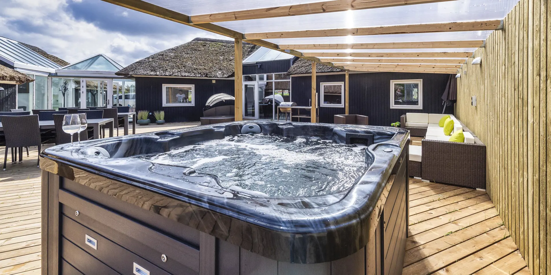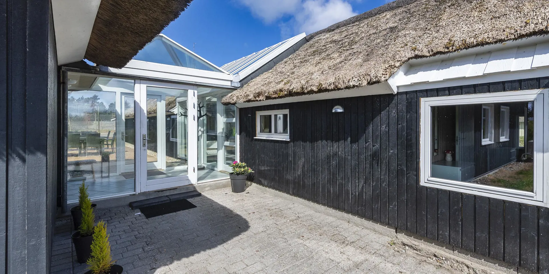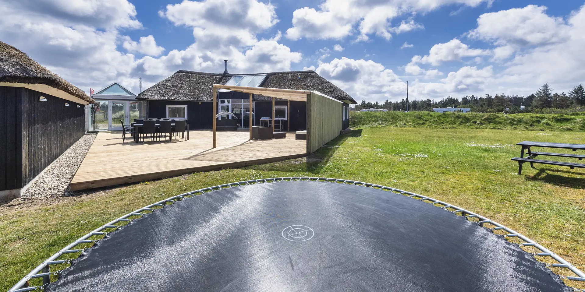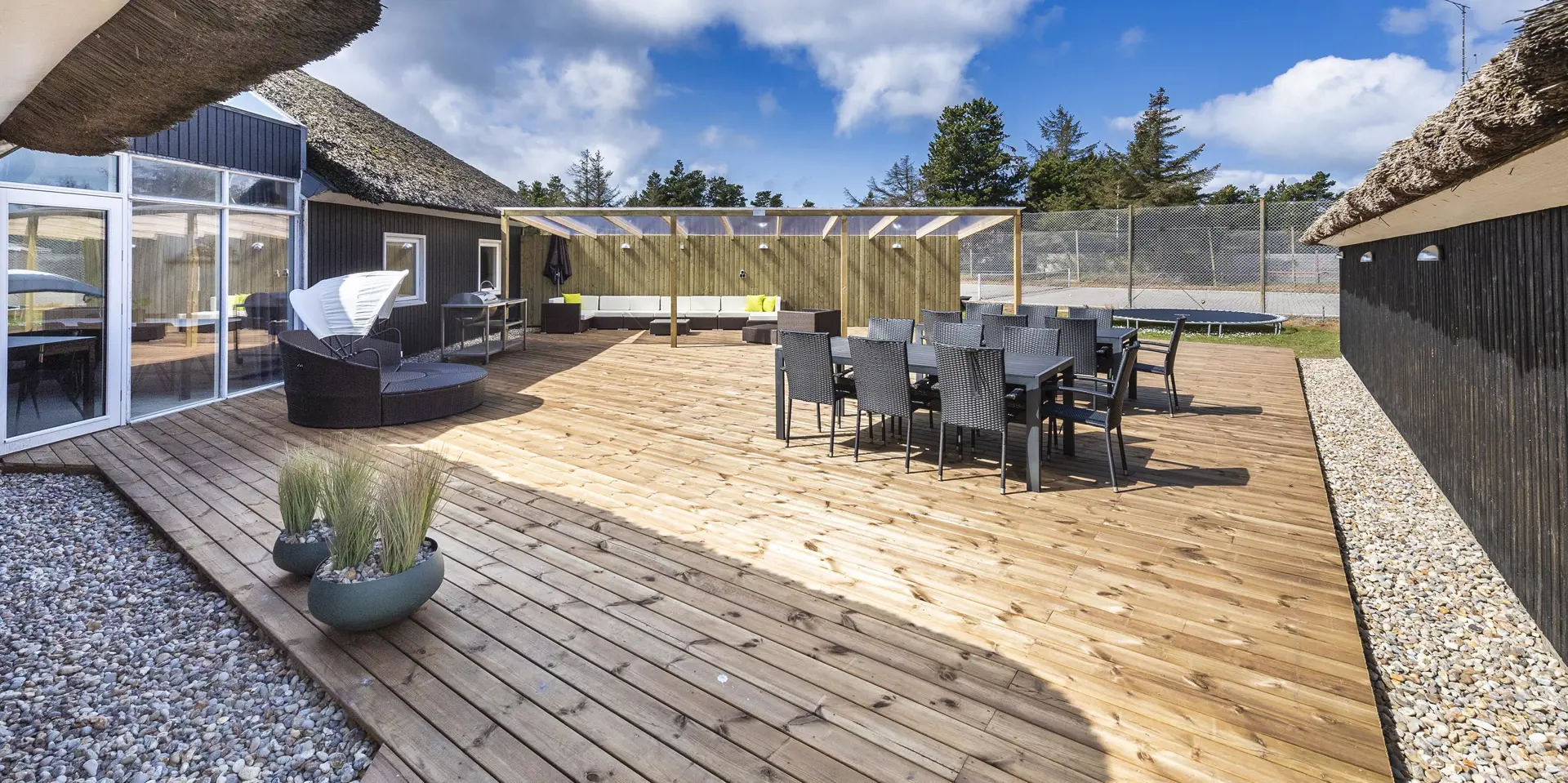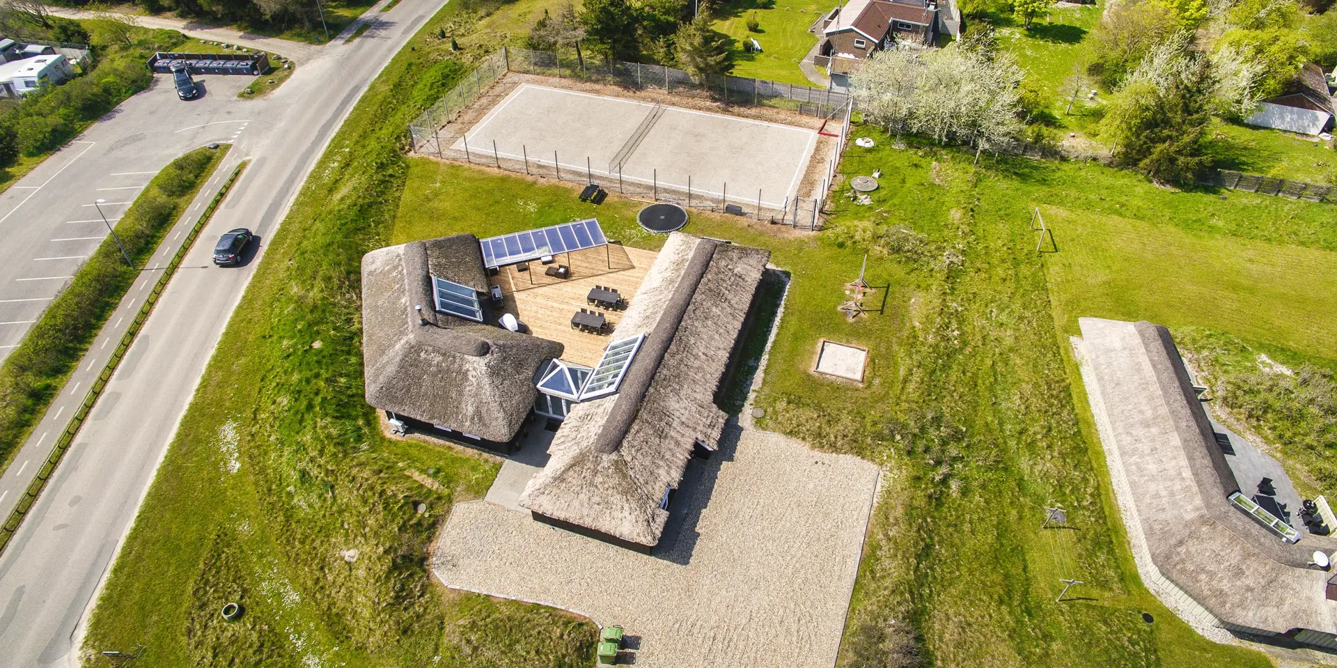 Charmantes Poolhaus für die aktive Familie. Dieses strohgedeckte und idyllische Ferienhaus besteht aus zwei wunderschönen einzelnen Holzhäusern, die mit einer Glaspartie verbunden sind. Das Ferienhaus bietet auf seinen 288 qm Wohnfläche Platz für insgesamt 16 Personen. Dieses Ferienhaus bietet für wählerische Familien, Grossfamilien oder für Freunde, die einfach mal zusammen Ihren Urlaub verbringen möchten, reichlich Platz. Das Ferienhaus bietet weiterhin für die Kleineren Gäste, sowie auch für die Erwachsenen Gäste, viele Aktivitäten an. Es gibt im Aussenbereich einen eigenen Tennisplatz für die Erwachsenen und für die kleineren zum Beispiel eine Sandkiste, ein Schaukelstativ, ein Trampolin und eine Rasenfläche zum toben und spielen. Für das Spielen auf dem "Amateur" Tennisplatz müssen die Gäste allerdings selbst für die Turnschuhe, Schläger und Bälle sorgen.