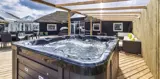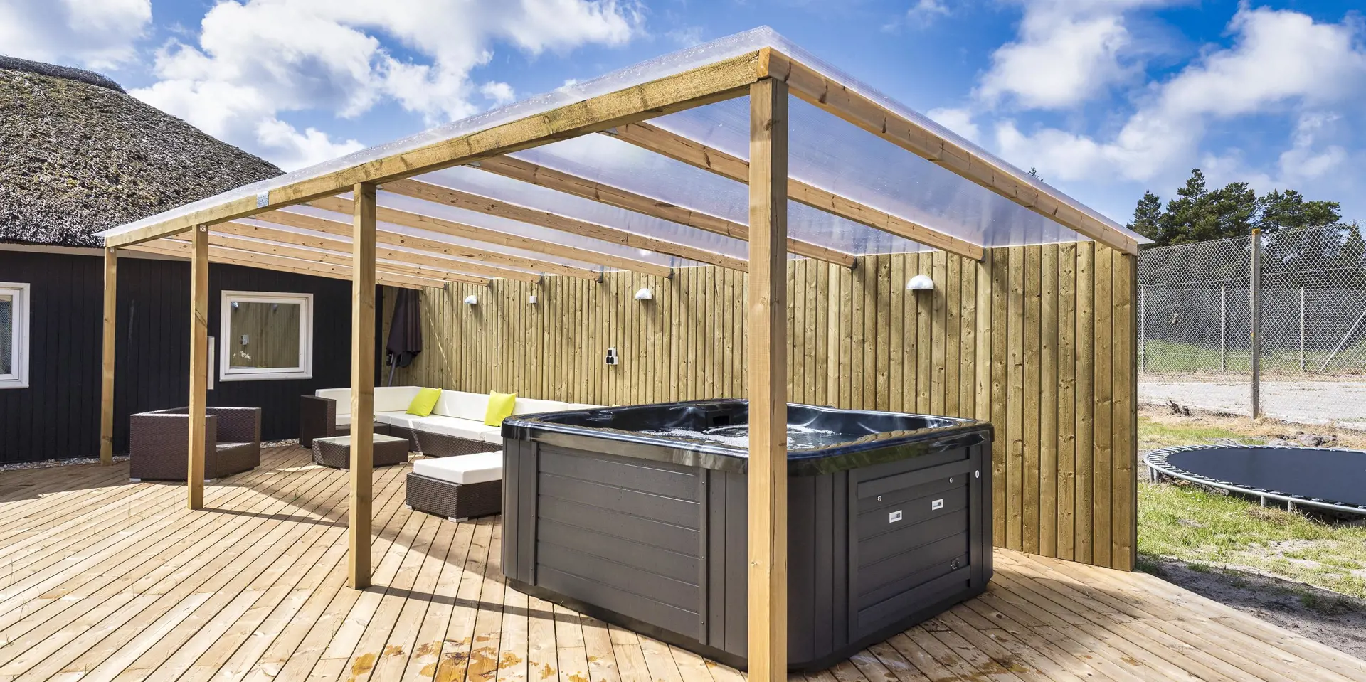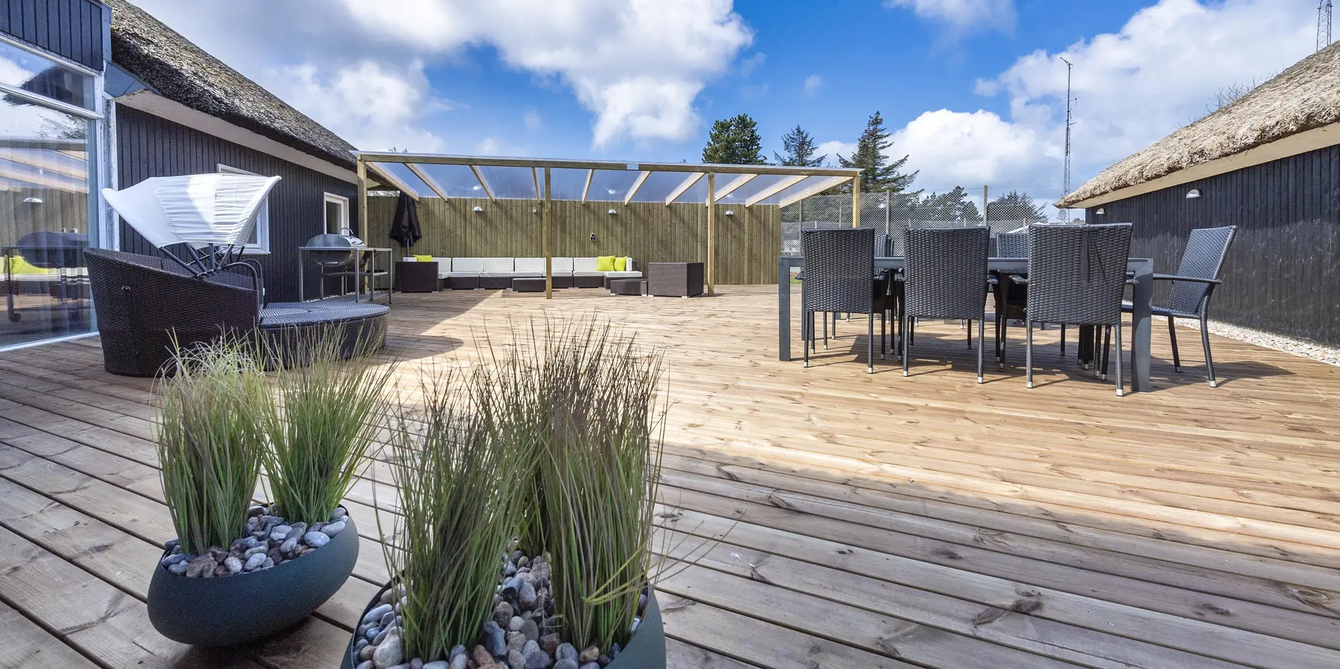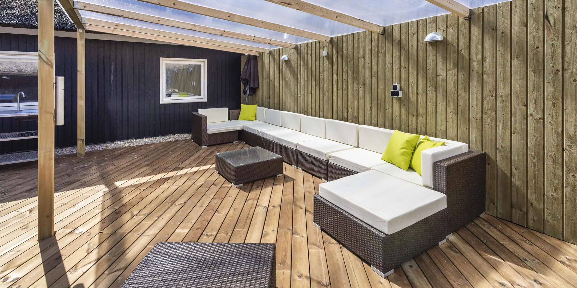 Vom Eingangsbereich haben Sie dann den Aussenzugang zum Terrassenbereich. Zur linken Seite ist ein grösserer Teil überdacht und hier können sie die Ruhe mit Ihrer Lektüre geniessen oder auch die Grillabende toll gestalten. Dafür steht dann auch eine kleine Aussenküche mit einem Kohle-Grill zur Verfügung. Ein Aussen-Jacuzzi ( für ca. 6 Personen) steht den Gästen auch das ganze Jahr zur Verfügung und befindet sich unter der Überdachung. Dieser überdachte Terrassenbereich kann sowie im Frühjahr als auch im Herbst genutzt werden und selbstverständlich in den Sommermonaten. Ein Internet-Anschluss (W-lan) steht den Gästen im Ferinhaus zur Verfügung. Es sind max. 2 Haustiere erlaubt. Das Rauchen im Ferienhaus ist untersagt. Es sind keine Jugendgruppen im Ferienhaus erlaubt. Es fallen zusätzlich Wasserkosten bei diesm Ferienhaus an. Die offengelegten Balken im Ferienhaus und die Oberlichter geben dem Ferienhaus den besonderen Sommerhaus-Stil mit seiner Gemütlichkeit.