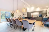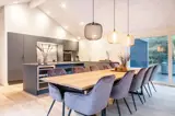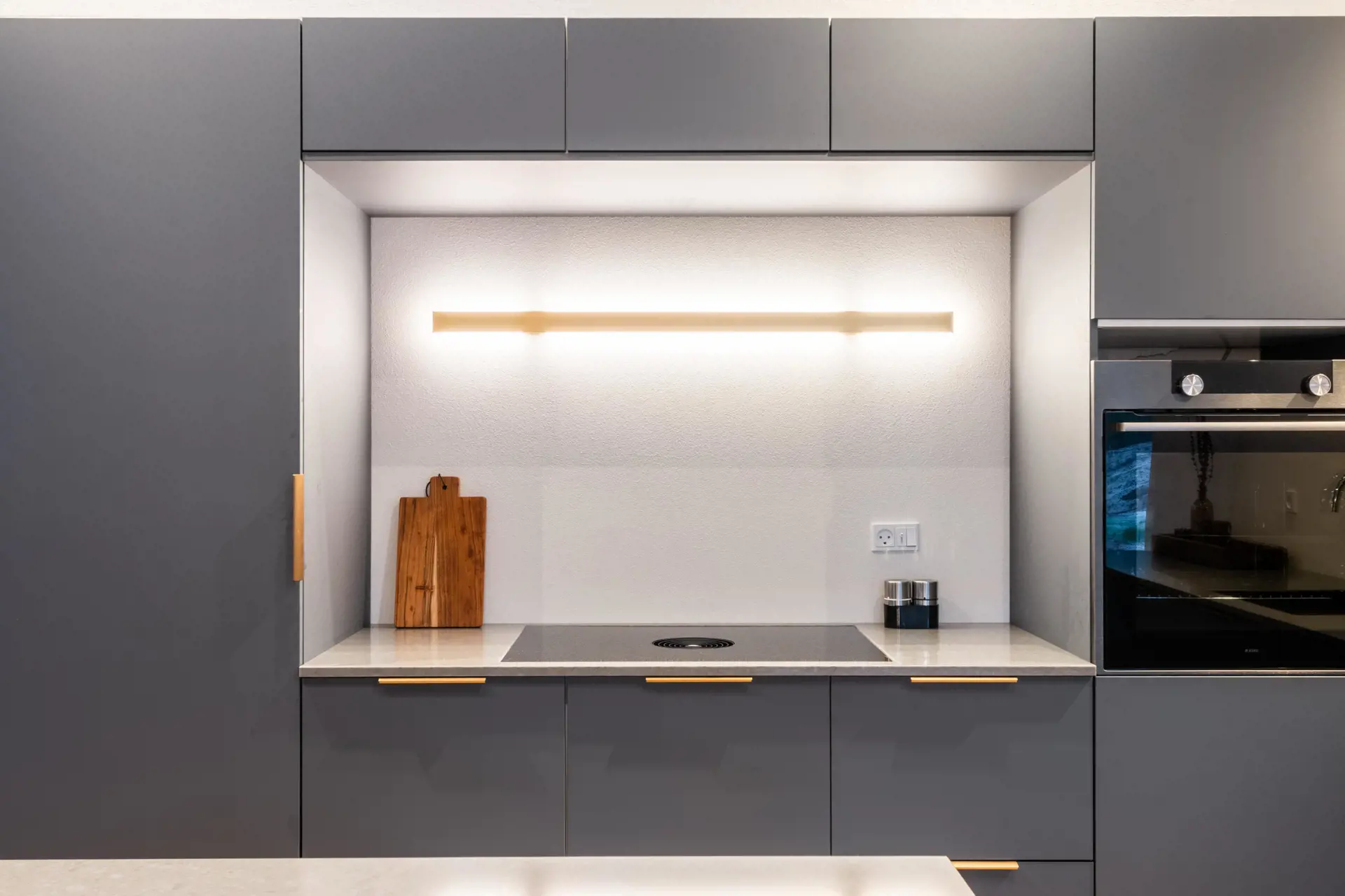 Offene Küche mit Geschirrspüler, Mikrowelle, Backofen, Induktionskochfeld, Kühlschrank, Gefrierer (70 L Gefrierkapazität) und Weinkühlschrank