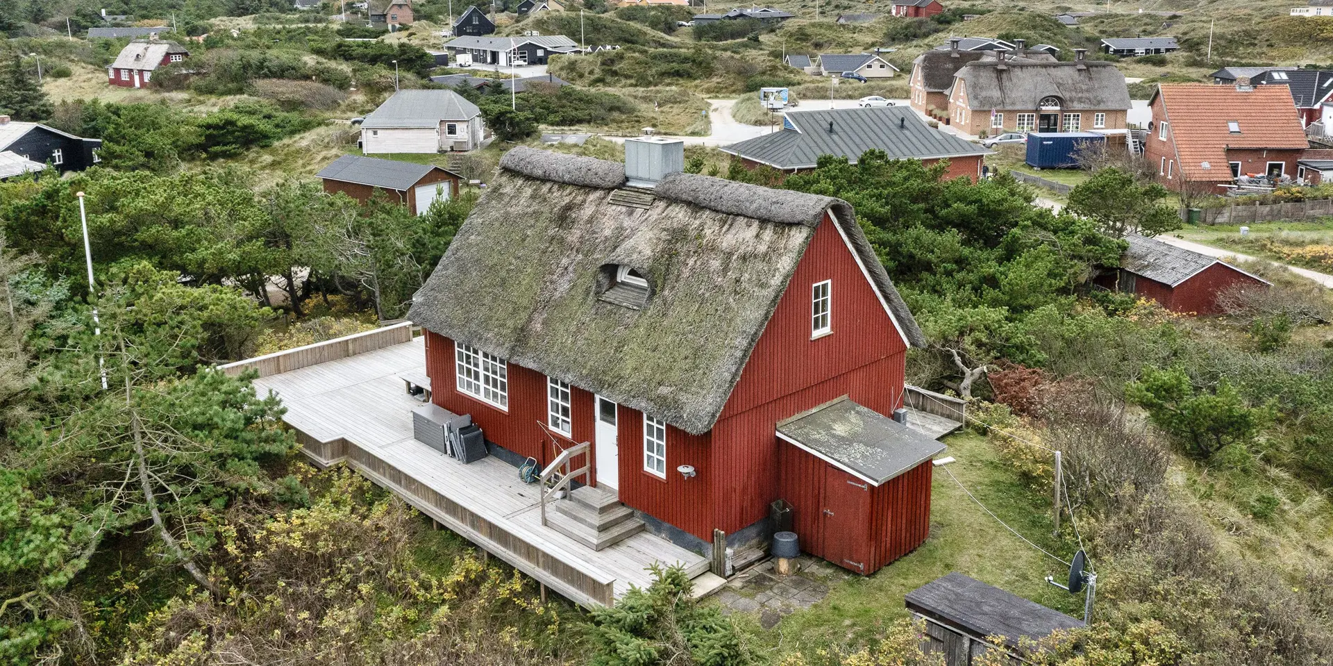Charmantes Reetgedecktes älteres Ferienhaus hoch oben auf einer Düne gelegen mit Namen ”Alsbo”. Die Räumlichkeiten sind über 2 Etagen verteilt. Aus der oberen Etage haben Sie einen wunderschönen Blick über das tolle Ferienhausgebiet von Vejers Strand. Das Ferienhaus ist für 6 Personen ausgestattet und der Strand ist nur ca. 400 Meter vom Ferienhaus entfernt. Der Wintergarten dient auch gleich als Eingangsbereich. Eine gemütliche Eckbank befindet sich hier im Wintergarten, von dem Sie durch die grosszügige Fensterfront einen weiteren tollen Ausblick haben. Der Wohn- und Essbereich ist zusammen und mit charmanten Mobiliar ausgestattet. Das deutsche Fernsehproramm empfangen Sie über eine Parabolantenne. Das dänische Fernsehprogramm kann über den Anbieter Stofa empfangen werden. Ein eingebauter Kamin sorgt für wohlige Wärme und die dänische Gemütlichkeit. Ein weiterer Kamin (Mørso-Kamin) dient nur zur Zierde und Dekoration, der kann nicht befeuert werden. Die Küche ist ein separater Raum und einfach gehalten, verfügt aber über alles was Sie zum täglichen Gebrauch benötigen. Die Küche ist mit einem Herd mit Cernfeld, einem Backofen, einer Geschirspülmaschine, einer Mikrowelle und einer Kühl- und Gefrierkombination ausgestattet. Das Badezimmer verfügt über ein WC, ein Handwaschbecken und eine Dusche. Die zur Verfügung stehende Waschmaschine ist hier im Badezimmer untergebracht. Desweiteren ist das Badezimmer mit einer Fussbodenheizung ausgestattet. Das Feienhaus verfügt insgesamt über drei Schlafzimmer: DB + DB + 2B. Ein Schlafzimmer befinet sich im Erdgeschoss und die beiden anderen sind im Obergeschoss. Das Schlafzimmer im unteren Bereich ist mit einem Doppelbett ausgestattet. In der einen Ecke im Wohnbereich befindet sich die Holztreppe, über die Sie dann in den oberen Bereich gelangen. Das eine Schlafzimmer im Obergeschoss verfügt über zwei Einzelbetten und das andere Schlafzimmer hat ein Doppelbett. Das Schlafzimmer mit dem Doppelbett hat ebenfalls eine kleine Kuschelecke, ausgestattet mit einer kleine Madratze. Das Ferienhaus verfügt über einen Internetanschluss (W-Lan). Zwei Hunde sind erlaubt. Rauchen im Ferienhaus ist nicht erlaubt. Eine Holzterrasse ist fast um das ganze Ferienhaus gebaut. Hier können Sie mit den Gartenmöblen den Sonnenstrahlen folgen. Das Ferienhaus wurde in 1930 erbaut.