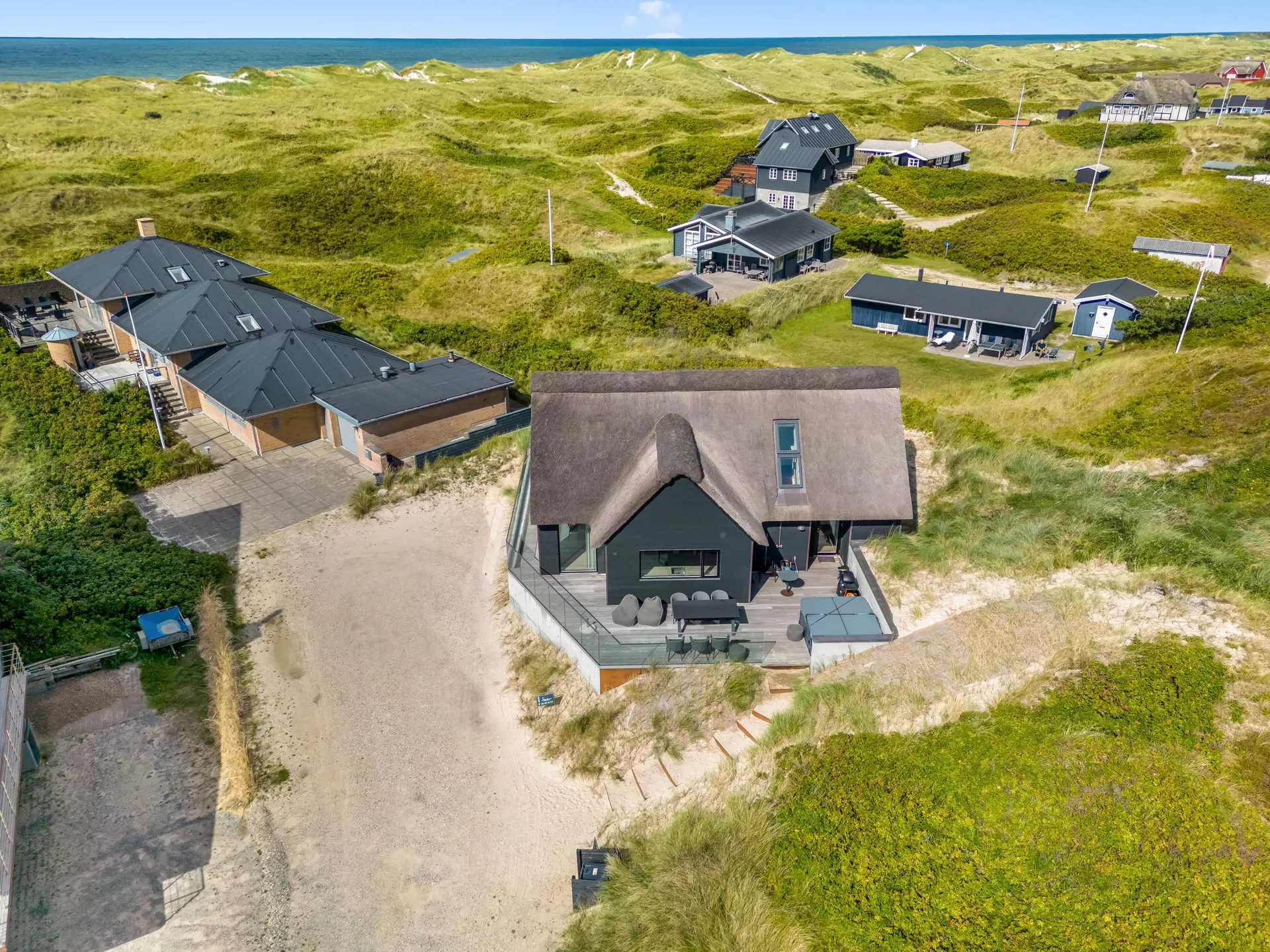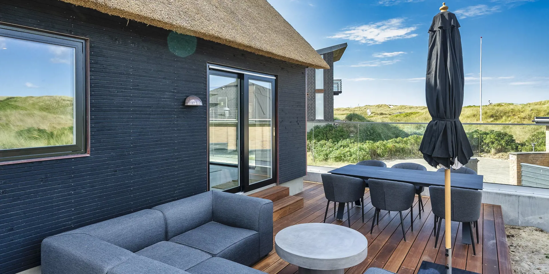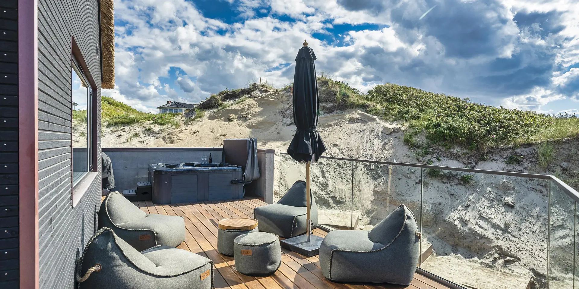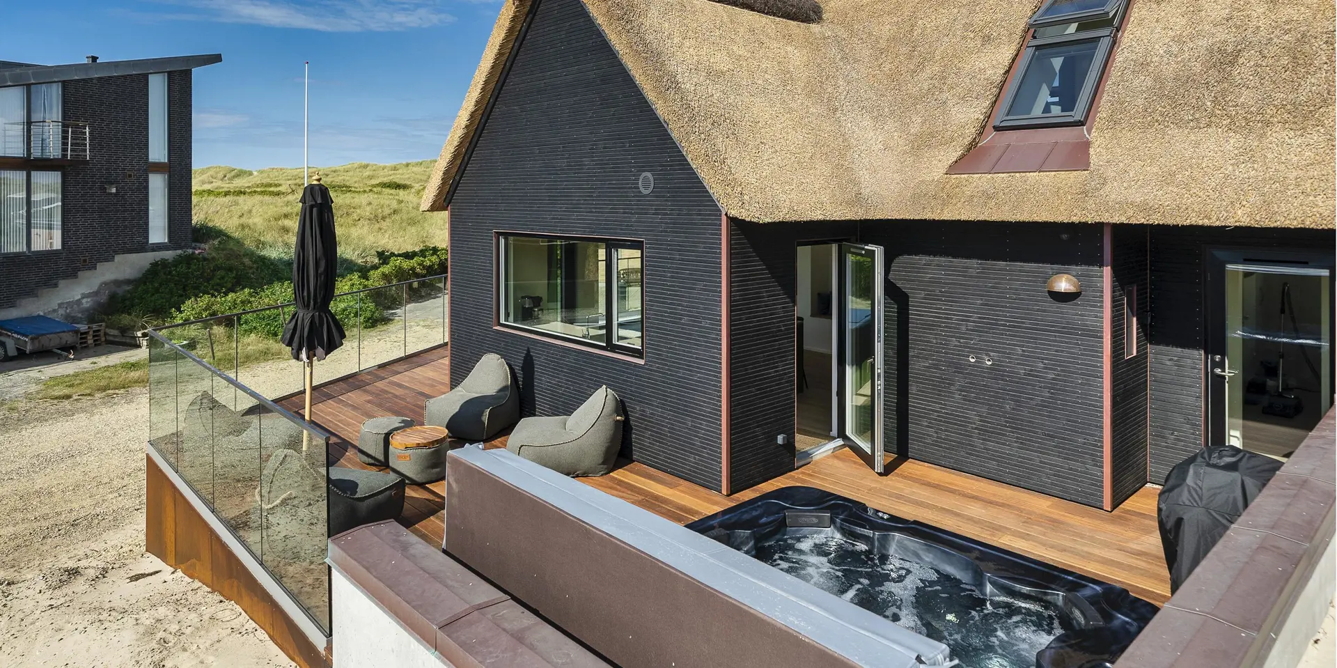 Das Ferienhaus bietet eine wunderbare Atmosphäre im modernen Stil und mit großen Panoramafenstern zum Meer. Es gibt einen Meerblick vom ersten Stock aus. Die Außenanlagen bieten wunderschöne Sonnenuntergänge, die von der großen umlaufenden Holzterrasse aus genossen werden können. Das Ferienhaus liegt auf einem Dünengrundstück und ca. 100 Meter vom Strand entfernt und in kurzer Entfernung zu Einkaufsmöglichkeiten und Restaurants.