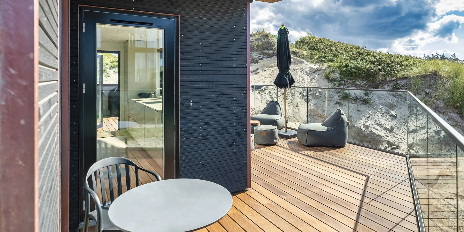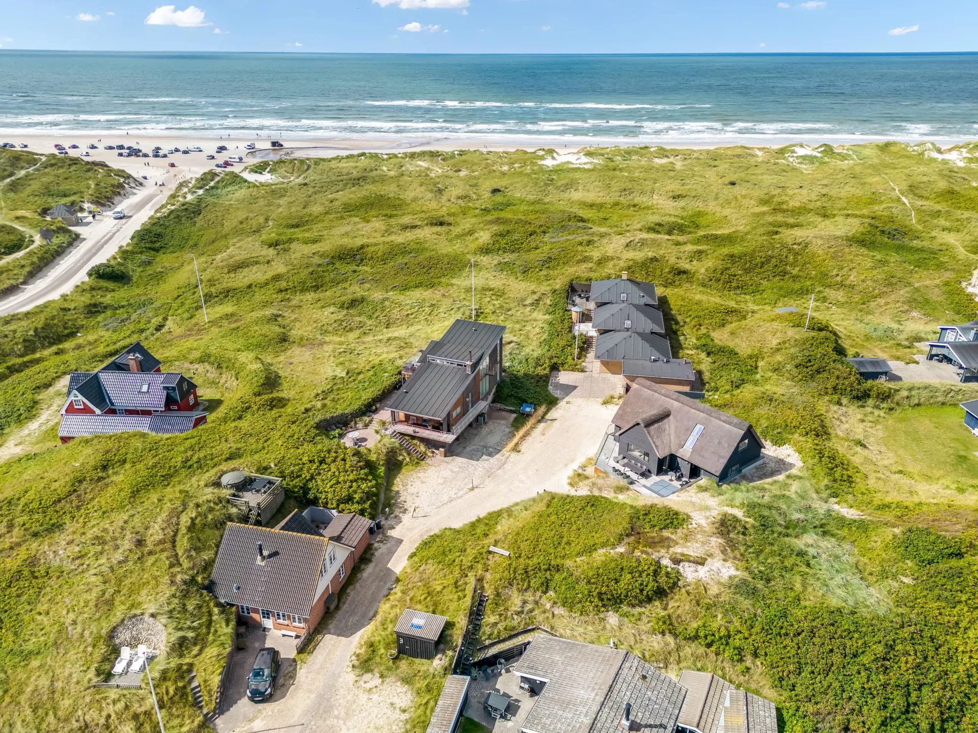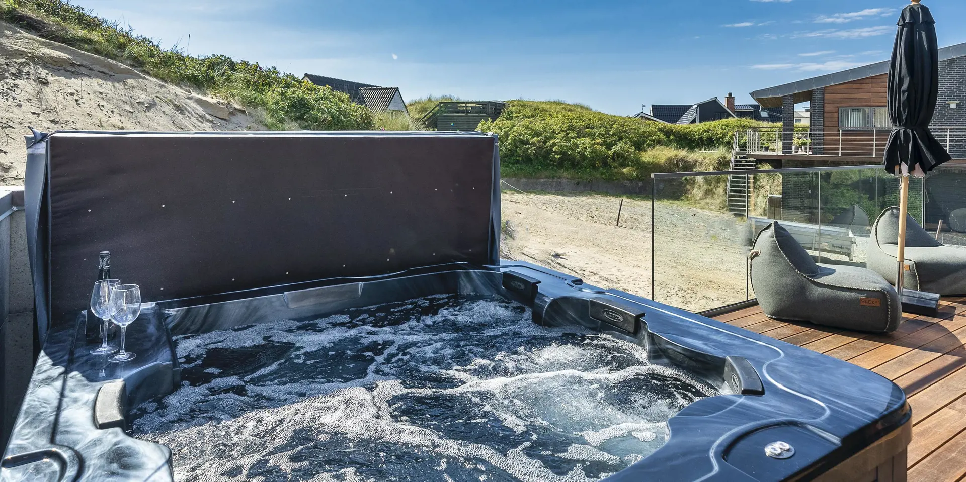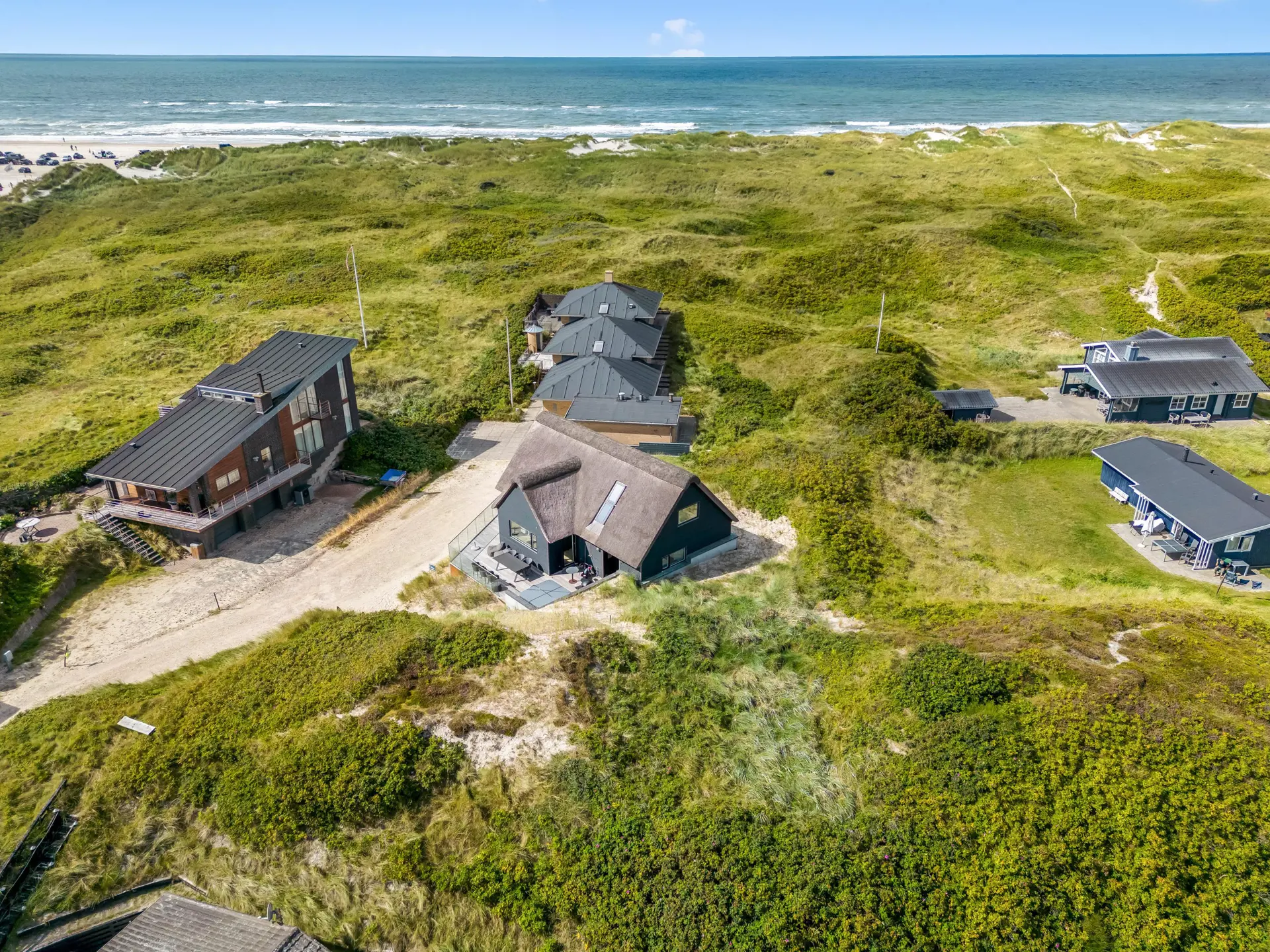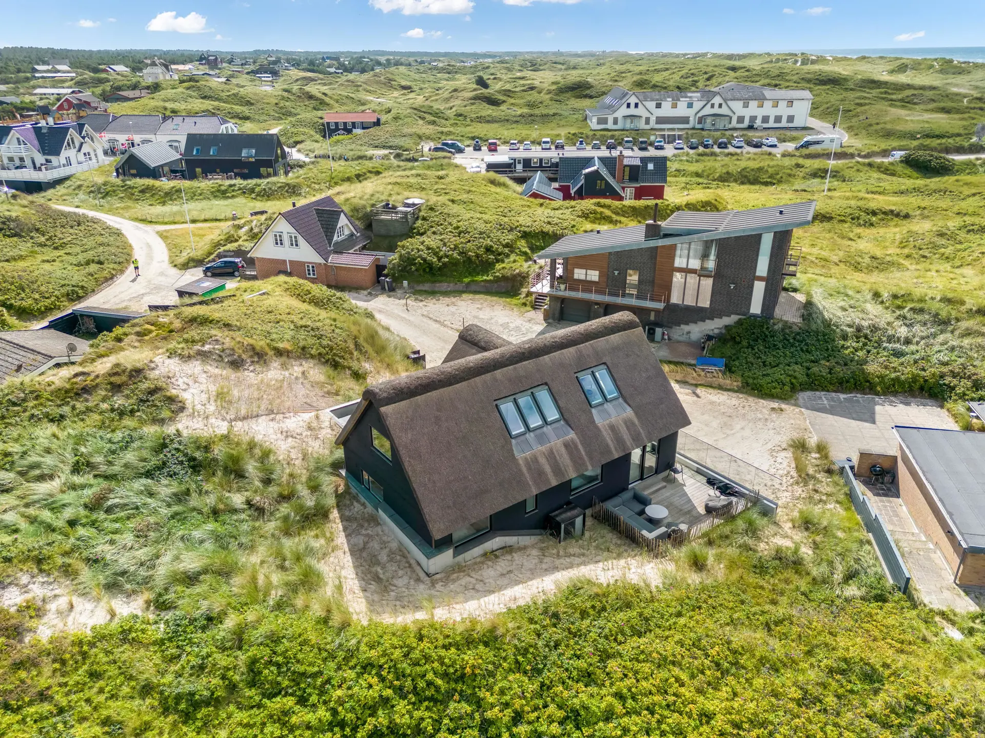 Das Ferienhaus bietet eine wunderbare Atmosphäre im modernen Stil und mit großen Panoramafenstern zum Meer. Es gibt einen Meerblick vom ersten Stock aus. Die Außenanlagen bieten wunderschöne Sonnenuntergänge, die von der großen umlaufenden Holzterrasse aus genossen werden können. Das Ferienhaus liegt auf einem Dünengrundstück und ca. 100 Meter vom Strand entfernt und in kurzer Entfernung zu Einkaufsmöglichkeiten und Restaurants.