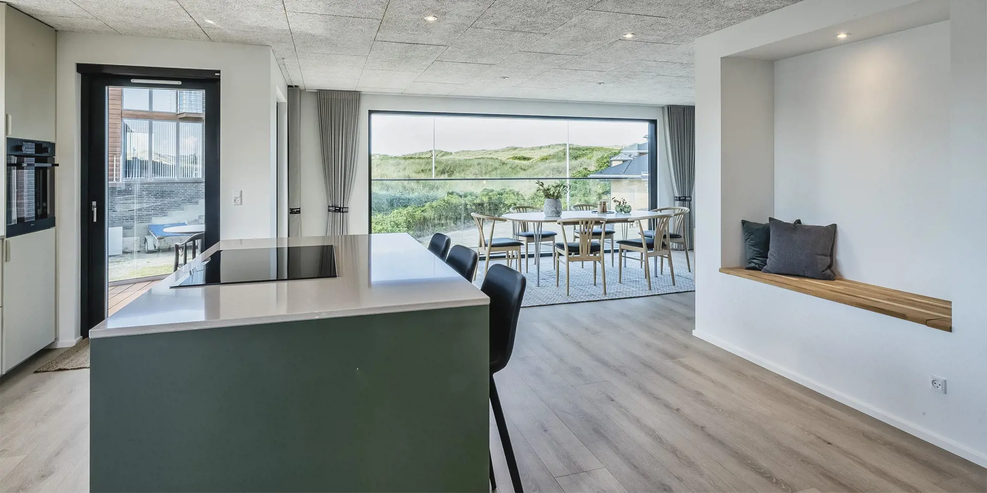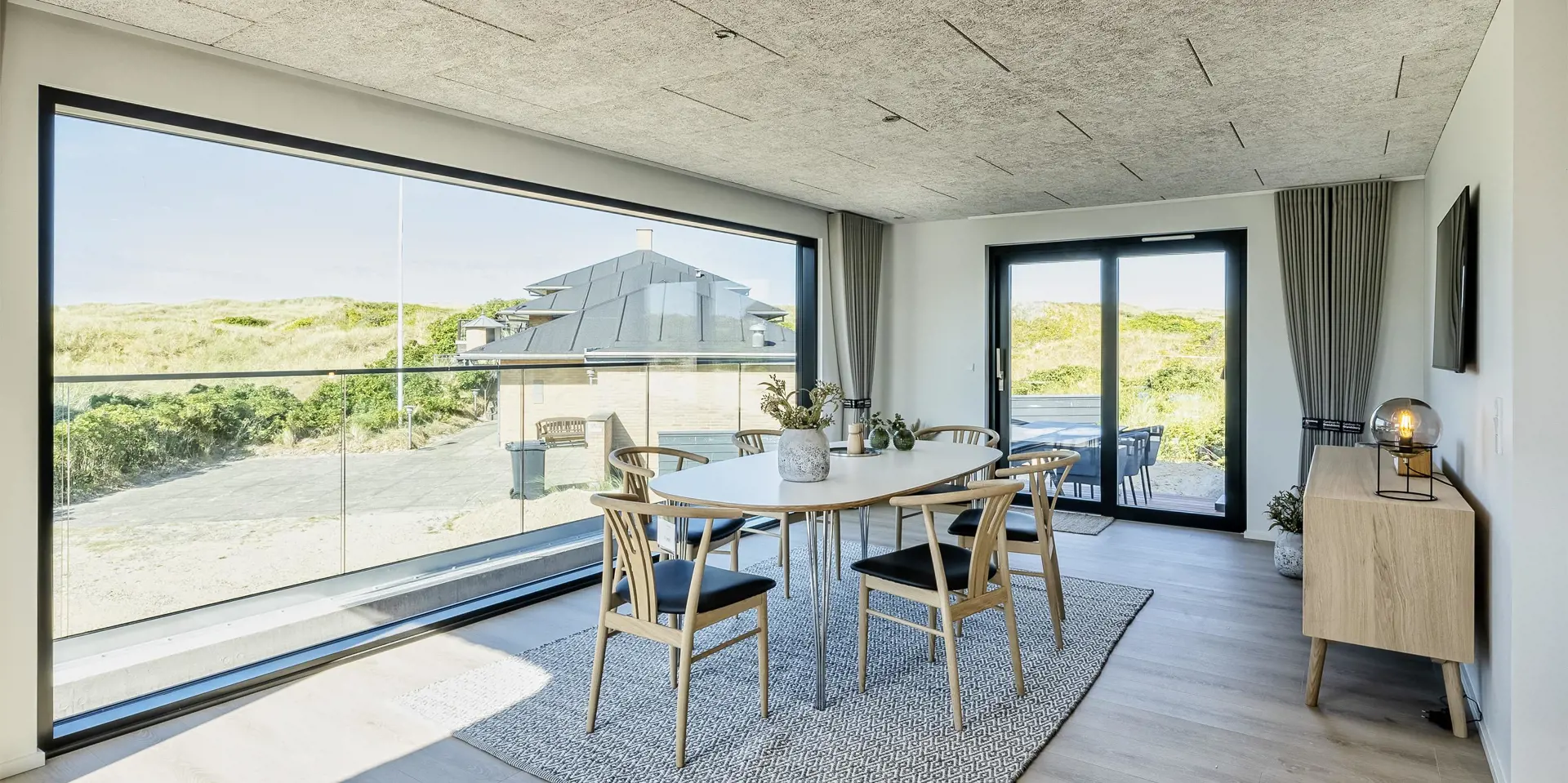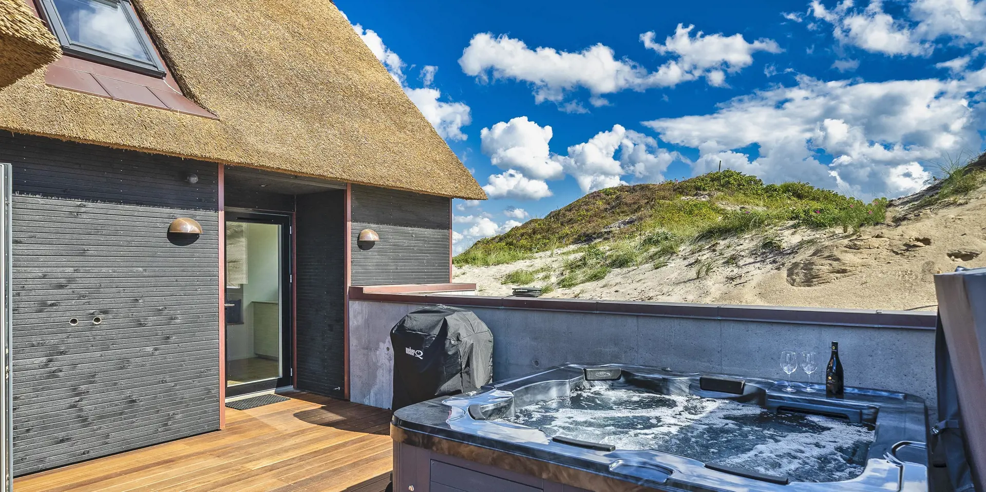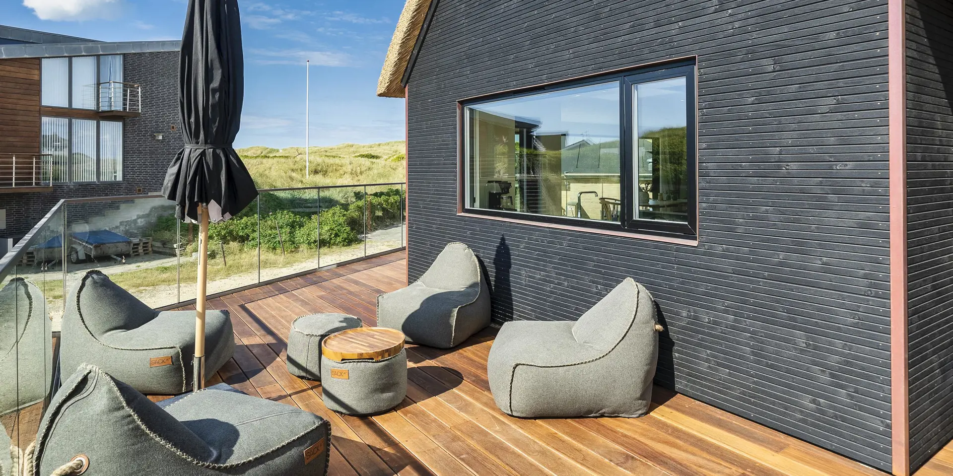 Das Ferienhaus bietet eine wunderbare Atmosphäre im modernen Stil und mit großen Panoramafenstern zum Meer. Es gibt einen Meerblick vom ersten Stock aus. Die Außenanlagen bieten wunderschöne Sonnenuntergänge, die von der großen umlaufenden Holzterrasse aus genossen werden können. Das Ferienhaus liegt auf einem Dünengrundstück und ca. 100 Meter vom Strand entfernt und in kurzer Entfernung zu Einkaufsmöglichkeiten und Restaurants.