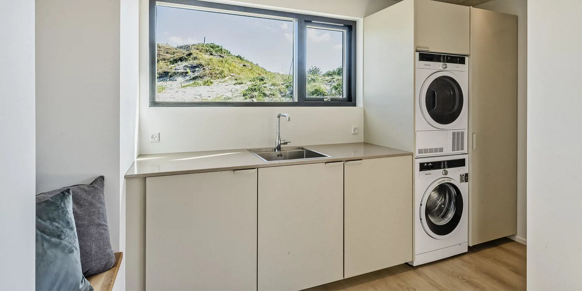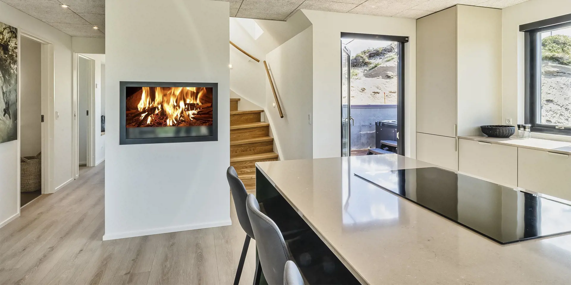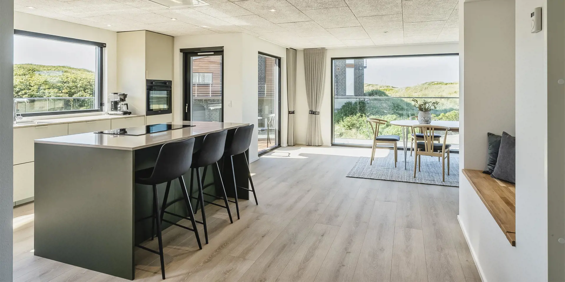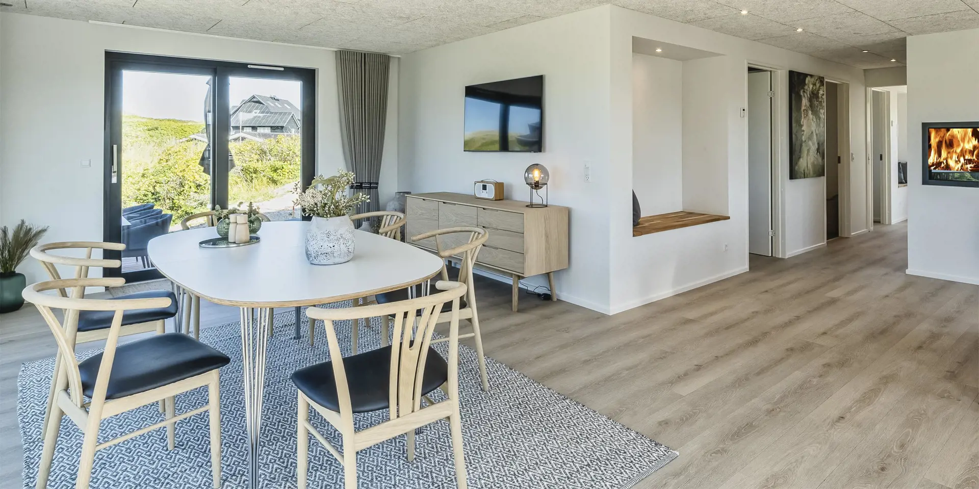 Das Ferienhaus bietet eine wunderbare Atmosphäre im modernen Stil und mit großen Panoramafenstern zum Meer. Es gibt einen Meerblick vom ersten Stock aus. Die Außenanlagen bieten wunderschöne Sonnenuntergänge, die von der großen umlaufenden Holzterrasse aus genossen werden können. Das Ferienhaus liegt auf einem Dünengrundstück und ca. 100 Meter vom Strand entfernt und in kurzer Entfernung zu Einkaufsmöglichkeiten und Restaurants.