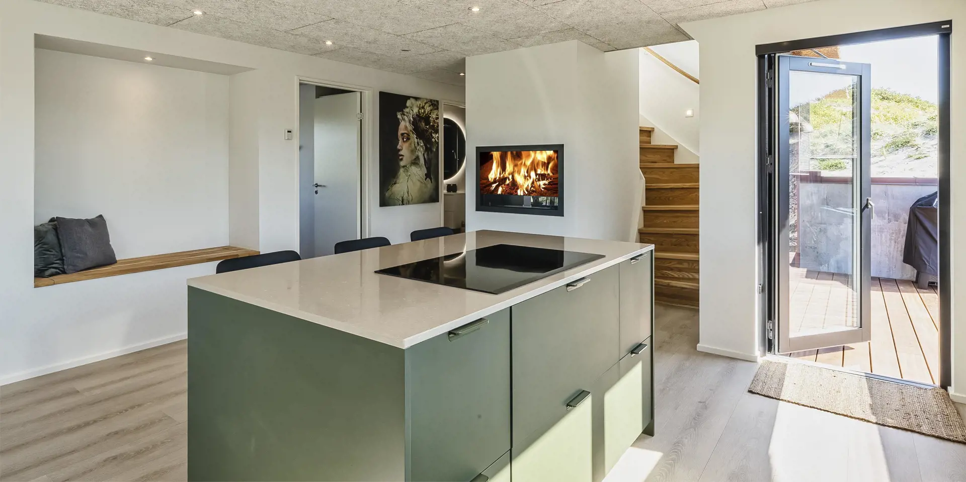 Das Haus erstreckt sich über zwei Etagen. Im Erdgeschoss befinden sich die Küche, der Eingangsbereich, der Essbereich, das Badezimmer und zwei Schlafzimmer mit je 160 x 200 cm Grösse. Der Eingangsbereich bietet viel Platz, auch im Kleiderschrank. Das Badezimmer ist mit einer Dusche, einem Handwaschbecken und einem WC ausgestattet. Eine Waschmaschine und ein Trockner sind in dem Hauswirtschaftsraum untergebracht. Die Küche ist mit allem Komfort, sowie einem Herd mit Induktionskochfeld, einem Backofen, einer Mikrowelle, einem Kühlschrank mit Gefrierfach und einer Geschirrspülmaschine ausgestattet. Im Haus befindet sich ein Bio-Kamin. Dieser Bio-Kamin darf nur mit "Bio-Ethanol" befeuert werden. Eine Flasche hierfür kann käuflich im Büro für 40,- Dkr oder 6,- € erworben werden.
