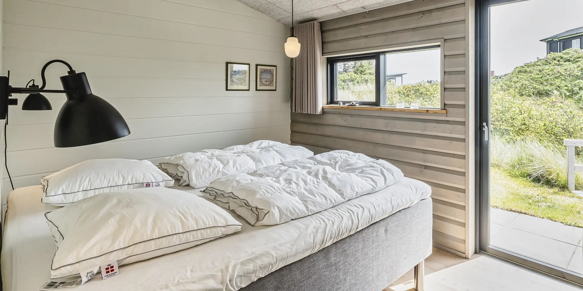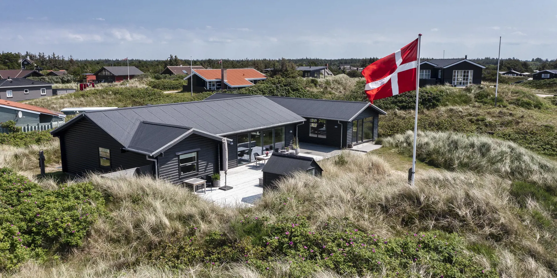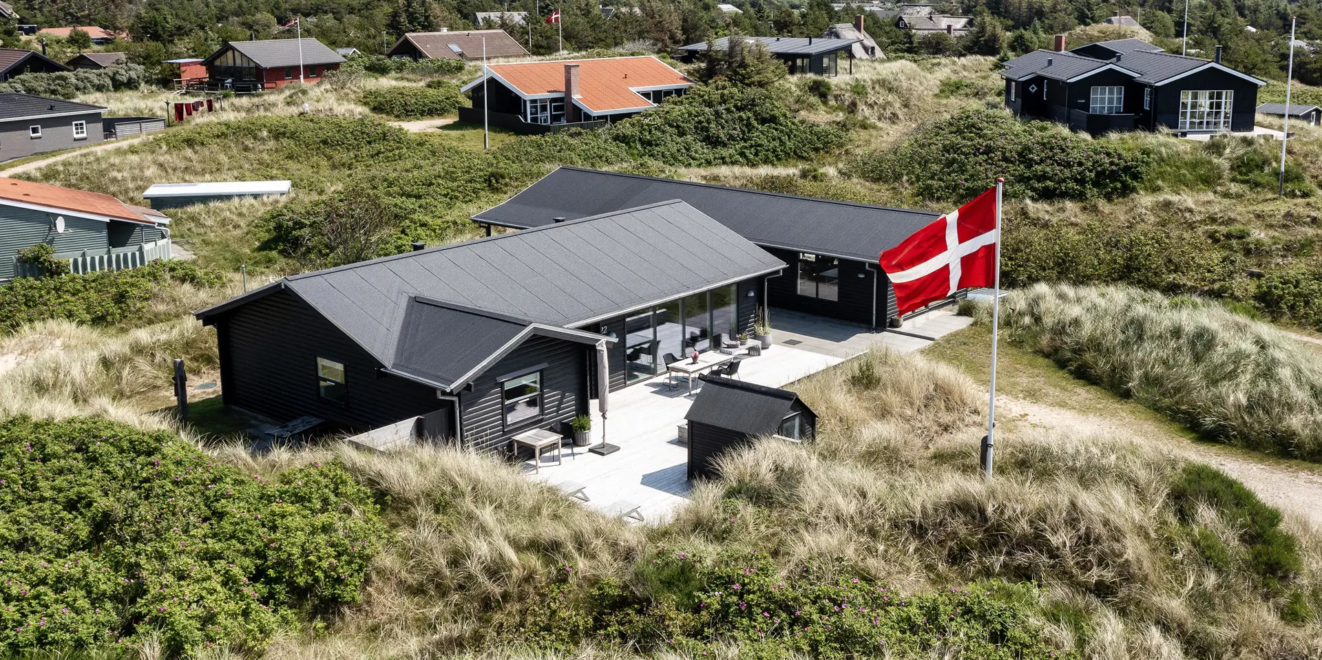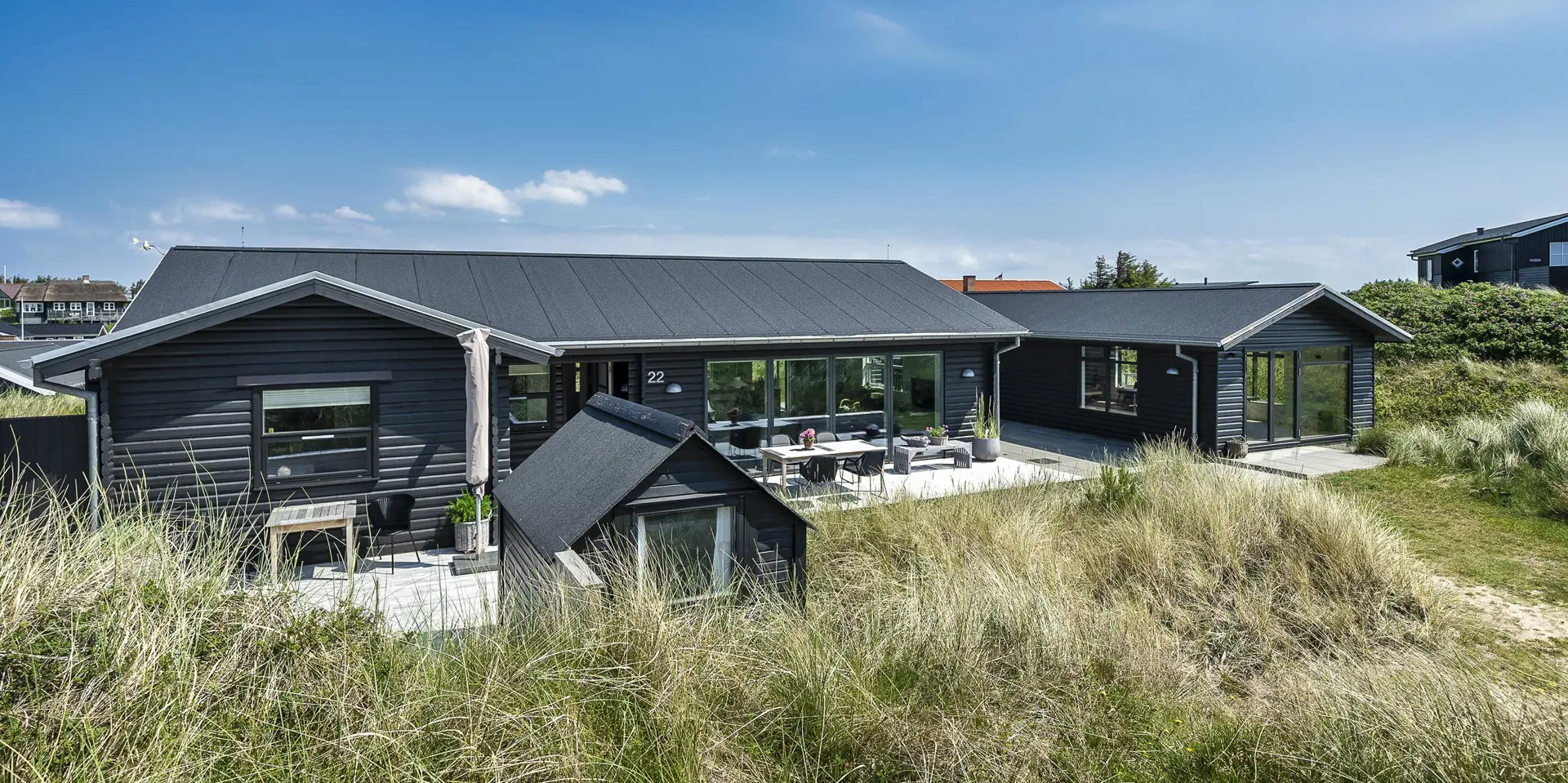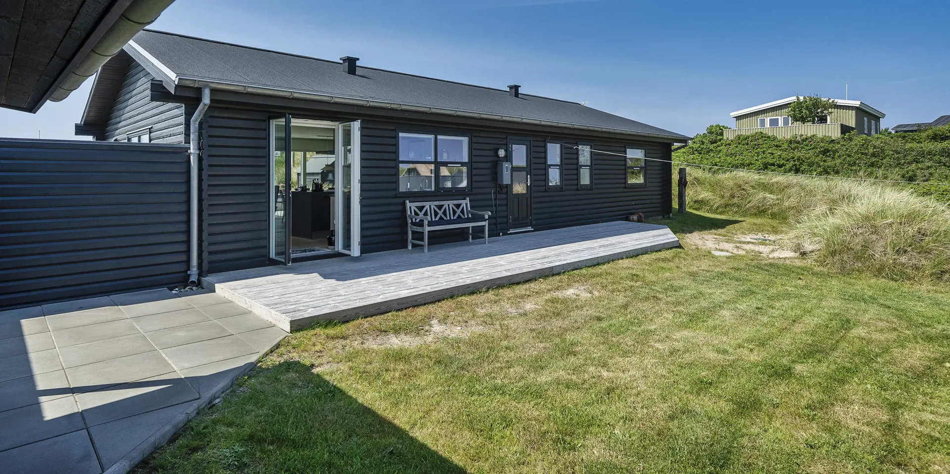 Spannendes und neurenoviertes Ferienhaus für insgesamt 8 Personen (6 Erwachsene und 2 Kindern). Das Gebäude wurde mit hochwertigen Materialien renoviert und in einem modernen und trendigen Design gestaltet, das sich gut in die Umgebung einpflegt. Das Ferienhaus liegt auf einem Dünengrundstück und der Strand ist nur Sage und Schreibe 200 Meter entfernt. Ebenso die Einkaufsmöglichkeiten und die Restaurants am Ort. Das Ferienhaus hat eine gesamte Wohnfläche von 185 m2 und ist in ein Haupthaus und Gästehaus aufgeteilt. Das Ferienhaus spendet eine großartige Atmosphäre im modernen und nordischen Stil. Der Eingangsbereich ist großzügig gehalten und verfügt wie ein Hauswirtschaftsraum über ein Handwaschbecken mit Ablagefläche. Ebenfalls ist hier die Waschmaschine untergebracht. Der Essbereich und das Wohnzimmer sind mit der Küche offengehalten. Der Wohnbereich verfügt über große Panoramafenster und wirkt daher sehr lichtdurchflutet. Das Fernsehprogramm empfangen Sie über Stofa, daher sind nur 5-8 deutsche Fernsehprogramme zu empfangen. Hier im Wohnbereich gibt es zusätzlich eine Warmepumpe. Mit dieser Warmepumpe können Sie die Stromkosten senken, da sie energiesparend ist. Die Küche ist modern und mit vielem Komfort ausgestattet. Sie beinhaltet einen Kochinsel, wo sich der Herd mit Ceranfeld, eine Dunstabzugshaube und der Backofen befindet. Gegenüber ist dann die Einbauküche mit Spüle, Geschirrspülmaschine, einer Mikrowelle und einer Kühl- und Gefrierkombination. Insgesamt gibt es vier Schlafzimmer im Ferienhaus. Zwei davon befinden sich im Haupthaus: DB + DB + DB + 2B. Ein großes Masterbadezimmer mit Handwaschbecken mit großer Ablagefläche, WC und Dusche steht den Gästen zur Verfügung.