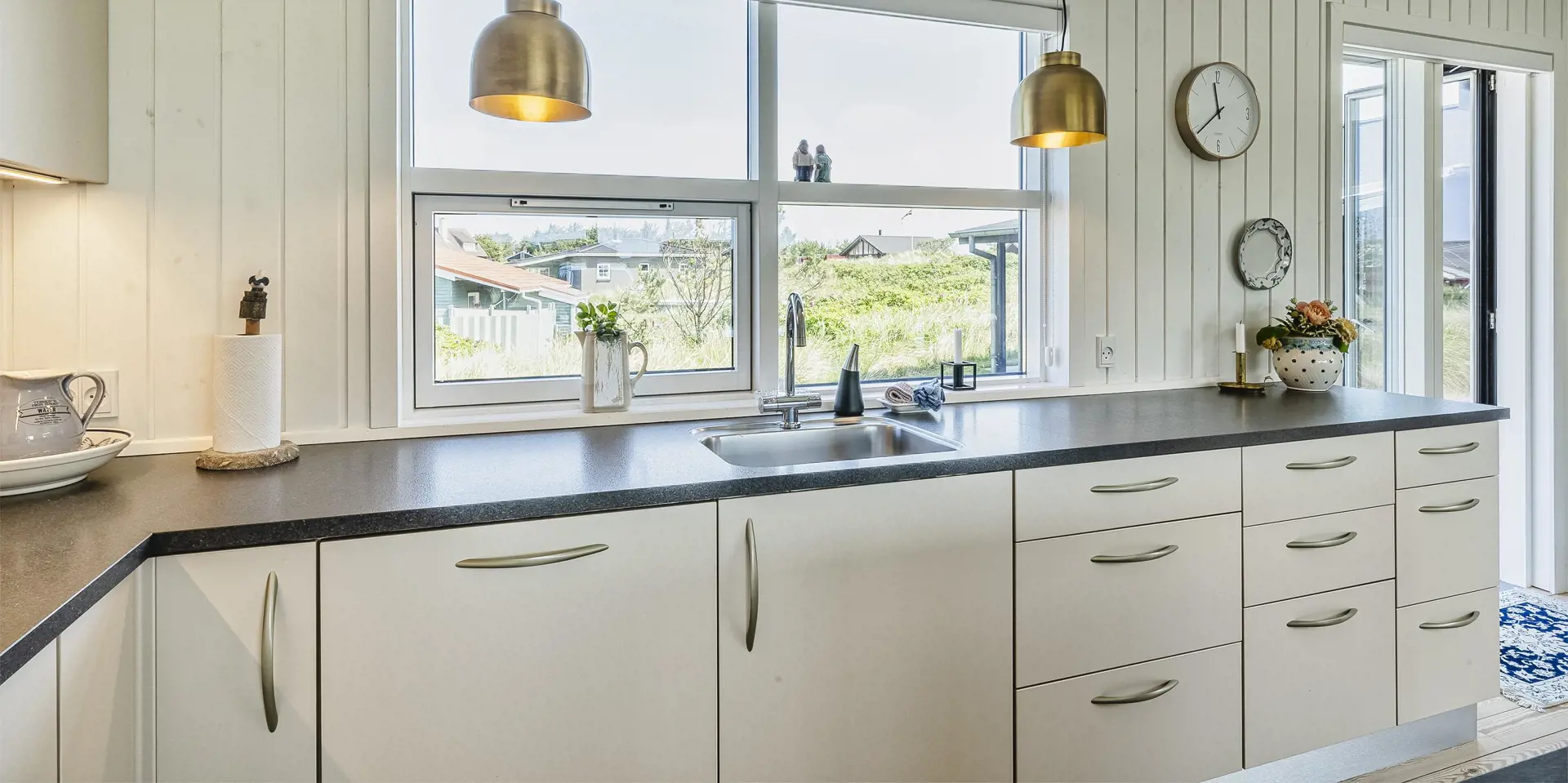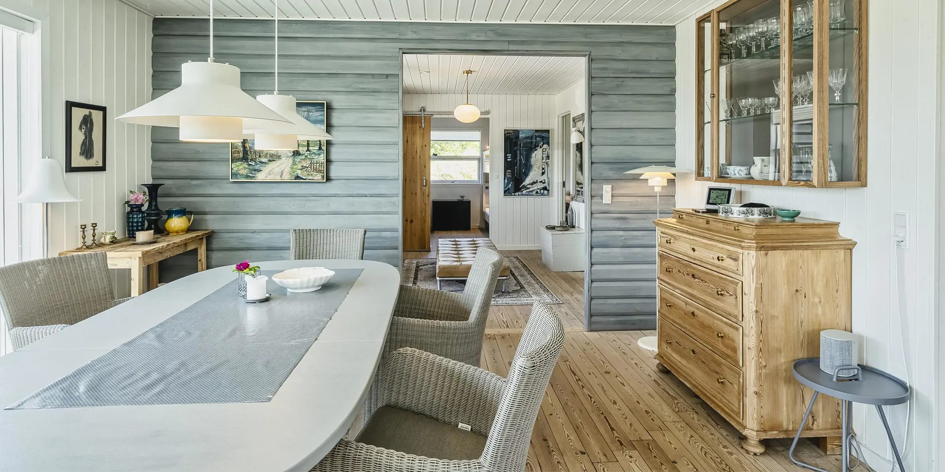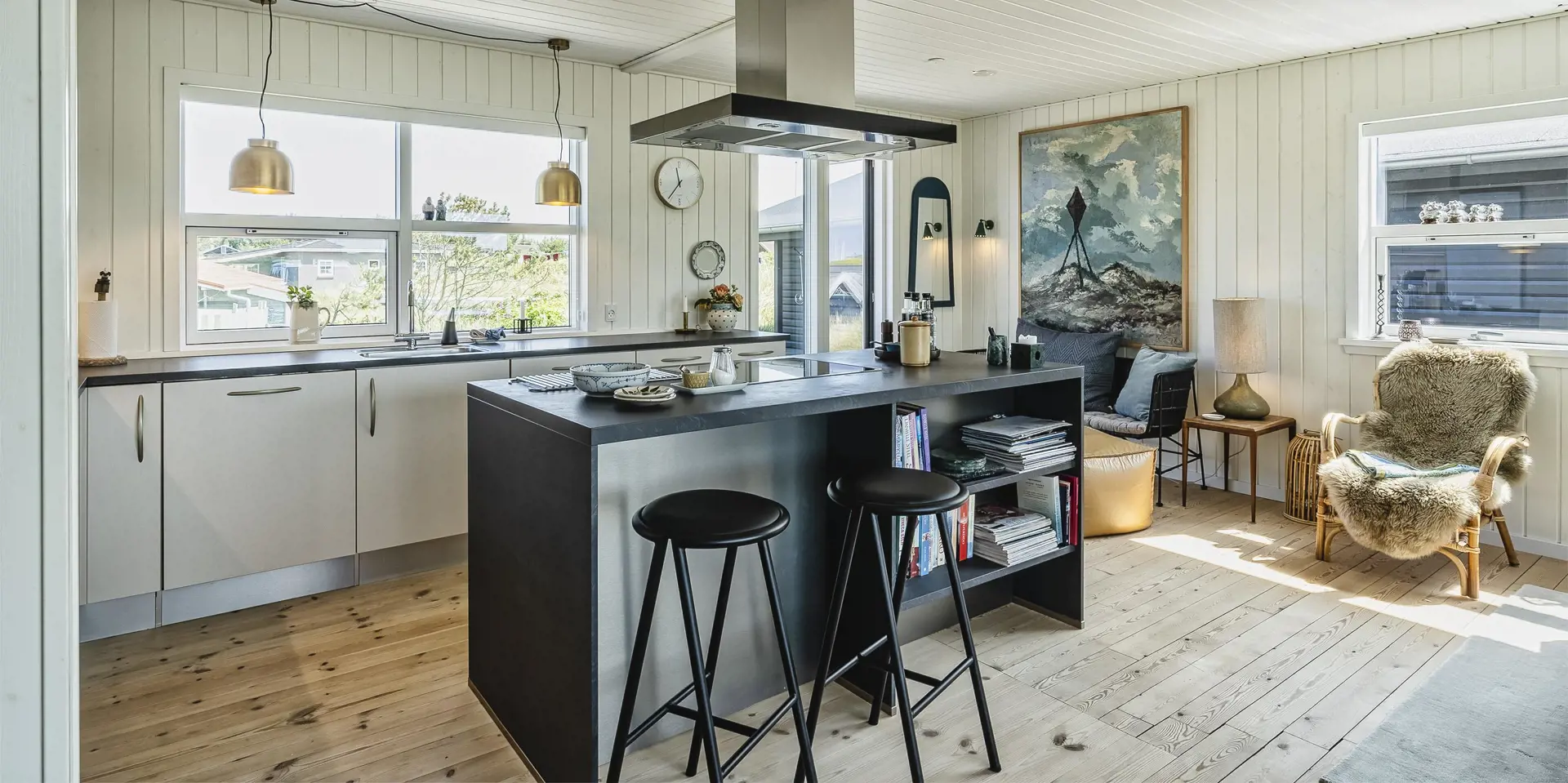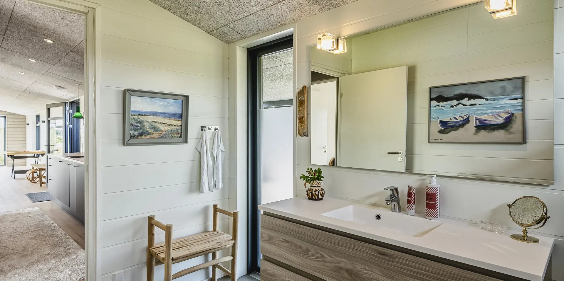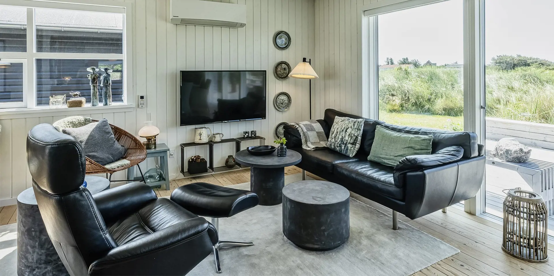 Spannendes und neurenoviertes Ferienhaus für insgesamt 8 Personen (6 Erwachsene und 2 Kindern). Das Gebäude wurde mit hochwertigen Materialien renoviert und in einem modernen und trendigen Design gestaltet, das sich gut in die Umgebung einpflegt. Das Ferienhaus liegt auf einem Dünengrundstück und der Strand ist nur Sage und Schreibe 200 Meter entfernt. Ebenso die Einkaufsmöglichkeiten und die Restaurants am Ort. Das Ferienhaus hat eine gesamte Wohnfläche von 185 m2 und ist in ein Haupthaus und Gästehaus aufgeteilt. Das Ferienhaus spendet eine großartige Atmosphäre im modernen und nordischen Stil. Der Eingangsbereich ist großzügig gehalten und verfügt wie ein Hauswirtschaftsraum über ein Handwaschbecken mit Ablagefläche. Ebenfalls ist hier die Waschmaschine untergebracht. Der Essbereich und das Wohnzimmer sind mit der Küche offengehalten. Der Wohnbereich verfügt über große Panoramafenster und wirkt daher sehr lichtdurchflutet. Das Fernsehprogramm empfangen Sie über Stofa, daher sind nur 5-8 deutsche Fernsehprogramme zu empfangen. Hier im Wohnbereich gibt es zusätzlich eine Warmepumpe. Mit dieser Warmepumpe können Sie die Stromkosten senken, da sie energiesparend ist. Die Küche ist modern und mit vielem Komfort ausgestattet. Sie beinhaltet einen Kochinsel, wo sich der Herd mit Ceranfeld, eine Dunstabzugshaube und der Backofen befindet. Gegenüber ist dann die Einbauküche mit Spüle, Geschirrspülmaschine, einer Mikrowelle und einer Kühl- und Gefrierkombination. Insgesamt gibt es vier Schlafzimmer im Ferienhaus. Zwei davon befinden sich im Haupthaus: DB + DB + DB + 2B. Ein großes Masterbadezimmer mit Handwaschbecken mit großer Ablagefläche, WC und Dusche steht den Gästen zur Verfügung.