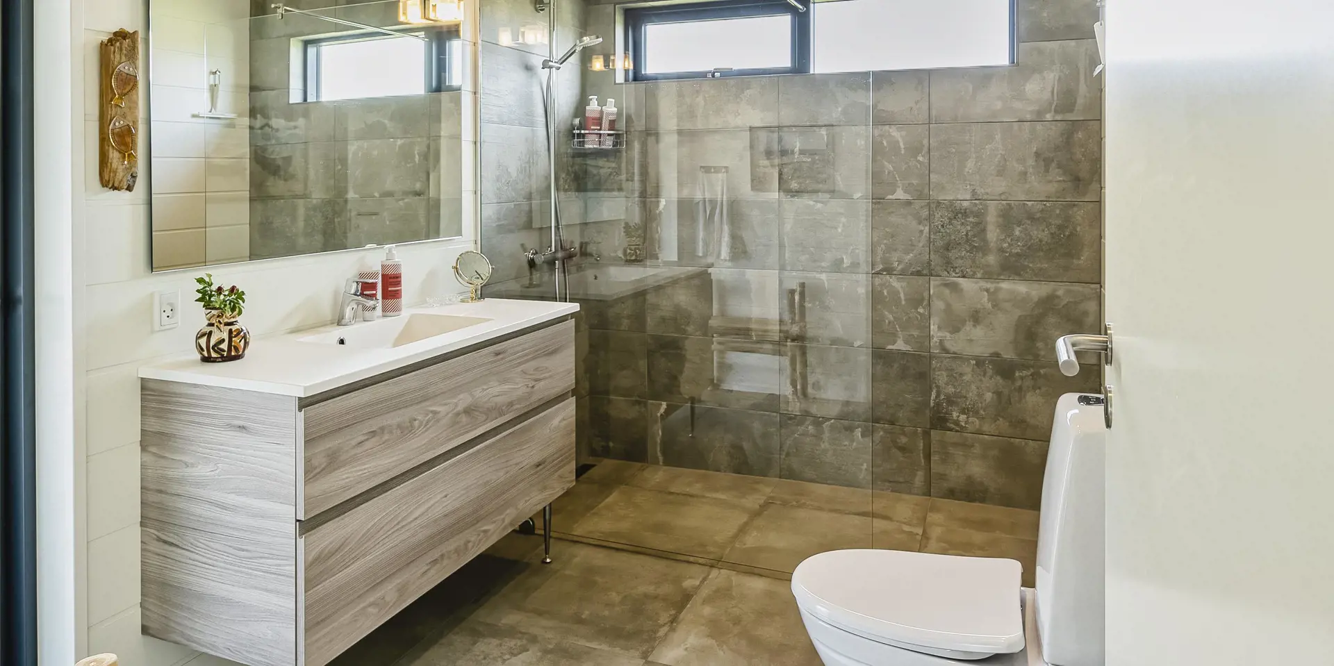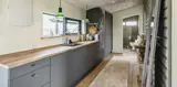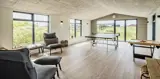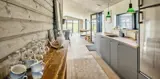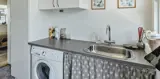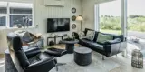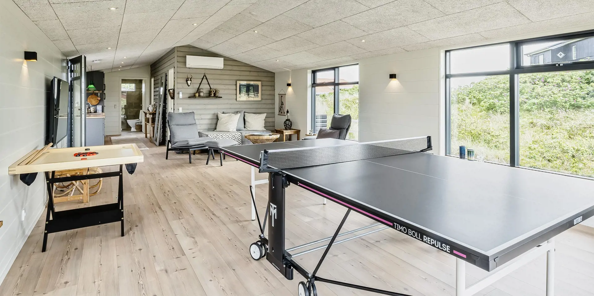 Das Gästehaus verfügt über weitere zwei Schlafzimmer mit je einem Doppelbett (1x 180 x 200 und 1 x 160 x 200 cm). Auch hier befindet sich ein weiteres Badezimmer mit Handwaschbecken, WC und Dusche. Zusätzlich ist hier auch eine Warmepumpe installiert, die genau wie im Haupthaus für Stromkosten sorgen kann. Der große Aktivitätsraum beinhaltet eine Tischtennisplatte, ein „Bop-bord“ und ein TV mit Chrome-Cast und eine weitere Teeküche/Einbauküche mit Spüle und einer Kühl- und Gefrierkombination.