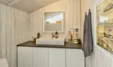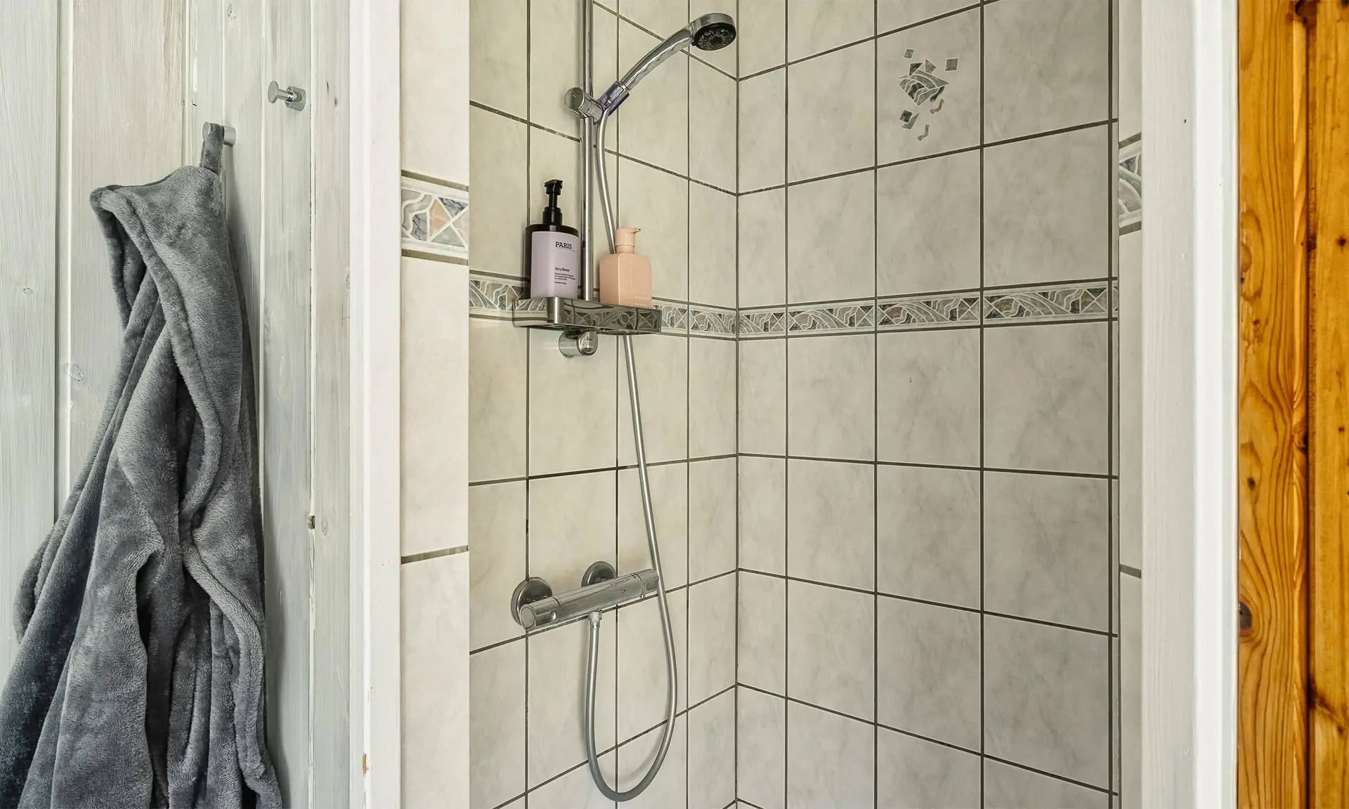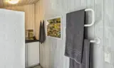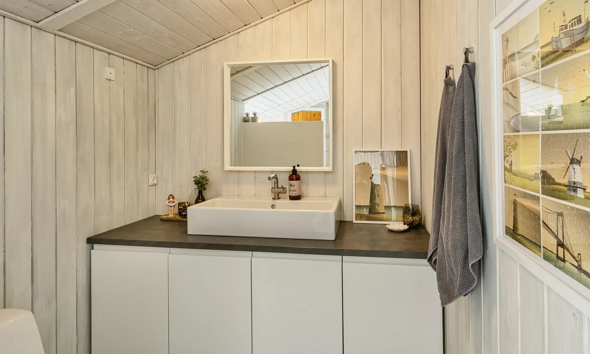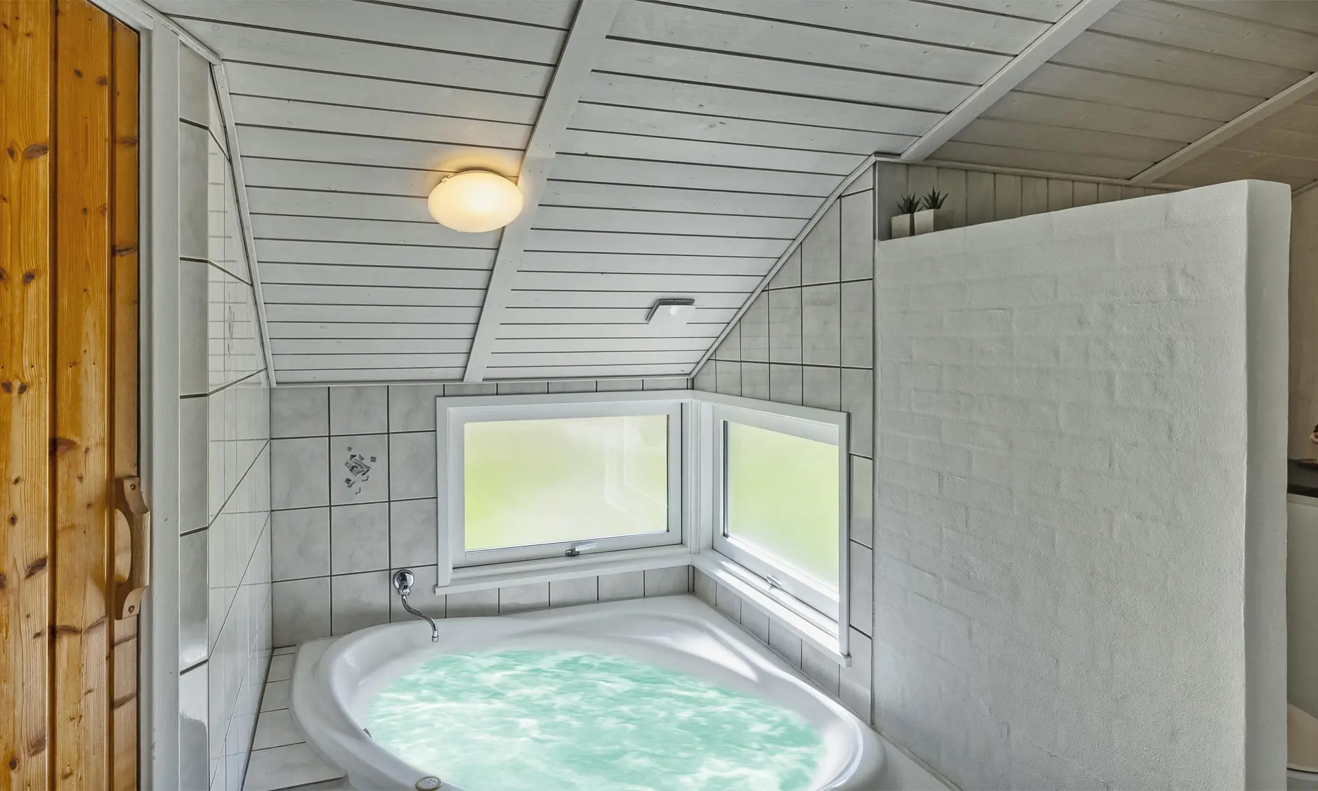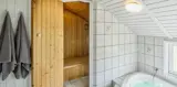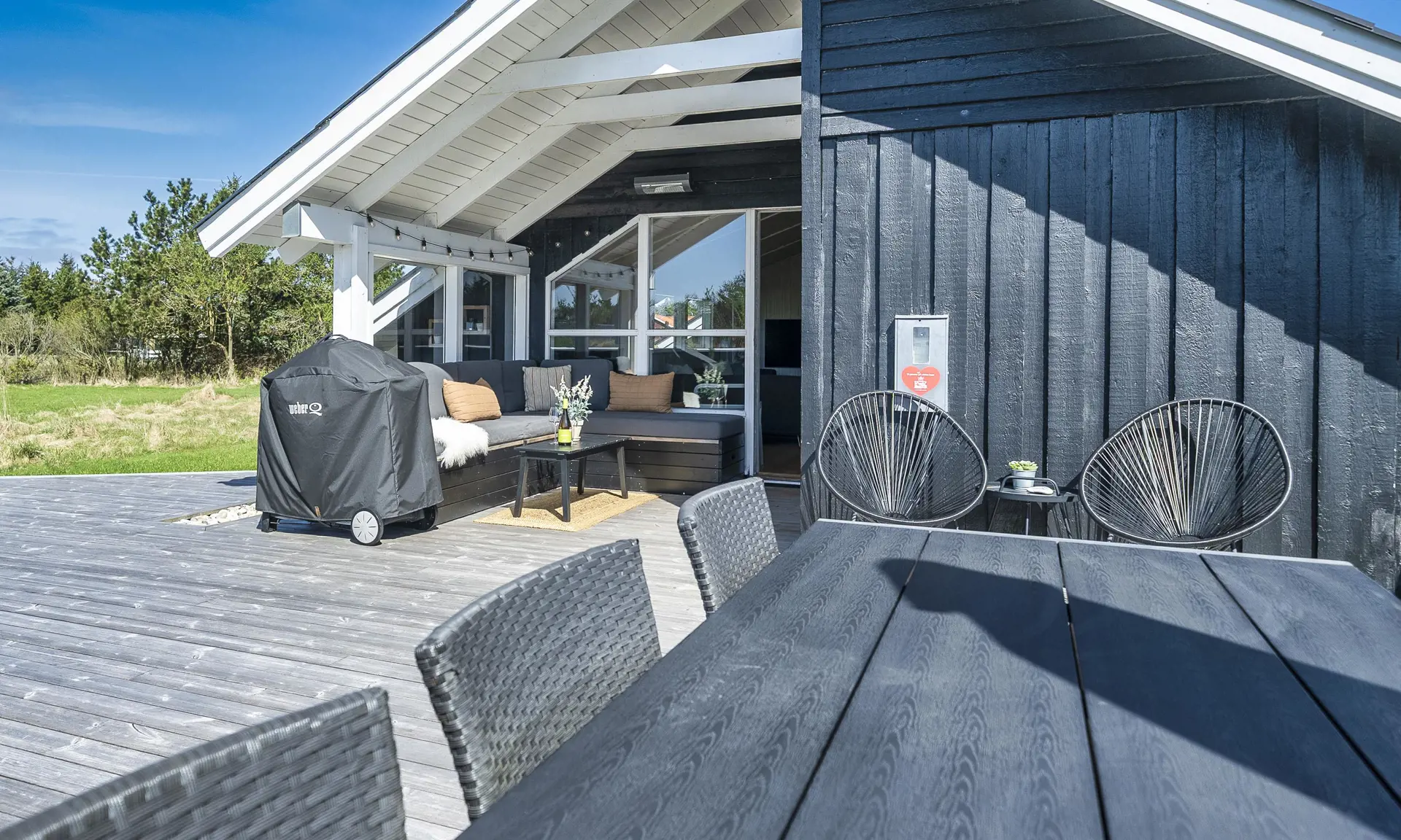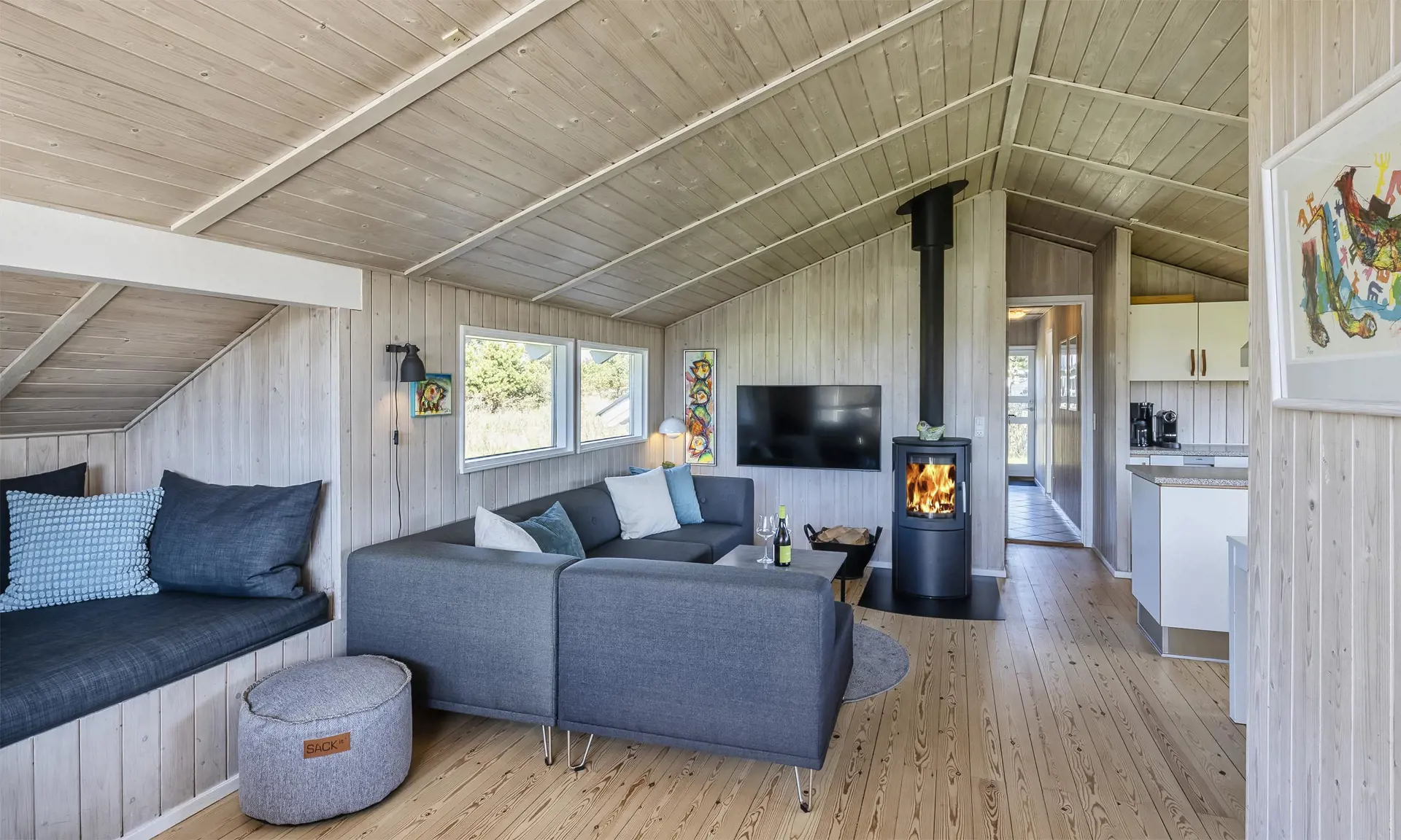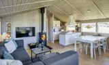 Eingang mit einer kleinen Garderobe. Schönes großes Badezimmer mit Fußbodenheizung, Sauna und Whirlpool mit Platz für 2 Personen. Kombinierte Waschmaschine und Trockner sind vorhanden. Der große Raum ist hell und freundlich und durch die vielen Fenster hat man einen guten Blick auf die schöne Anlage. Vom Aufenhaltsraum aus gibt es einen direkten Zugang zur Holzterrasse, die fast zu einem natürlichen Teil des Hauses wird. Wohnküche, die in das Wohnzimmer integriert ist und mit einem guten Essbereich ausgestattet. Die Küche selbst ist mit allem Komfort wie einem Geschirrspüler, einem Backofen, einem Induktionsherd, einer Mikrowelle, einer Dunstabzugshaube und einer Kühl- und Gefrierkombination ausgestattet. Das Wohnzimmer selbst verfügt über eine Sofaecke und eine supergemütliche Kuschelnische. Außerdem gibt es einen Kaminofen und natürlich einen Fernseher mit Apple TV. Das Ferienhaus verfügt auch über einen Internetanschluss (WLAN). Das Haus verfügt insgesamt über drei Schlafzimmer: DB + DB + 2B. Auf der großen Holzterrasse gibt es einen guten Gasgrill, einen Esstisch, Sonnenliegen und zwei gemütliche Loungebereiche, von denen einer überdacht ist und über einen Terrassenheizer verfügt.