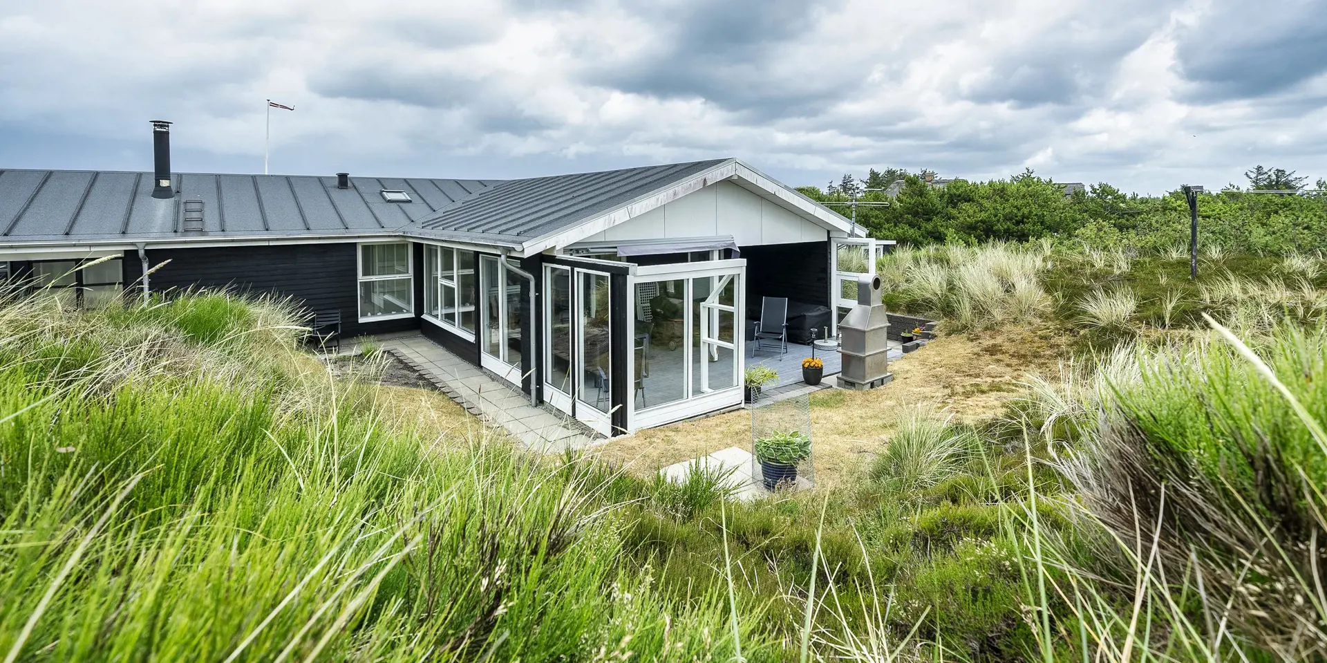 Schöne Terrassenumgebung mit Gartenmöbeln und Gasgrill. Außerdem gibt es auch noch einen großen Außengrill auf dem einen Terrassenbereich. Auf dem Terrassenbereich auf der hinteren Seite des Ferienhauses können die Tage von morgens bis abends genossen werden. Auf einer kleinen Düne befindet sich eine Sitzgelegenheit, wo Sie den Blick über das Sommerhausgebiet schweifen lassen können. Hier genießen Sie mit einem Gläschen Wein den tollen Blick oder gönnen sich einfach mit der Kaffeetasse eine kleine Pause. Eine Garage für kleineres Auto (4,3 Meter) wird ebenfalls geboten. Das Ferienhaus wurde im Jahr 1973 erbaut und zuletzt 2008 renoviert.