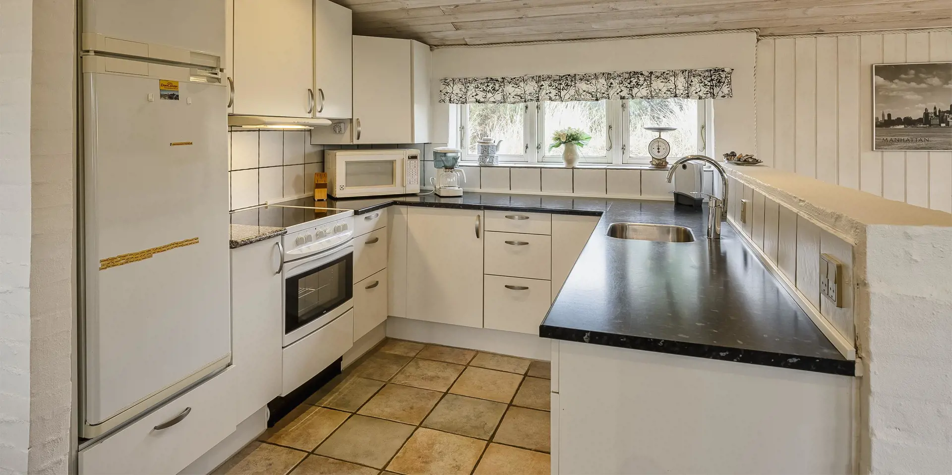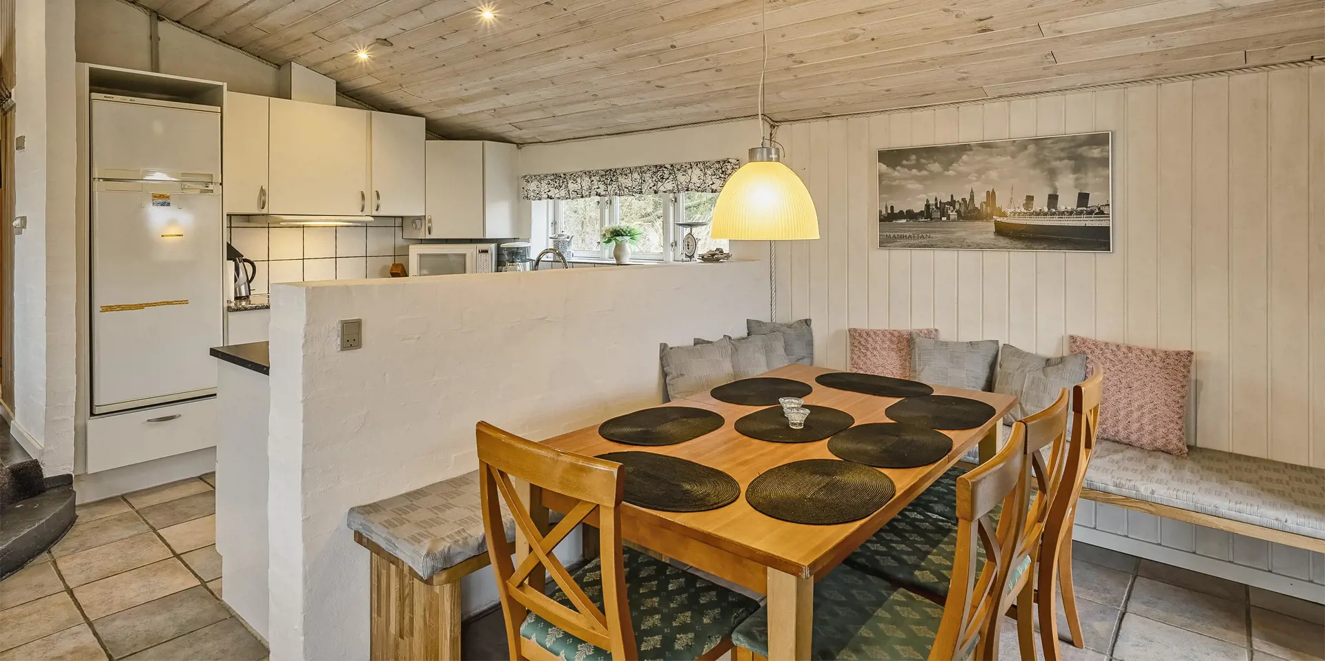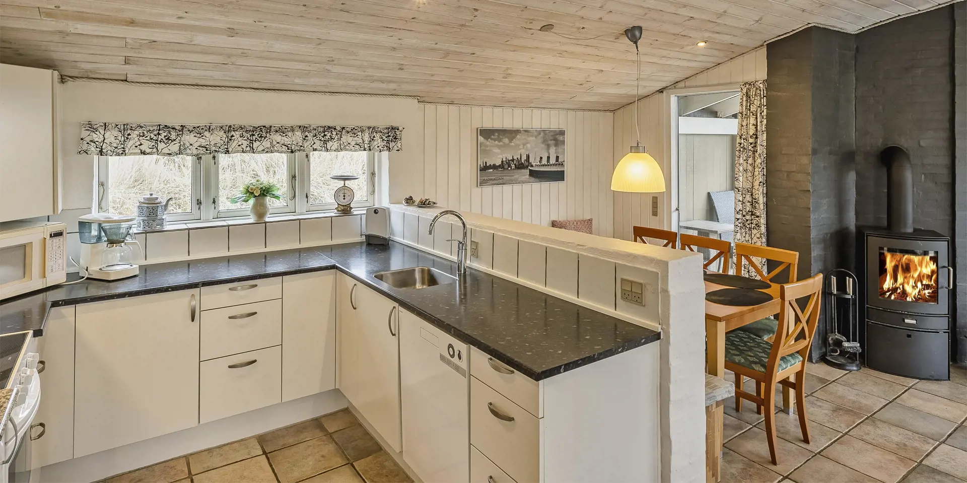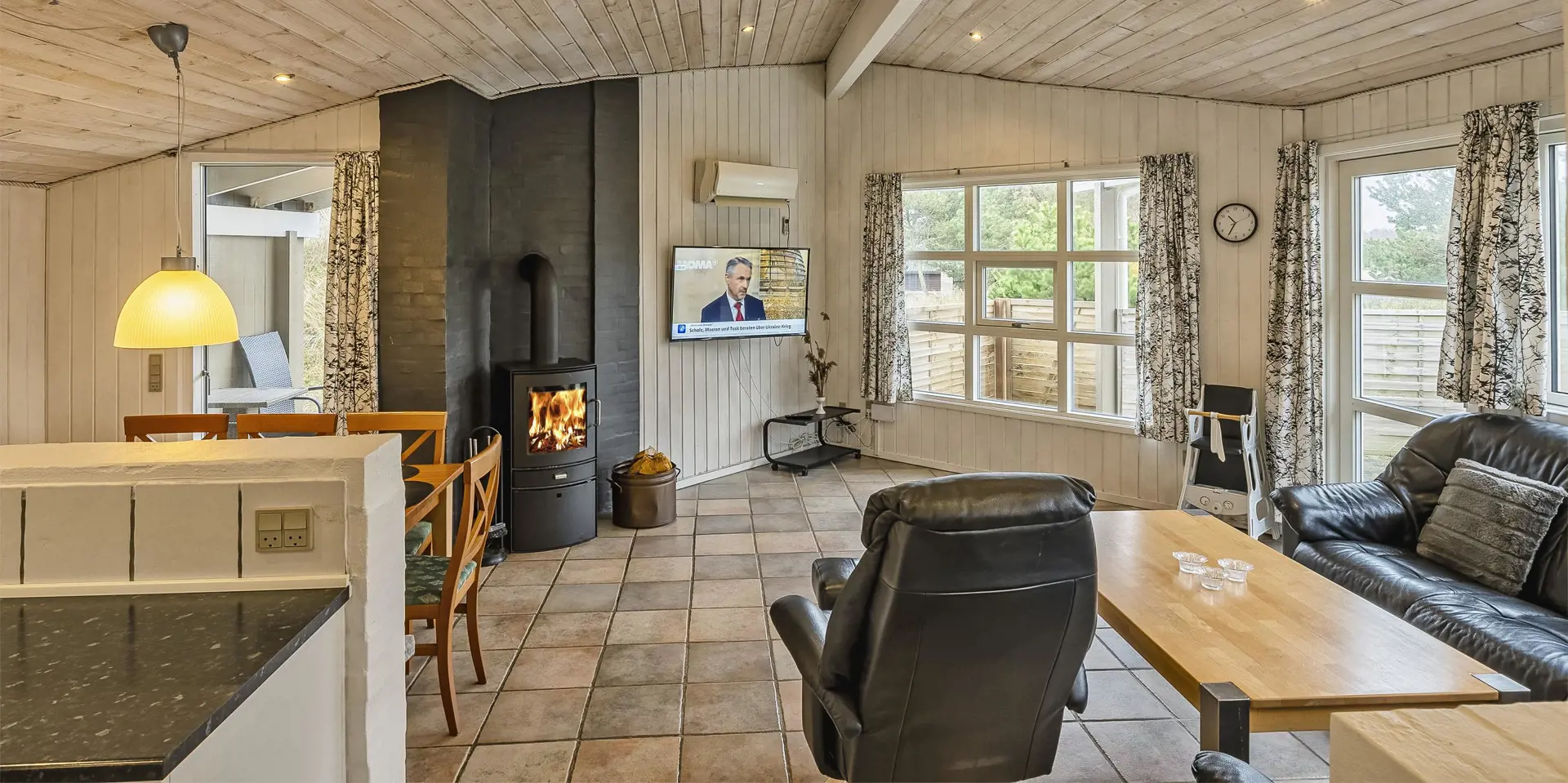 Der Eingangsbereich des Ferienhauses ist gefliest und bietet reichlich Platz für Ihre Garderobe und das Schuhwerk. Vom Eingangsbereich kommt man dann über 2 Stufen in den Wohn- und Essbereich, dieser ist auch mit der Küche offengehalten. Am Ende des Wohn- und Essbereiches ist der Kamin aufgestellt. Von der gemütlichen Sofaecke haben Sie direkten Blick auf den Kamin. Eine Tasse Kaffee oder am Abend ein Gläschen Wein bringt eine „hyggelige“ Atmosphäre. Zusätzlich befindet sich eine Wärmepumpe im Ferienhaus. Mit dieser Wärmepumpe haben Sie die Möglichkeit die Heizkosten zu senden, da sie energiesparend ist. Das deutsche Fernsehprogramm empfangen Sie über eine Parabolantenne. Des weiteren befindet sich Boxer-TV im Haus. Das Haus hat Internetzugang (W-Lan). Die Küche ist recht gut ausgestattet und verfügt über einen Herd mit Ceranfeld, einem Backofen, einer Geschirrspülmaschine, einer Mikrowelle und einer Kühl- und Gefrierkombination. Ein Badezimmer mit einem Handwaschbecken, einem WC, einer Dusche und einem Whirlpool. Die Waschmaschine ist ebenfalls in diesem Bad untergebracht und steht auf einem Sockel, so dass ein Entleeren der Maschine rückenfreundlich von Statten gehen kann. Das Ferienhaus verfügt über drei Schlafzimmer. DB + 2B + 2B. Das eine Schlafzimmer mit einem Doppelbett hat eine weitere Stufe von ca. 25 cm. Im Wohn- und Essbereich, im Eingangsbereich, im Bad und auch in der Küche befindet sich eine Fußbodenheizung. Das Ferienhaus ist im Jahre 2000 erbaut worden. Es sind max. 2 Haustiere erlaubt. Das Rauchen im Ferienhaus ist nicht gestattet.