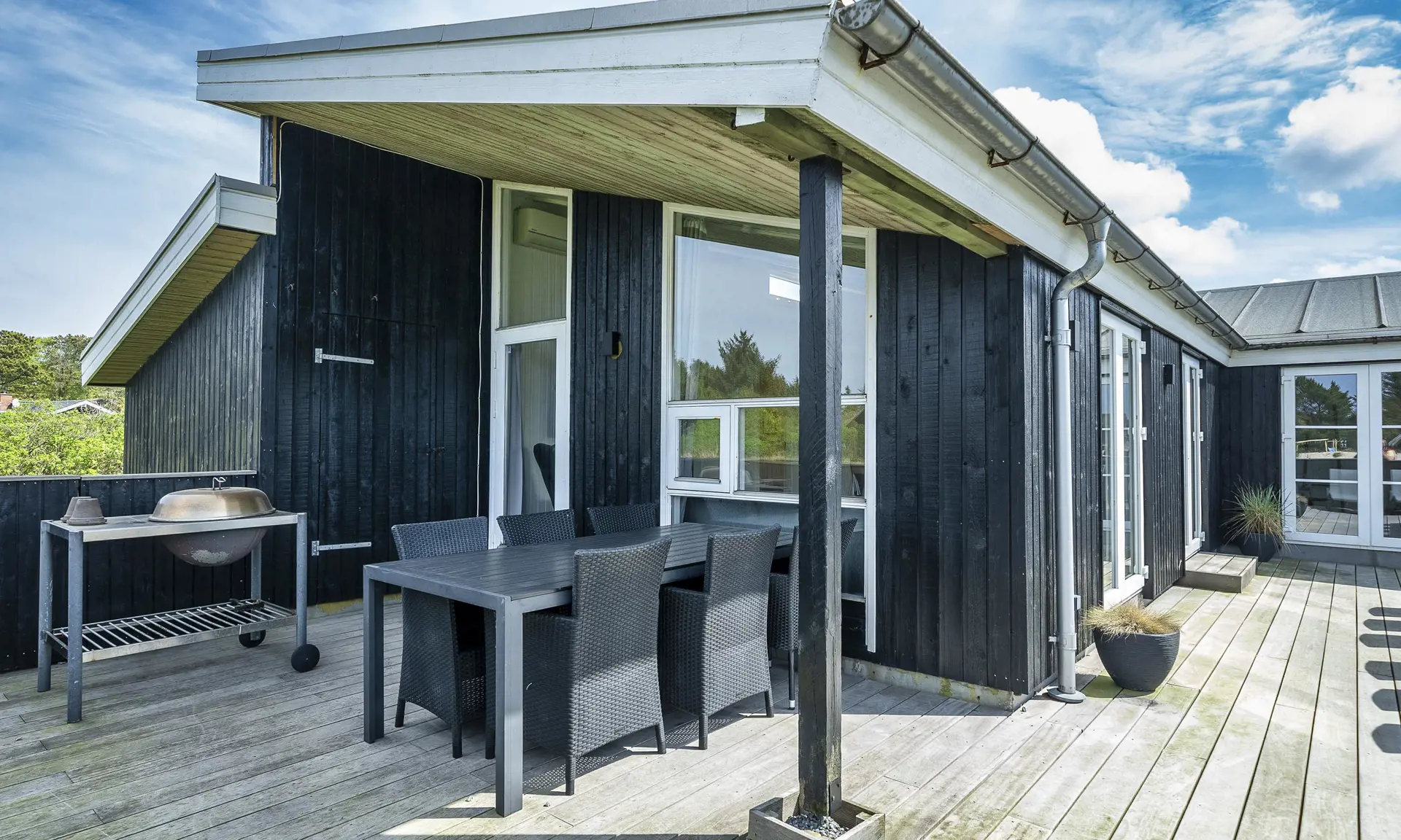 Neu renoviertes Aktivitätshaus mit Innenpool und Sauna. Das Ferienhaus befindet sich auf einem schönen großzügigen Naturgrundstück in direkter Waldrandlage. Auf seinen 190m2 Wohnfläche haben alle 10 Gäste reichlich Platz. Der Strand befindet sich ca. 850 Meter vom Haus entfernt. Der offene Wohn- und Essbereich ist freundlich und heller Ausstattung. Gemütliches Wohnsofa und großer Esstisch vorhanden. Smart-TV mit dänischen und deutschen Kanälen und der Möglichkeit zum Streamen und auch DVD-Abspielgerät befinden sich hier im Wohnbereich. Ein Kaminofen ist ebenfalls hier im Wohn- und Essbereich aufgestellt. Dieser strahlt eine gemütliche wohlige Wärme aus und man hat einen direkten Blick vom Sofa aus auf den Kamin. Desweiteren befindet sich eine Wärmepumpe im Ferienhaus. Mit dieser Wärmepumpe haben Sie die Möglichkeit die Stromkosten zu senken, denn sie ist energiesparend. Der Küchenbereich ist offen und ist gut ausgestattet. Die Küche verfügt über einen Herd mit Cerankochfeld, einem Backofen in arbeitshöhe, einer Mikrowelle, einer Geschirrspülmaschine und einer großen Amerikanischer Kühl- und Gefrierkombination (ca. 80 ltr.). Im Küchenbereich ist ausreichend Platz, so dass auch mehrere Personen gleichzeitig dort kochen oder vorbeireiten können. Im Ferienhaus befinden sich 2 schöne Badezimmer, beide sind mit einer Fußbodenheizung ausgestattet und verfügen jeweils über ein Handwaschbecken, einem WC und einer Dusche. In einem der Bäder, der vom Poolbereich erreichbar ist, befindet sich eine Sauna. Der Swimmingpool hat eine Grösse von ca. 6 x 3,6 x 1,10 Meter ( Länge x Breite x Tiefe). Eine Waschmaschine und ein Trockner stehen den Gästen ebenfalls im Hauswirtschaftsraum / Eingangsbereich zur Verfügung. Insgesamt gibt es 5 Schlafzimmer im Ferienhaus. 2 Schlafzimmer mit je einem Doppelbett und 3 Schlafzimmer mit je 2 Einzelbetten (DB + DB + DB + EB + EB). Großer und heller Aktivitätsraum ausgestattet mit Sitzmöglichkeiten, einem Billiard-Tisch und Tischtennis. Das Ferienhaus verfügt über einen Internetanschluss (W-Lan). Schöner geschlossener Terrassenbereich. Es ist max. ein Haustier erlaubt., aber keine Katzen. Das Rauchen im Ferienhaus ist nicht gestattet. Es sind keine Jugendgruppen erlaubt. Auf dem Grundstück gibt es ein Spielhaus und ein Sandkasten für die Kleinen Gäste. In den Sommermonaten stellt der Eigentümer einen Gasgrill zur Verfügung. Bitte beachten Sie, dass dieser nach Gebrauch wieder gereinigt zurückgestellt wird. Denn nur so haben alle etwas davon. Das Baujahr des Hauses ist im Jahre 1989 und renoviert wurde es im Jahre 2009.