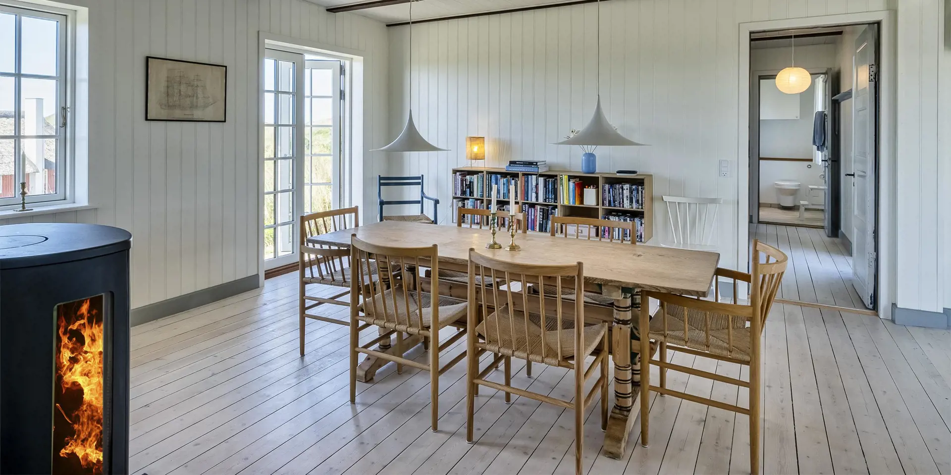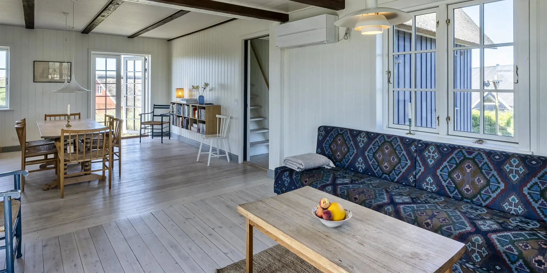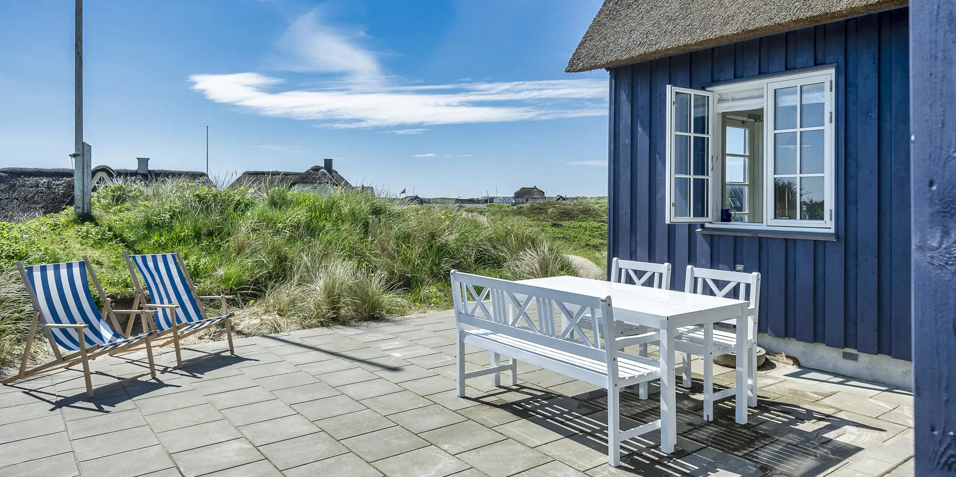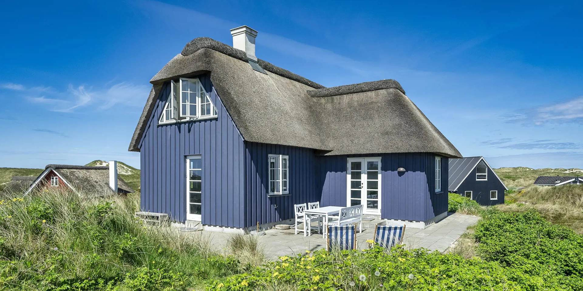 Charmantes Ferienhaus mit Namen „Opnør“ auf einer Düne gelegen und in bevorzugter Wohnlage und direktem Meerblick. Der Strand ist nur ca. 100 Meter vom Ferienhaus entfernt. Lassen Sie Ihren Blick rund um das Ferienhausgebiet schweifen, wenn Sie hier auf der Terrasse stehen. Einfach ein toller Bliuck und Entspannung pur. Das Ferienhaus ist für 6 Personen ausgestattet und bietet über 2 Etagen Platz für alle Bewohner. Im Erdgeschoss befindet sich der Wohnraum mit der Küche, zwei Schlafzimmer und ein Bad. Das dritte Schlafzimmer und eine kleine Wohlfühldiele befinden sich dann im Obergeschoss. Der Wohnraum ist mit dem Essraum offengehalten und freundlich eingerichtet. Das Fernsehprogramm können Sie über Chrome Cast und Smart TV empfangen. Sie können auch einige deutsche Kanäle empfangen. Es gibt einen DVD-Abspielgerät und einen Internetzugang (W-Lan). Freiliegende Balken im Wohn- und Essbereich an der Decke geben diesem Ferienhaus den besonderen Flair. Im Essbereich ist der Kamin aufgestellt. Dieser strahlt eine wohlige Wärme und Gemütlichkeit. Aus. Desweiteren ist hier im Wohnbereich eine Wärmepumpe installiert. Mit dieser Wärmepumpe können Sie die Energiekosten senken, da sie energiesparend ist. Der gesamte Fußboden im Hause, außer im Bad, da ist er gefliest, ist mit Dielen versehen. Die Küche ist nett eingerichtet und verfügt über einen Herd mit Cerankochfeld, einem Backofen in arbeitshöhe, einer Geschirrspülmaschine und einer Kühl- und Gefrierkombination. Die Kombi - Waschmaschine/Trockner ist ebenfalls hier im Küchenbereich untergebracht. Auch einen Ausgang zum Terrassenbereich haben Sie hier von der Küche aus. Das Badezimmer verfügt über ein Handwaschbecken, einem WC und einer Dusche und ist mit einer Fußbodenheizung versehen. Es gibt insgesamt drei Schlafzimmer ( DB + DB + 3EB). Das eine Schlafzimmer im Erdgeschoss verfügt über ein Doppelbett (¾ Bett) und das andere ein separates Bett. Über eine etwas steilere Treppe gelangen Sie dann in die obere Etage. Hier kommen Sie dann gleich in den gemütlichen Wohnbereich. Den Gedanken freien Lauf zu lassen, aus dem halbrunden Fenster zu schauen und ein paar Zeilen zu schreiben gibt dem einen oder anderem Bewohner die Möglichkeit der Entspannung und Erholung. Ein weiteres Schlafzimmer mit einem Doppelbett steht den Gästen hier zur Verfügung. Hier vom oberen Bereich haben Sie einen wundervollen Ausblick über die Dünen und dem Ferienhausgebiet und zur Nordsee. Die Wohnfläche beträgt ca. 120 qm. Es ist max. ein Haustier erlaubt. Das Rauchen im Ferienhaus ist nicht gestattet. Das Haus wurde im Jahr 1930 erbaut, laufend renoviert und zuletzt im Jahr 2020.
