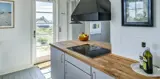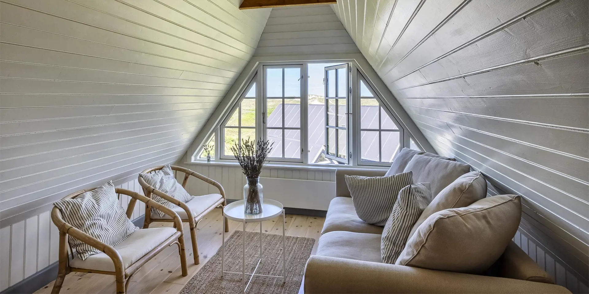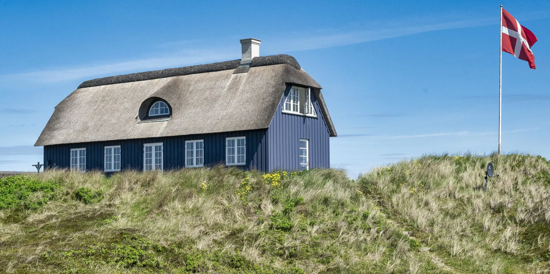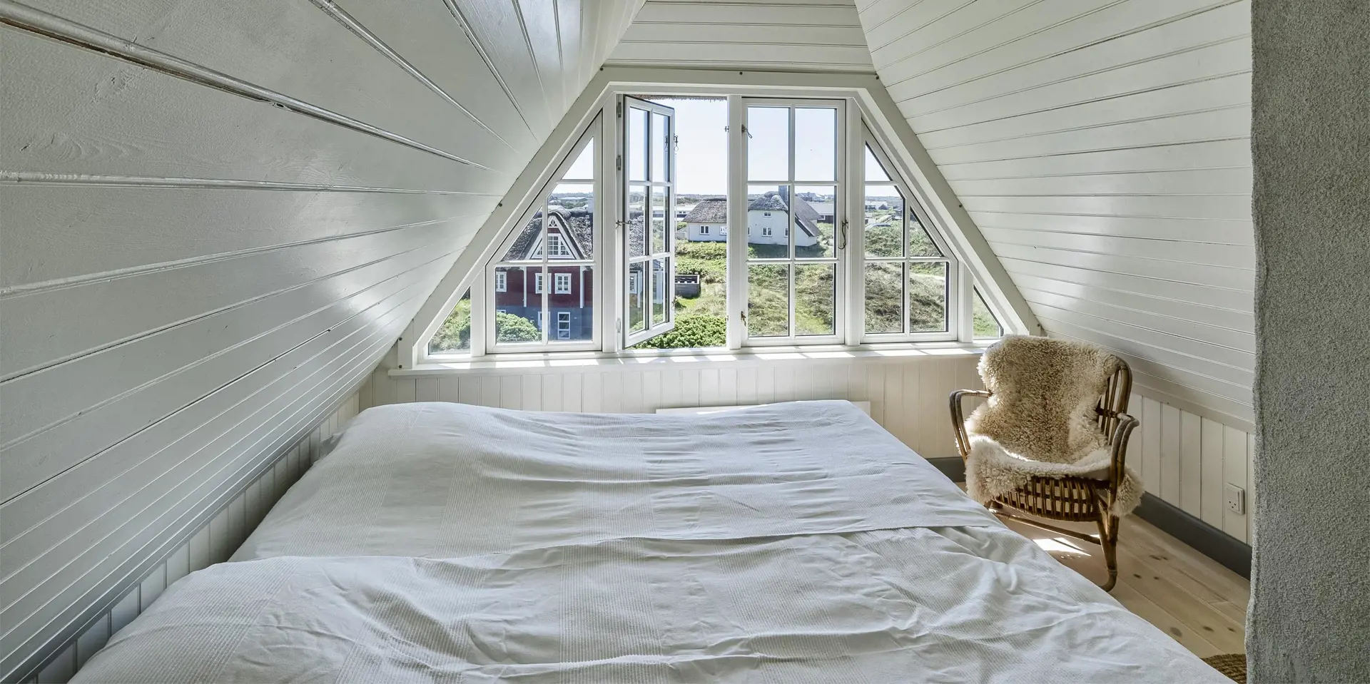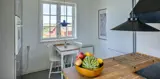 Charmantes Ferienhaus mit Namen „Opnør“ auf einer Düne gelegen und in bevorzugter Wohnlage und direktem Meerblick. Der Strand ist nur ca. 100 Meter vom Ferienhaus entfernt. Lassen Sie Ihren Blick rund um das Ferienhausgebiet schweifen, wenn Sie hier auf der Terrasse stehen. Einfach ein toller Bliuck und Entspannung pur. Das Ferienhaus ist für 6 Personen ausgestattet und bietet über 2 Etagen Platz für alle Bewohner. Im Erdgeschoss befindet sich der Wohnraum mit der Küche, zwei Schlafzimmer und ein Bad. Das dritte Schlafzimmer und eine kleine Wohlfühldiele befinden sich dann im Obergeschoss. Der Wohnraum ist mit dem Essraum offengehalten und freundlich eingerichtet. Das Fernsehprogramm können Sie über Chrome Cast und Smart TV empfangen. Sie können auch einige deutsche Kanäle empfangen. Es gibt einen DVD-Abspielgerät und einen Internetzugang (W-Lan). Freiliegende Balken im Wohn- und Essbereich an der Decke geben diesem Ferienhaus den besonderen Flair. Im Essbereich ist der Kamin aufgestellt. Dieser strahlt eine wohlige Wärme und Gemütlichkeit. Aus. Desweiteren ist hier im Wohnbereich eine Wärmepumpe installiert. Mit dieser Wärmepumpe können Sie die Energiekosten senken, da sie energiesparend ist. Der gesamte Fußboden im Hause, außer im Bad, da ist er gefliest, ist mit Dielen versehen. Die Küche ist nett eingerichtet und verfügt über einen Herd mit Cerankochfeld, einem Backofen in arbeitshöhe, einer Geschirrspülmaschine und einer Kühl- und Gefrierkombination. Die Kombi - Waschmaschine/Trockner ist ebenfalls hier im Küchenbereich untergebracht. Auch einen Ausgang zum Terrassenbereich haben Sie hier von der Küche aus. Das Badezimmer verfügt über ein Handwaschbecken, einem WC und einer Dusche und ist mit einer Fußbodenheizung versehen. Es gibt insgesamt drei Schlafzimmer ( DB + DB + 3EB). Das eine Schlafzimmer im Erdgeschoss verfügt über ein Doppelbett (¾ Bett) und das andere ein separates Bett. Über eine etwas steilere Treppe gelangen Sie dann in die obere Etage. Hier kommen Sie dann gleich in den gemütlichen Wohnbereich. Den Gedanken freien Lauf zu lassen, aus dem halbrunden Fenster zu schauen und ein paar Zeilen zu schreiben gibt dem einen oder anderem Bewohner die Möglichkeit der Entspannung und Erholung. Ein weiteres Schlafzimmer mit einem Doppelbett steht den Gästen hier zur Verfügung. Hier vom oberen Bereich haben Sie einen wundervollen Ausblick über die Dünen und dem Ferienhausgebiet und zur Nordsee. Die Wohnfläche beträgt ca. 120 qm. Es ist max. ein Haustier erlaubt. Das Rauchen im Ferienhaus ist nicht gestattet. Das Haus wurde im Jahr 1930 erbaut, laufend renoviert und zuletzt im Jahr 2020.