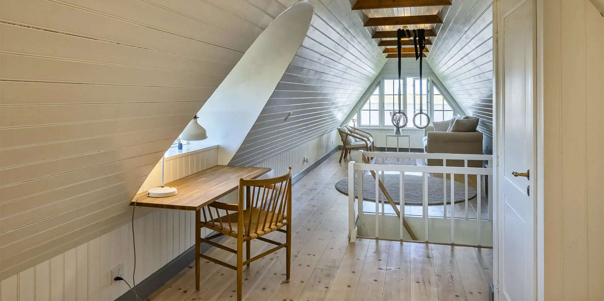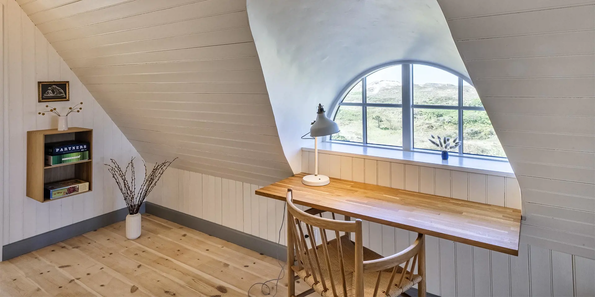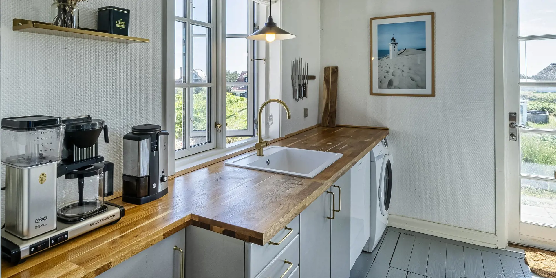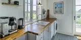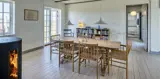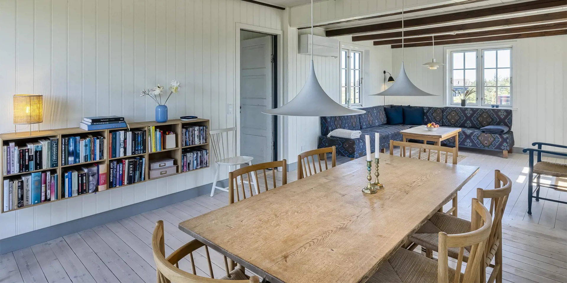 Charmantes Ferienhaus mit Namen „Opnør“ auf einer Düne gelegen und in bevorzugter Wohnlage und direktem Meerblick. Der Strand ist nur ca. 100 Meter vom Ferienhaus entfernt. Lassen Sie Ihren Blick rund um das Ferienhausgebiet schweifen, wenn Sie hier auf der Terrasse stehen. Einfach ein toller Bliuck und Entspannung pur. Das Ferienhaus ist für 6 Personen ausgestattet und bietet über 2 Etagen Platz für alle Bewohner. Im Erdgeschoss befindet sich der Wohnraum mit der Küche, zwei Schlafzimmer und ein Bad. Das dritte Schlafzimmer und eine kleine Wohlfühldiele befinden sich dann im Obergeschoss. Der Wohnraum ist mit dem Essraum offengehalten und freundlich eingerichtet. Das Fernsehprogramm können Sie über Chrome Cast und Smart TV empfangen. Sie können auch einige deutsche Kanäle empfangen. Es gibt einen DVD-Abspielgerät und einen Internetzugang (W-Lan). Freiliegende Balken im Wohn- und Essbereich an der Decke geben diesem Ferienhaus den besonderen Flair. Im Essbereich ist der Kamin aufgestellt. Dieser strahlt eine wohlige Wärme und Gemütlichkeit. Aus. Desweiteren ist hier im Wohnbereich eine Wärmepumpe installiert. Mit dieser Wärmepumpe können Sie die Energiekosten senken, da sie energiesparend ist. Der gesamte Fußboden im Hause, außer im Bad, da ist er gefliest, ist mit Dielen versehen. Die Küche ist nett eingerichtet und verfügt über einen Herd mit Cerankochfeld, einem Backofen in arbeitshöhe, einer Geschirrspülmaschine und einer Kühl- und Gefrierkombination. Die Kombi - Waschmaschine/Trockner ist ebenfalls hier im Küchenbereich untergebracht. Auch einen Ausgang zum Terrassenbereich haben Sie hier von der Küche aus. Das Badezimmer verfügt über ein Handwaschbecken, einem WC und einer Dusche und ist mit einer Fußbodenheizung versehen. Es gibt insgesamt drei Schlafzimmer ( DB + DB + 3EB). Das eine Schlafzimmer im Erdgeschoss verfügt über ein Doppelbett (¾ Bett) und das andere ein separates Bett. Über eine etwas steilere Treppe gelangen Sie dann in die obere Etage. Hier kommen Sie dann gleich in den gemütlichen Wohnbereich. Den Gedanken freien Lauf zu lassen, aus dem halbrunden Fenster zu schauen und ein paar Zeilen zu schreiben gibt dem einen oder anderem Bewohner die Möglichkeit der Entspannung und Erholung. Ein weiteres Schlafzimmer mit einem Doppelbett steht den Gästen hier zur Verfügung. Hier vom oberen Bereich haben Sie einen wundervollen Ausblick über die Dünen und dem Ferienhausgebiet und zur Nordsee. Die Wohnfläche beträgt ca. 120 qm. Es ist max. ein Haustier erlaubt. Das Rauchen im Ferienhaus ist nicht gestattet. Das Haus wurde im Jahr 1930 erbaut, laufend renoviert und zuletzt im Jahr 2020.