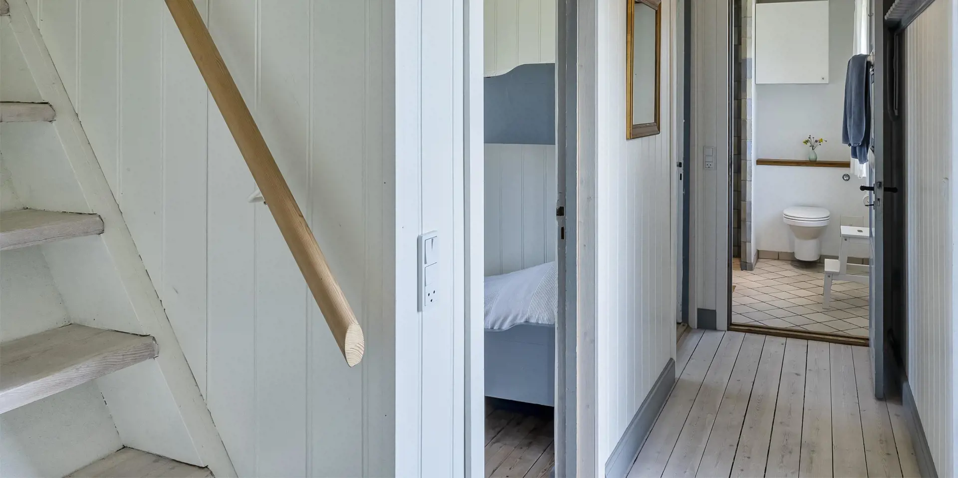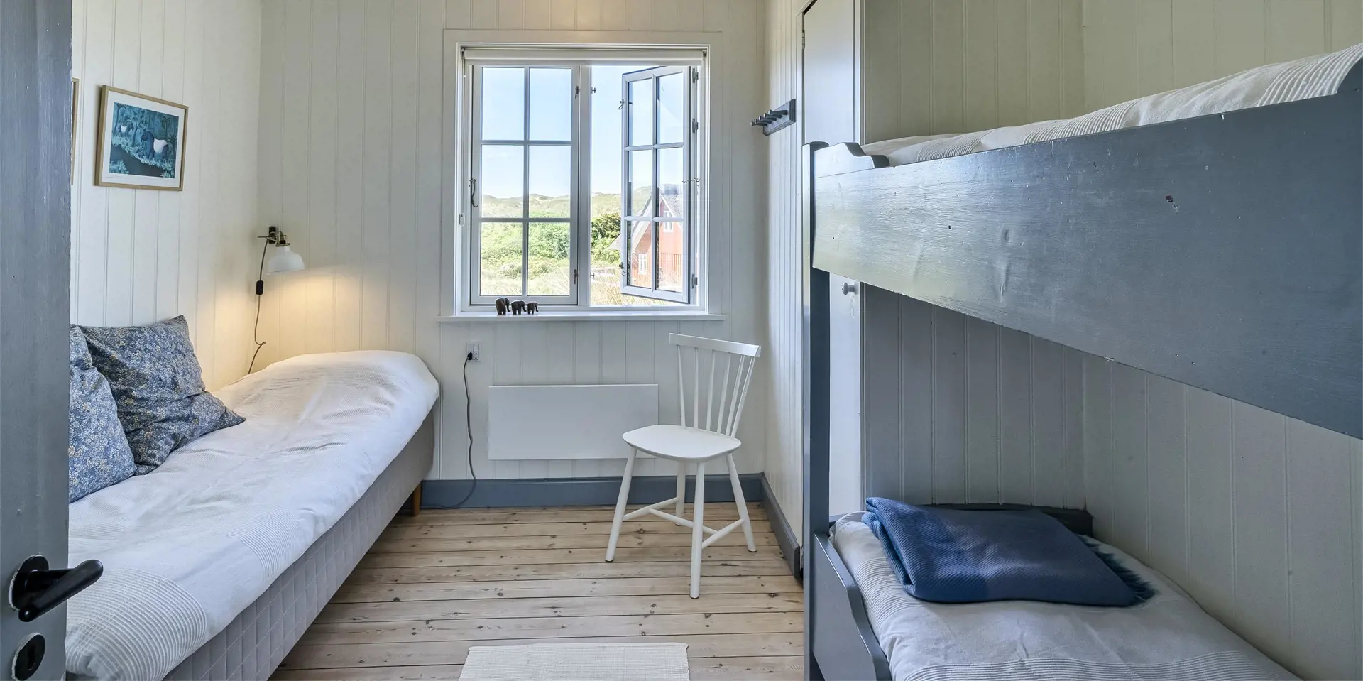 3 Schlafzimmer. 2 mit Doppelbett. 1 mit 1 Einzelbett (je 90x200 cm) und 1 Etagenbett.