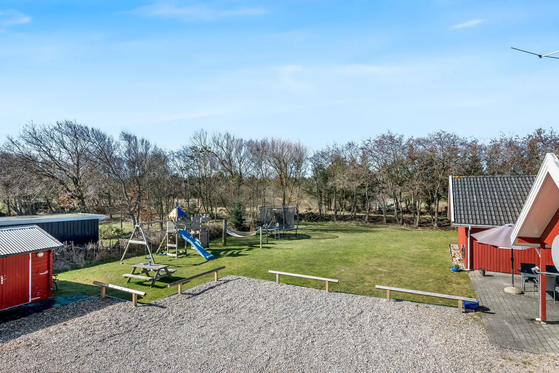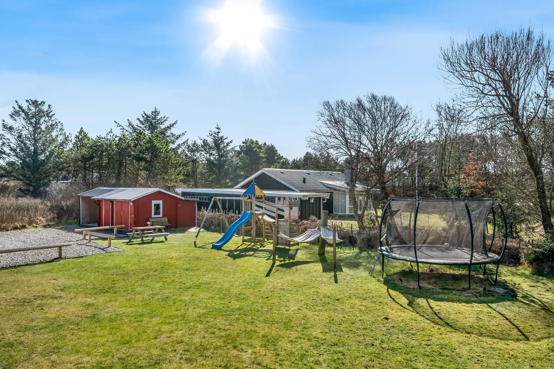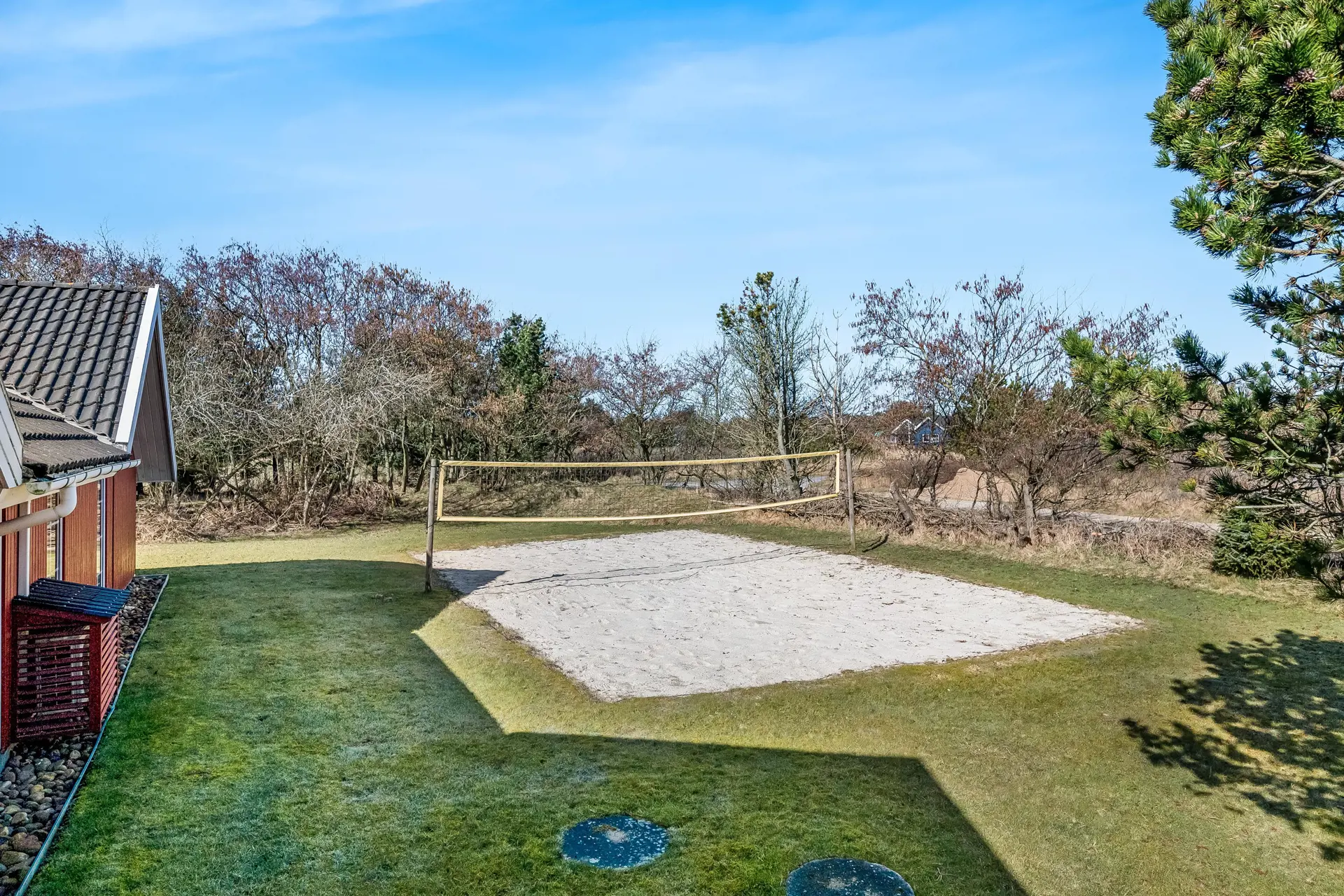 Das Haus liegt auf einem gepflegten Naturgrundstück mit einer großen, windgeschützten Terrasse, die mit Gartenmöbeln und Kohle-Grill ausgestattet ist. Hier können Sie herrliche Tage in der Sonne verbringen oder gemütliche Grillabende veranstalten. Für aktive und auch die kleineren Gäste gibt es auf dem Grundstück ein Beachvolleyballfeld, eine Schaukel, ein Klettergerüst und ein Trampolin, was Unterhaltung für Kinder und Erwachsene gleichermaßen sicherstellt.
