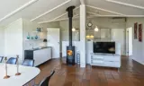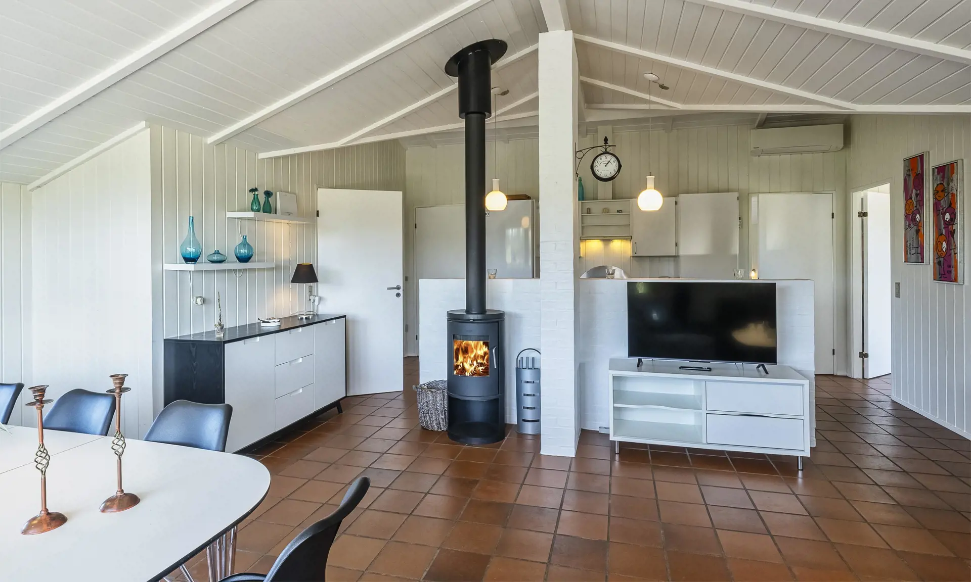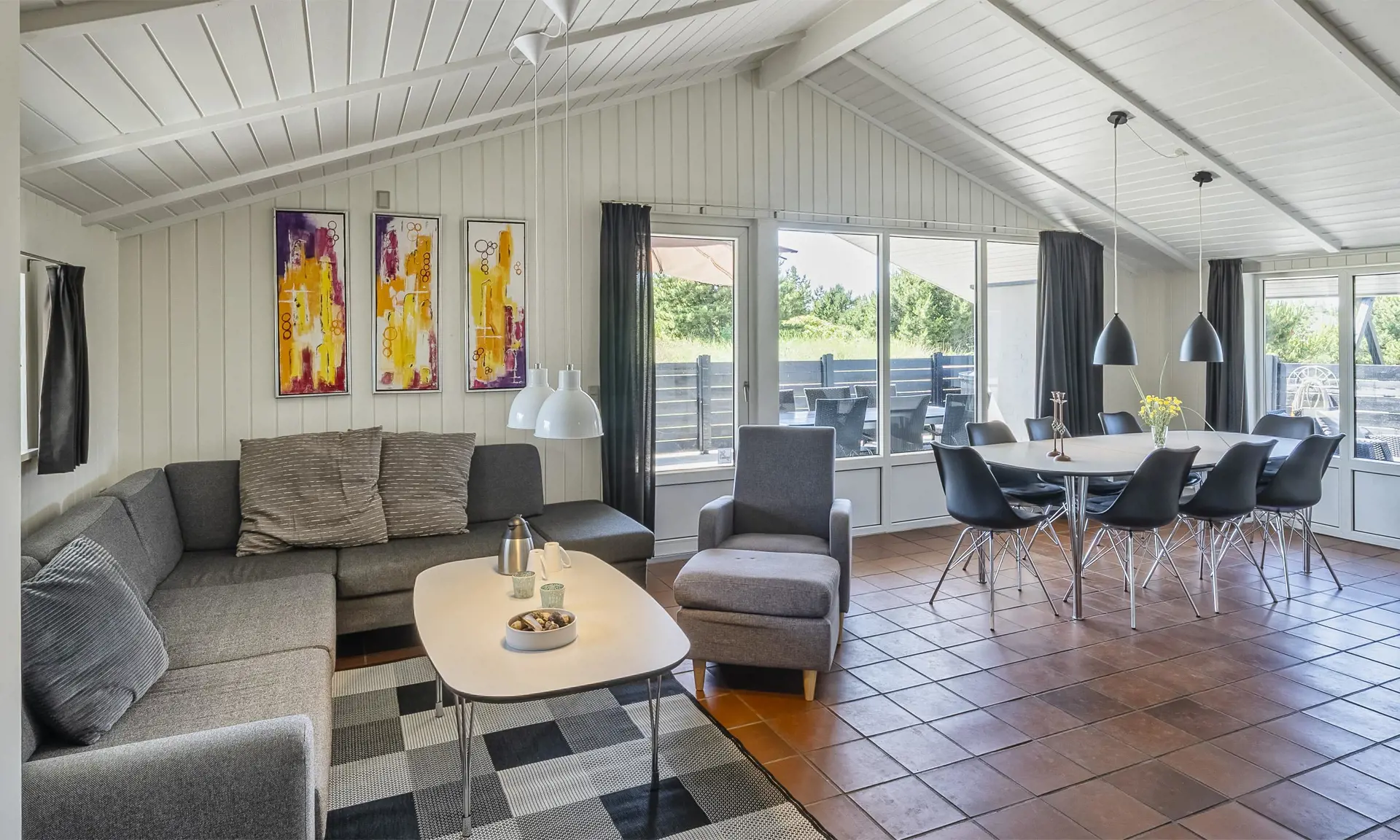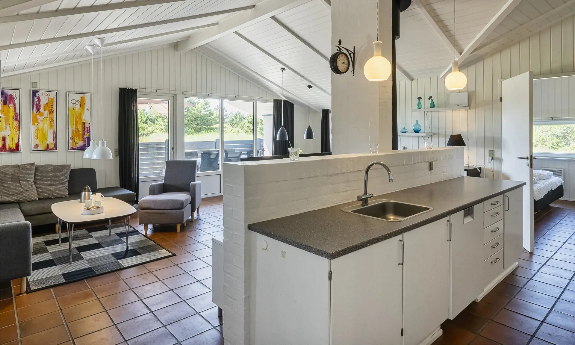 Innen erwartet Sie ein helles und einladendes Ferienhaus mit offenem Wohn-, Ess- und Küchenbereich – das zentrale Herzstück des Hauses. Hohe Decken, große Fenster mit viel Tageslicht und Fliesenboden sorgen für eine angenehme Atmosphäre. Vom Wohnzimmer aus gelangen Sie direkt auf eine teilweise überdachte und windgeschützte Terrasse – ideal für sonnige Tage oder gemütliche Abende unter freiem Himmel.