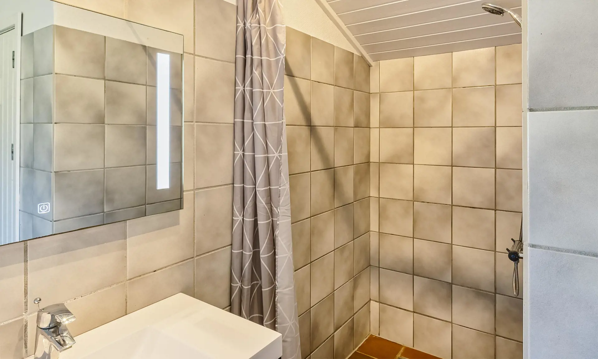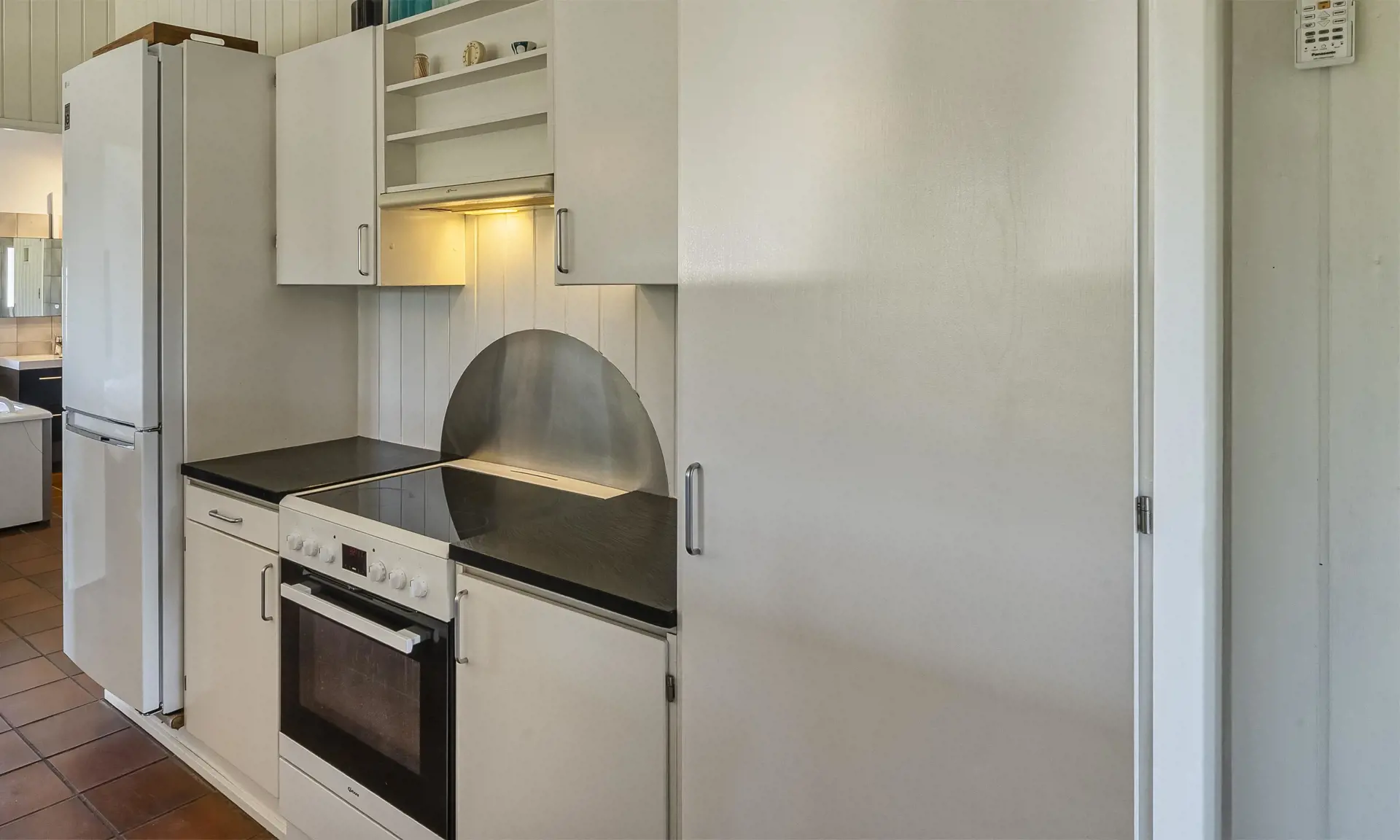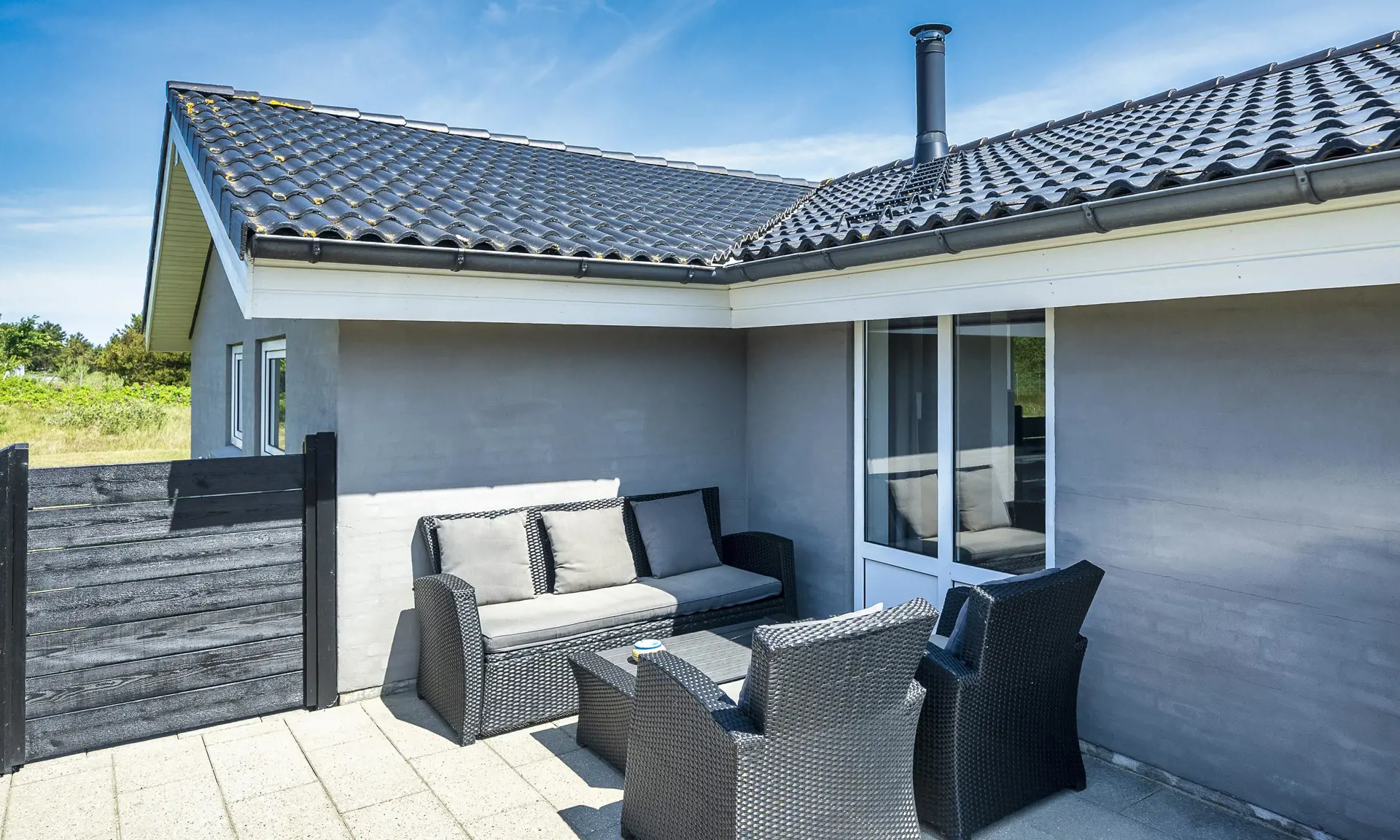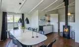 Innen erwartet Sie ein helles und einladendes Ferienhaus mit offenem Wohn-, Ess- und Küchenbereich – das zentrale Herzstück des Hauses. Hohe Decken, große Fenster mit viel Tageslicht und Fliesenboden sorgen für eine angenehme Atmosphäre. Vom Wohnzimmer aus gelangen Sie direkt auf eine teilweise überdachte und windgeschützte Terrasse – ideal für sonnige Tage oder gemütliche Abende unter freiem Himmel.