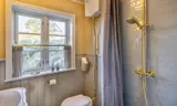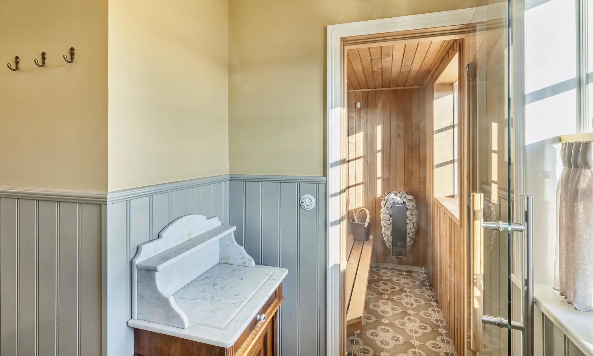 Zwei Badezimmer mit Fußbodenheizung, Dusche, Waschbecken und WC – eines davon mit Sauna, ideal zur Entspannung nach einem Spaziergang an der Nordsee.